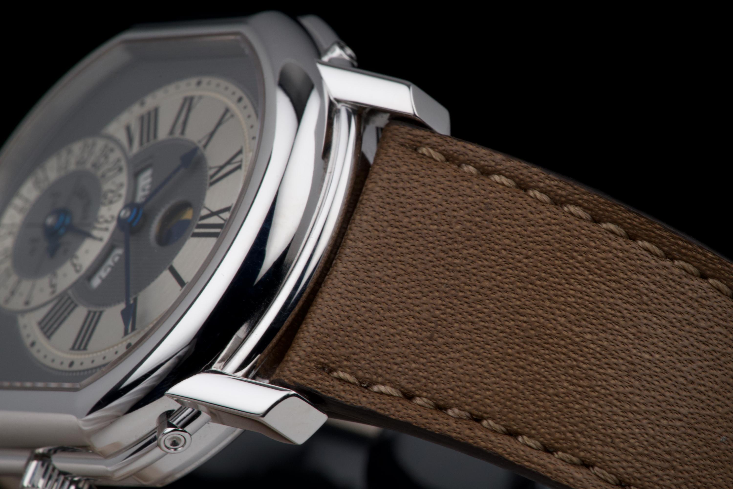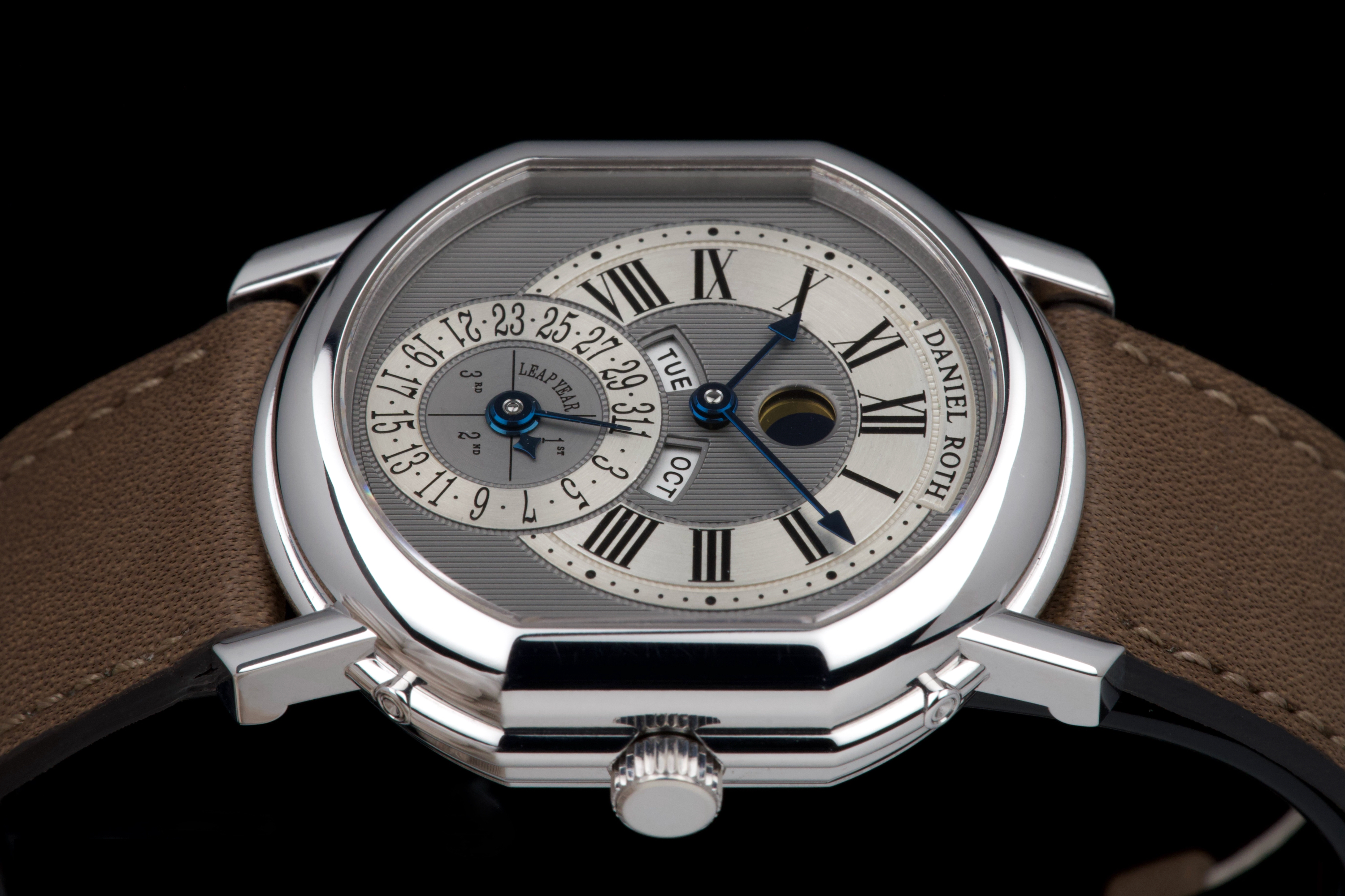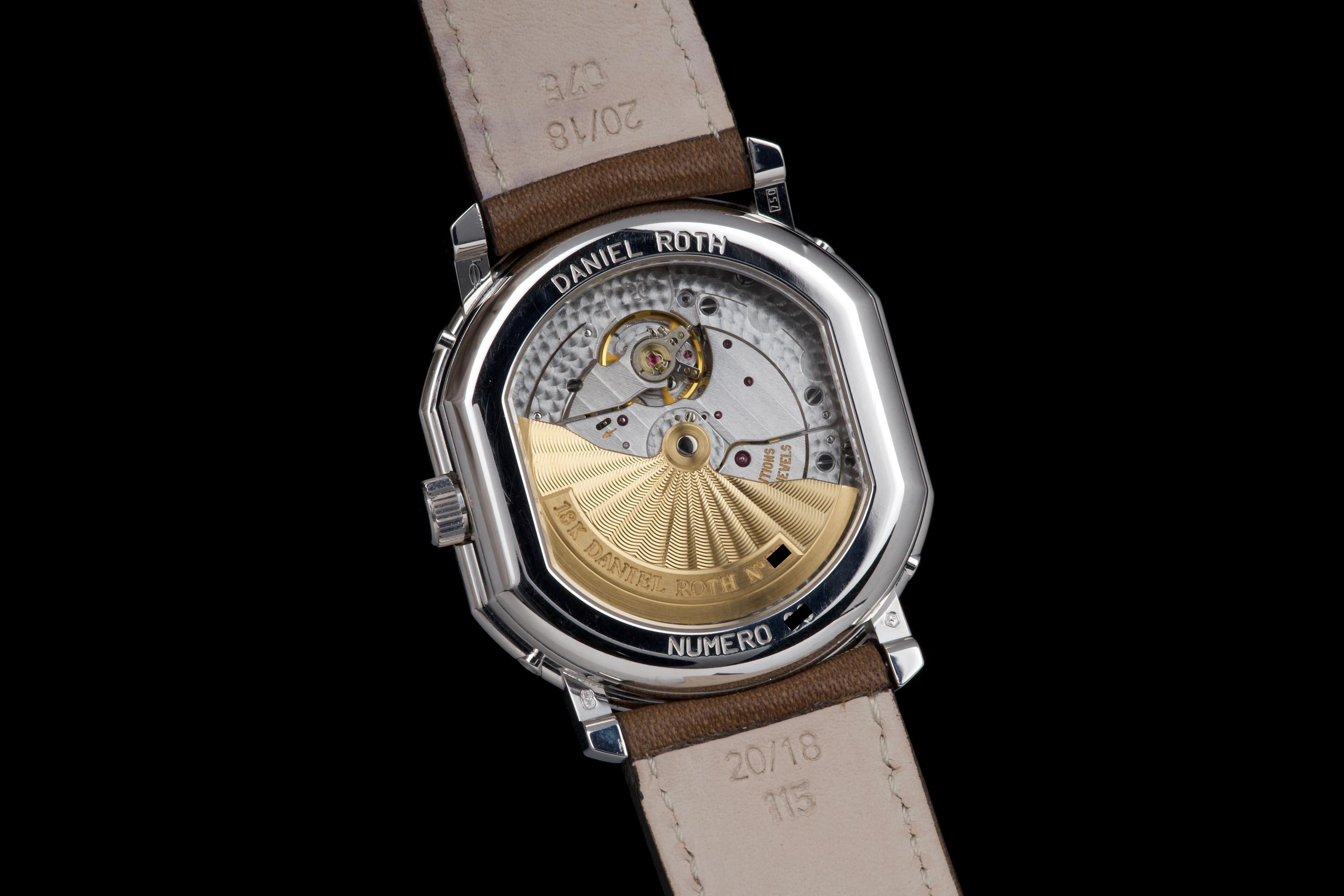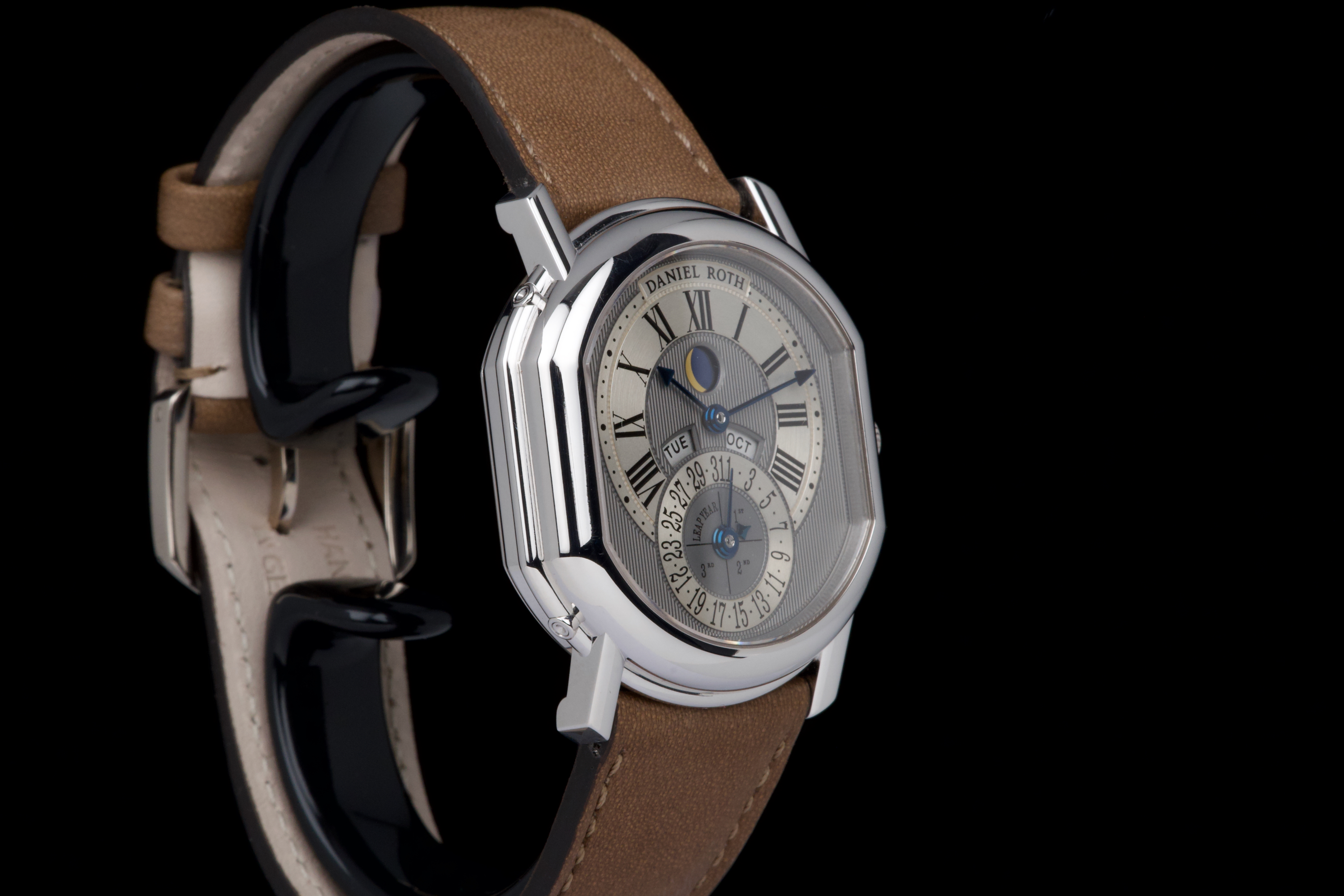 In the early 1990s, Daniel Roth set out to create his own interpretation of a perpetual calendar wristwatch — one that balanced mechanical sophistication with classical restraint. Based on the caliber GP 3000, this rare white gold example features dual apertures for the day and month, implementing a “semi-instantaneous” perpetual calendar that pre-dates Roth’s later fully instantaneous design. Numbered 3X, and part of the early production run of Daniel Roth’s independent creations, this timepiece is preserved in spectacular, unpolished condition, appearing virtually unworn. The grey ruthenium-finished dial with vertical guilloché is beautifully executed, complemented by a brushed hour and date ring that adds subtle depth and refinement. The symmetrical layout — with day and month apertures fanning above the central date — ensures clarity and perfect balance. The blued steel hands and gold moon phase disc add a discreet yet elegant contrast to the monochrome palette. Encased in the signature double-ellipse 18K white gold case, this watch captures the essence of Daniel Roth’s design language — architectural, precise, and timeless. It is fitted with its original white gold Daniel Roth ardillon buckle. A historically important and beautifully preserved example from one of the great independent watchmakers of the modern era — an understated yet masterful expression of 1990s haute horlogerie.