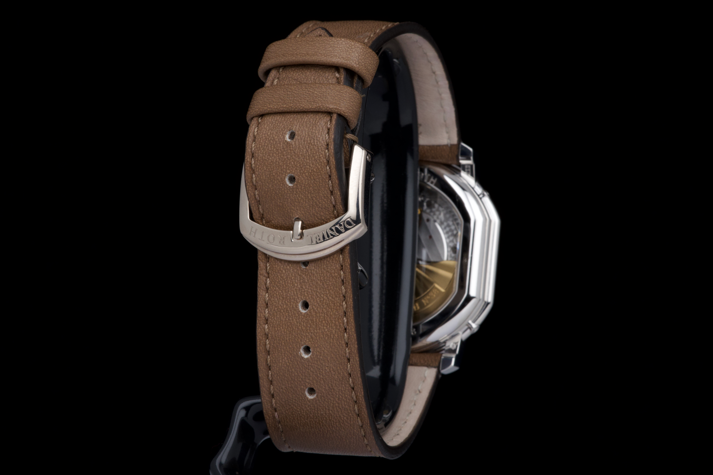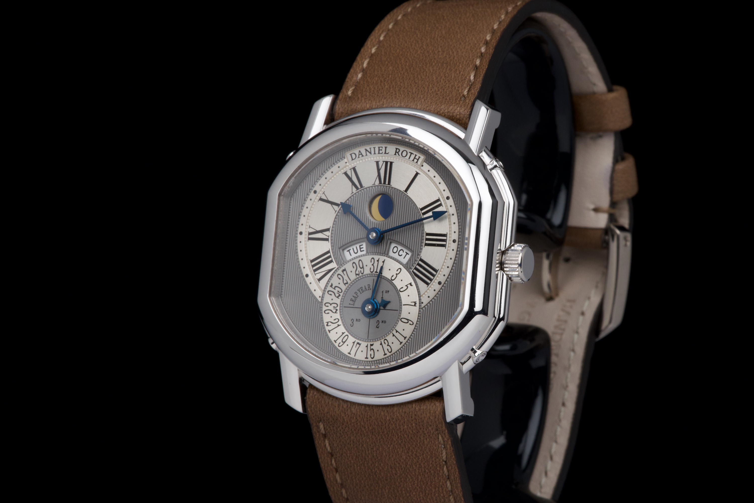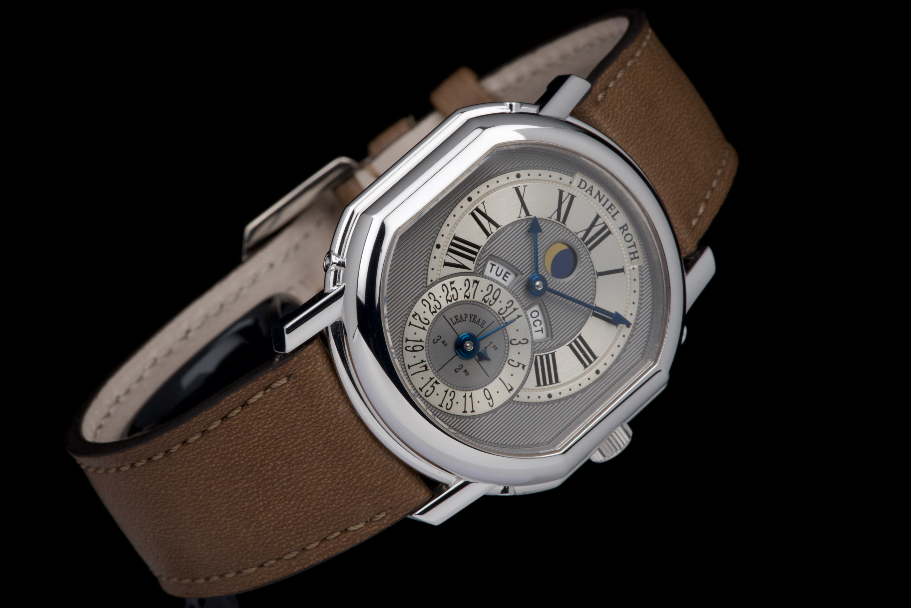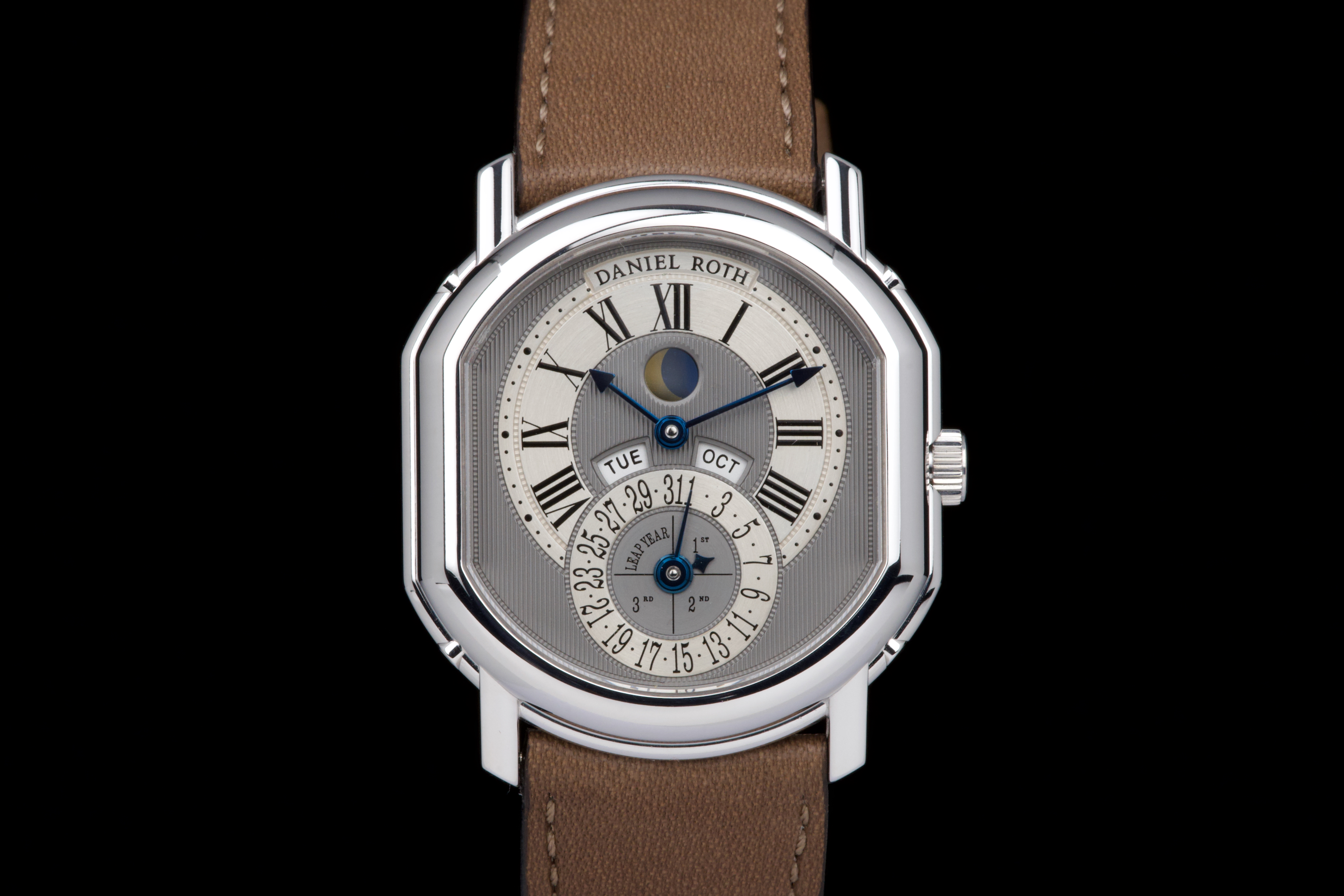 In the early 1990s, Daniel Roth set out to create his own interpretation of a perpetual calendar wristwatch — one that balanced mechanical sophistication with classical restraint. Based on the caliber GP 3000, this rare white gold example features dual apertures for the day and month, implementing a “semi-instantaneous” perpetual calendar that pre-dates Roth’s later fully instantaneous design. Numbered 3X, and part of the early production run of Daniel Roth’s independent creations, this timepiece is preserved in spectacular, unpolished condition, appearing virtually unworn. The grey ruthenium-finished dial with vertical guilloché is beautifully executed, complemented by a brushed hour and date ring that adds subtle depth and refinement. The symmetrical layout — with day and month apertures fanning above the central date — ensures clarity and perfect balance. The blued steel hands and gold moon phase disc add a discreet yet elegant contrast to the monochrome palette. Encased in the signature double-ellipse 18K white gold case, this watch captures the essence of Daniel Roth’s design language — architectural, precise, and timeless. It is fitted with its original white gold Daniel Roth ardillon buckle. A historically important and beautifully preserved example from one of the great independent watchmakers of the modern era — an understated yet masterful expression of 1990s haute horlogerie.