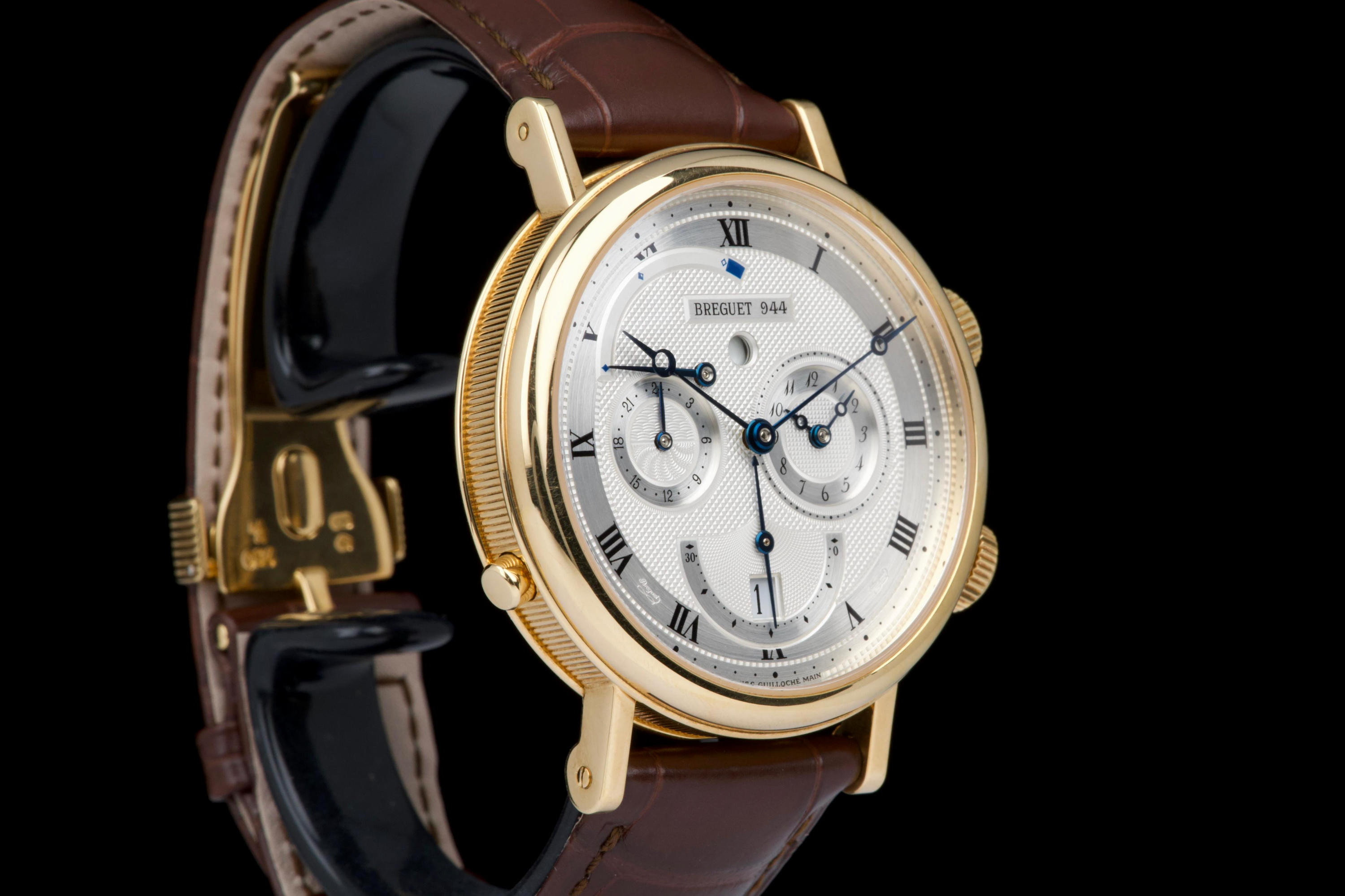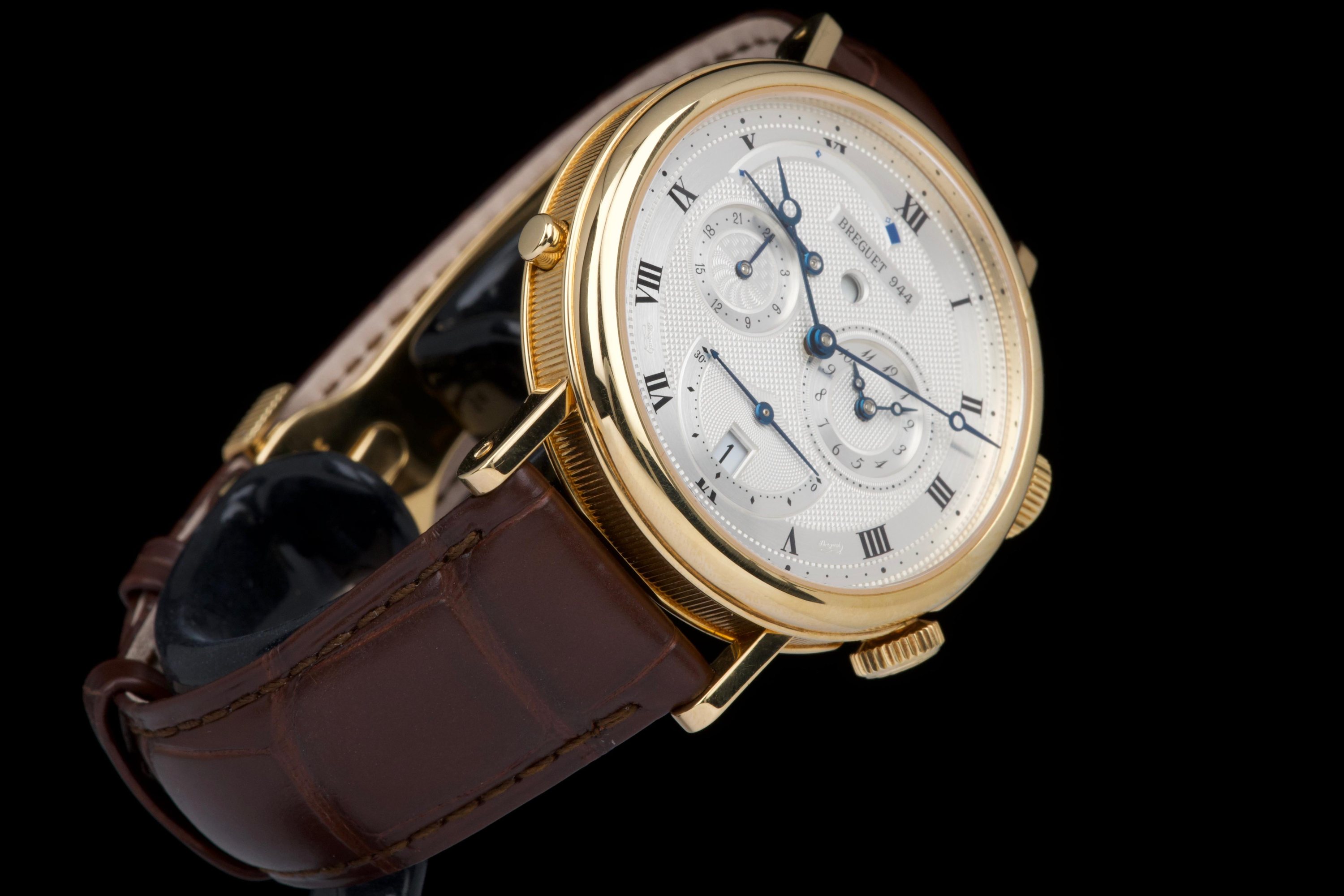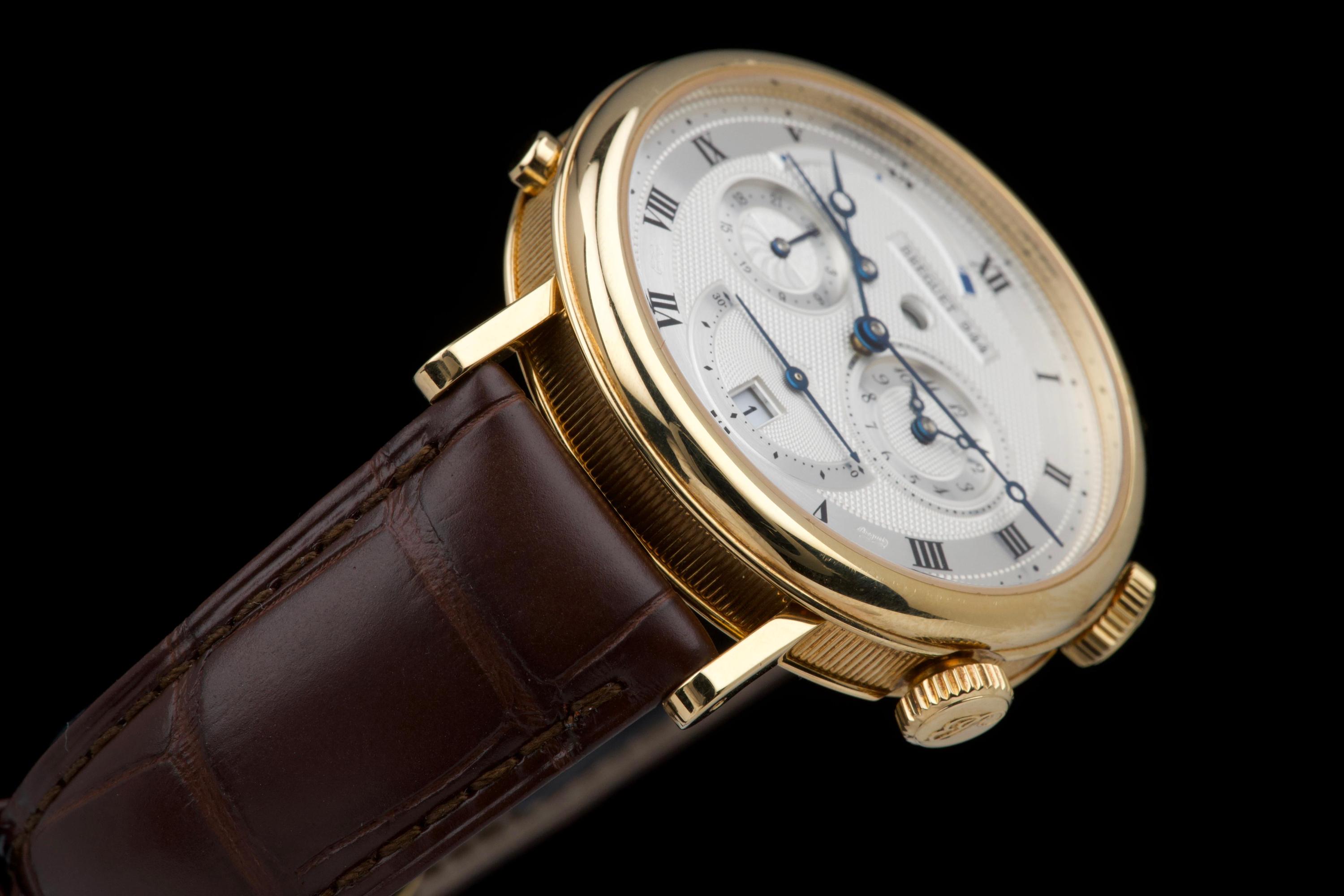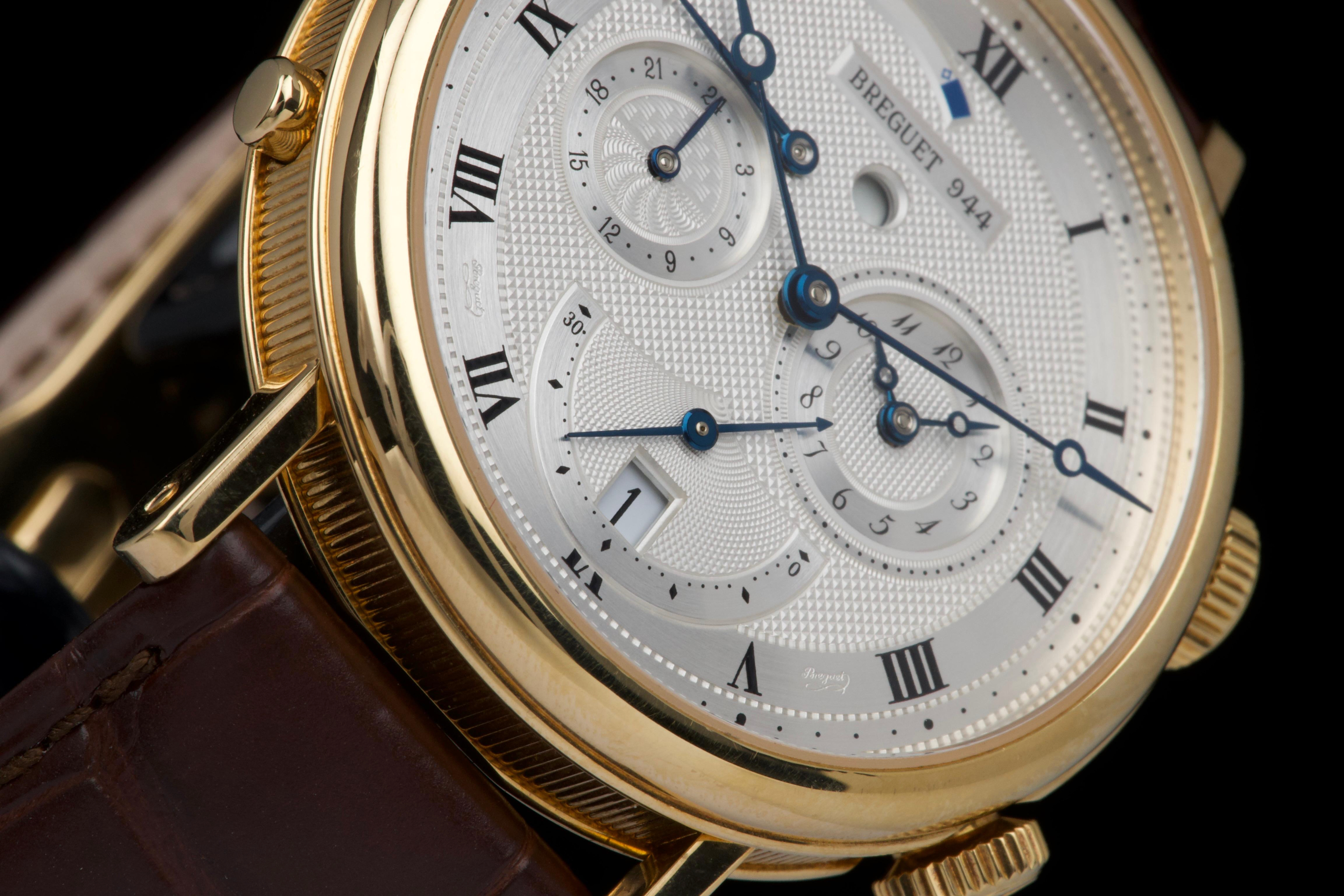 The present Breguet Réveil du Tsar reference 5707BA, dating to 2007 and offered as a complete full set, is a highly impressive and technically sophisticated example of Breguet’s modern high-complication watchmaking. Originally sold new in Japan in 2007, this watch represents one of the manufacture’s most distinctive alarm wristwatches, combining classical aesthetics with remarkable mechanical ingenuity. Executed in 18K yellow gold, the case appears to be unpolished and is preserved in outstanding overall condition, retaining crisp lines and sharp detailing throughout. The watch presents in top condition and shows only minimal signs of careful use. The dial is beautifully executed with hand-guilloché decoration, showcasing Breguet’s traditional engine-turned craftsmanship and providing exceptional depth and refinement. Powering the watch is an automatic movement incorporating Breguet’s proprietary mechanical alarm complication, allowing the wearer to set and activate an acoustic alarm—an uncommon and highly desirable feature in traditional haute horlogerie. Despite the lack of documented service history, the watch is in perfect working condition at the time of cataloguing, including full functionality of the alarm mechanism. The watch is fitted with a brand-new brown Breguet crocodile leather strap, paired with a yellow-gold Breguet deployant clasp, completing the ensemble with full material and aesthetic coherence. Delivered as a full set, this Réveil du Tsar represents a rare opportunity to acquire a top-condition example of one of Breguet’s most technically and visually distinctive modern complications. Combining alarm functionality, classical guilloché artistry, precious-metal execution, and outstanding preservation, this Réveil du Tsar 5707BA stands as a compelling and highly collectible modern Breguet, equally appealing to connoisseurs of traditional complications and contemporary high watchmaking.
