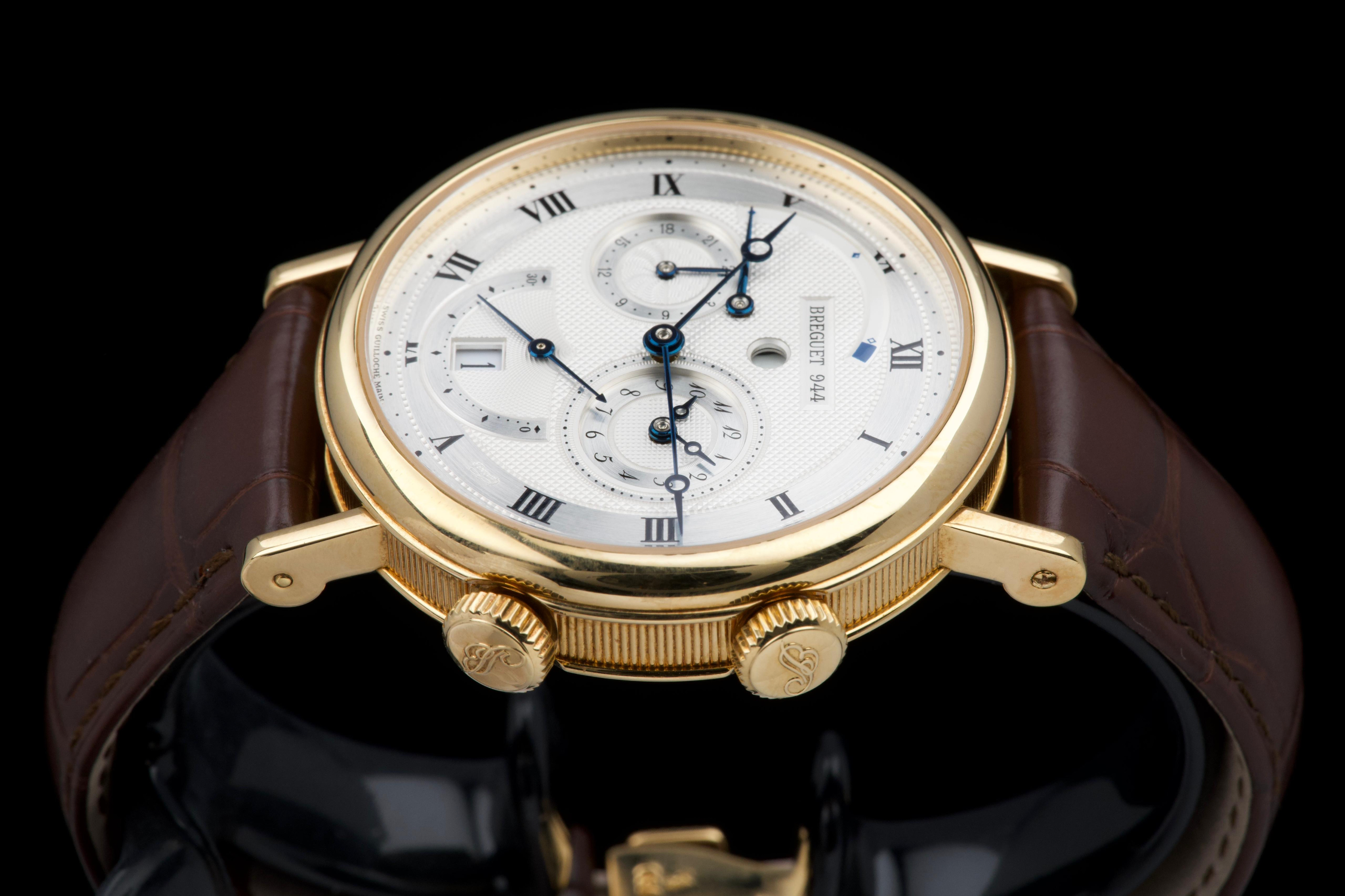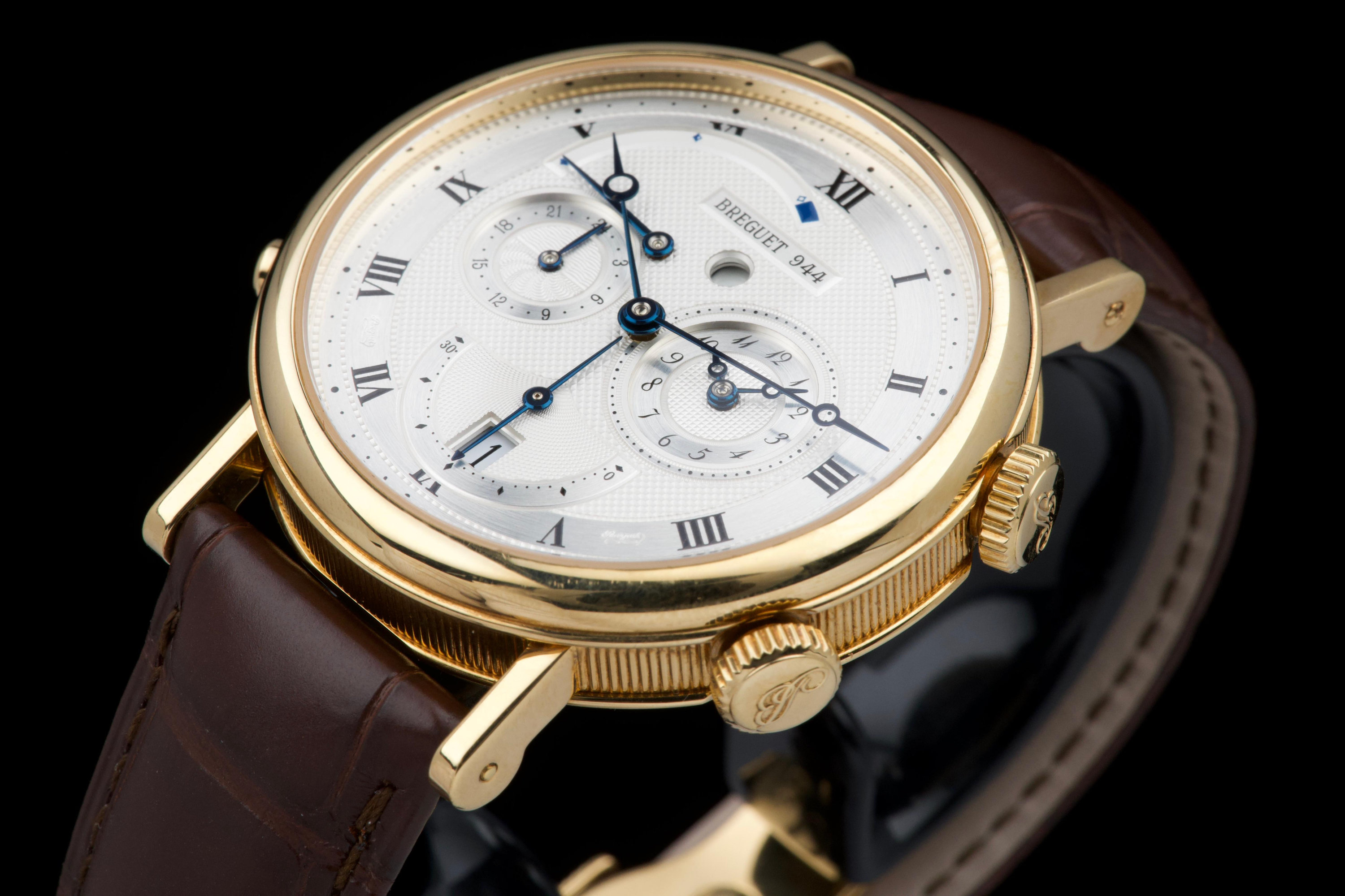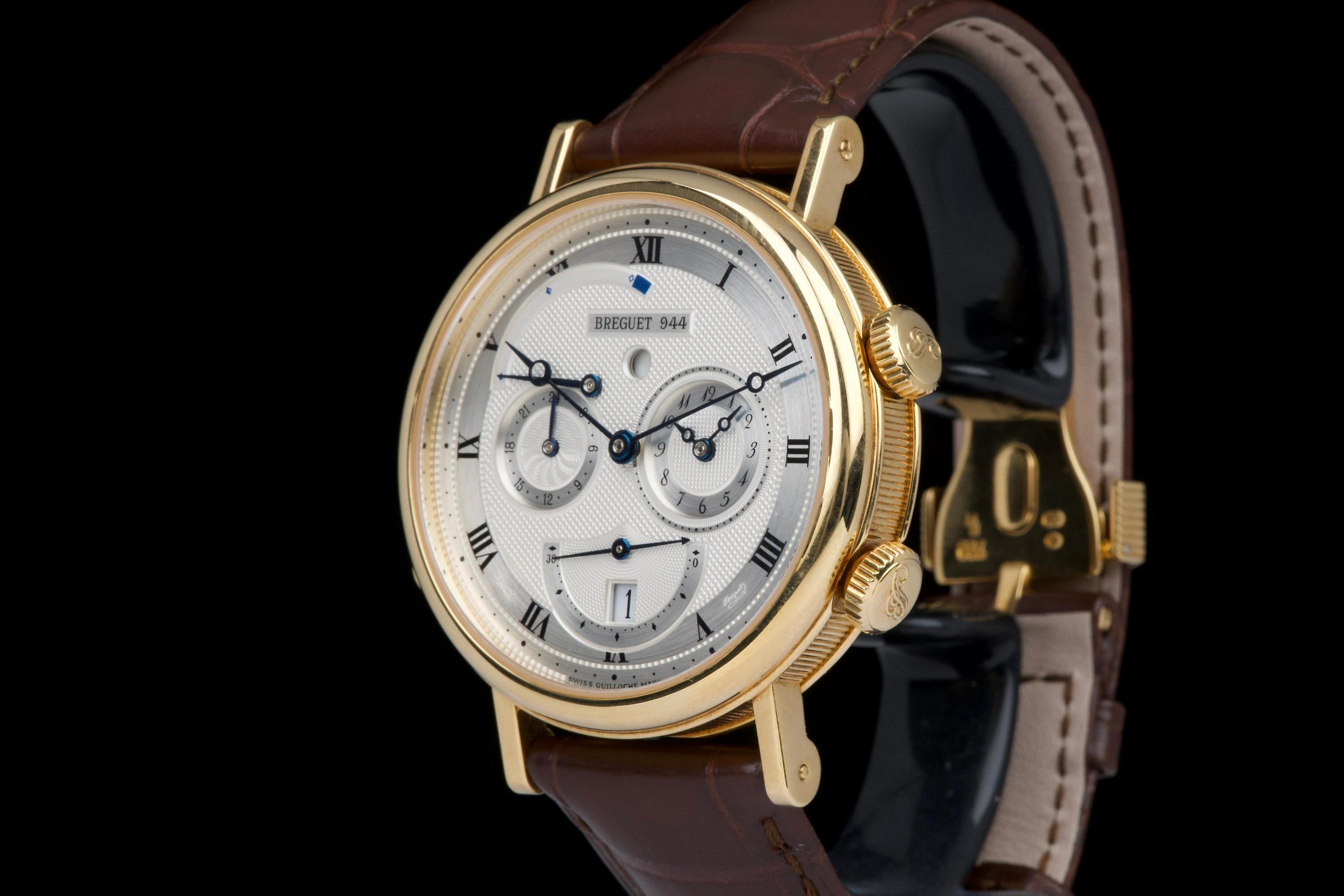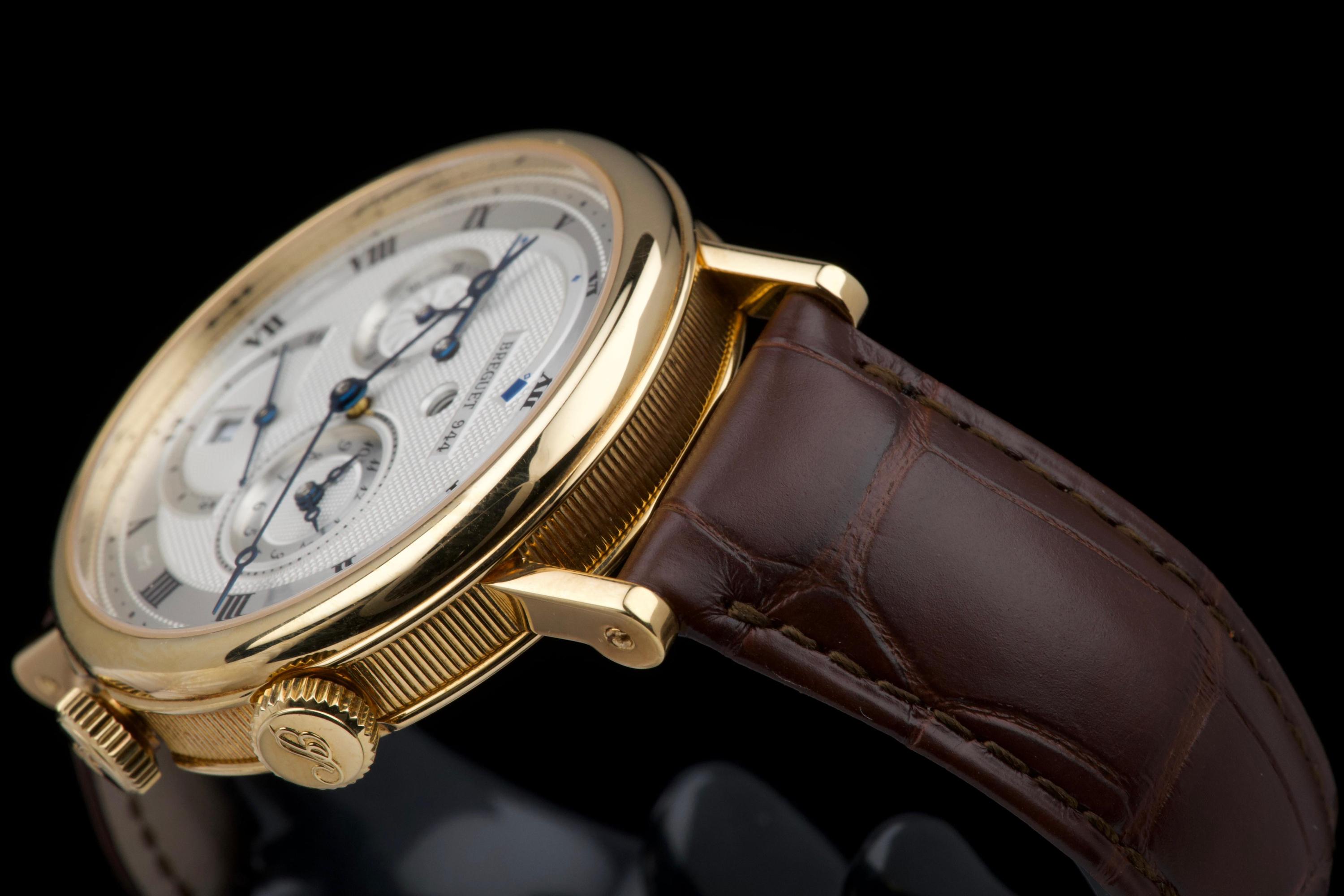 The present Breguet Réveil du Tsar reference 5707BA, dating to 2007 and offered as a complete full set, is a highly impressive and technically sophisticated example of Breguet’s modern high-complication watchmaking. Originally sold new in Japan in 2007, this watch represents one of the manufacture’s most distinctive alarm wristwatches, combining classical aesthetics with remarkable mechanical ingenuity. Executed in 18K yellow gold, the case appears to be unpolished and is preserved in outstanding overall condition, retaining crisp lines and sharp detailing throughout. The watch presents in top condition and shows only minimal signs of careful use. The dial is beautifully executed with hand-guilloché decoration, showcasing Breguet’s traditional engine-turned craftsmanship and providing exceptional depth and refinement. Powering the watch is an automatic movement incorporating Breguet’s proprietary mechanical alarm complication, allowing the wearer to set and activate an acoustic alarm—an uncommon and highly desirable feature in traditional haute horlogerie. Despite the lack of documented service history, the watch is in perfect working condition at the time of cataloguing, including full functionality of the alarm mechanism. The watch is fitted with a brand-new brown Breguet crocodile leather strap, paired with a yellow-gold Breguet deployant clasp, completing the ensemble with full material and aesthetic coherence. Delivered as a full set, this Réveil du Tsar represents a rare opportunity to acquire a top-condition example of one of Breguet’s most technically and visually distinctive modern complications. Combining alarm functionality, classical guilloché artistry, precious-metal execution, and outstanding preservation, this Réveil du Tsar 5707BA stands as a compelling and highly collectible modern Breguet, equally appealing to connoisseurs of traditional complications and contemporary high watchmaking.