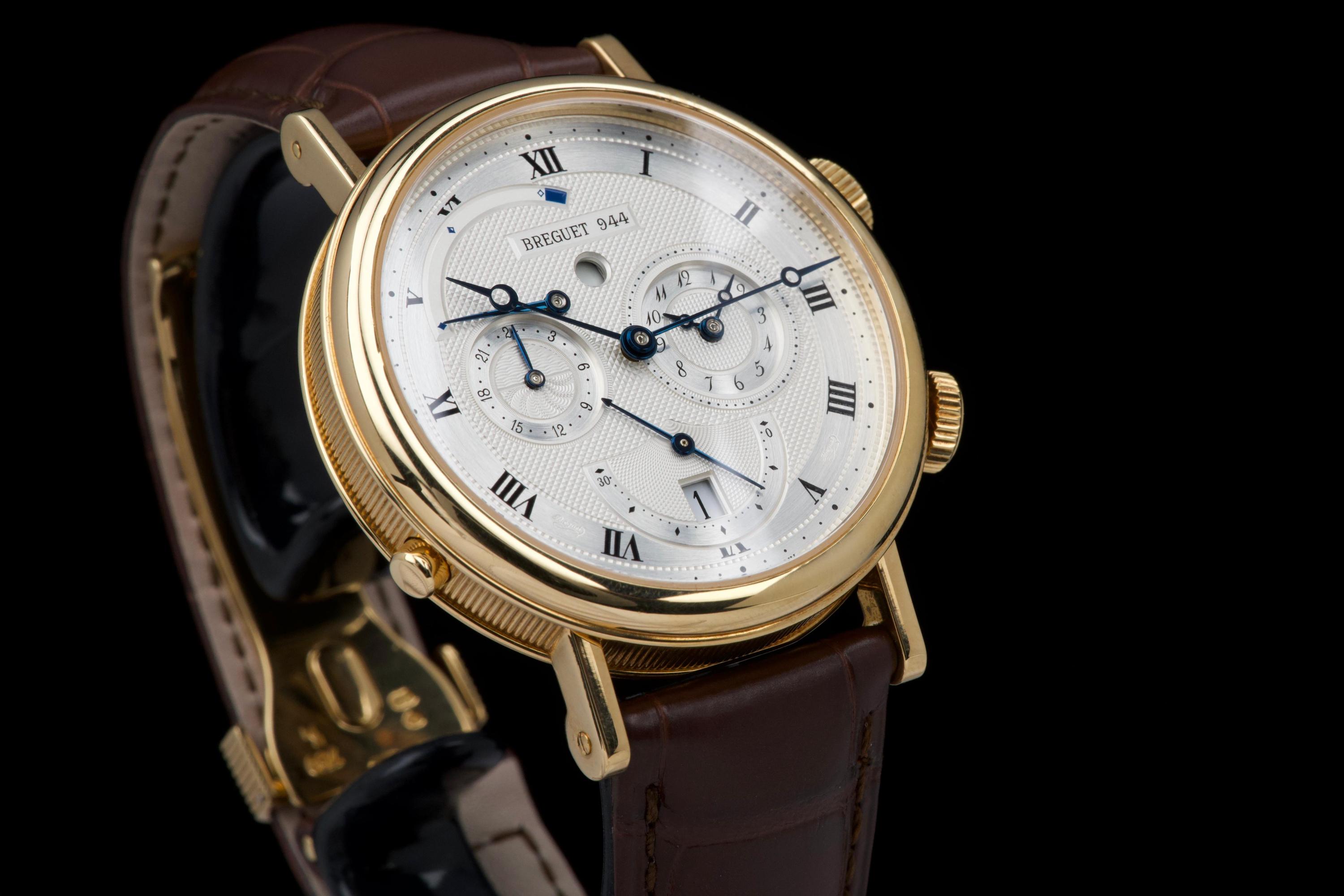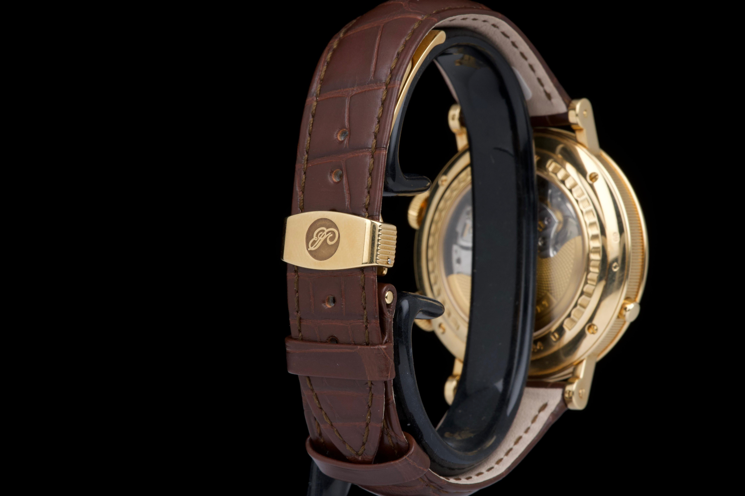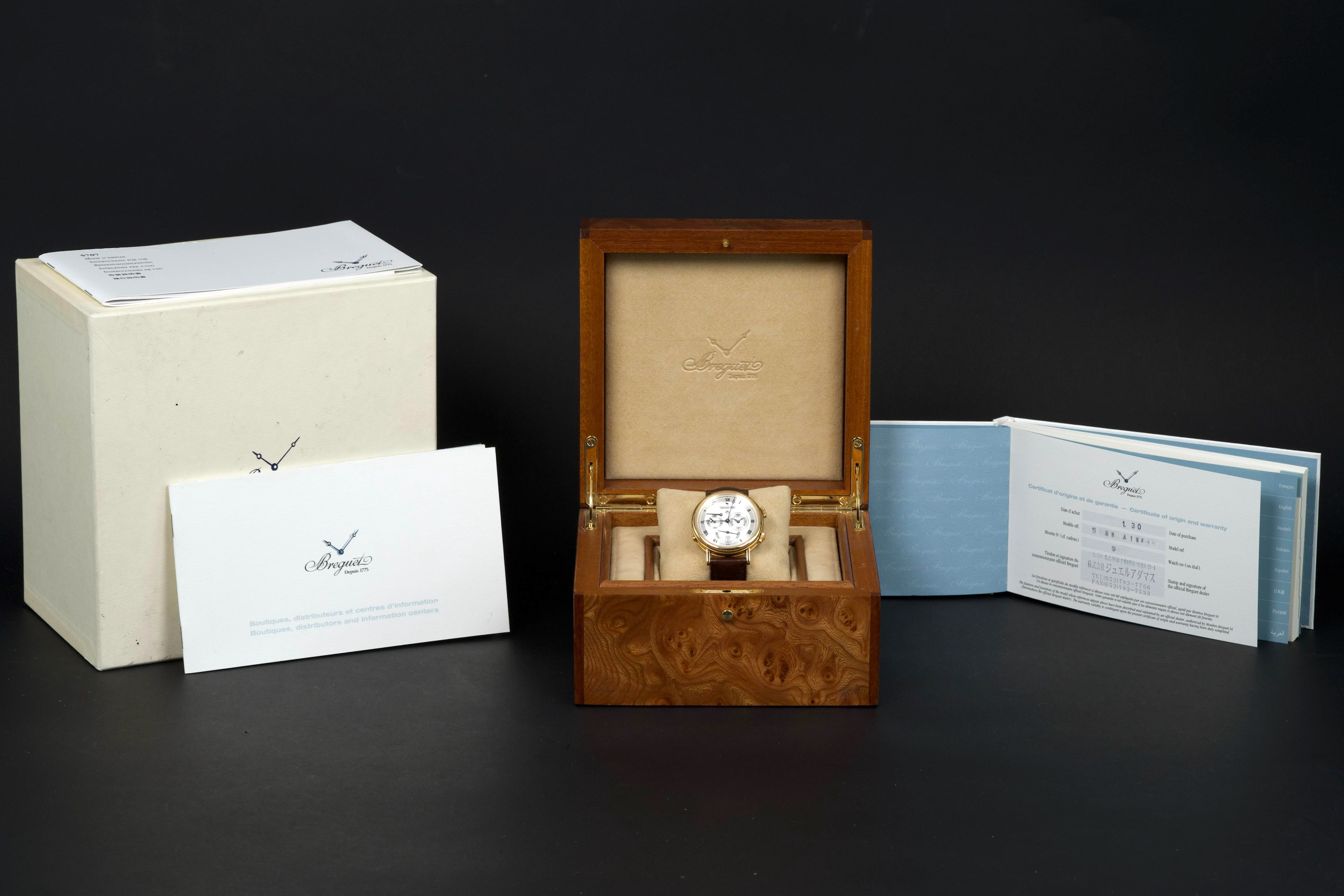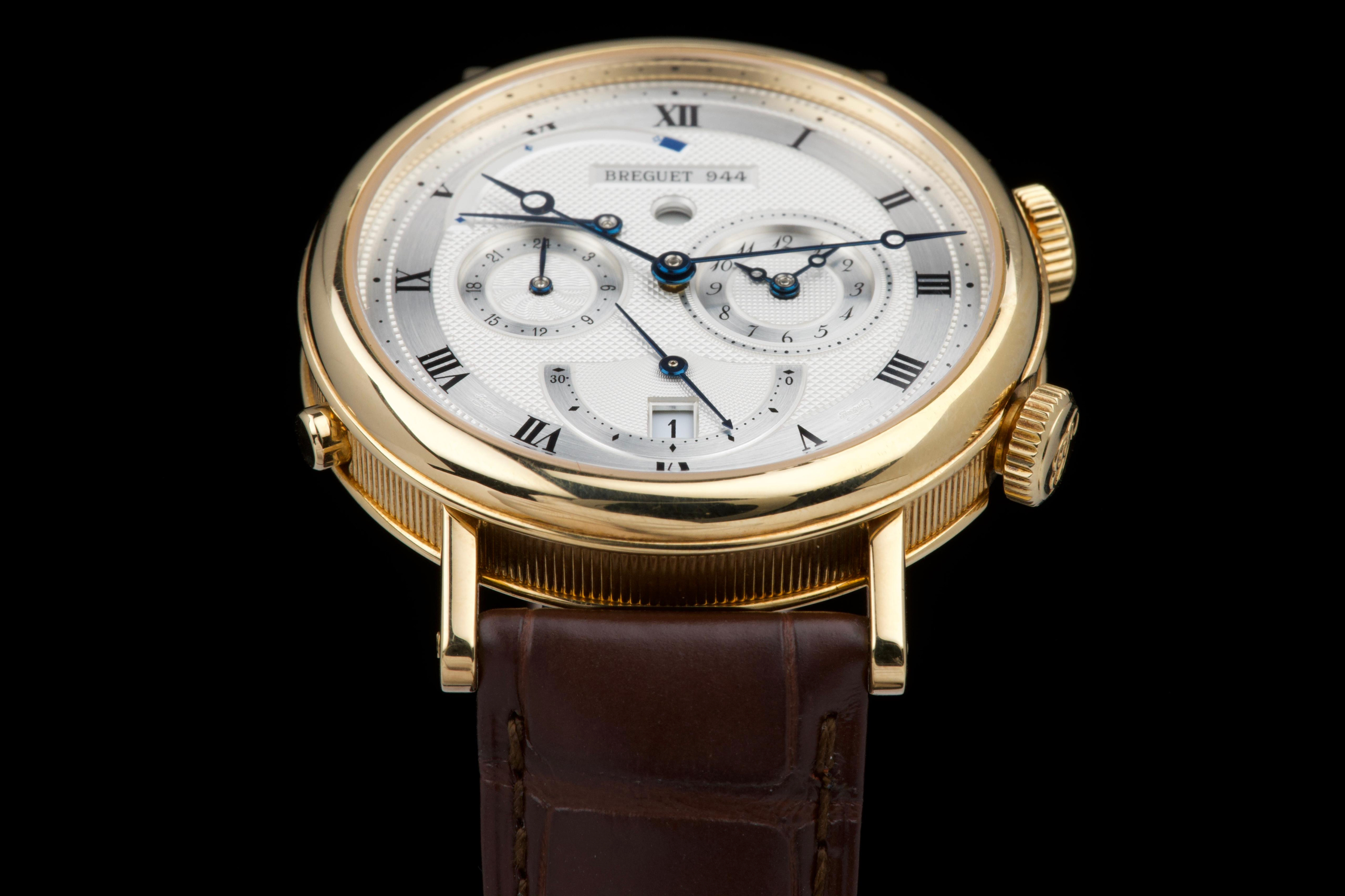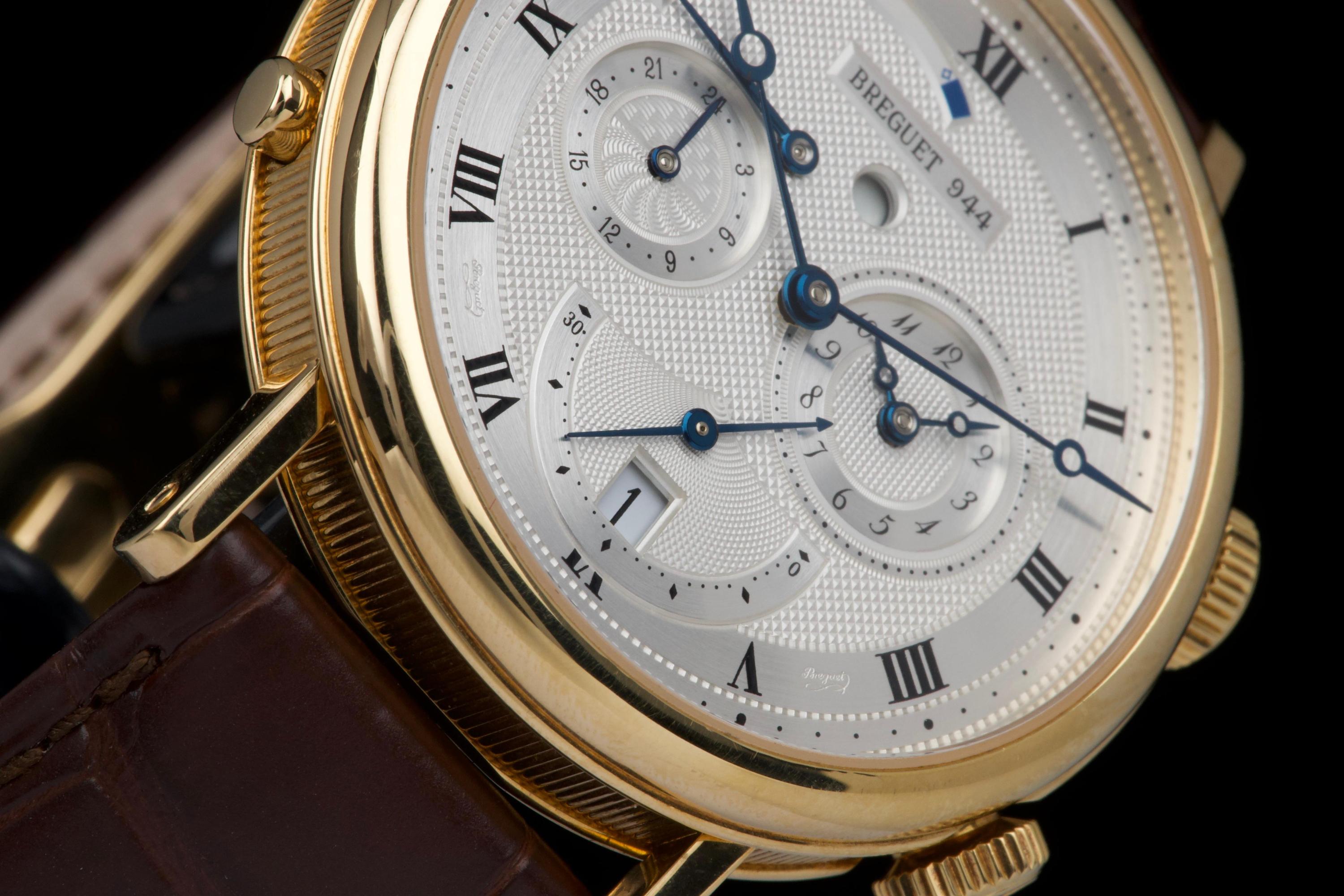 The present Breguet Réveil du Tsar reference 5707BA, dating to 2007 and offered as a complete full set, is a highly impressive and technically sophisticated example of Breguet’s modern high-complication watchmaking. Originally sold new in Japan in 2007, this watch represents one of the manufacture’s most distinctive alarm wristwatches, combining classical aesthetics with remarkable mechanical ingenuity. Executed in 18K yellow gold, the case appears to be unpolished and is preserved in outstanding overall condition, retaining crisp lines and sharp detailing throughout. The watch presents in top condition and shows only minimal signs of careful use. The dial is beautifully executed with hand-guilloché decoration, showcasing Breguet’s traditional engine-turned craftsmanship and providing exceptional depth and refinement. Powering the watch is an automatic movement incorporating Breguet’s proprietary mechanical alarm complication, allowing the wearer to set and activate an acoustic alarm—an uncommon and highly desirable feature in traditional haute horlogerie. Despite the lack of documented service history, the watch is in perfect working condition at the time of cataloguing, including full functionality of the alarm mechanism. The watch is fitted with a brand-new brown Breguet crocodile leather strap, paired with a yellow-gold Breguet deployant clasp, completing the ensemble with full material and aesthetic coherence. Delivered as a full set, this Réveil du Tsar represents a rare opportunity to acquire a top-condition example of one of Breguet’s most technically and visually distinctive modern complications. Combining alarm functionality, classical guilloché artistry, precious-metal execution, and outstanding preservation, this Réveil du Tsar 5707BA stands as a compelling and highly collectible modern Breguet, equally appealing to connoisseurs of traditional complications and contemporary high watchmaking.