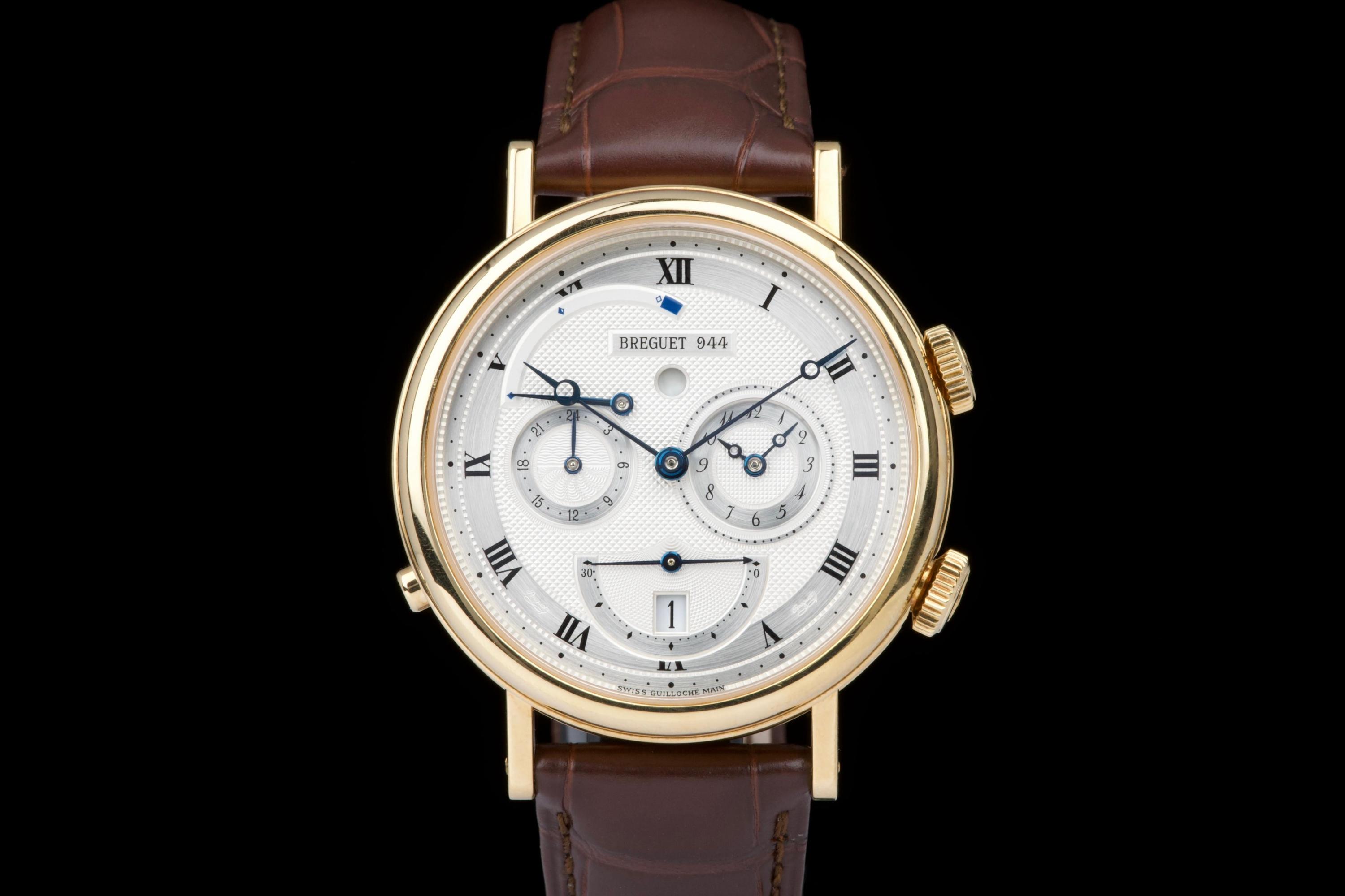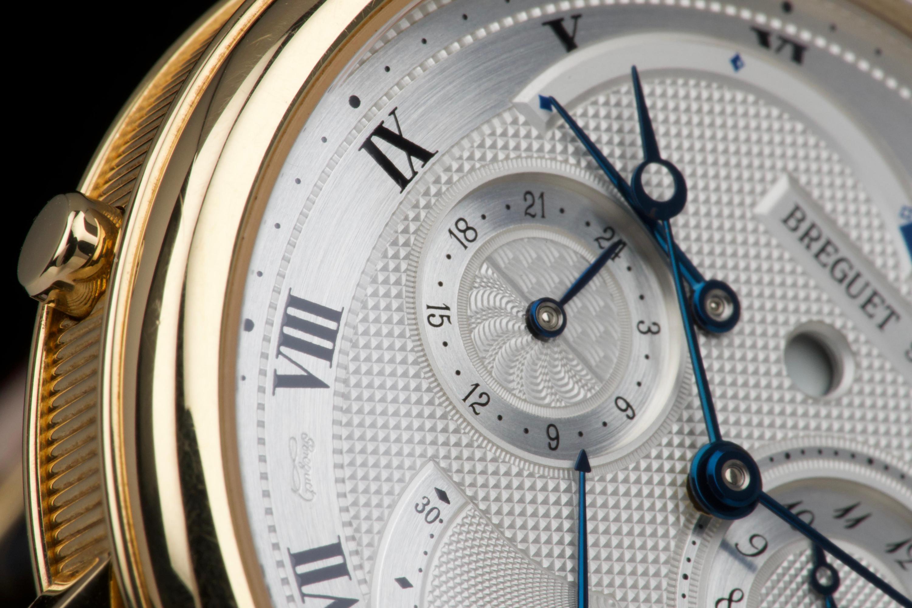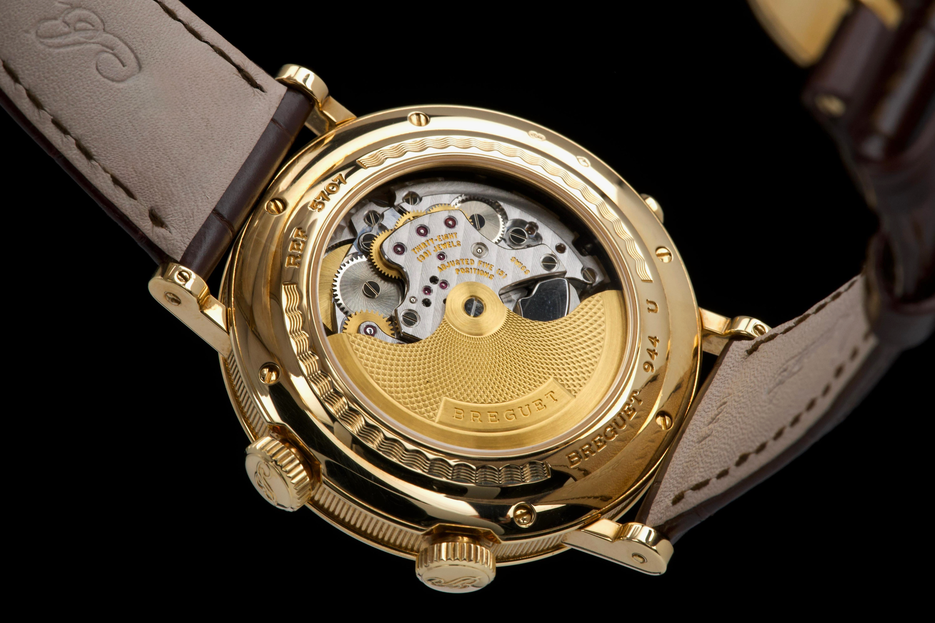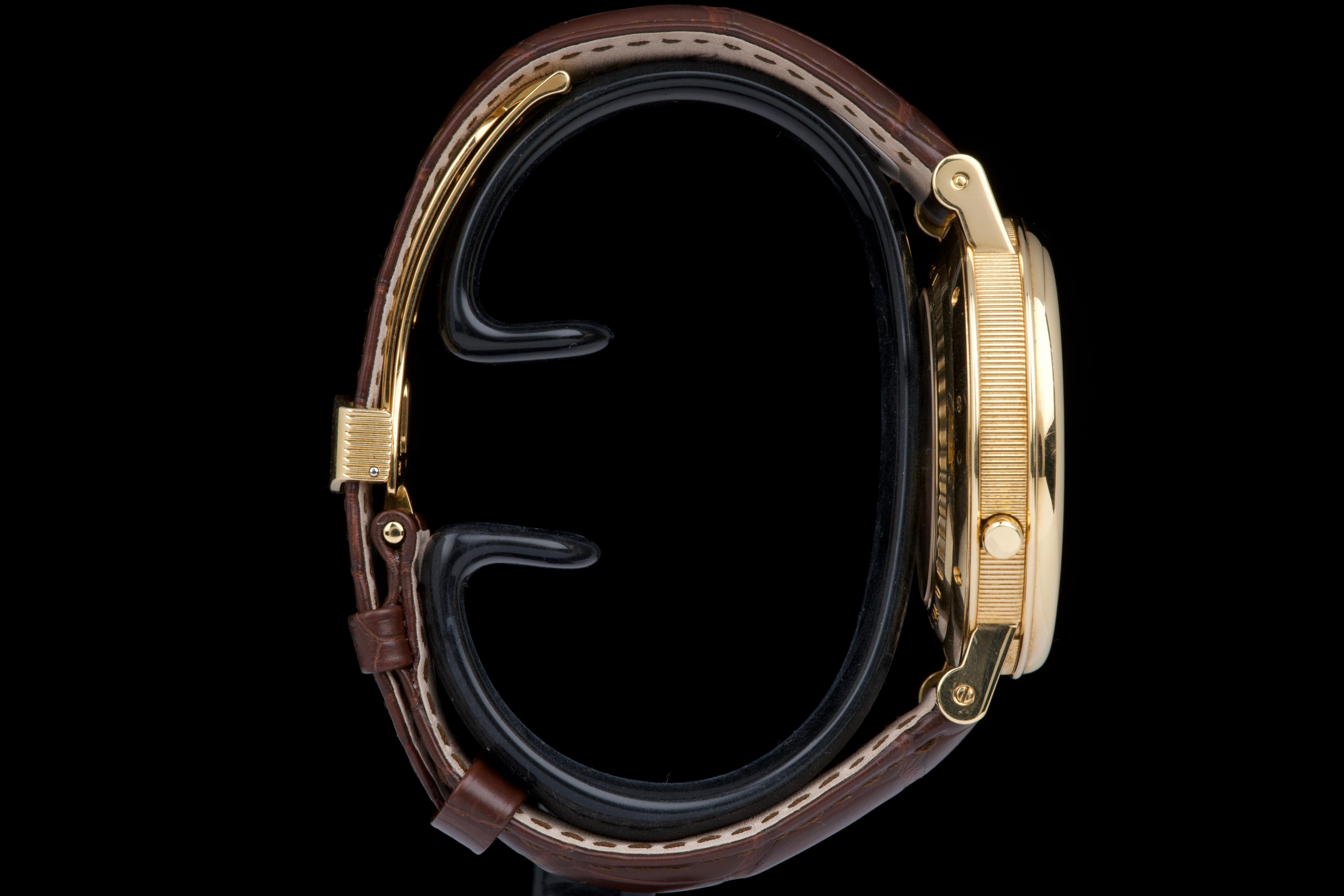The present Breguet Réveil du Tsar reference 5707BA, dating to 2007 and offered as a complete full set, is a highly impressive and technically sophisticated example of Breguet’s modern high-complication watchmaking. Originally sold new in Japan in 2007, this watch represents one of the manufacture’s most distinctive alarm wristwatches, combining classical aesthetics with remarkable mechanical ingenuity. Executed in 18K yellow gold, the case appears to be unpolished and is preserved in outstanding overall condition, retaining crisp lines and sharp detailing throughout. The watch presents in top condition and shows only minimal signs of careful use. The dial is beautifully executed with hand-guilloché decoration, showcasing Breguet’s traditional engine-turned craftsmanship and providing exceptional depth and refinement. Powering the watch is an automatic movement incorporating Breguet’s proprietary mechanical alarm complication, allowing the wearer to set and activate an acoustic alarm—an uncommon and highly desirable feature in traditional haute horlogerie. Despite the lack of documented service history, the watch is in perfect working condition at the time of cataloguing, including full functionality of the alarm mechanism. The watch is fitted with a brand-new brown Breguet crocodile leather strap, paired with a yellow-gold Breguet deployant clasp, completing the ensemble with full material and aesthetic coherence. Delivered as a full set, this Réveil du Tsar represents a rare opportunity to acquire a top-condition example of one of Breguet’s most technically and visually distinctive modern complications. Combining alarm functionality, classical guilloché artistry, precious-metal execution, and outstanding preservation, this Réveil du Tsar 5707BA stands as a compelling and highly collectible modern Breguet, equally appealing to connoisseurs of traditional complications and contemporary high watchmaking.