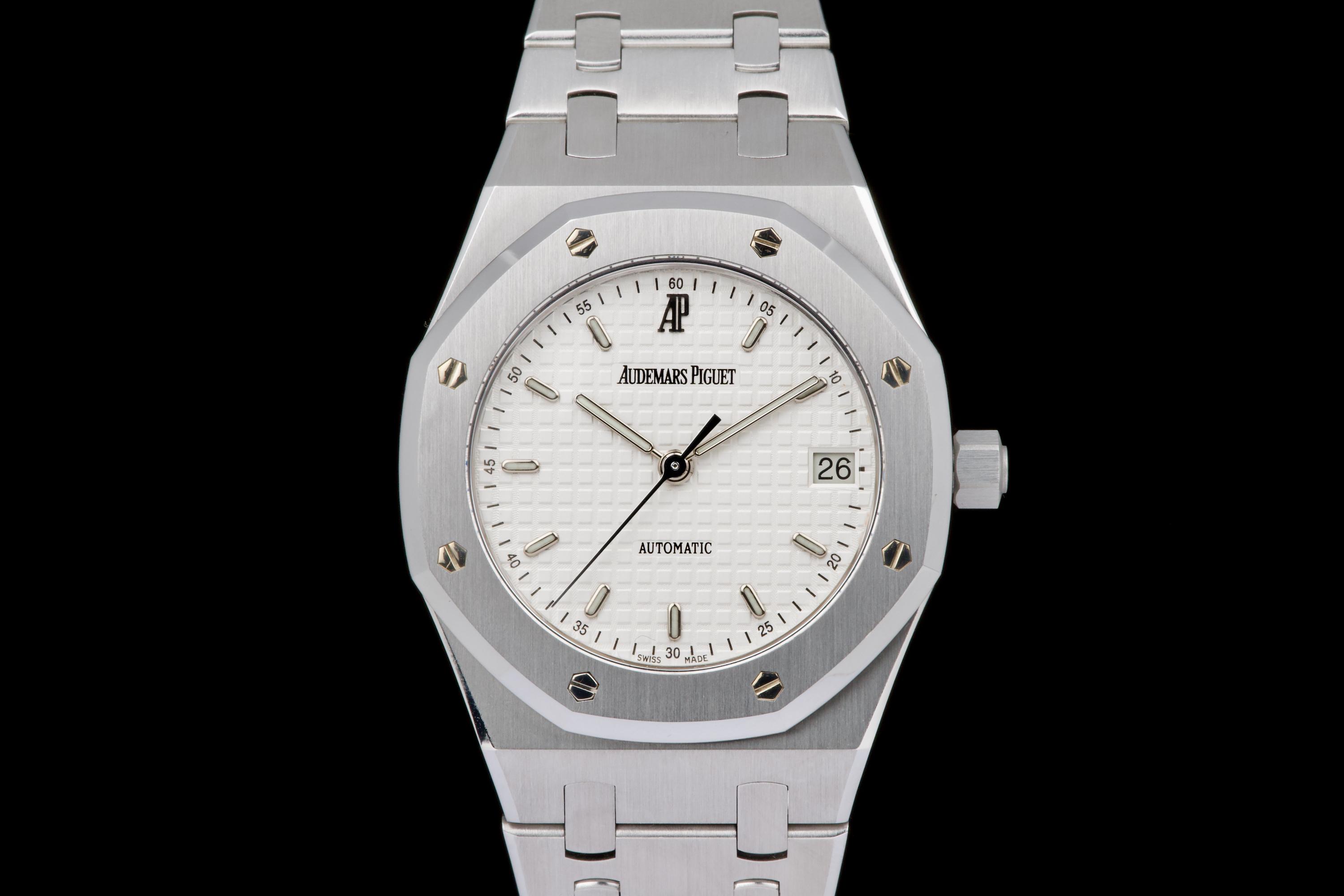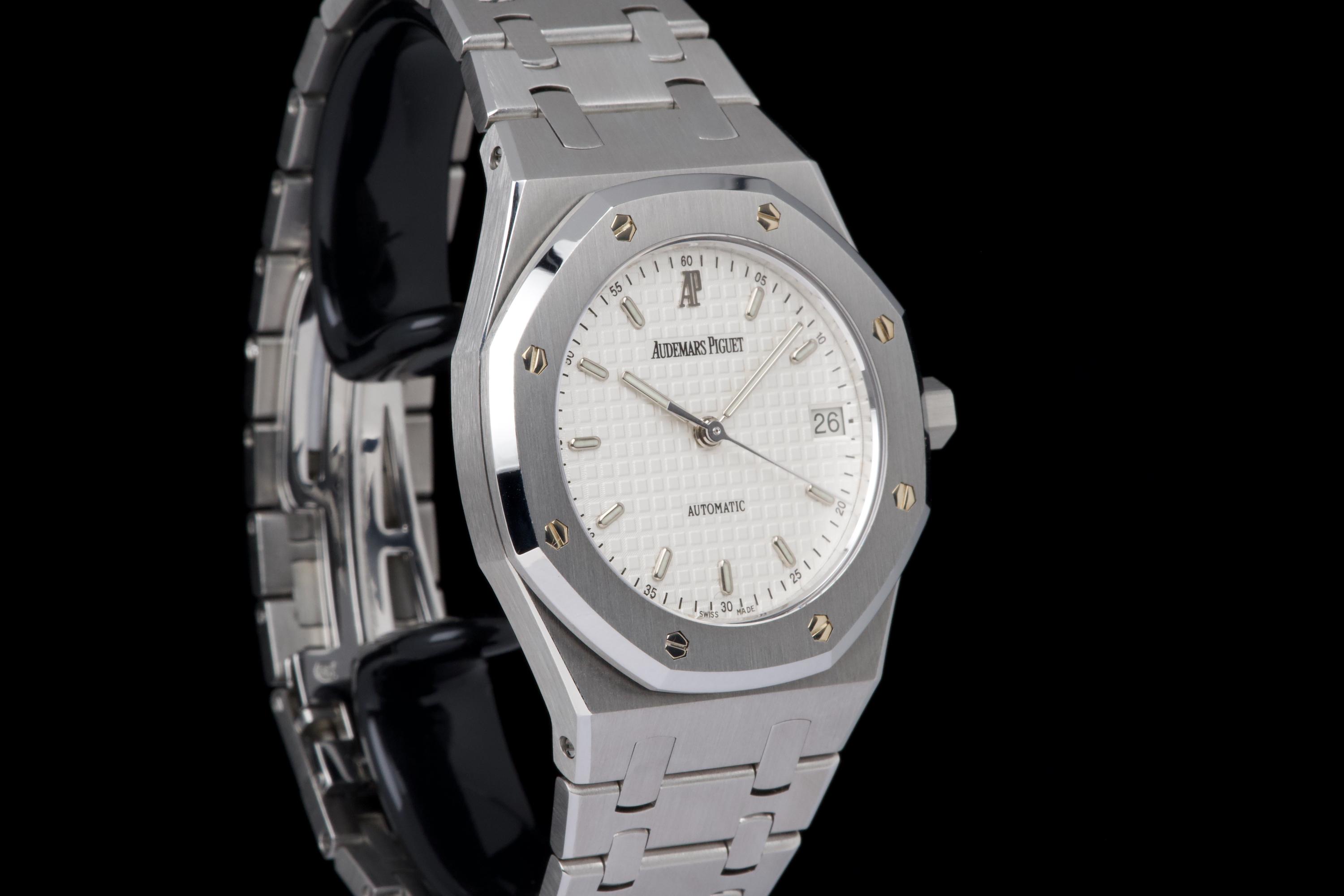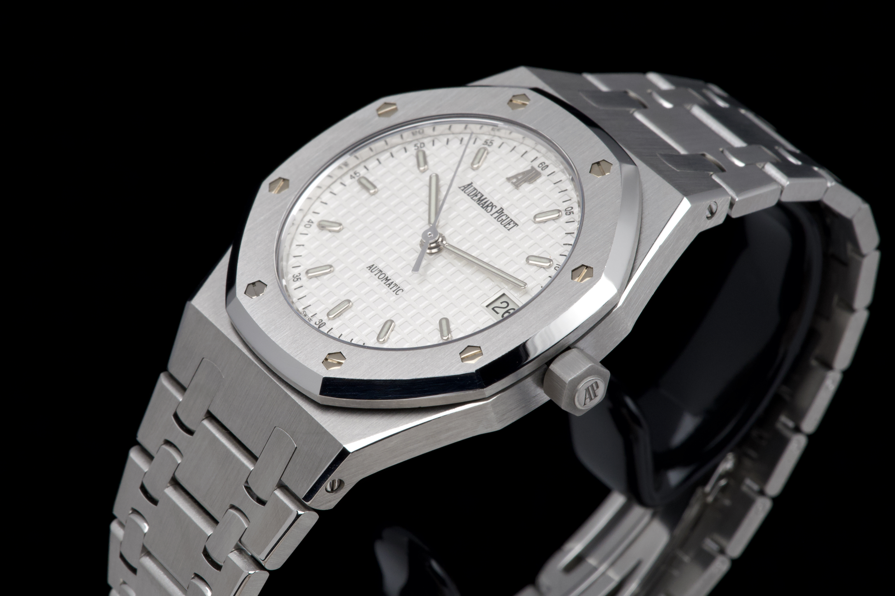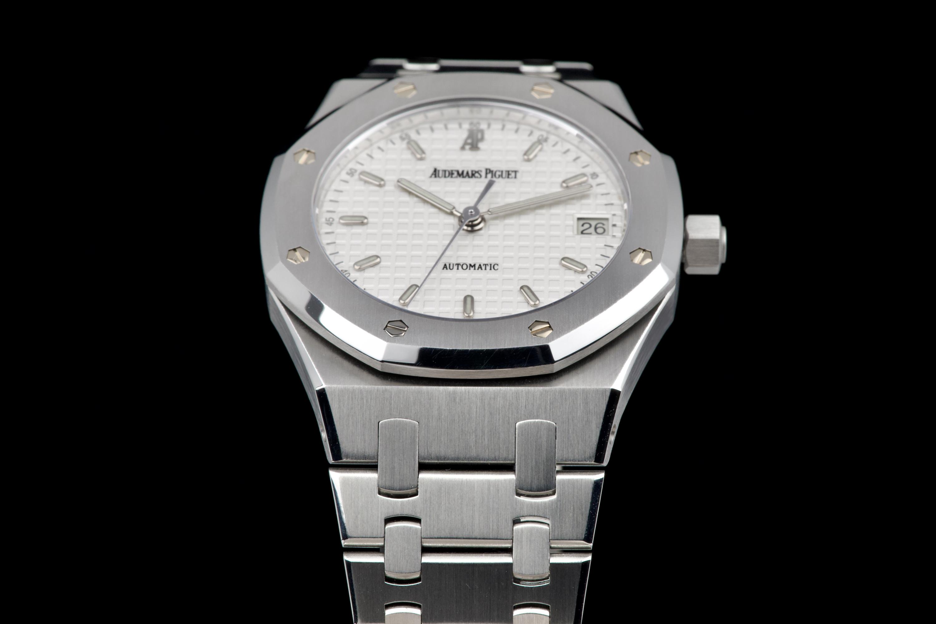 An exceptional and likely unique example of the Audemars Piguet Royal Oak 14790ST, featuring a white tapisserie dial and an engraving of the number “1” on the caseback. This same number “1” is also printed on the original warranty papers next to the case number, confirming that it was factory-delivered this way — not a later addition. The watch has just returned from a complete service (including light polishing) by Audemars Piguet in 2025, and is therefore covered by a two-year AP service warranty. It is in outstanding condition, with a sharp and clean case, and a bracelet showing minimal stretch, with all links present. Complete with its original box and papers. A superb and highly unusual Royal Oak 14790 — combining rarity, provenance, and freshly serviced condition.