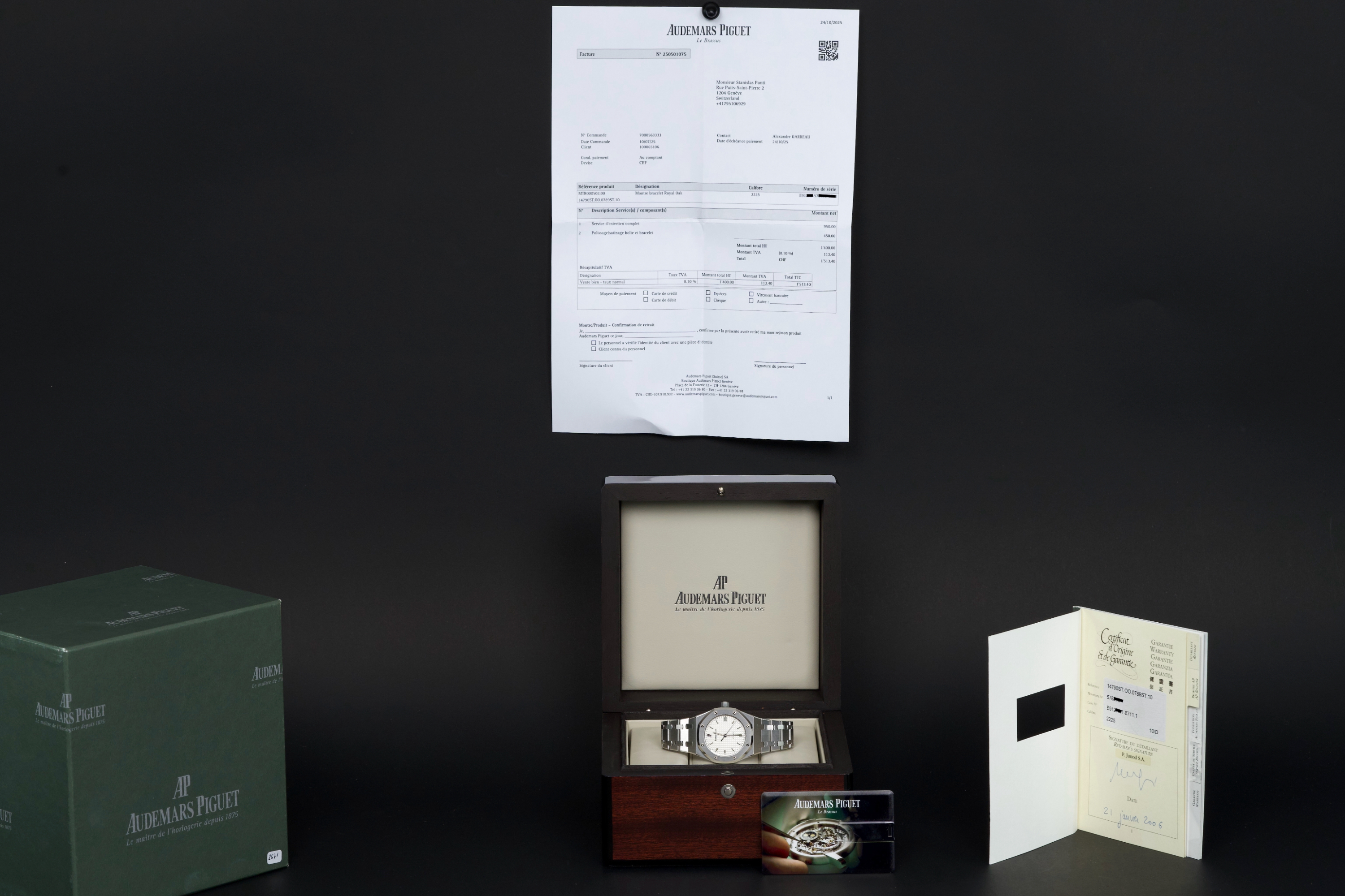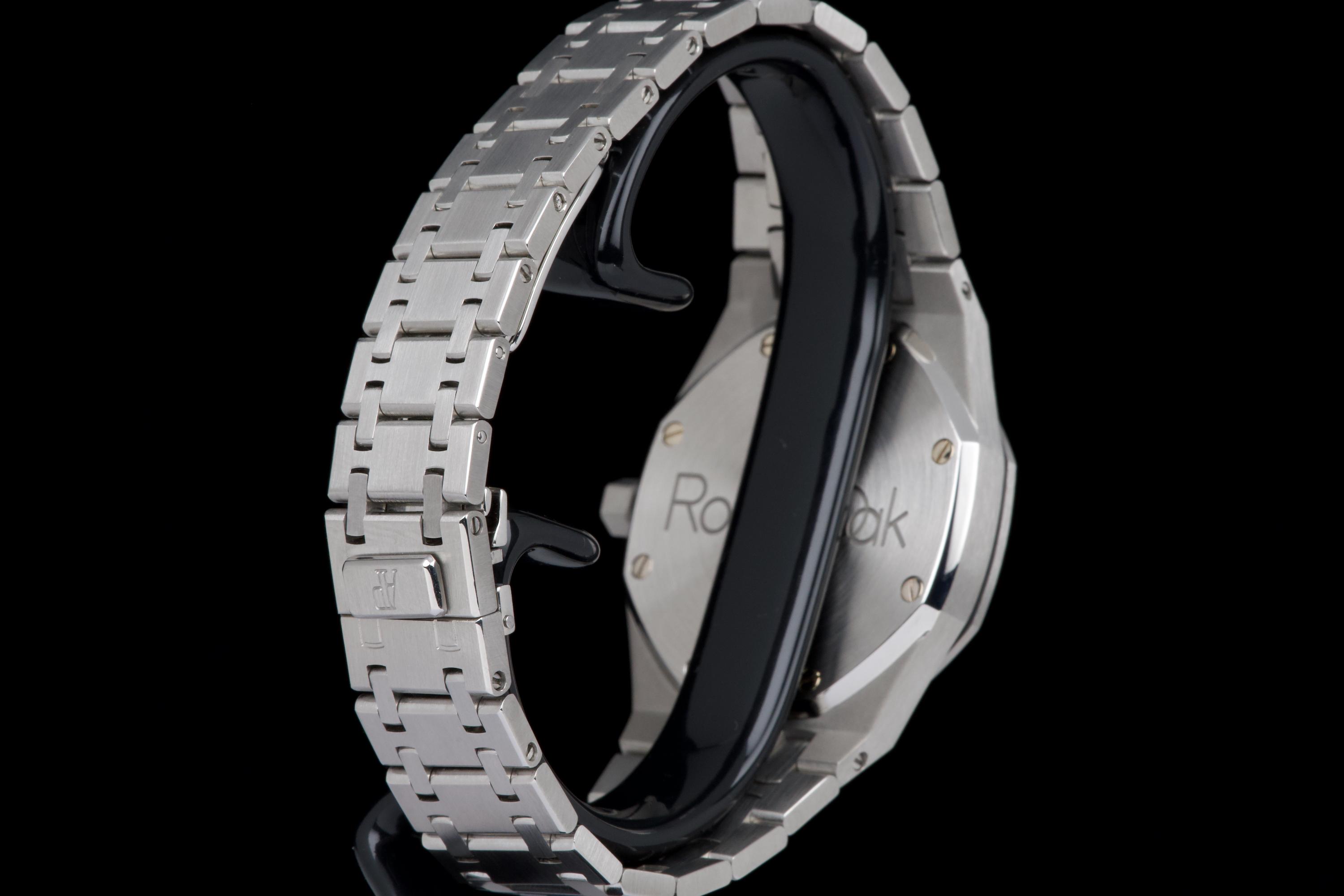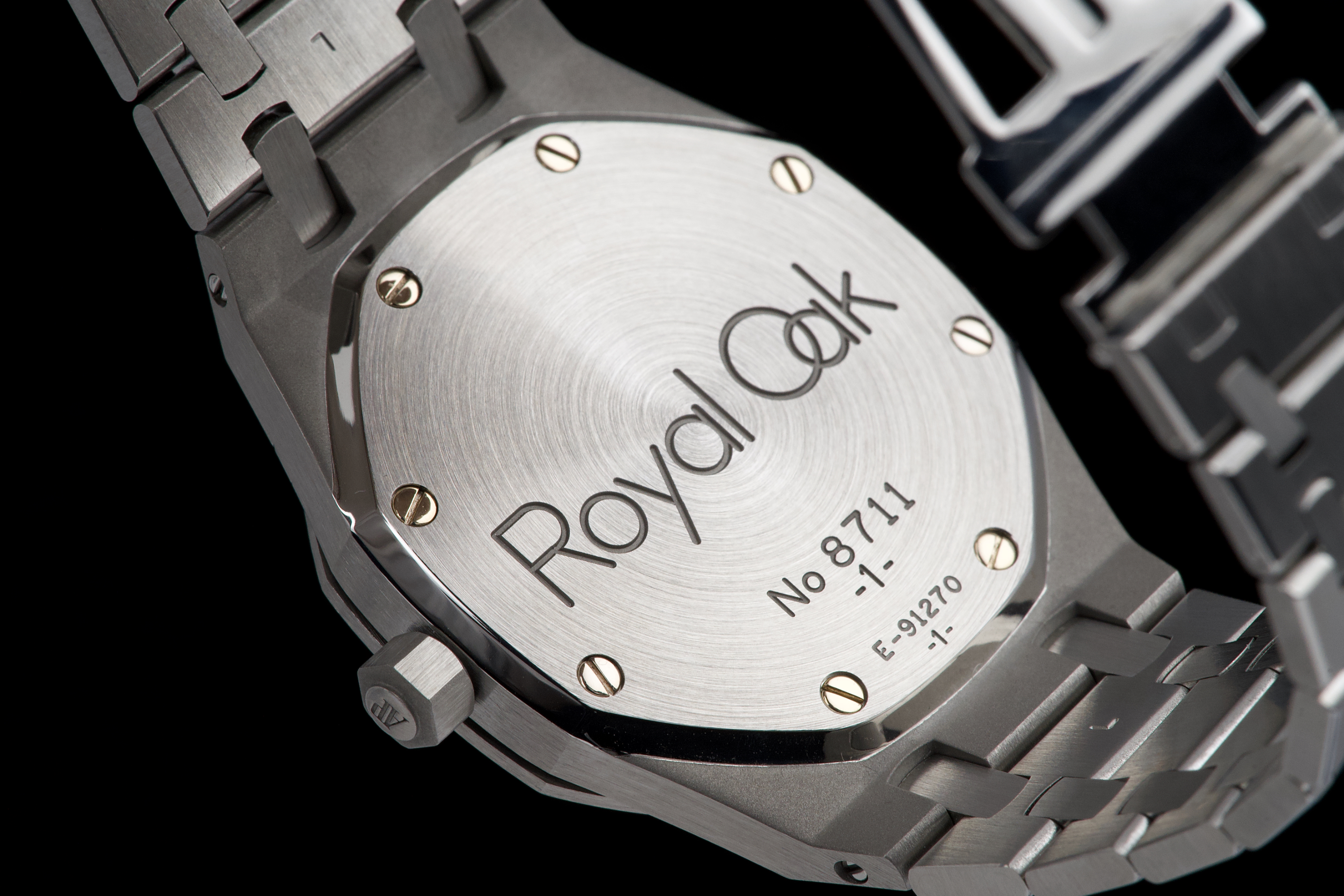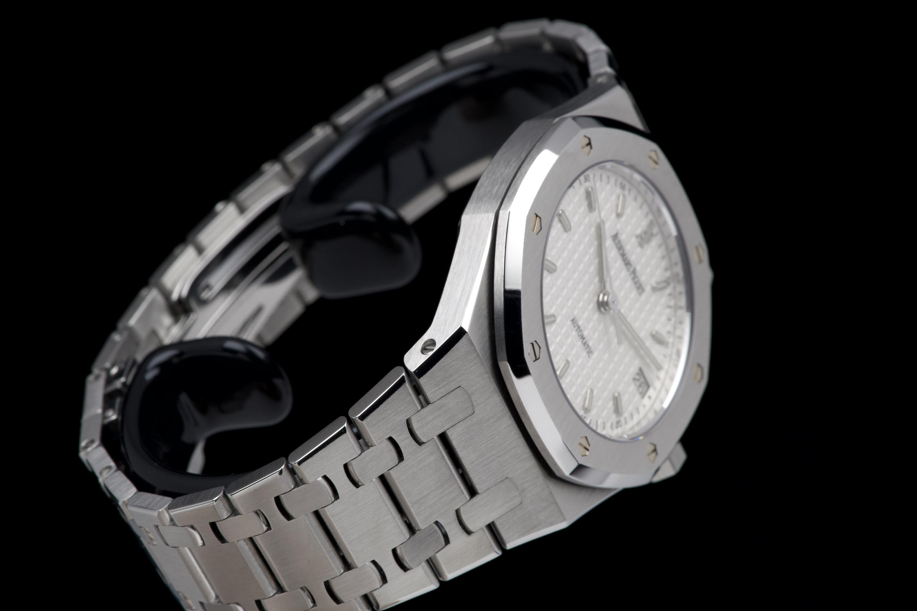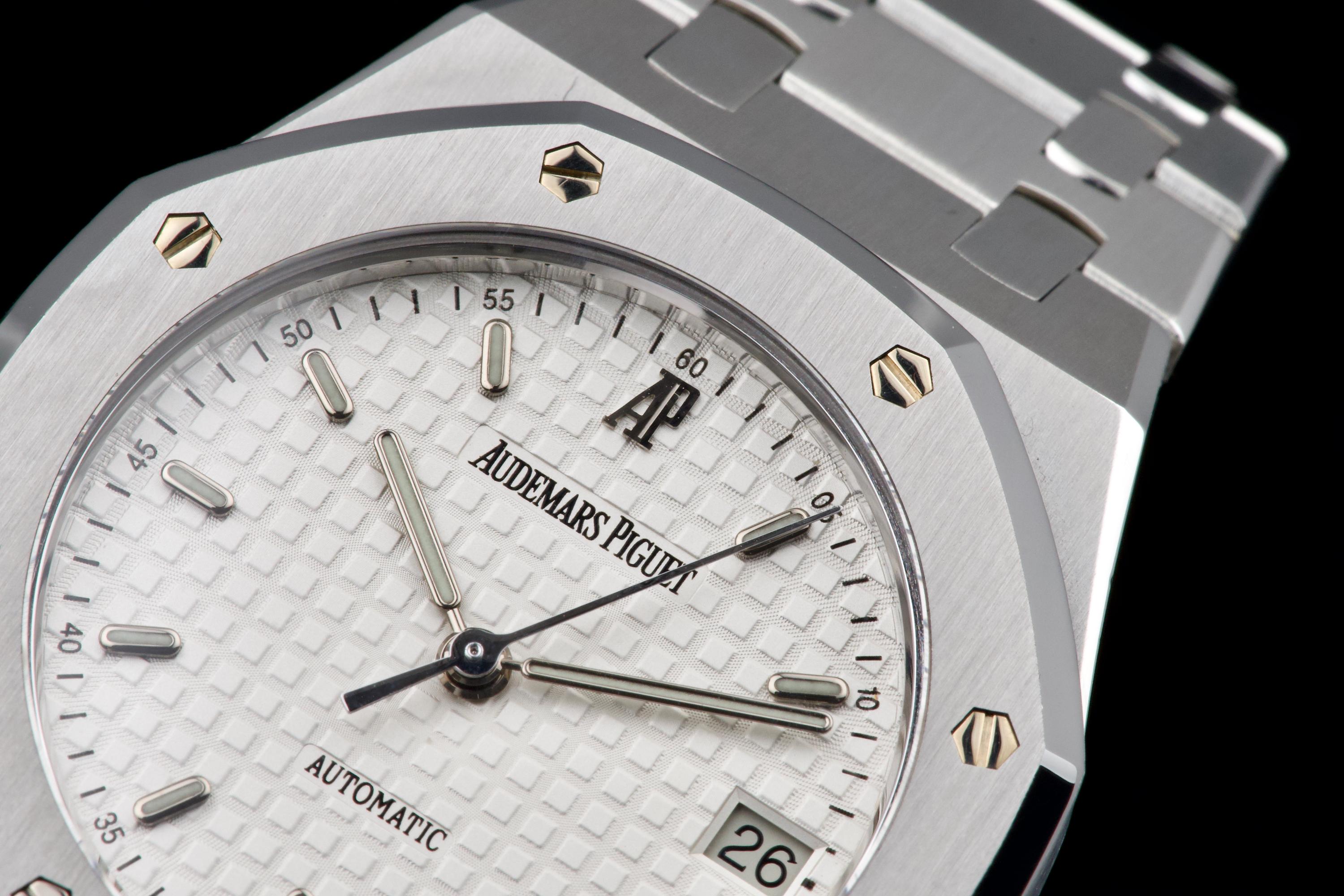 An exceptional and likely unique example of the Audemars Piguet Royal Oak 14790ST, featuring a white tapisserie dial and an engraving of the number “1” on the caseback. This same number “1” is also printed on the original warranty papers next to the case number, confirming that it was factory-delivered this way — not a later addition. The watch has just returned from a complete service (including light polishing) by Audemars Piguet in 2025, and is therefore covered by a two-year AP service warranty. It is in outstanding condition, with a sharp and clean case, and a bracelet showing minimal stretch, with all links present. Complete with its original box and papers. A superb and highly unusual Royal Oak 14790 — combining rarity, provenance, and freshly serviced condition.