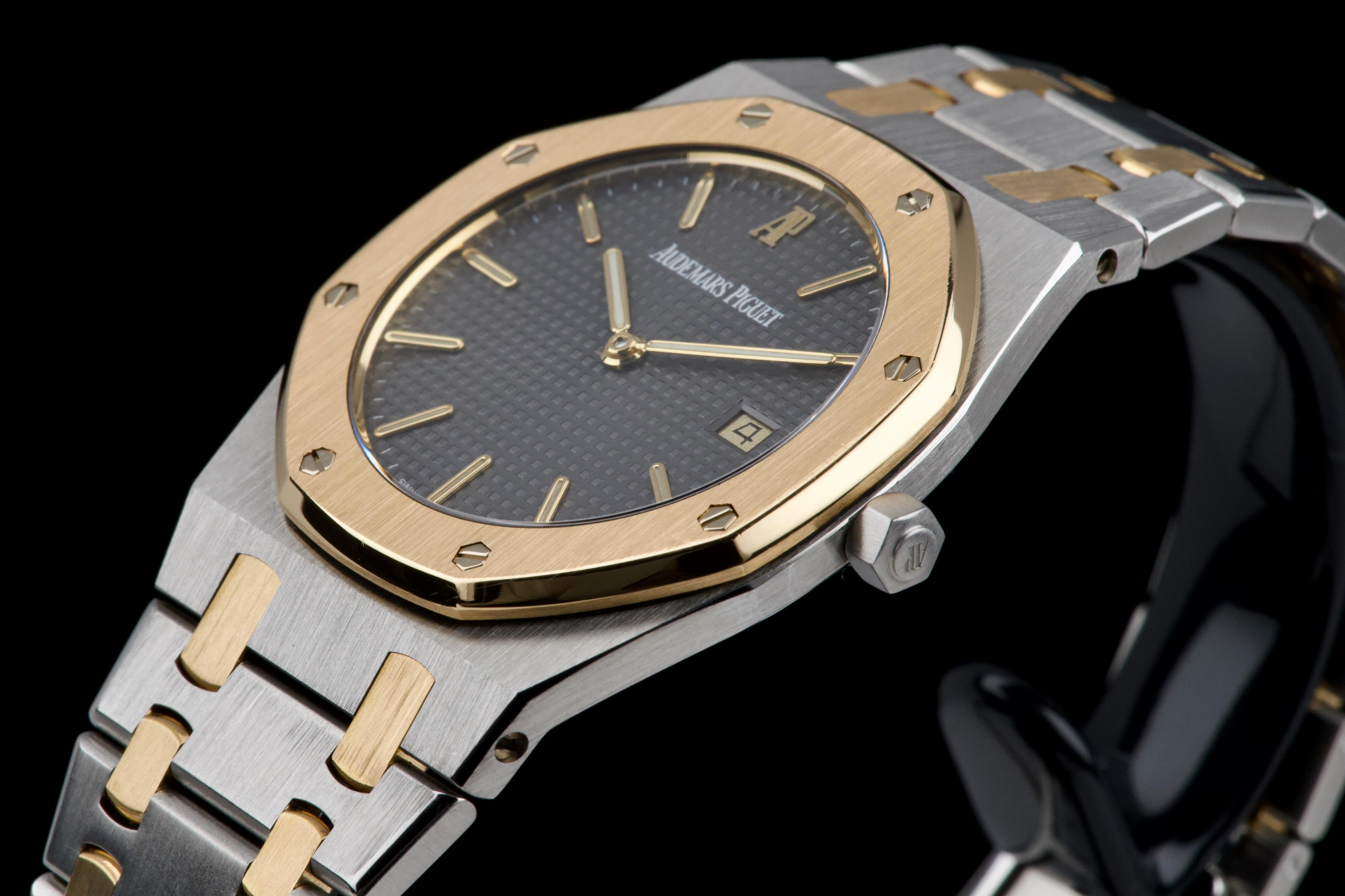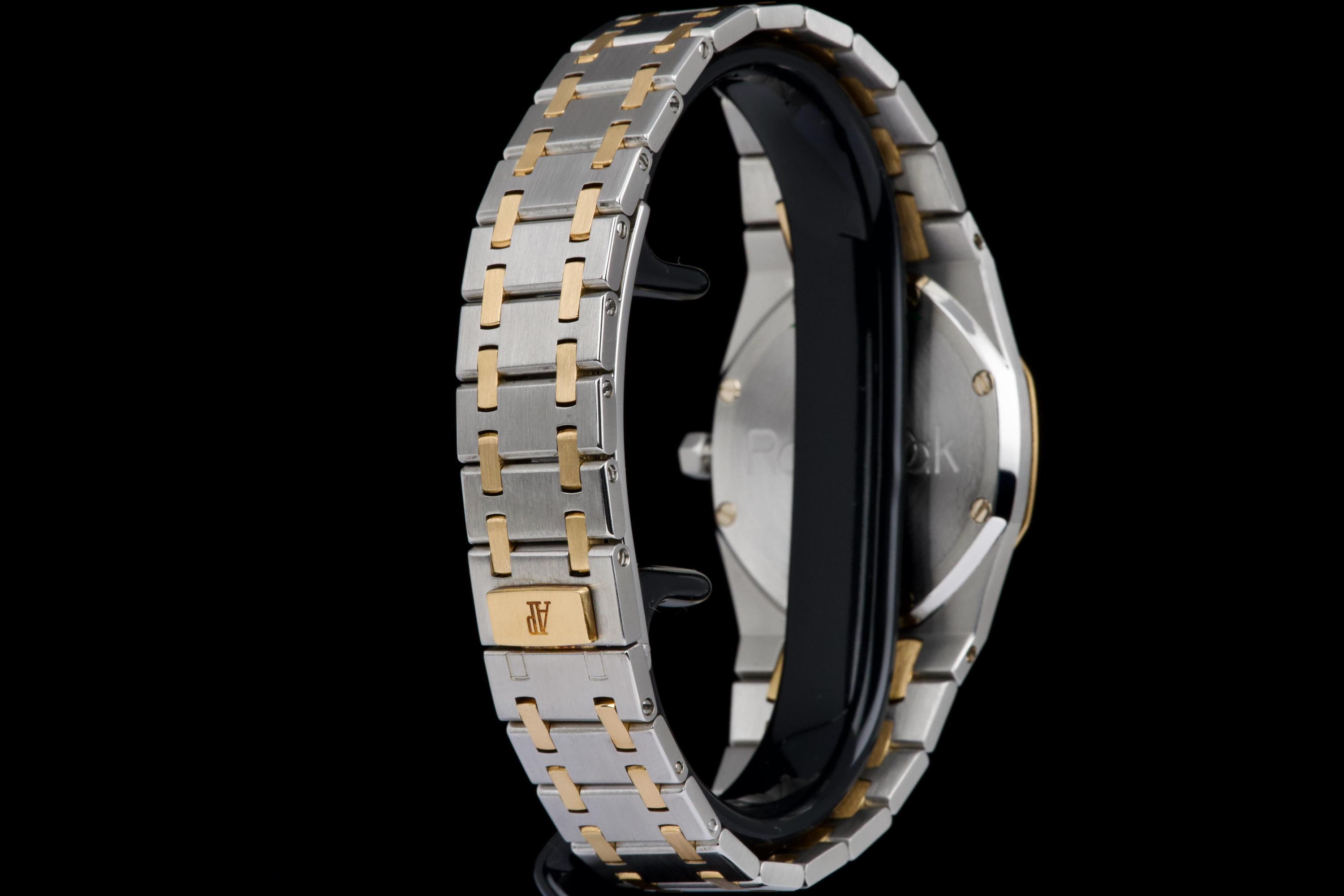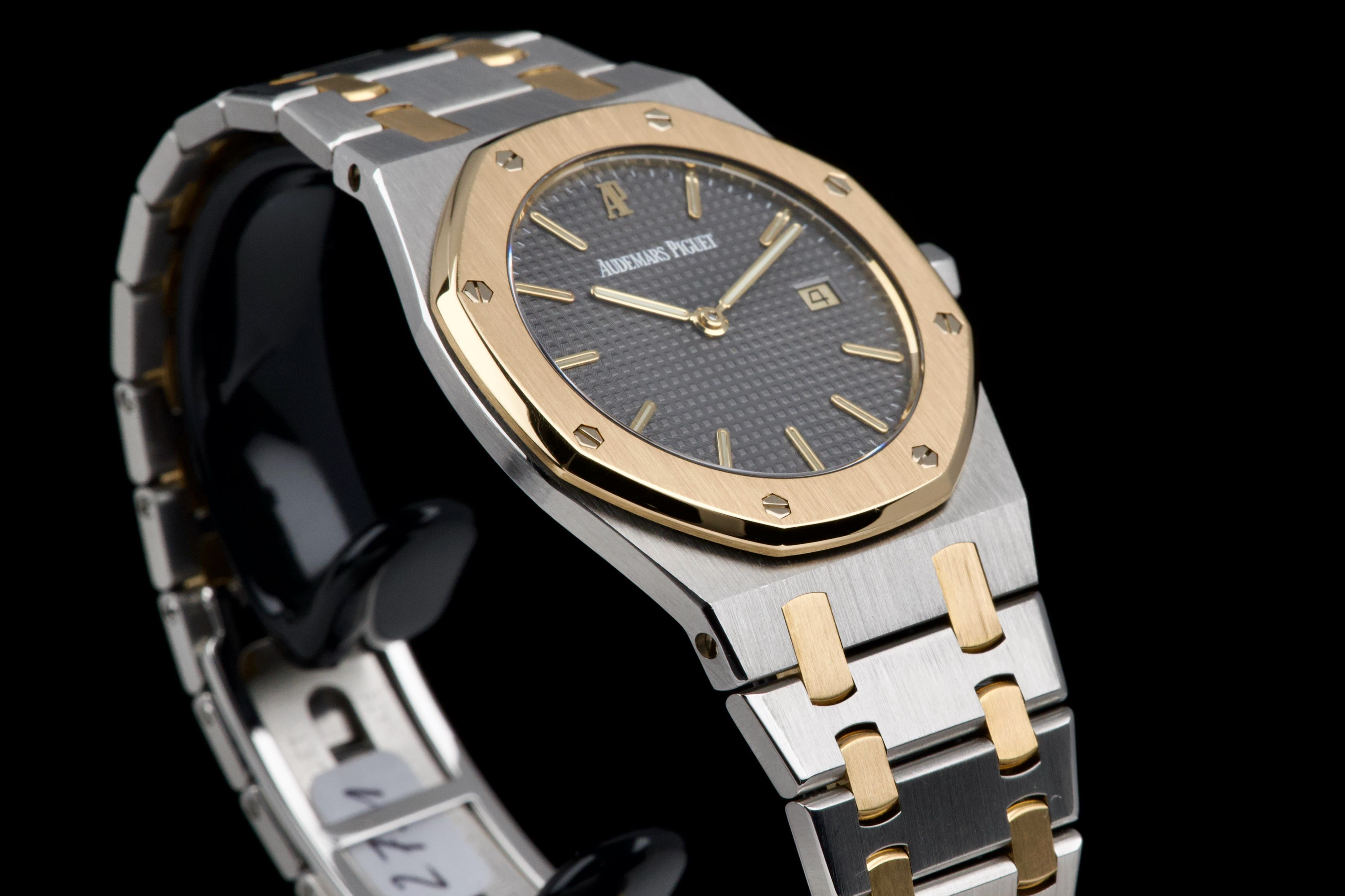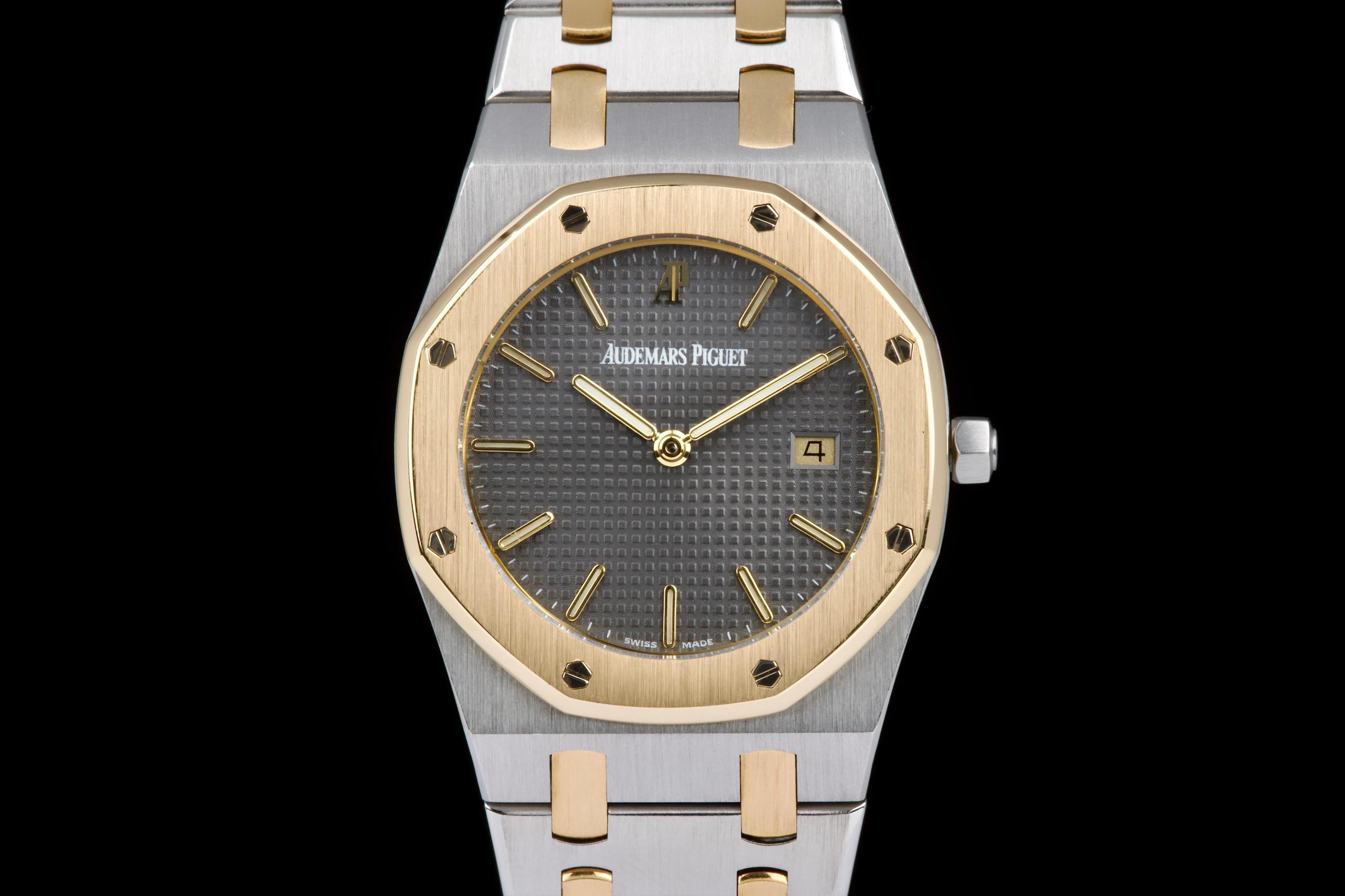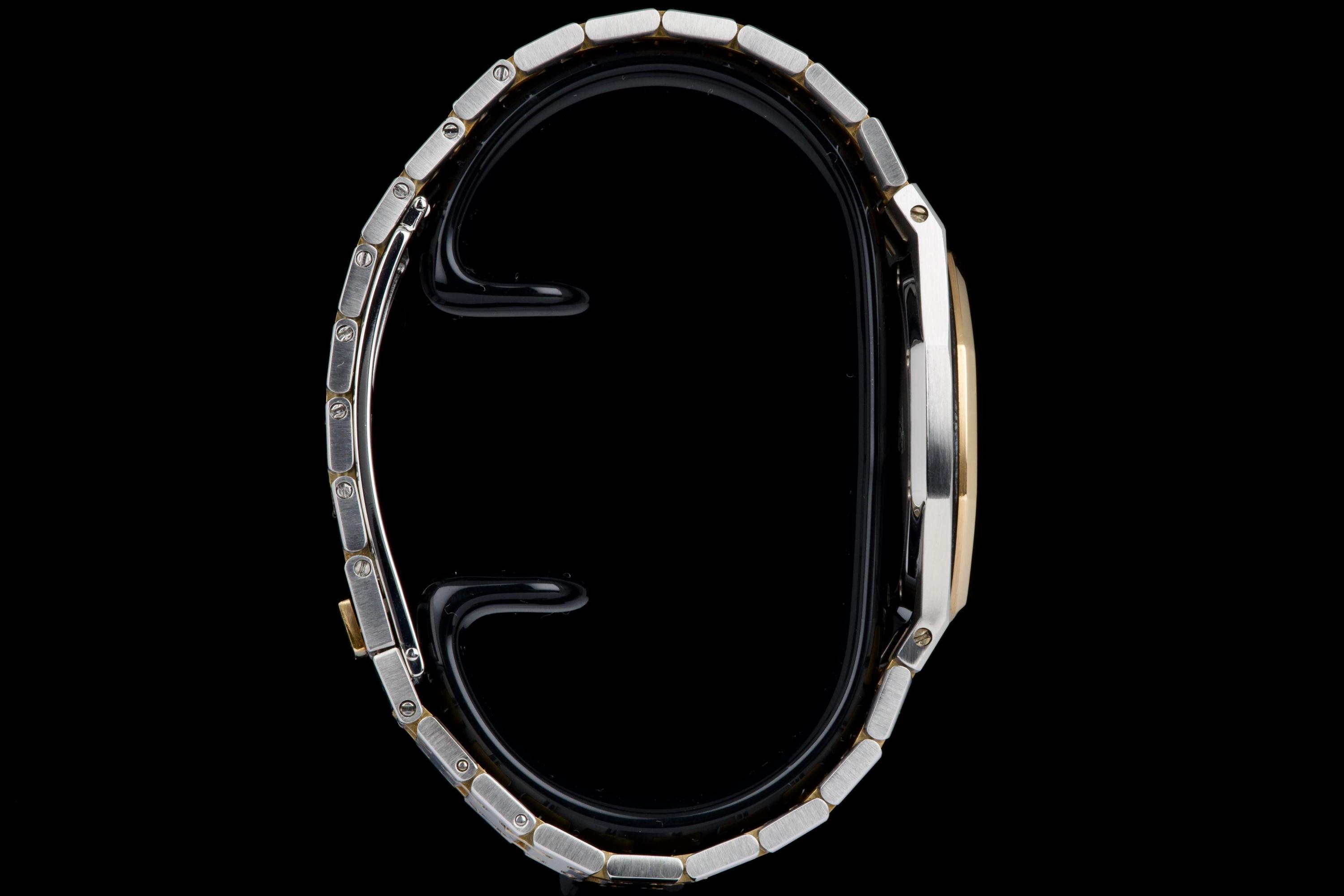 The present Audemars Piguet Royal Oak Midsize reference 56175SA/O/0789SA/01 is an elegant and highly wearable example of Gérald Genta’s iconic design, executed in a refined two-tone combination of stainless steel and yellow gold. Purchased in Japan in April 2008 and accompanied by its original box, manufacturer warranty, and a repair invoice from April 2015, this watch offers both aesthetic appeal and reassuring documentation. The watch measures approximately 33 × 33 mm with a thickness of about 6 mm, giving it a slim, comfortable profile that sits perfectly on the wrist while preserving the unmistakable Royal Oak presence. The integrated bracelet fits wrists up to approximately 18.5 cm. The grey dial provides a sophisticated and understated look, complemented by luminous accents for improved legibility and a discreet date display. Powered by a reliable quartz movement, the watch combines precision and practicality with the elegance expected from Audemars Piguet. The sapphire crystal is free from visible damage, while the case, bezel, bracelet, and clasp display only minor surface scratches consistent with careful wear. Overall, the watch is graded Condition A (pre-owned) and presents very attractively. Combining the timeless Royal Oak design, elegant two-tone construction, documented history, and slim midsize proportions, this reference 56175SA represents a compelling opportunity to acquire a refined and versatile Audemars Piguet suitable for both daily wear and formal occasions.