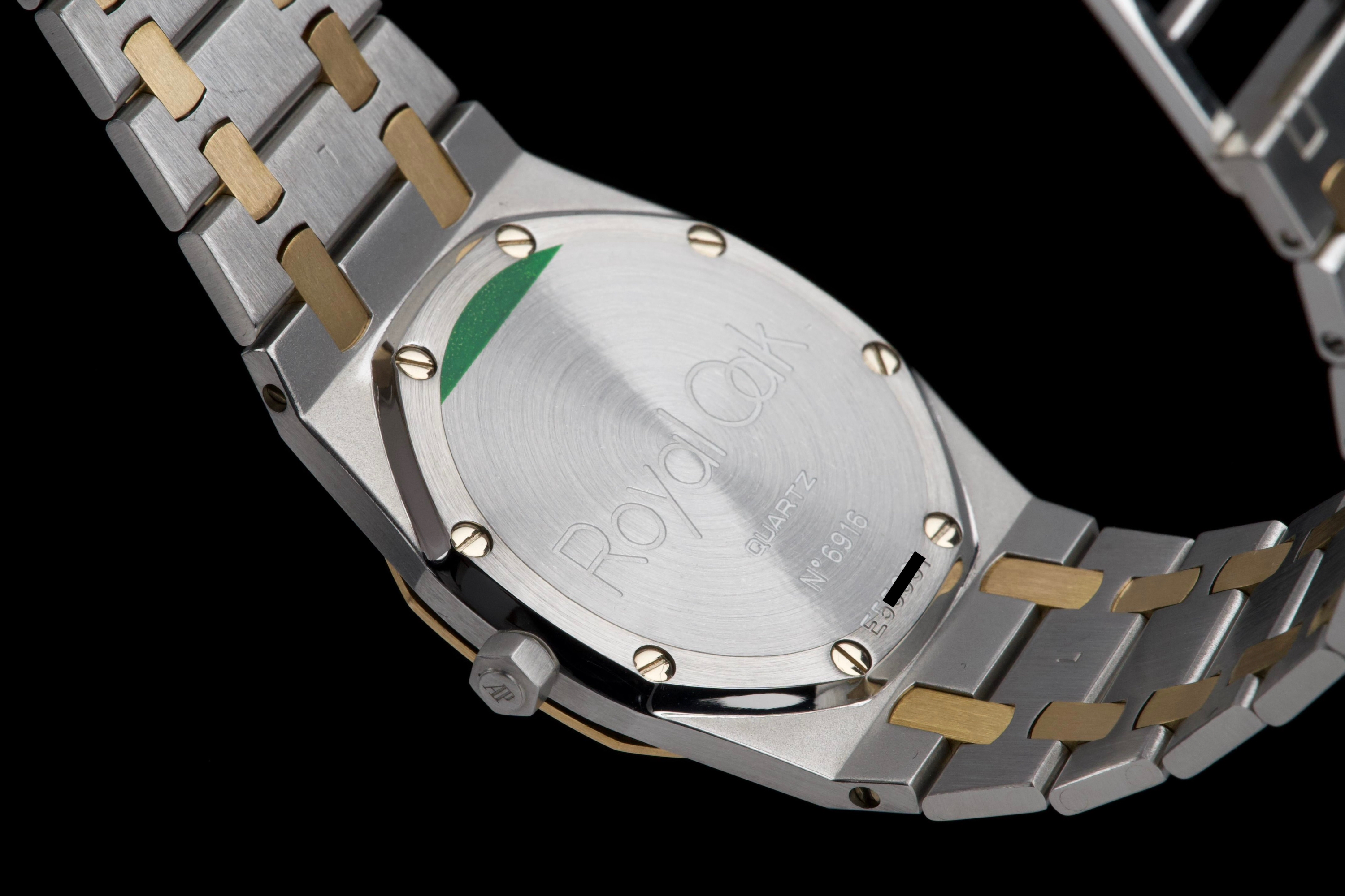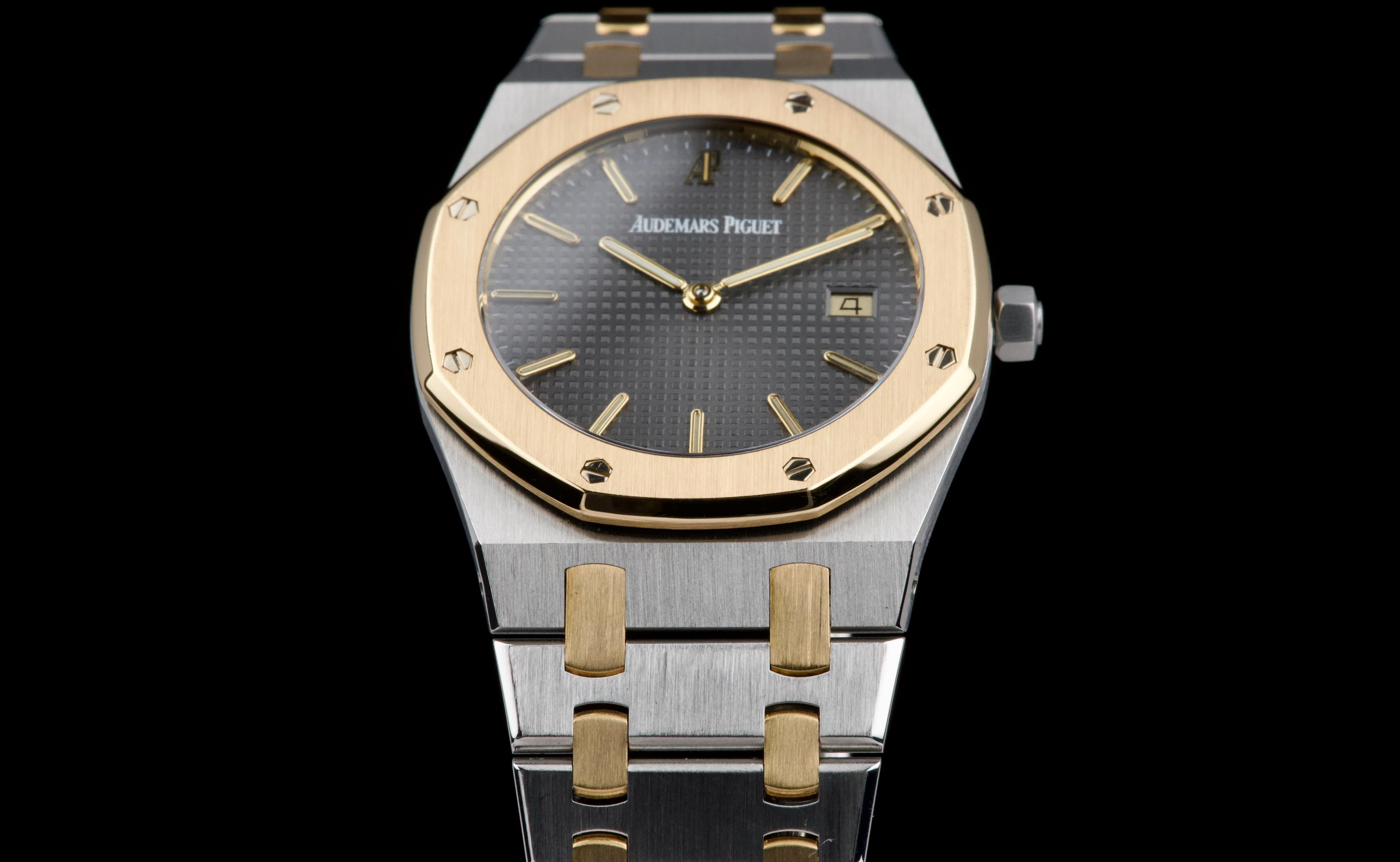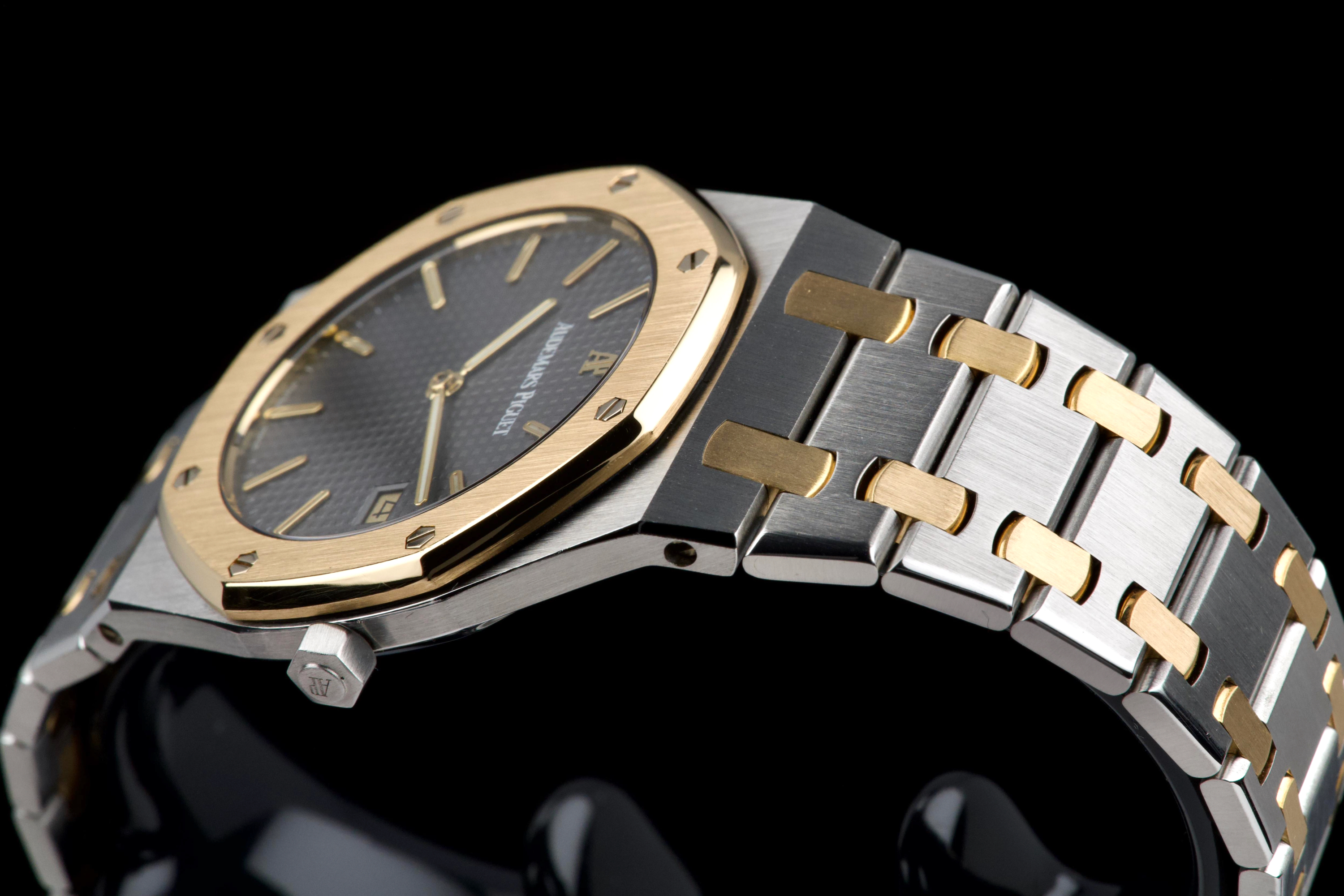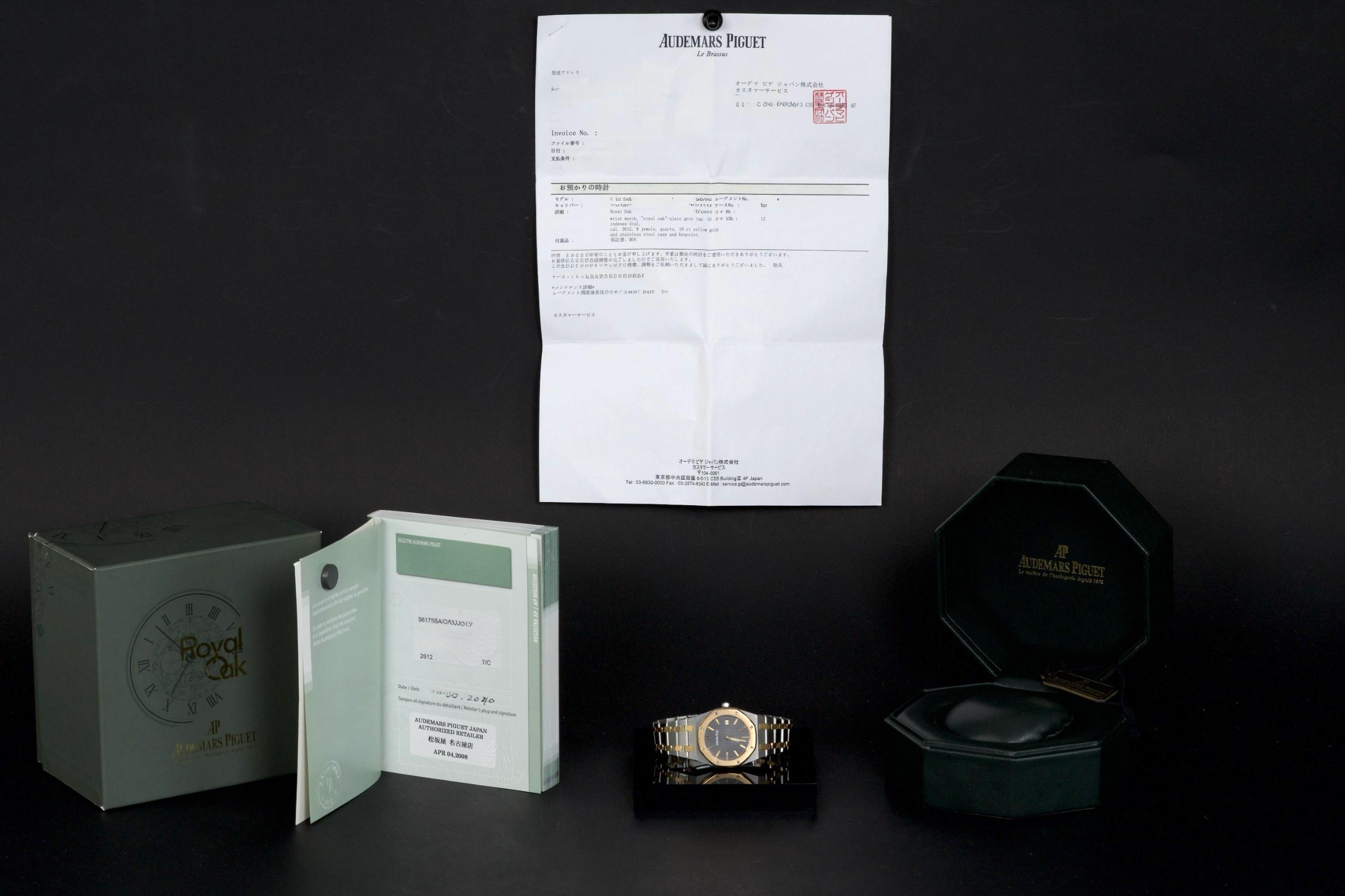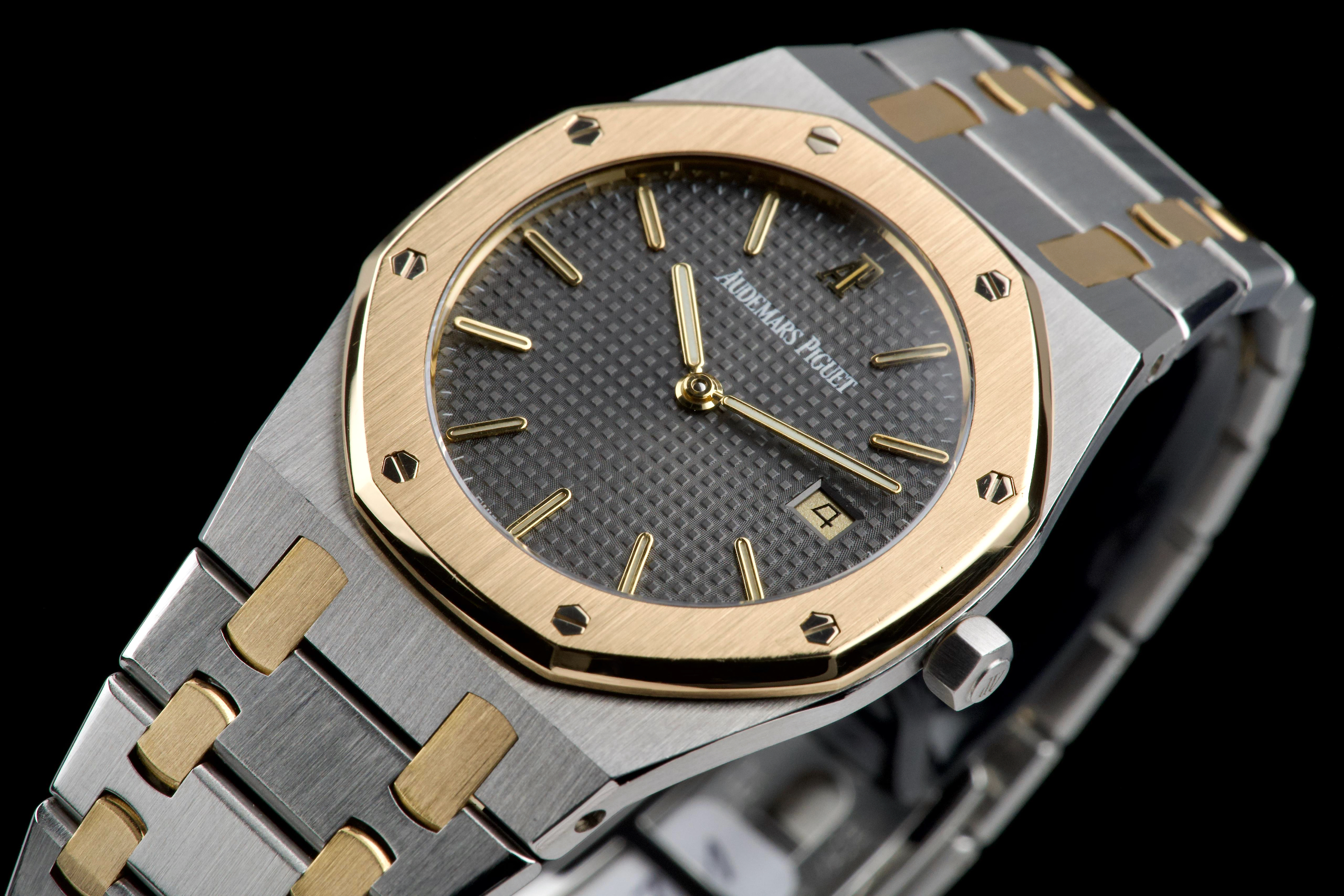 The present Audemars Piguet Royal Oak Midsize reference 56175SA/O/0789SA/01 is an elegant and highly wearable example of Gérald Genta’s iconic design, executed in a refined two-tone combination of stainless steel and yellow gold. Purchased in Japan in April 2008 and accompanied by its original box, manufacturer warranty, and a repair invoice from April 2015, this watch offers both aesthetic appeal and reassuring documentation. The watch measures approximately 33 × 33 mm with a thickness of about 6 mm, giving it a slim, comfortable profile that sits perfectly on the wrist while preserving the unmistakable Royal Oak presence. The integrated bracelet fits wrists up to approximately 18.5 cm. The grey dial provides a sophisticated and understated look, complemented by luminous accents for improved legibility and a discreet date display. Powered by a reliable quartz movement, the watch combines precision and practicality with the elegance expected from Audemars Piguet. The sapphire crystal is free from visible damage, while the case, bezel, bracelet, and clasp display only minor surface scratches consistent with careful wear. Overall, the watch is graded Condition A (pre-owned) and presents very attractively. Combining the timeless Royal Oak design, elegant two-tone construction, documented history, and slim midsize proportions, this reference 56175SA represents a compelling opportunity to acquire a refined and versatile Audemars Piguet suitable for both daily wear and formal occasions.