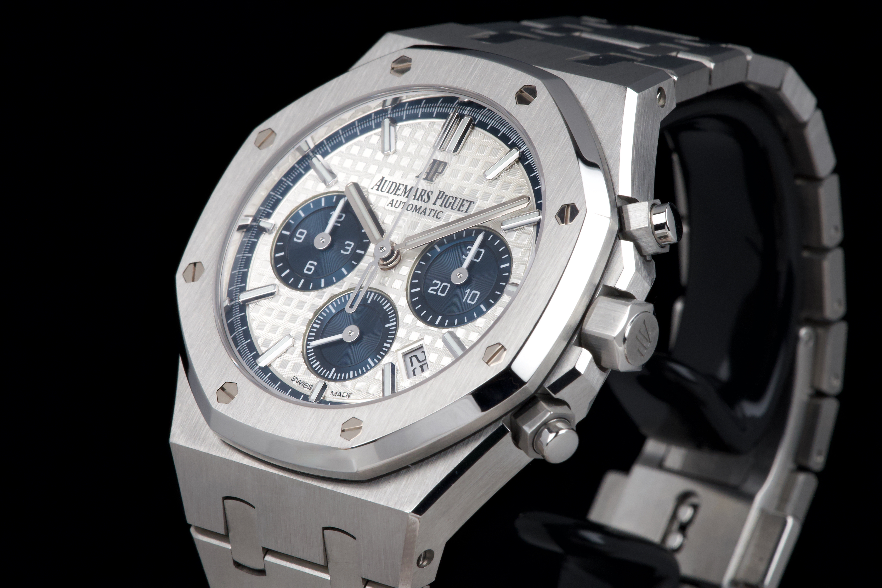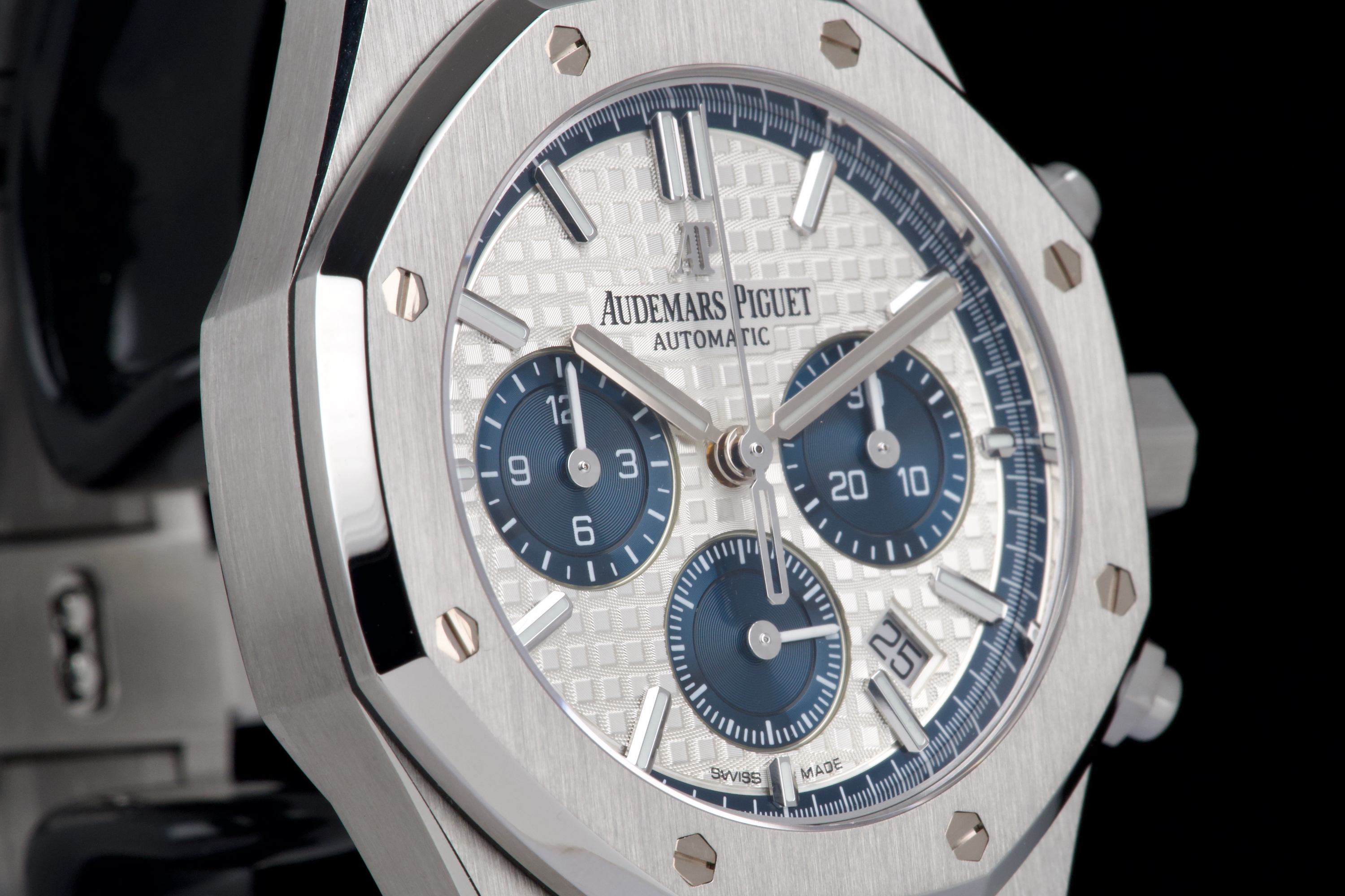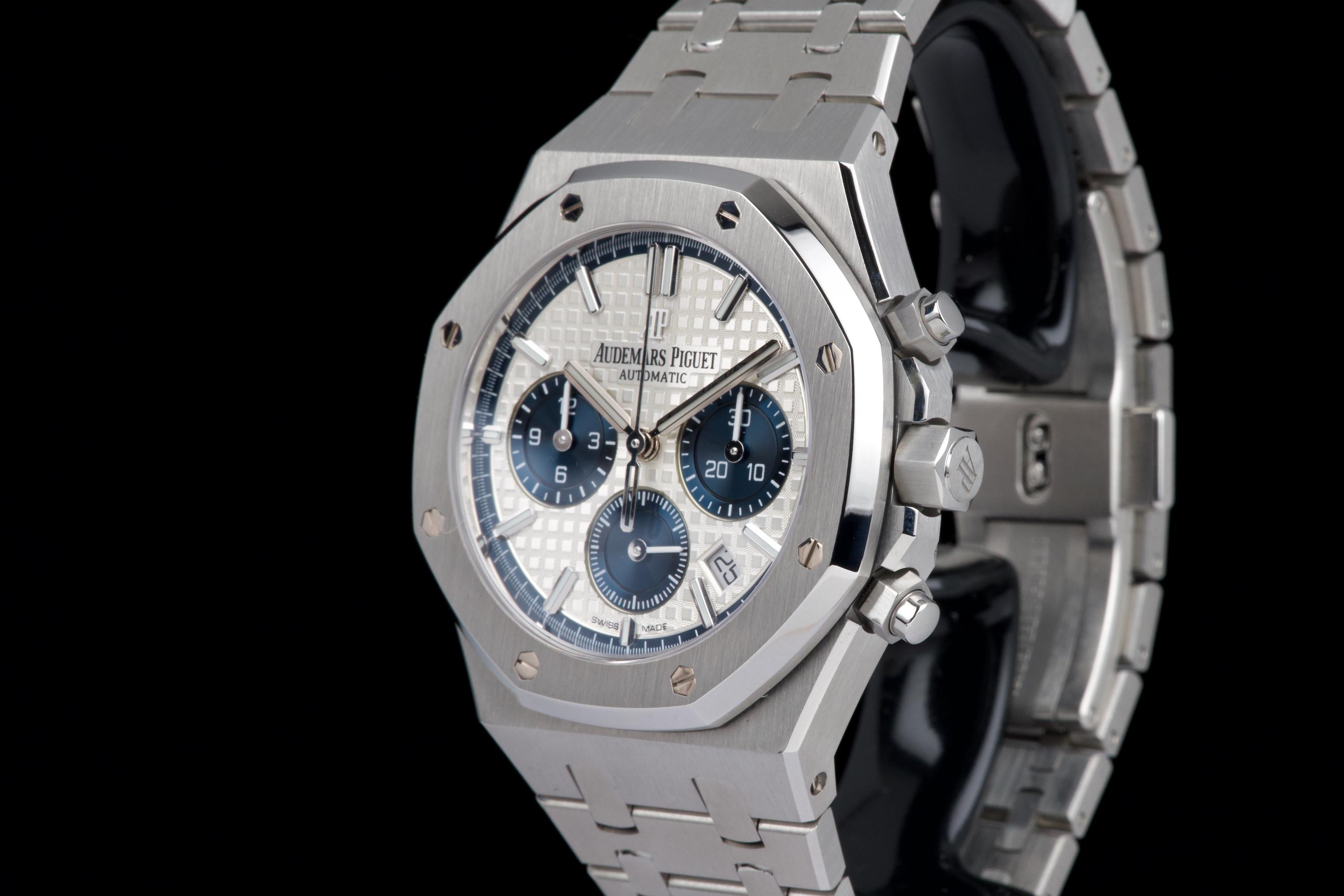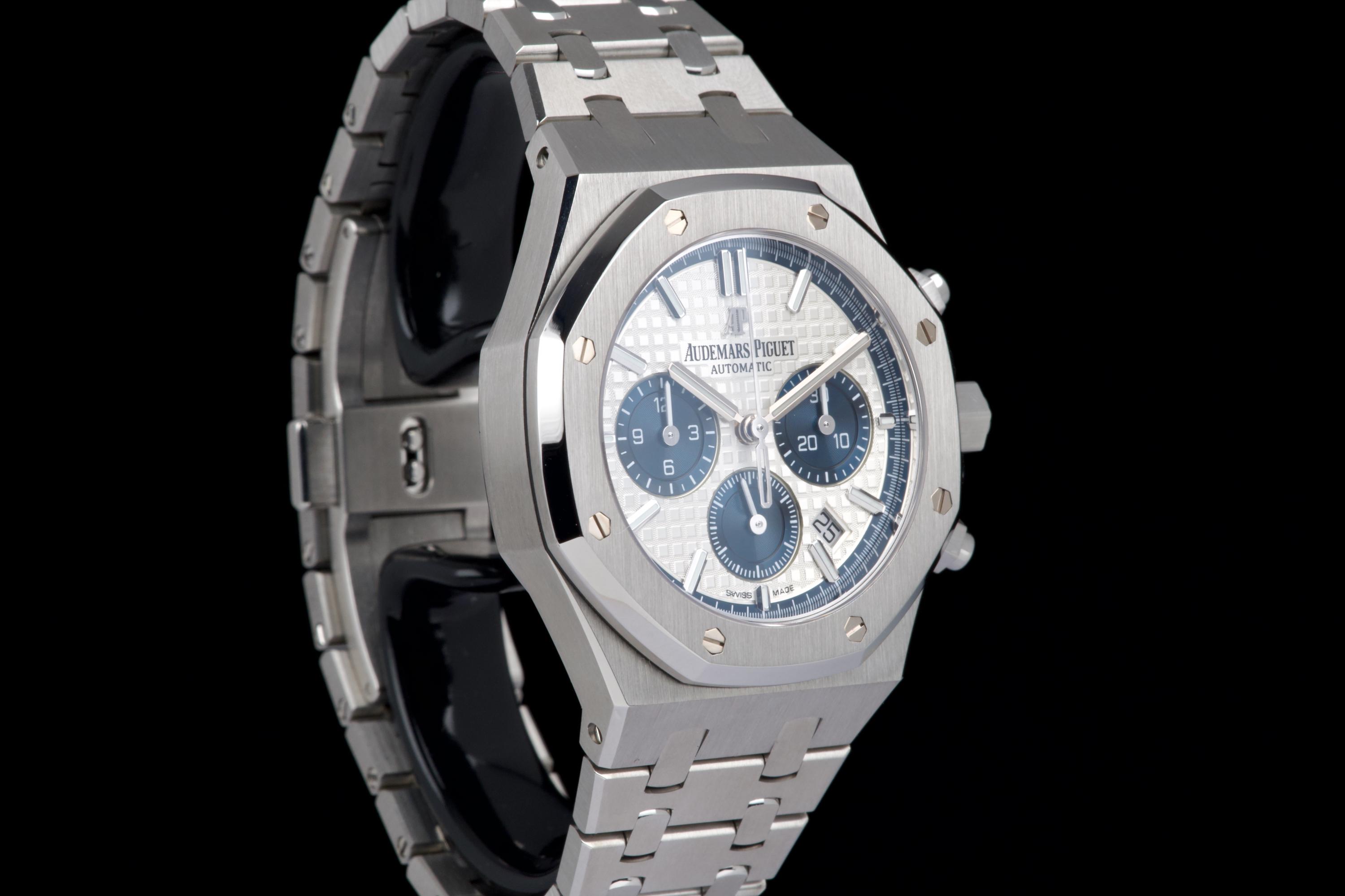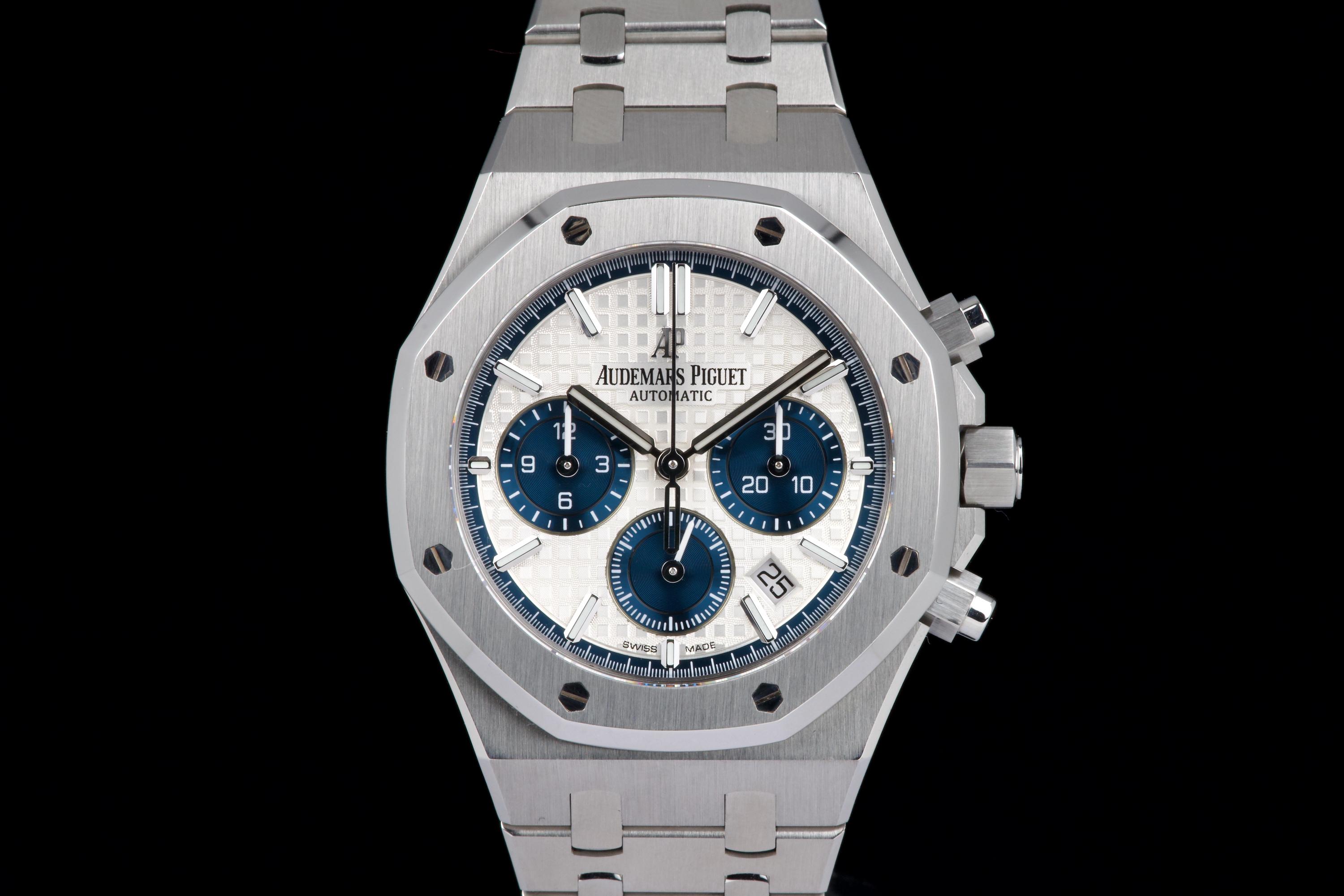 This 38mm Royal Oak Chronograph features a stunning white dial with blue subdials — a now-discontinued and highly sought-after color combination. The stainless steel case has just returned from professional polishing and is in excellent condition, having also passed a recent pressure test. The iconic Grande Tapisserie dial is crisp and clean, paired with the classic integrated Royal Oak bracelet. The watch is powered by AP’s selfwinding Calibre 2385 movement, offering a 40-hour power reserve and flyback chronograph function. It comes with its original box and warranty card dated 2020. An elegant and sporty Royal Oak in a rare configuration, ready to wear or collect.