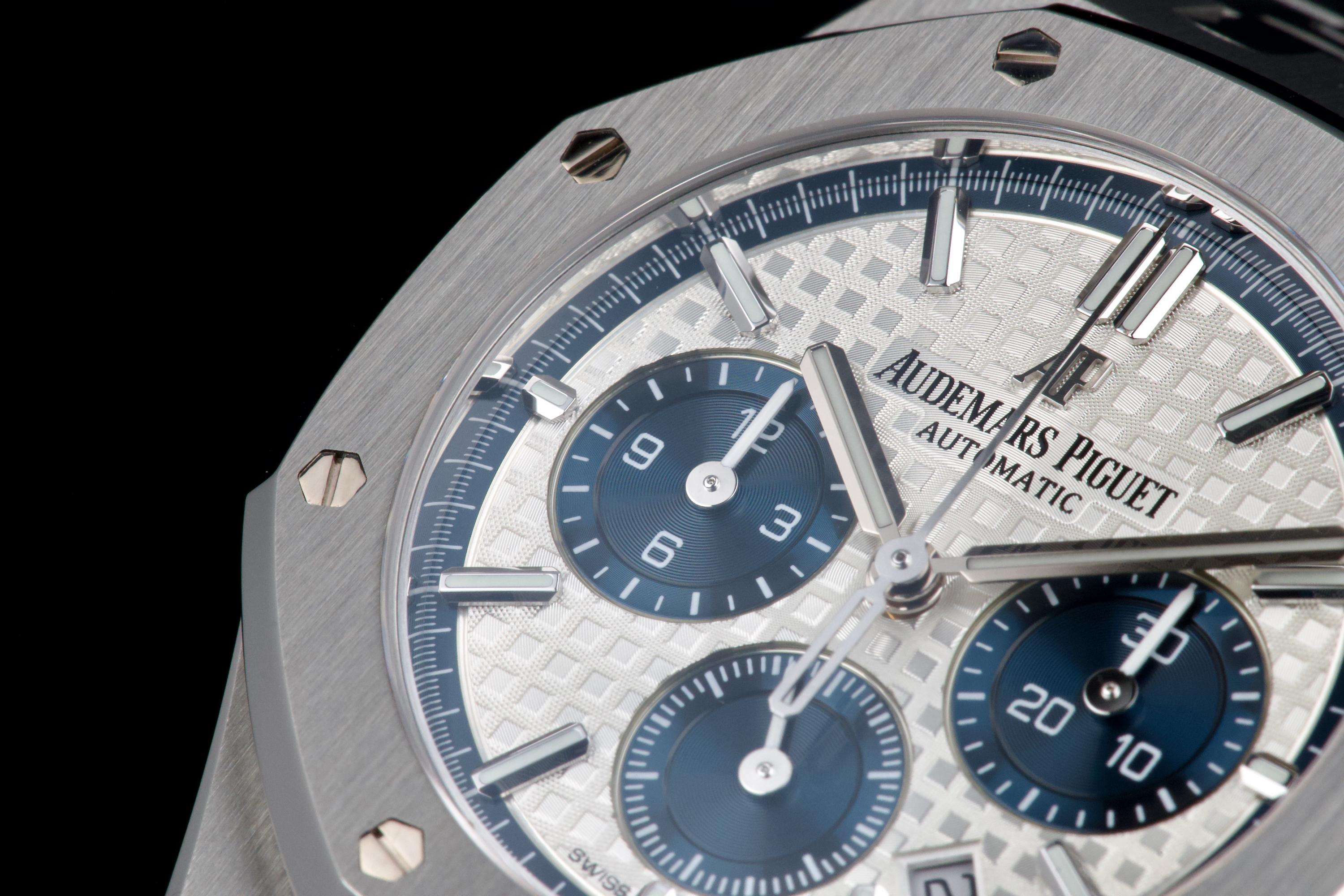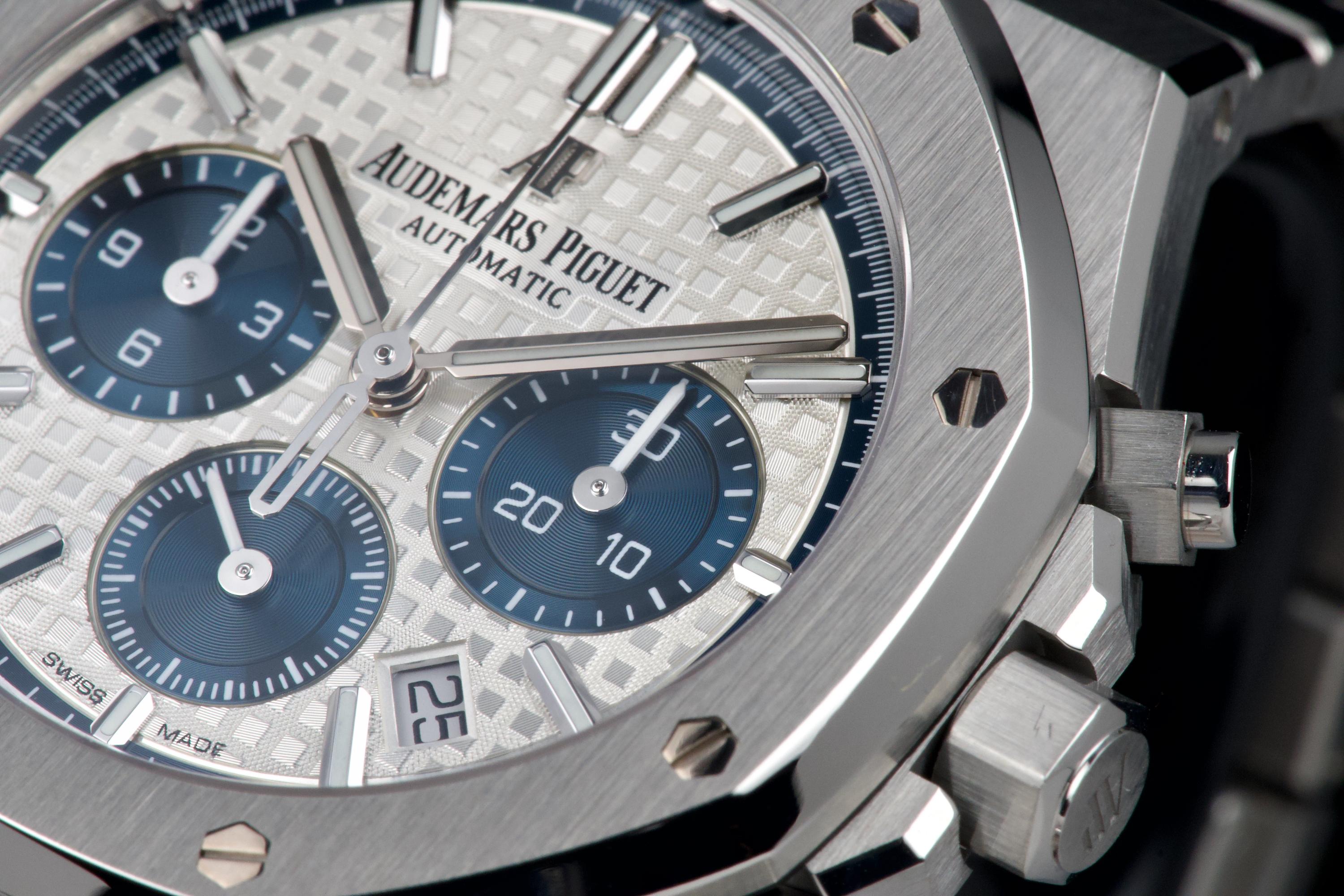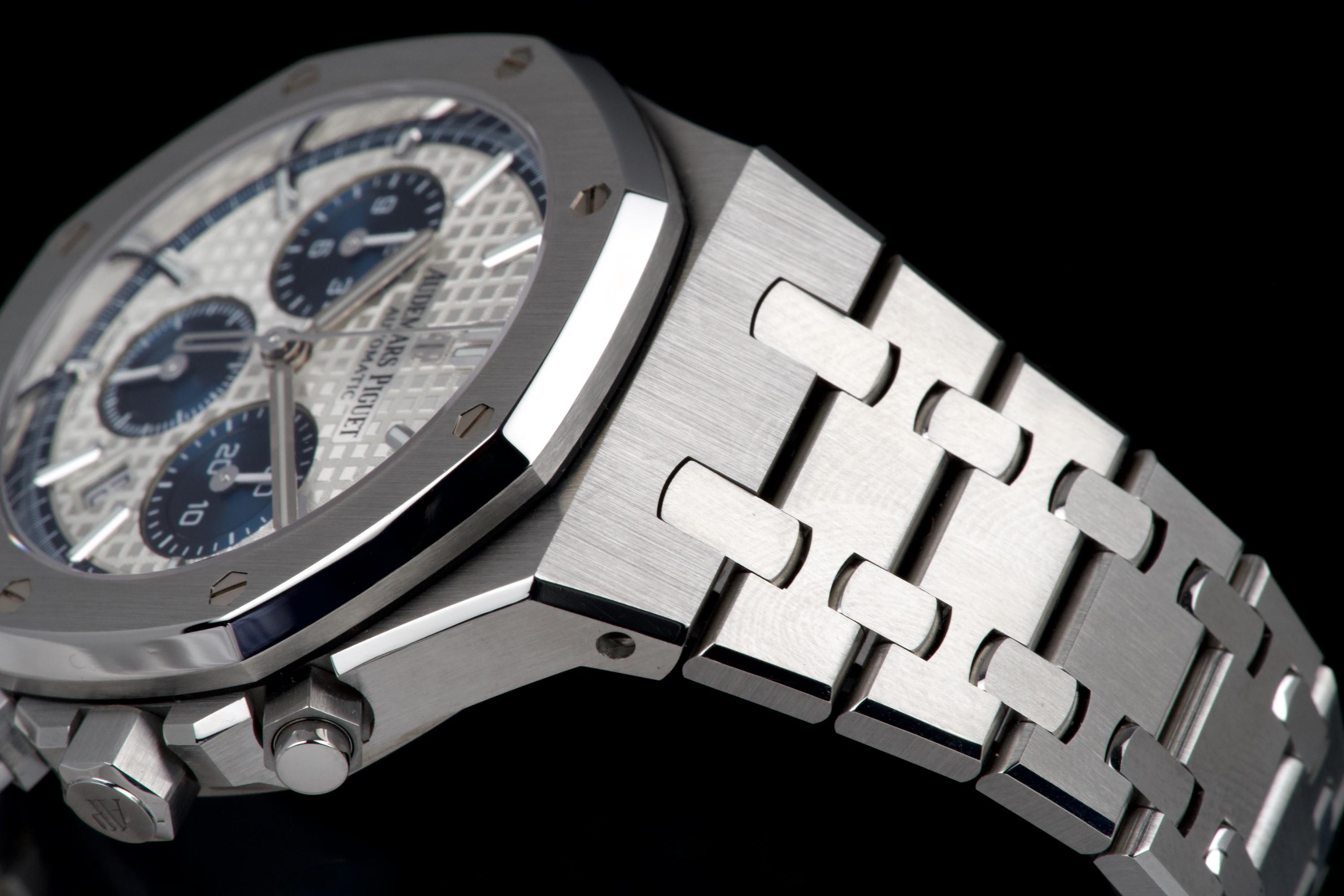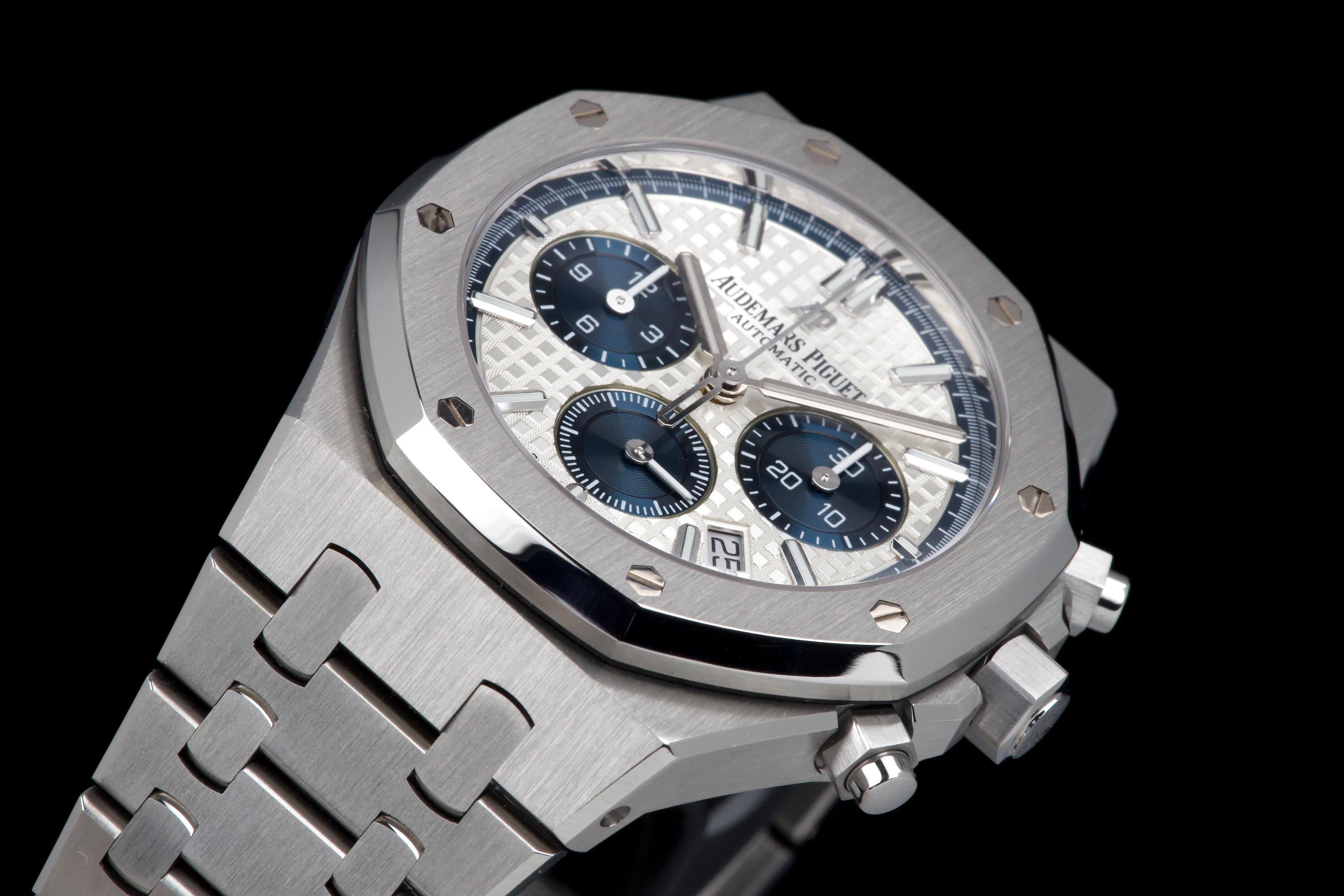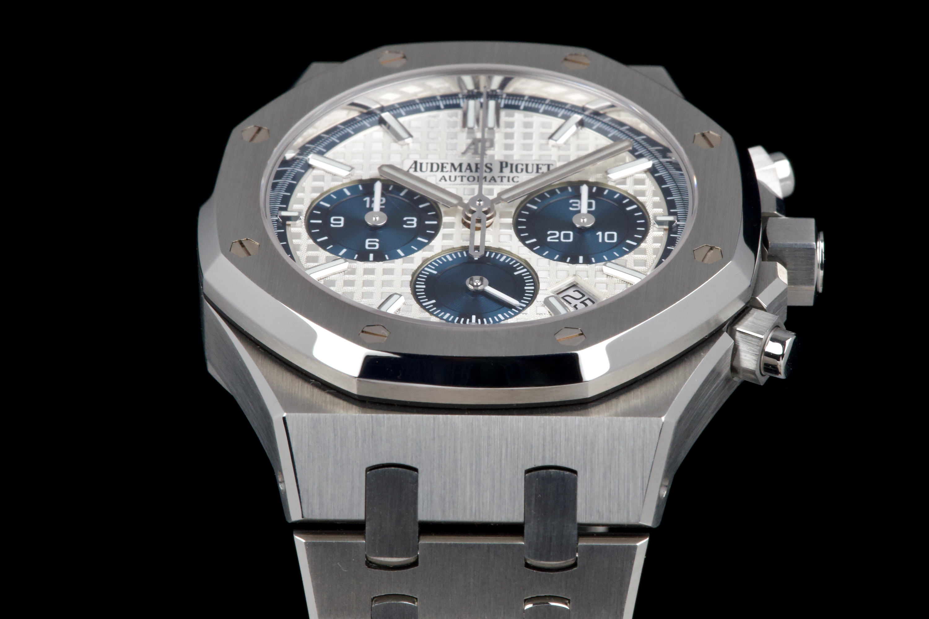 This 38mm Royal Oak Chronograph features a stunning white dial with blue subdials — a now-discontinued and highly sought-after color combination. The stainless steel case has just returned from professional polishing and is in excellent condition, having also passed a recent pressure test. The iconic Grande Tapisserie dial is crisp and clean, paired with the classic integrated Royal Oak bracelet. The watch is powered by AP’s selfwinding Calibre 2385 movement, offering a 40-hour power reserve and flyback chronograph function. It comes with its original box and warranty card dated 2020. An elegant and sporty Royal Oak in a rare configuration, ready to wear or collect.