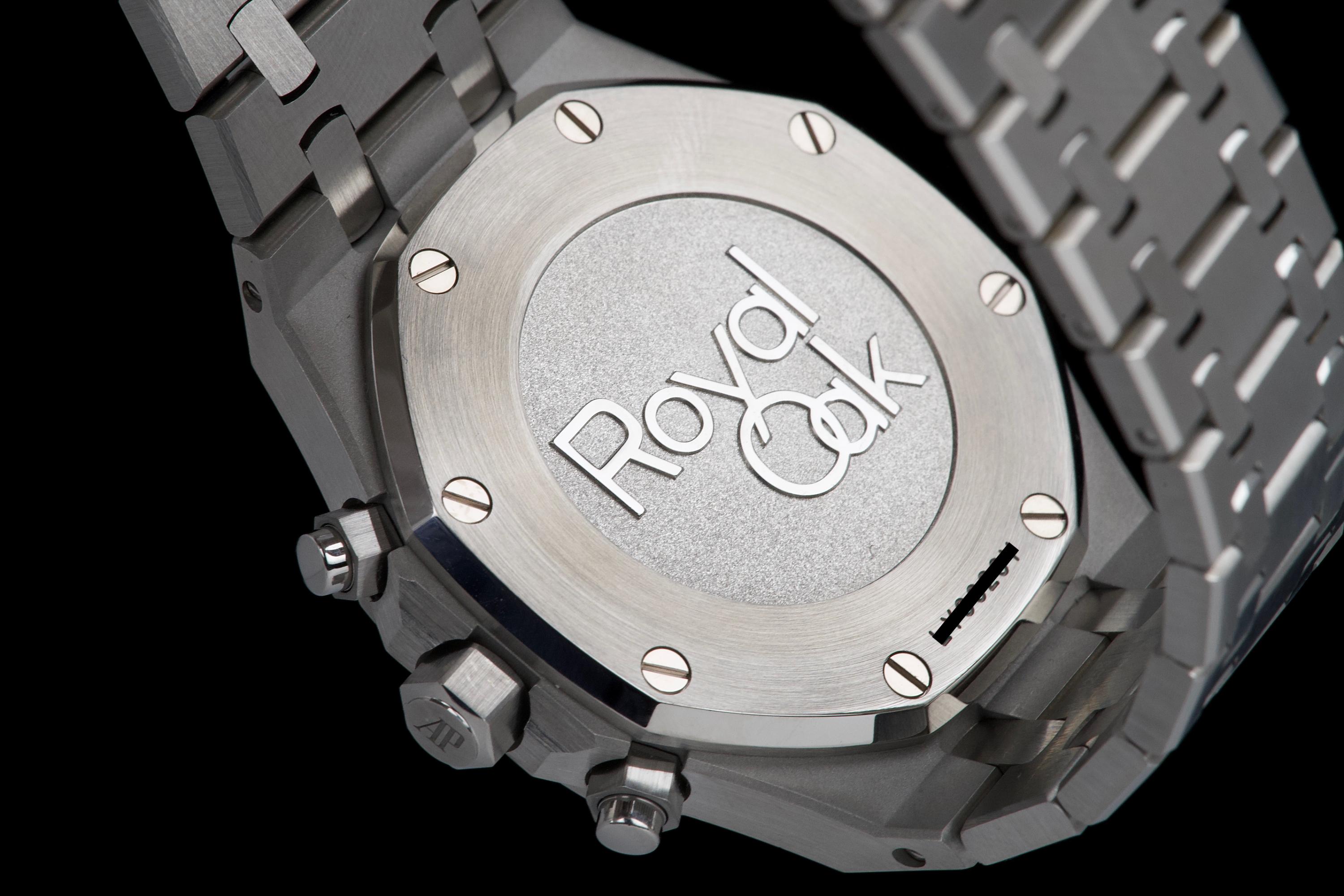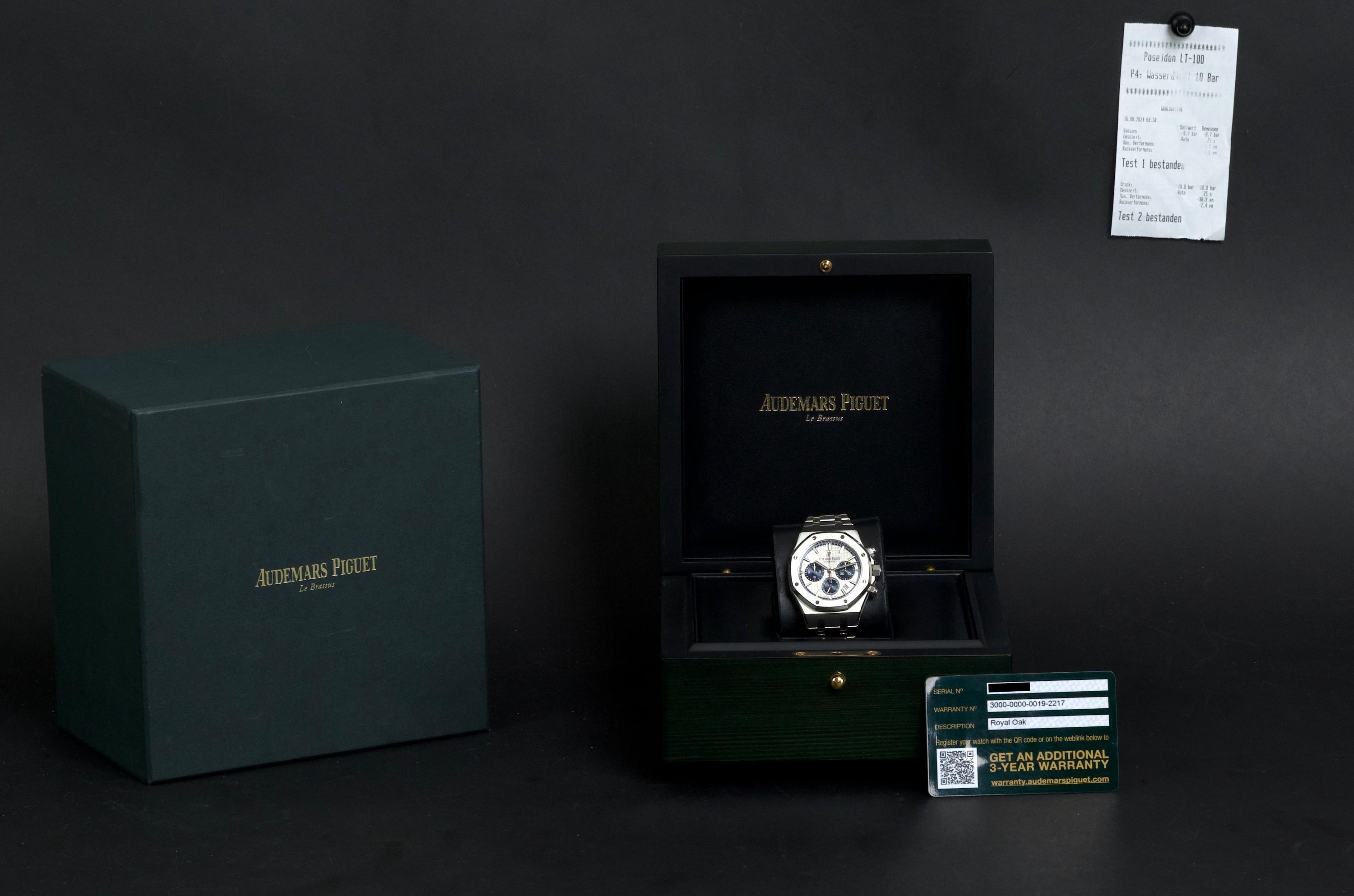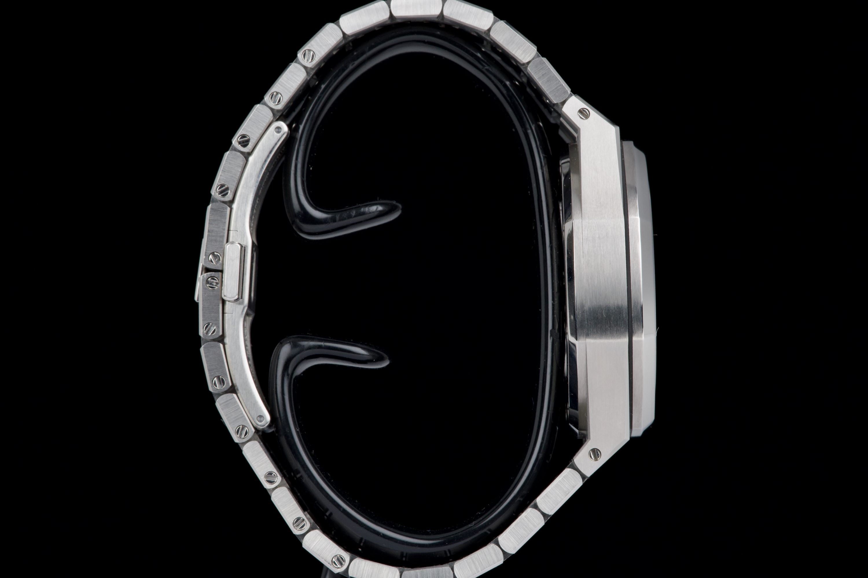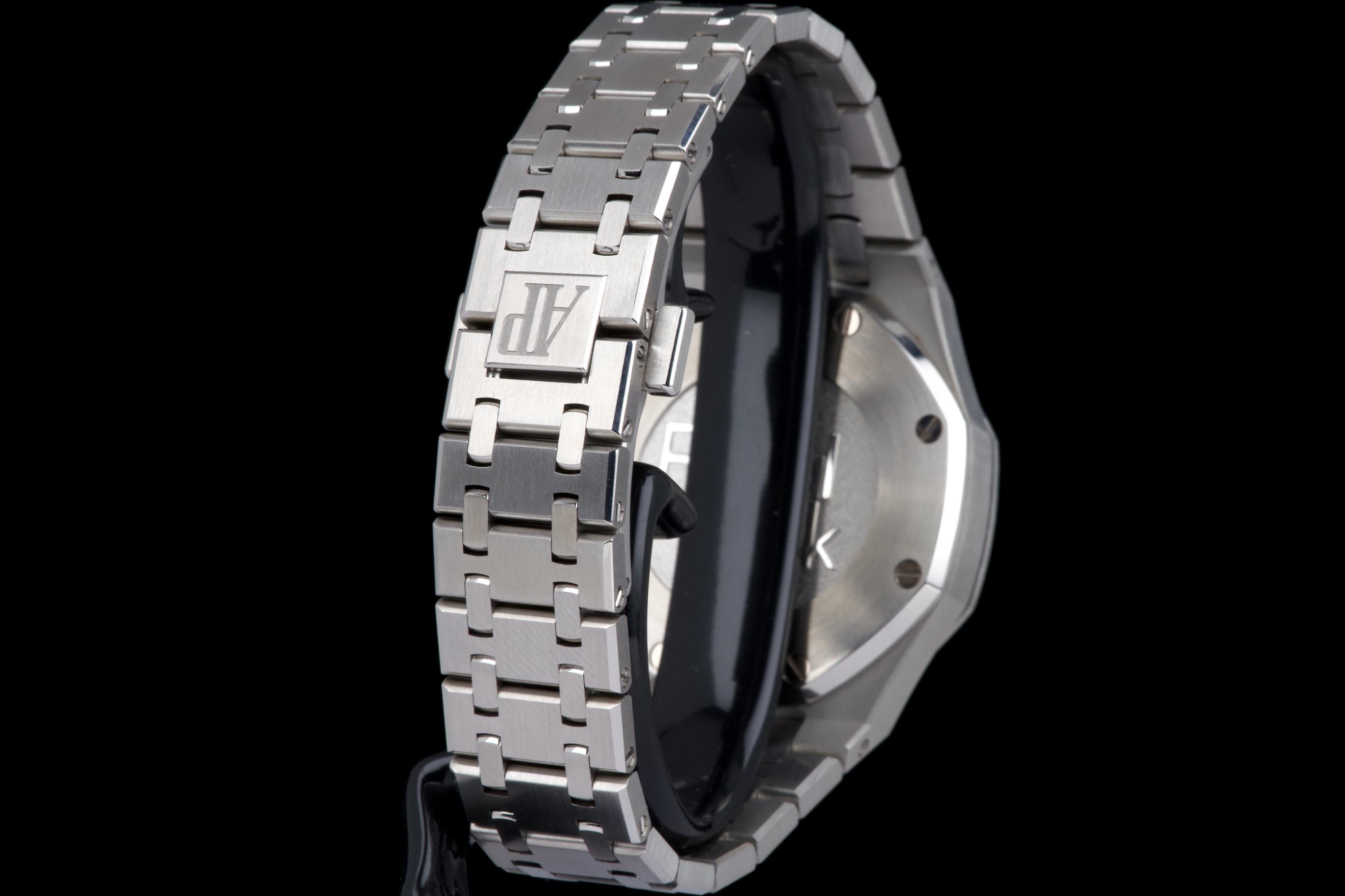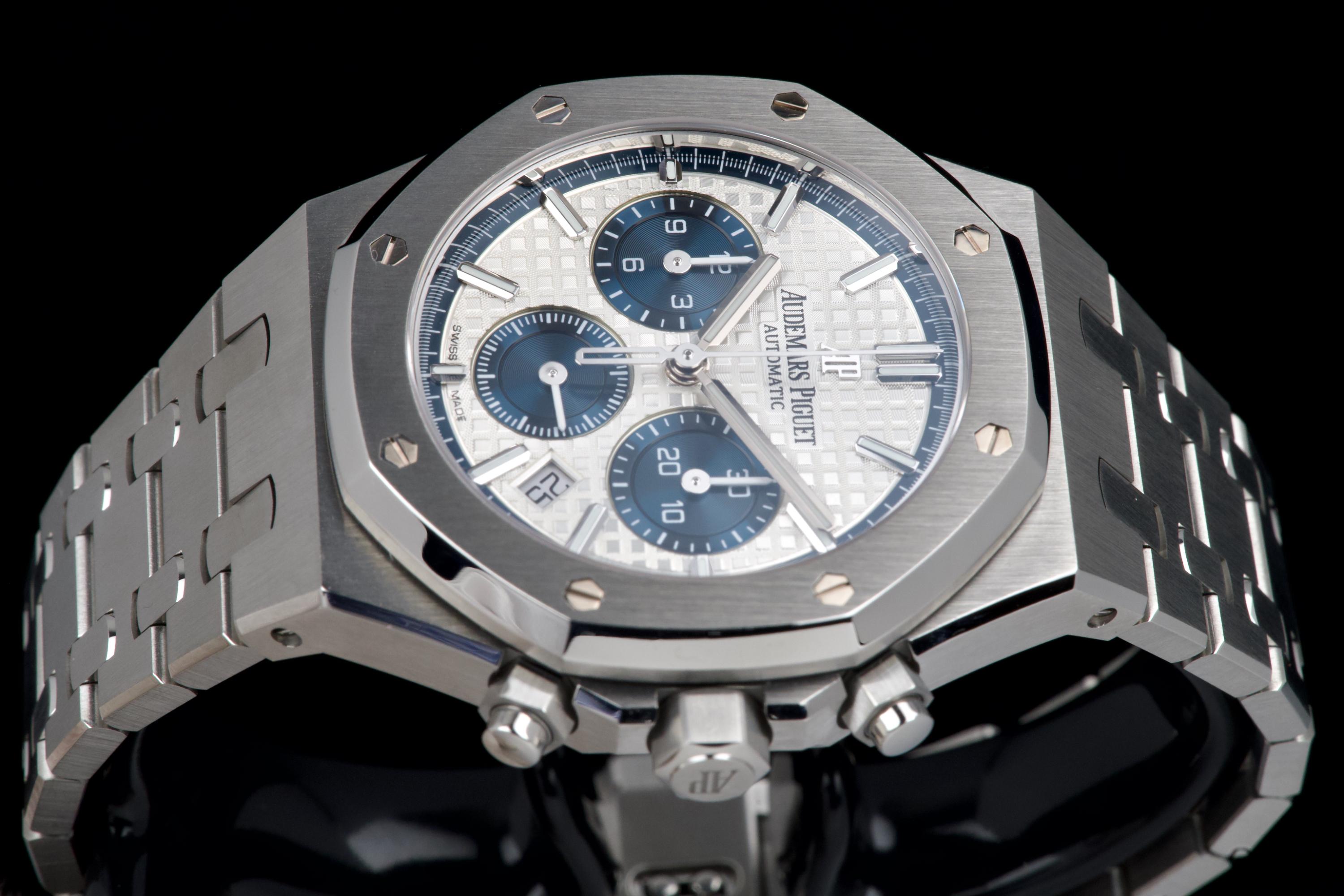 This 38mm Royal Oak Chronograph features a stunning white dial with blue subdials — a now-discontinued and highly sought-after color combination. The stainless steel case has just returned from professional polishing and is in excellent condition, having also passed a recent pressure test. The iconic Grande Tapisserie dial is crisp and clean, paired with the classic integrated Royal Oak bracelet. The watch is powered by AP’s selfwinding Calibre 2385 movement, offering a 40-hour power reserve and flyback chronograph function. It comes with its original box and warranty card dated 2020. An elegant and sporty Royal Oak in a rare configuration, ready to wear or collect.