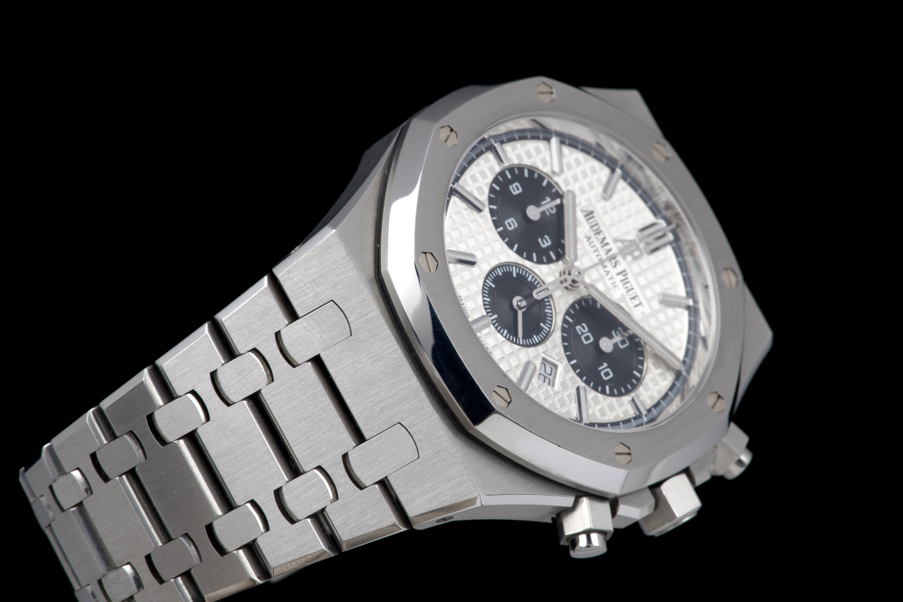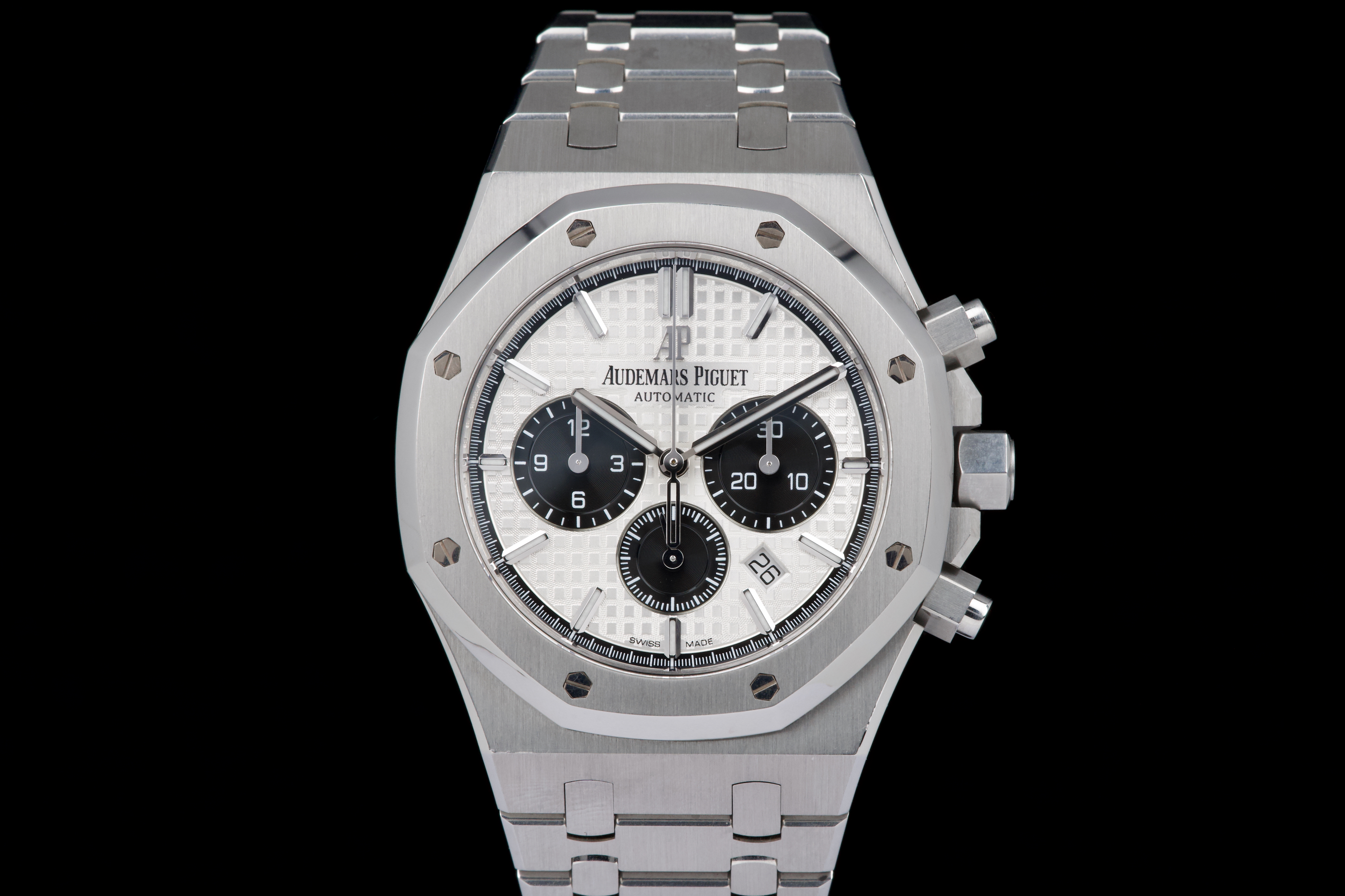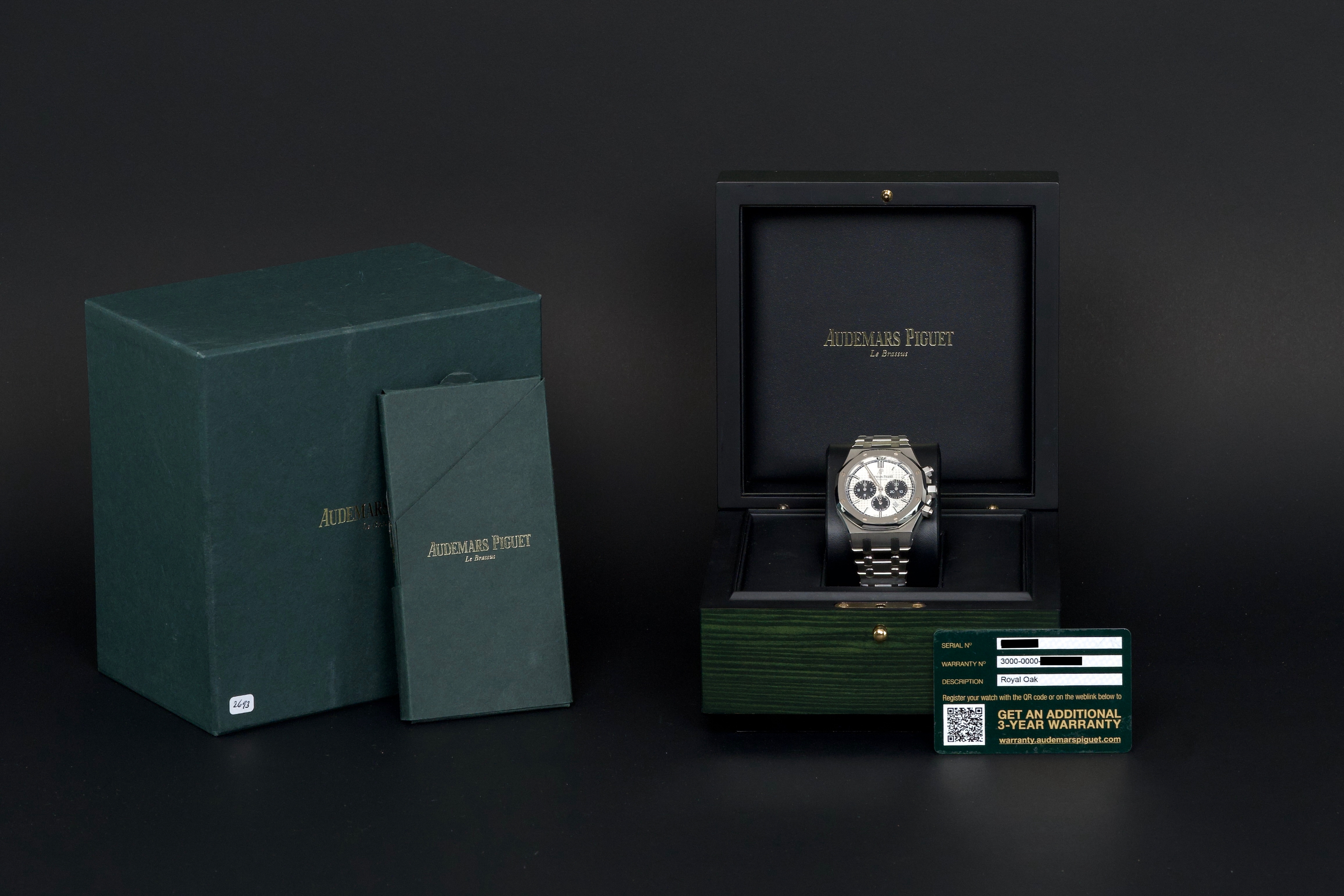 A beautiful example of the Audemars Piguet Royal Oak Chronograph 41 mm “Panda”, featuring the iconic silver dial with black subdials. The watch has been lightly polished in the past and is presented in excellent overall condition, showing only minor marks and hairlines from careful wear. The dial and hands are flawless, and the bracelet shows no stretch, retaining its crisp articulation. Powered by the Audemars Piguet caliber 2385, the movement has been checked by our watchmaker and runs perfectly. Complete with its original box, warranty card, and booklets. A superb example of the highly desirable Royal Oak Chronograph “Panda” — elegant, sporty, and beautifully preserved.