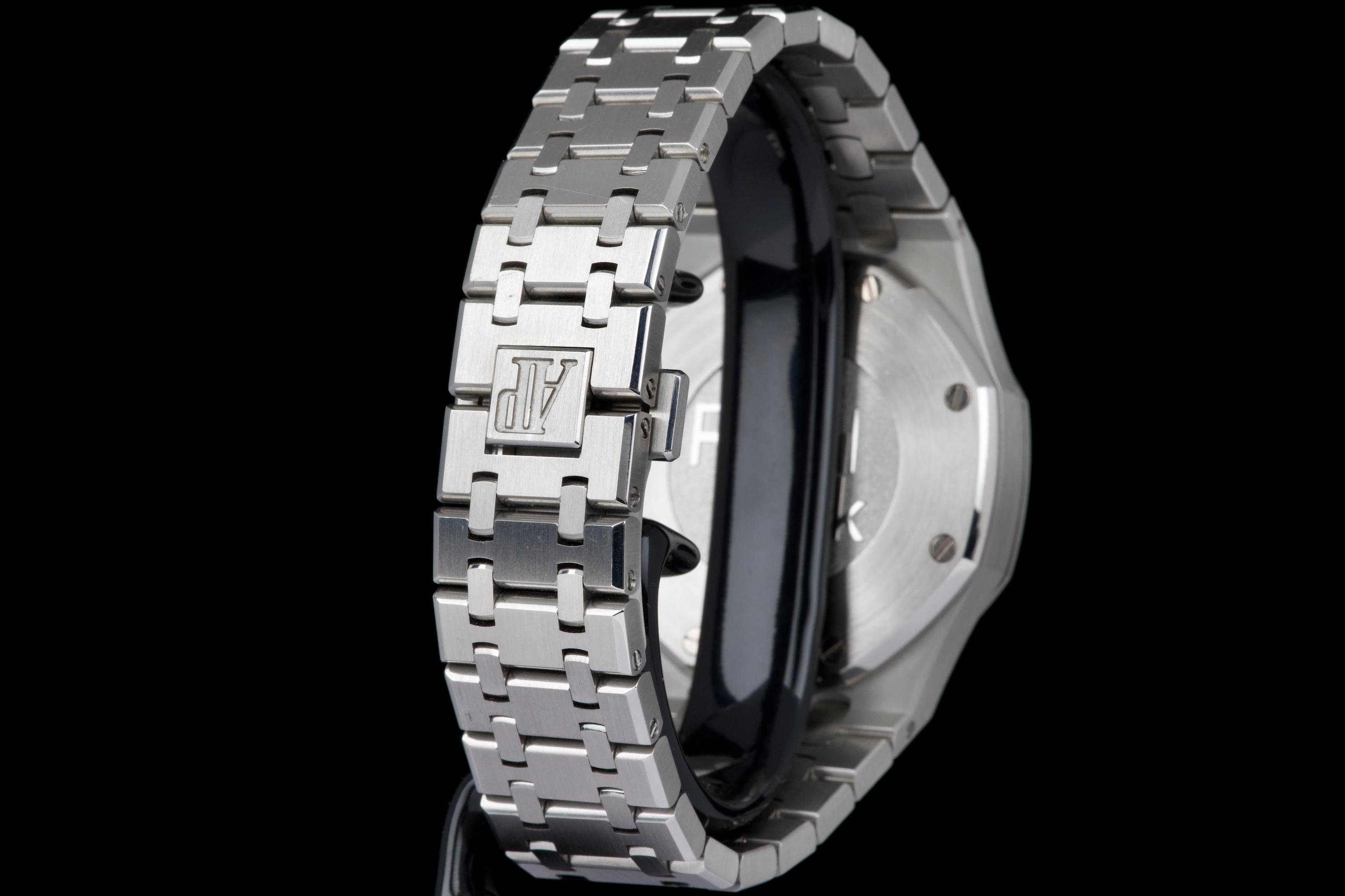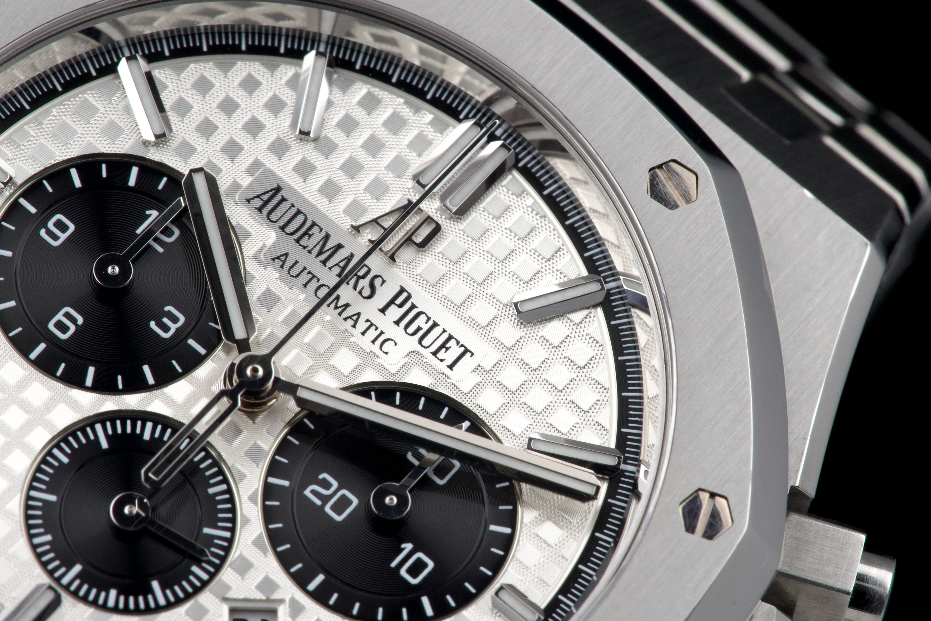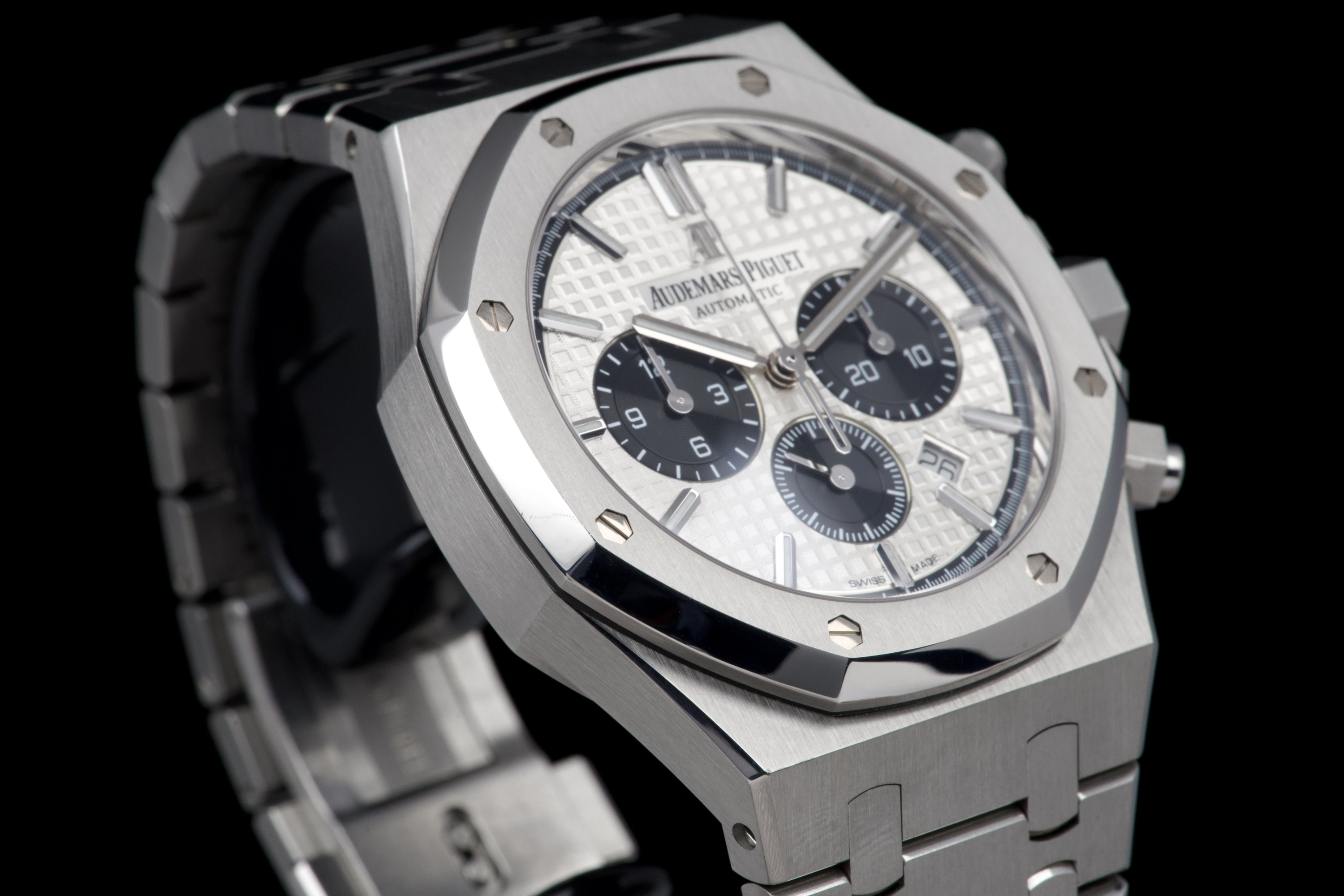 A beautiful example of the Audemars Piguet Royal Oak Chronograph 41 mm “Panda”, featuring the iconic silver dial with black subdials. The watch has been lightly polished in the past and is presented in excellent overall condition, showing only minor marks and hairlines from careful wear. The dial and hands are flawless, and the bracelet shows no stretch, retaining its crisp articulation. Powered by the Audemars Piguet caliber 2385, the movement has been checked by our watchmaker and runs perfectly. Complete with its original box, warranty card, and booklets. A superb example of the highly desirable Royal Oak Chronograph “Panda” — elegant, sporty, and beautifully preserved.
