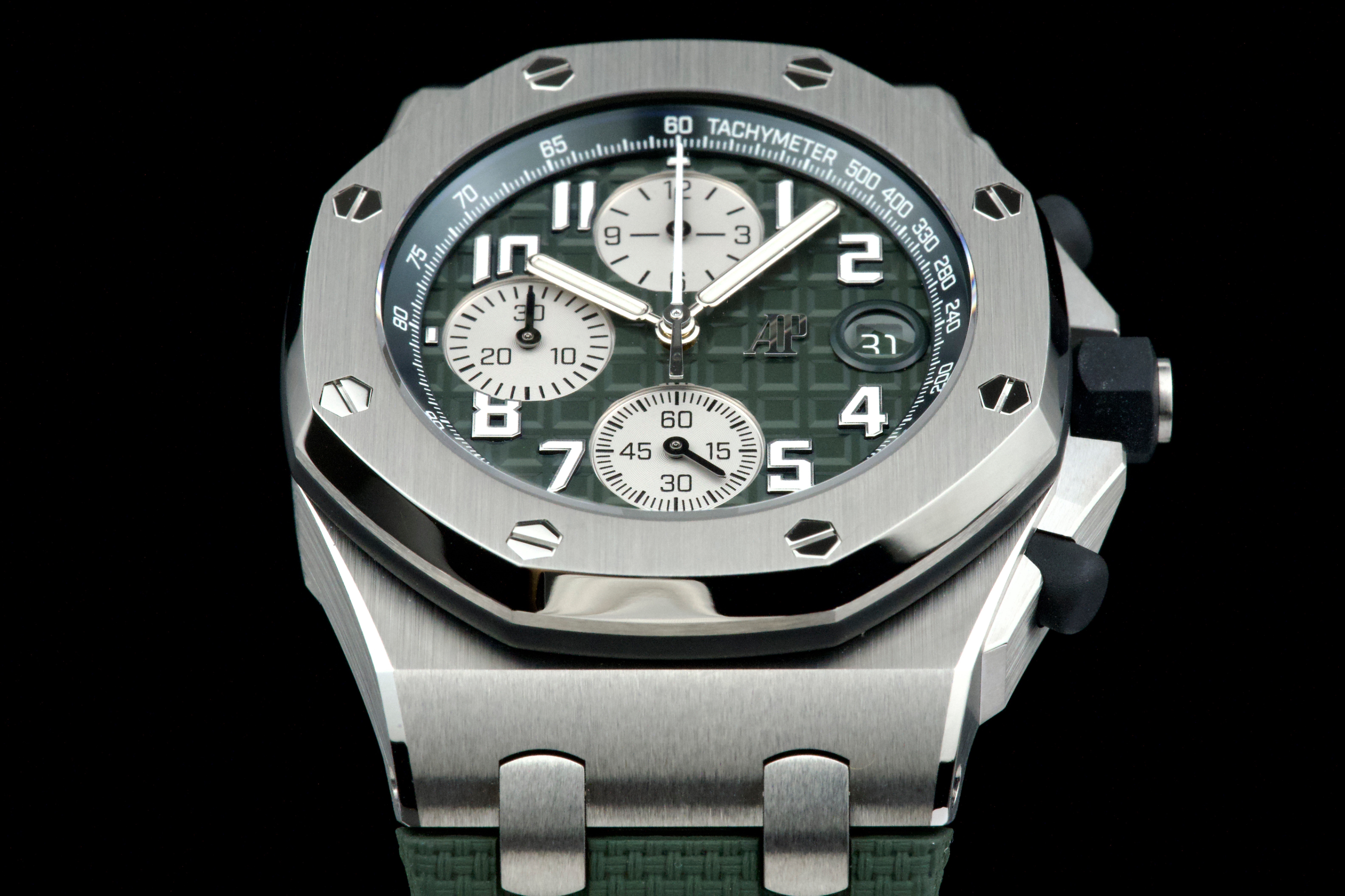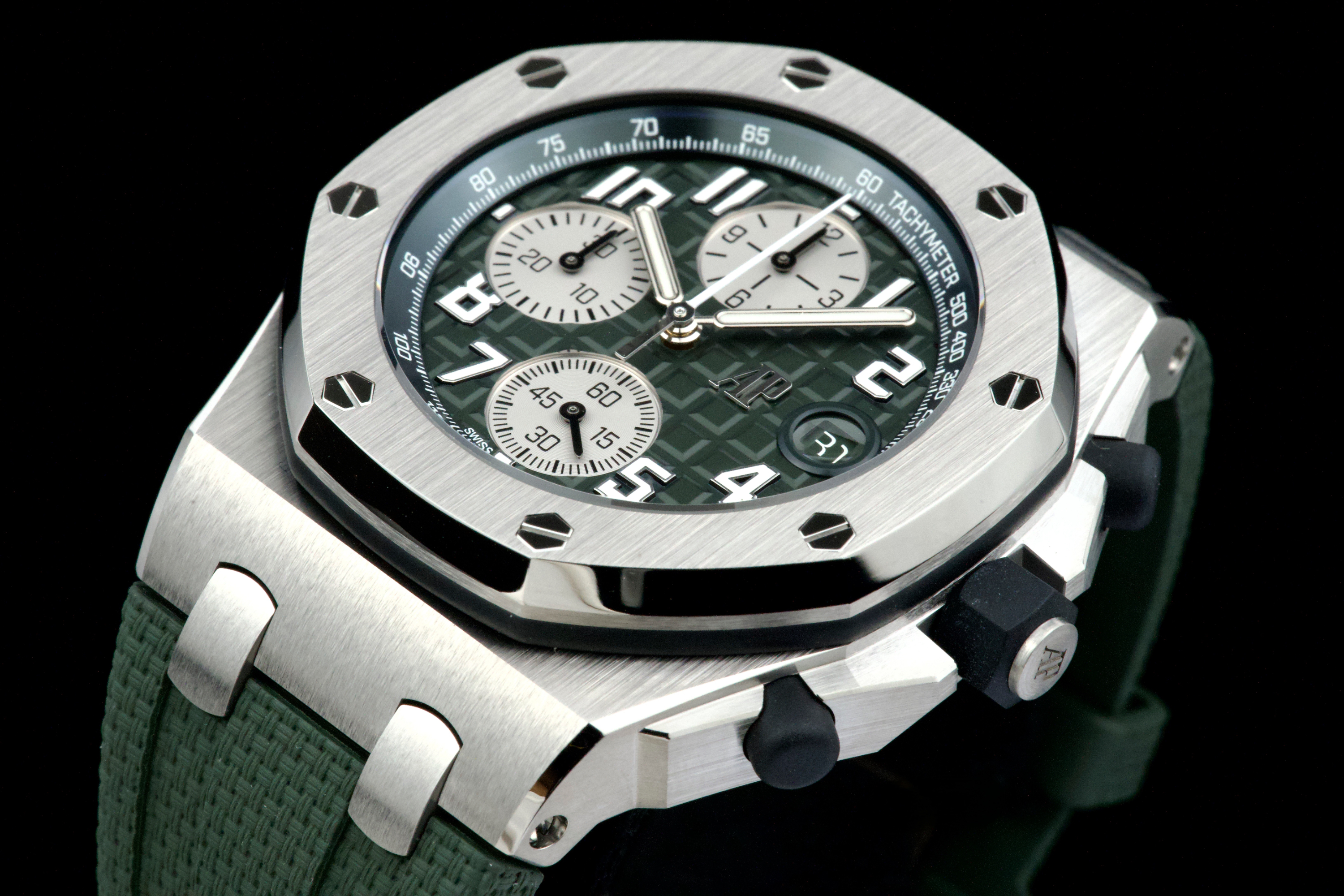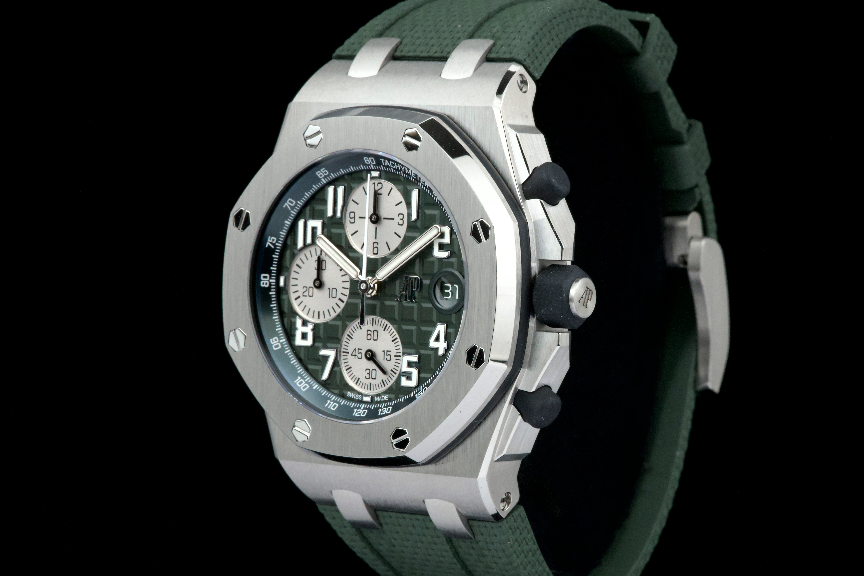 A stunning Audemars Piguet Royal Oak Offshore Chronograph Ref. 26238TI, crafted in lightweight titanium and sold in 2023, offered as a Full Set with box and papers. This example is in mint, unpolished condition and features a striking green “Méga Tapisserie” dial paired with a matching green rubber strap and titanium pin buckle. The 42mm case blends sportiness with modern AP design language, delivering both presence and comfort on the wrist. Powered by the in-house calibre 4404 automatic flyback chronograph movement, visible through the sapphire caseback. A bold and contemporary Offshore in a highly sought-after configuration — fresh, clean, and collector-ready.