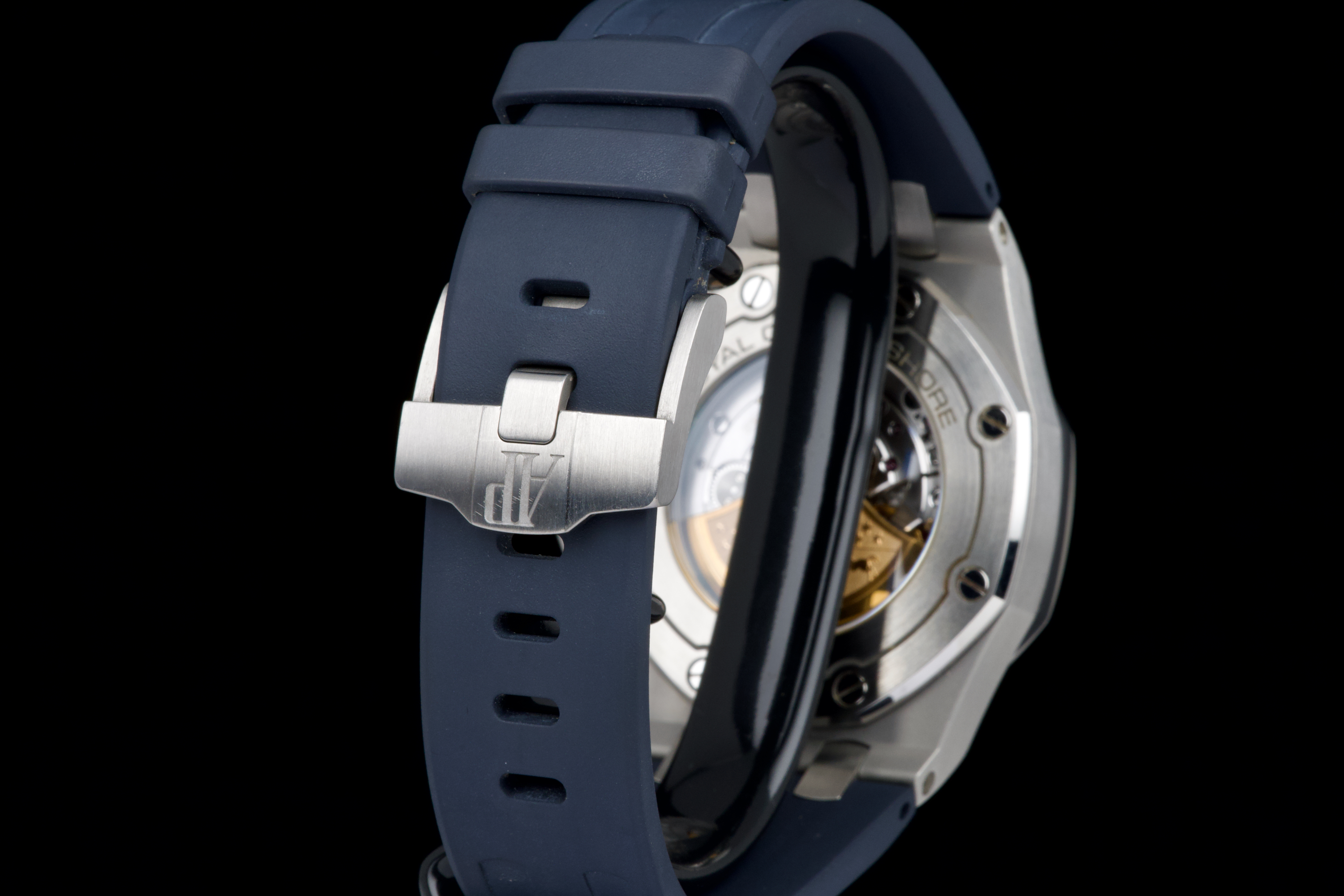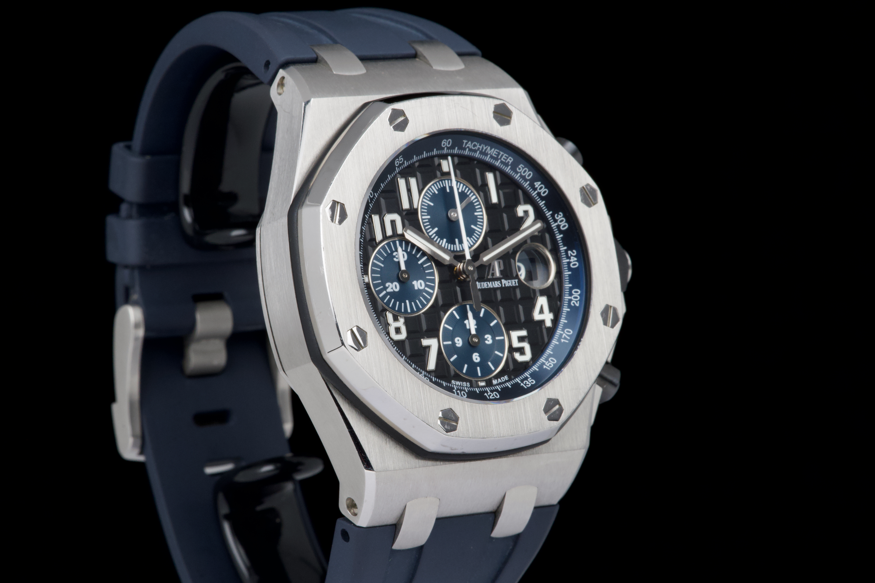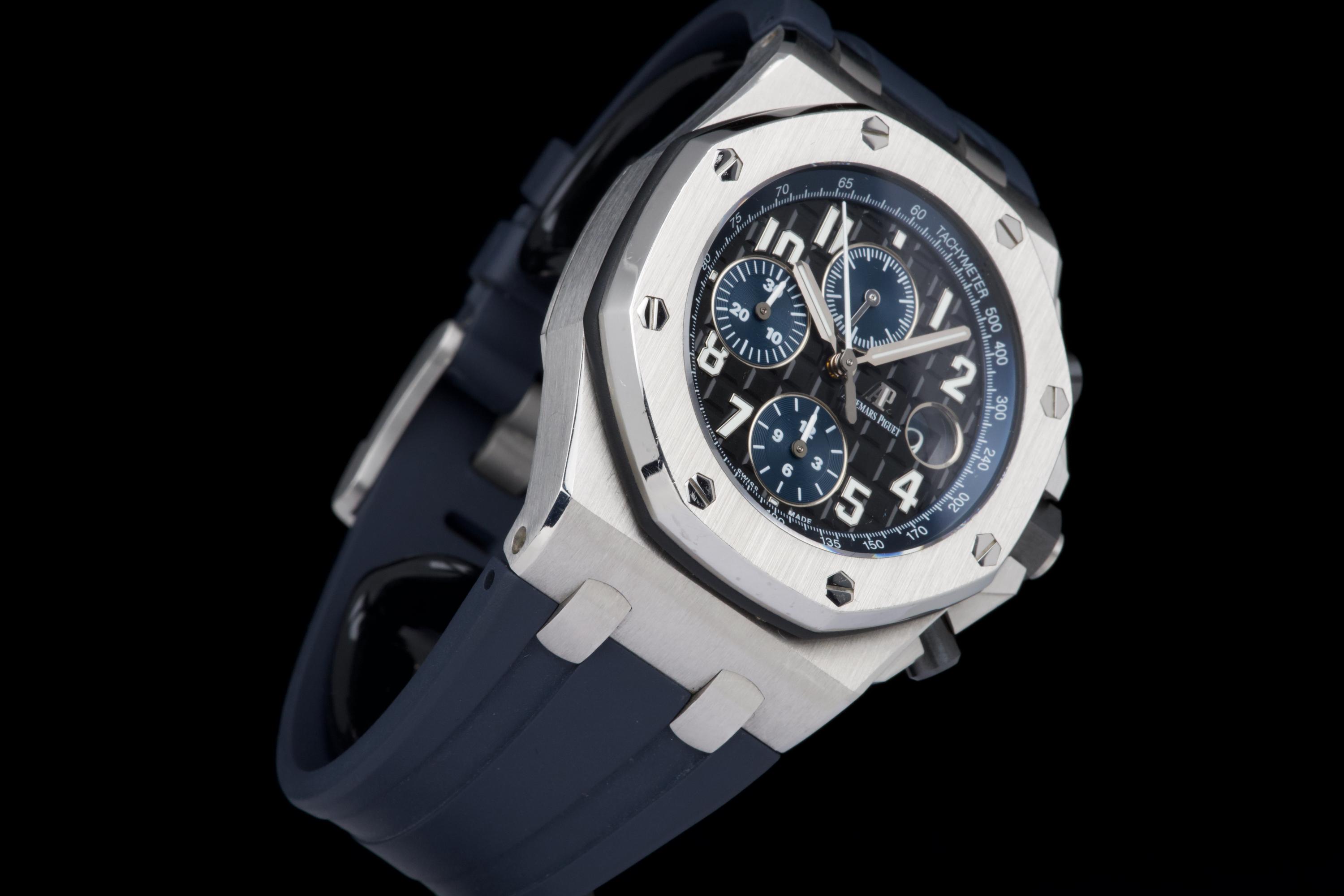 A very nice example of the Audemars Piguet Royal Oak Offshore reference 26470ST.OO.A028CR.01, featuring the striking black dial with blue subdials and matching blue rubber strap. The watch appears to be unpolished and is presented in overall very good condition, showing only light wear consistent with careful use. The case retains strong lines, and the iconic Mega Tapisserie dial remains crisp and vibrant. Powered by the Audemars Piguet caliber 3126/3840, offering robust chronograph performance and visible through the sapphire caseback. Complete with its original box and papers. A bold and desirable Royal Oak Offshore — sporty, modern, and beautifully preserved.
