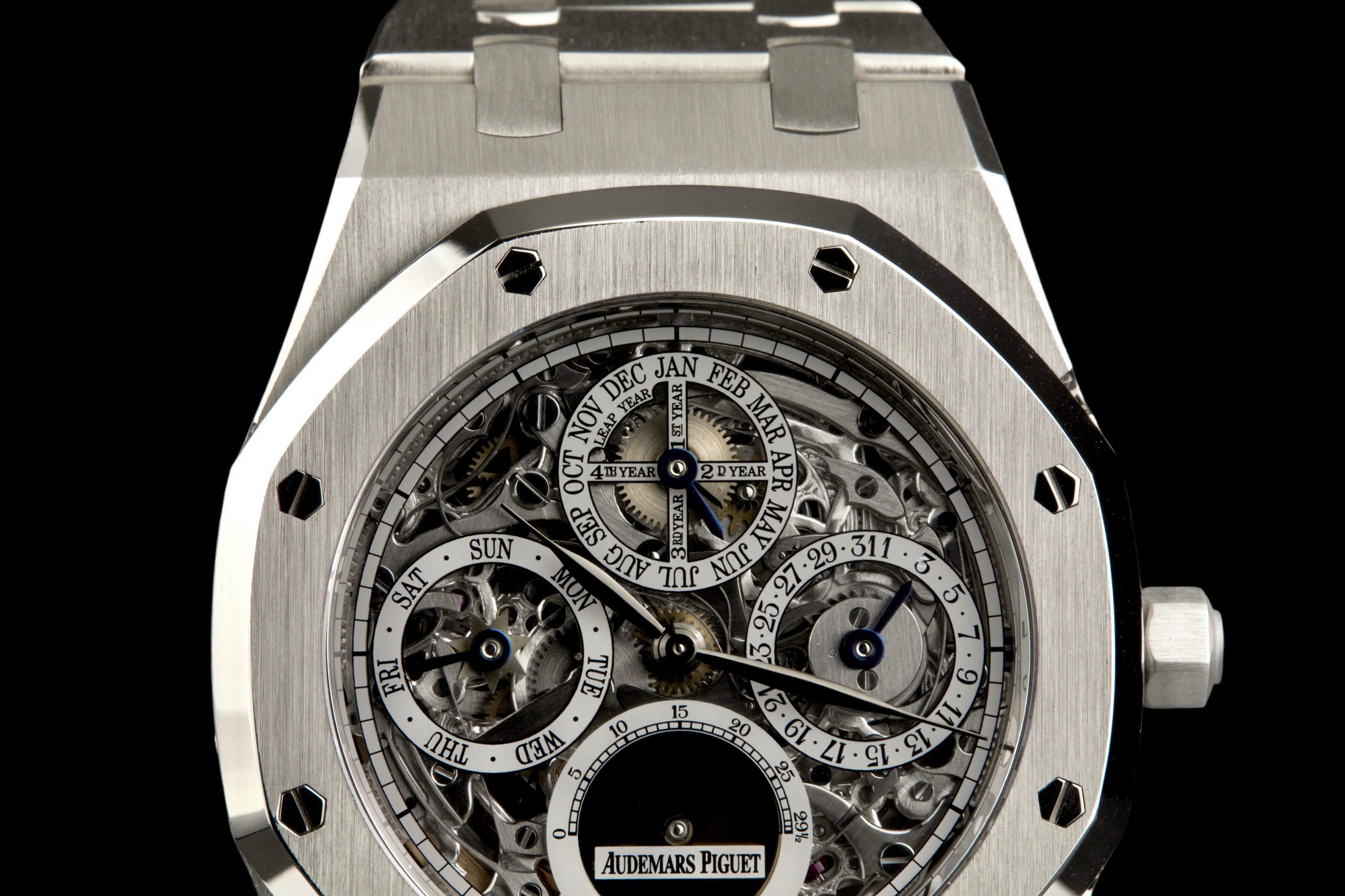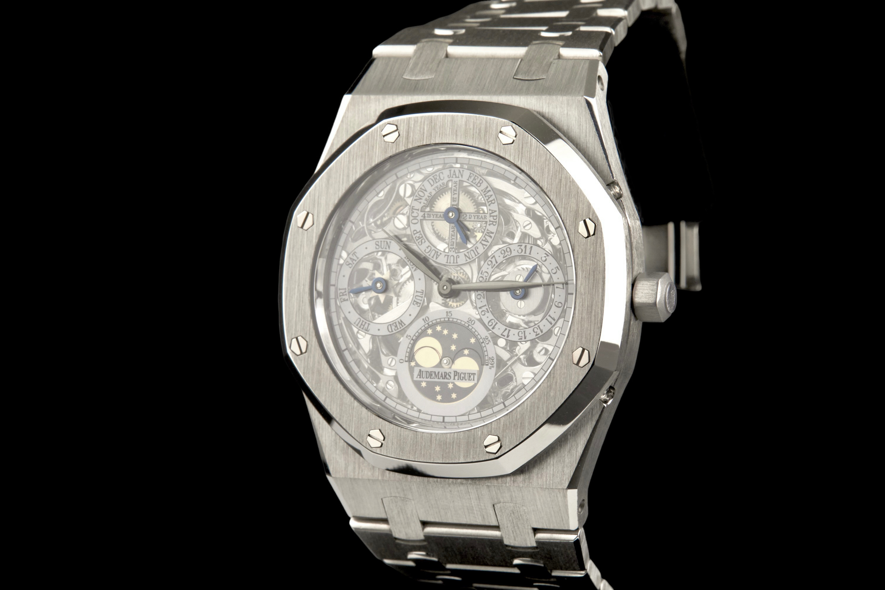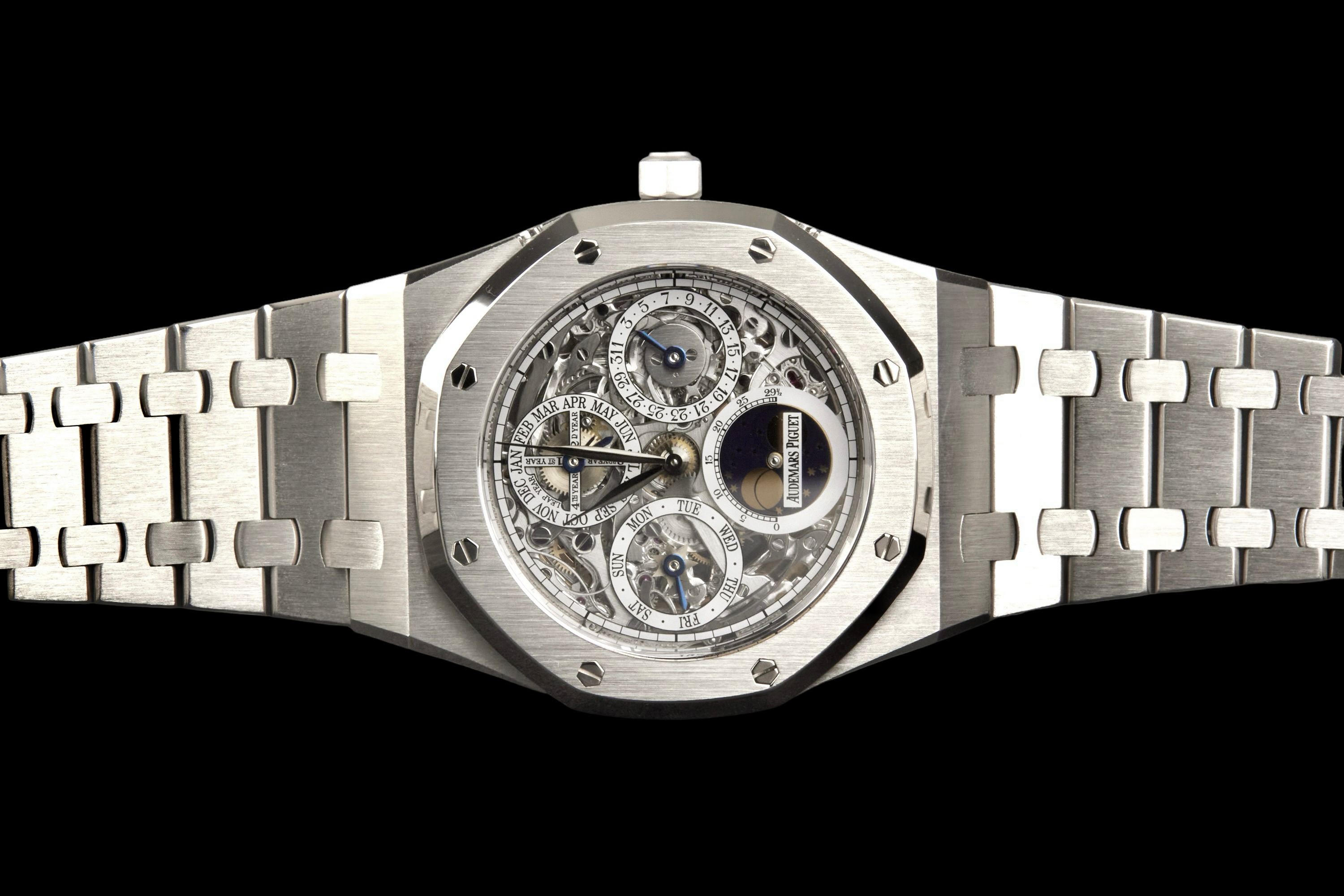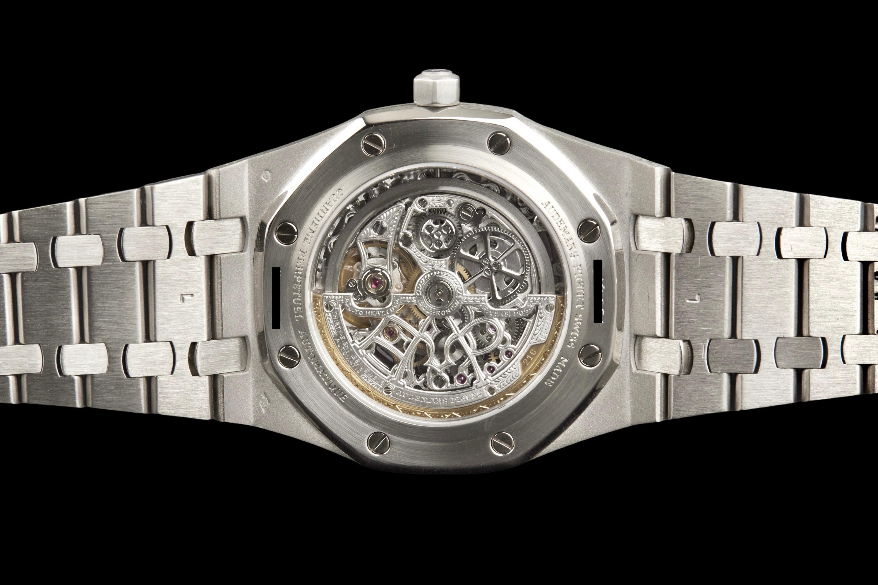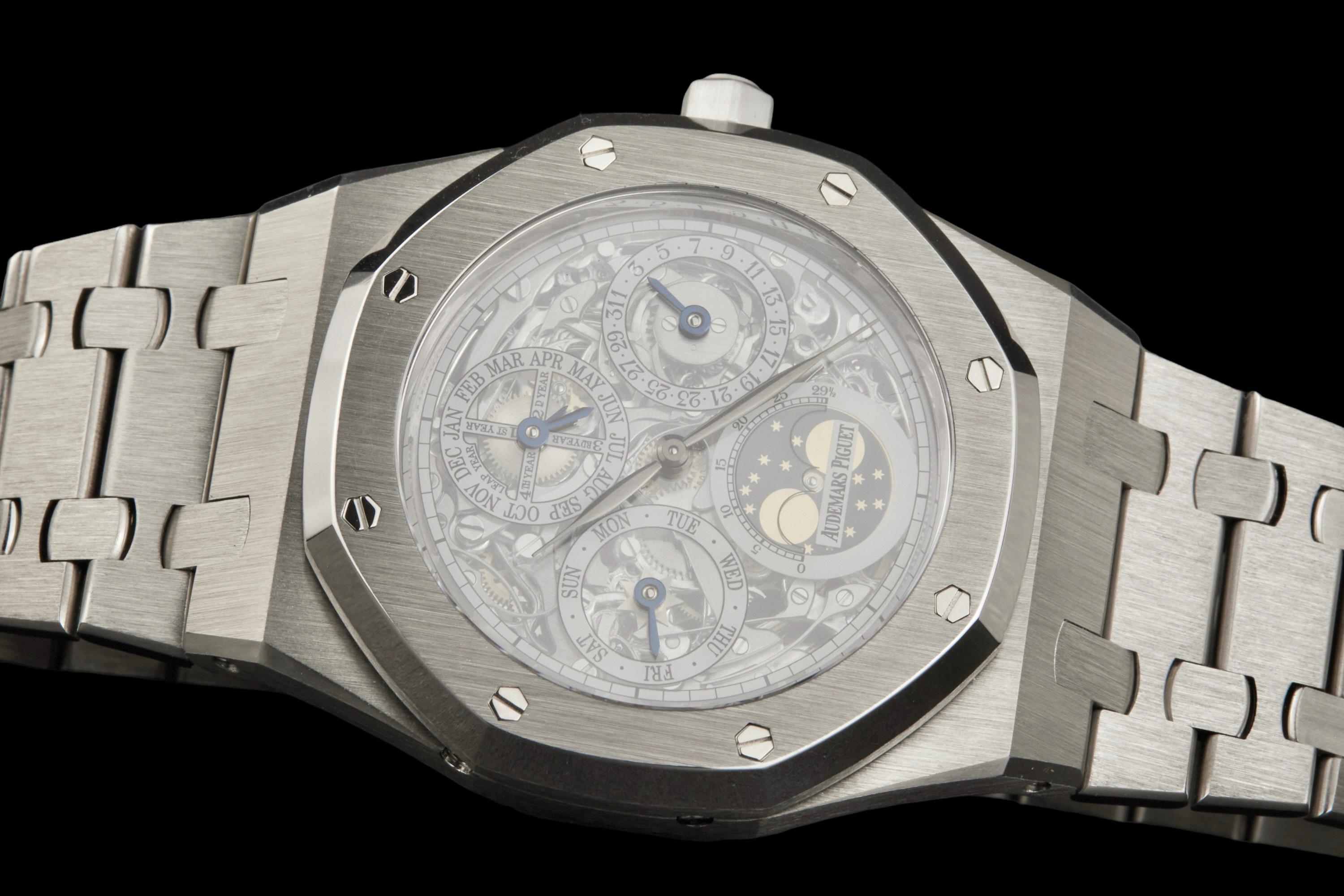 Audemars Piguet Royal Oak Quantième Perpétuel Squelette, reference 25829PT.00.0944PT.01, platinum openworked wristwatch with bracelet, Extract from the Archives, circa 2008. A highly sophisticated and visually arresting interpretation of one of Audemars Piguet’s most celebrated complications, the present Royal Oak Quantième Perpétuel Squelette reference 25829PT.00.0944PT.01 combines the technical refinement of a perpetual calendar with the architectural beauty of an openworked movement. Produced in 2008, this exceptional timepiece is crafted entirely in platinum, from its iconic Royal Oak case to its integrated bracelet, offering both substantial presence and unmistakable exclusivity. The skeletonised dial reveals the remarkable complexity of the movement, while preserving the balanced display of the perpetual calendar indications, including the day, date, month, leap year and moon phases. The openworked construction showcases Audemars Piguet’s expertise in both high complication and traditional finishing, lending the watch extraordinary visual depth and mechanical character. The watch has been polished in the past and is today presented in excellent overall condition, with the case and bracelet retaining a very attractive appearance. It is accompanied by an Extract from the Audemars Piguet Archives, confirming its production in 2008, as well as a more recent Audemars Piguet winder box. Although no service history is available, the watch is reported to be functioning perfectly at the time of cataloguing. A rare and highly collectible Royal Oak, this perpetual calendar skeleton in platinum stands as a compelling example of Audemars Piguet’s savoir-faire at the highest level, combining noble materials, mechanical sophistication and the enduring appeal of Gérald Genta’s iconic design.