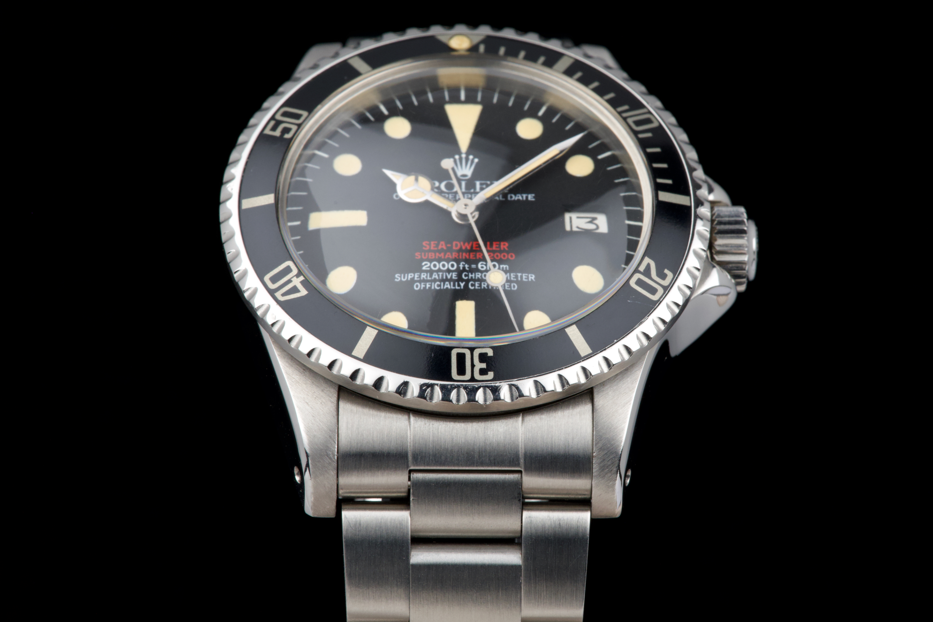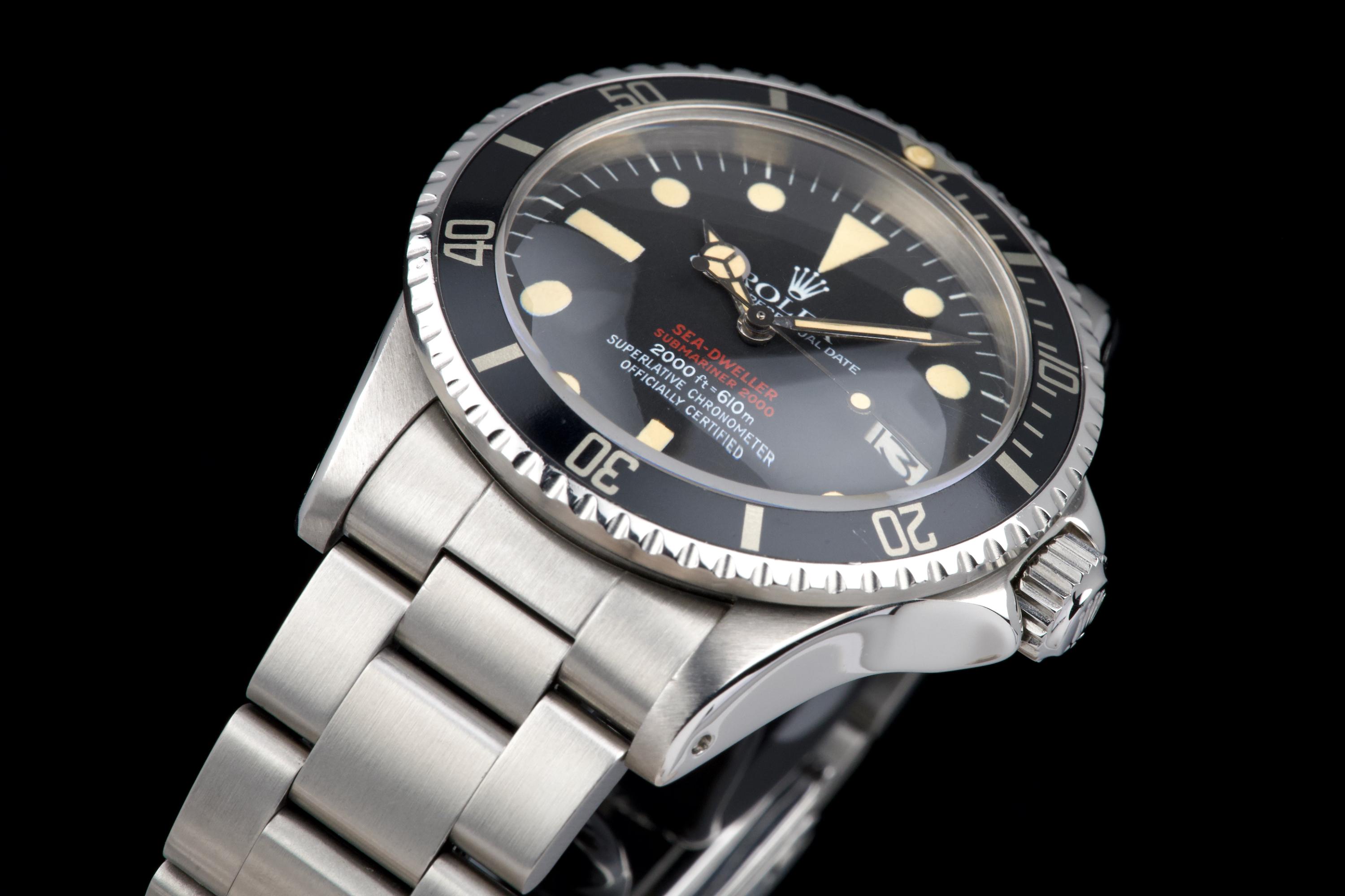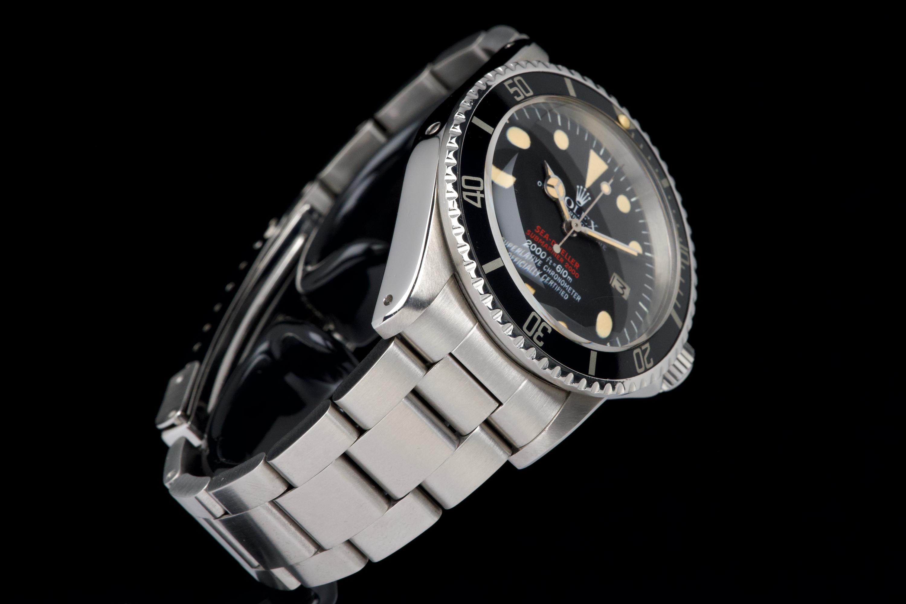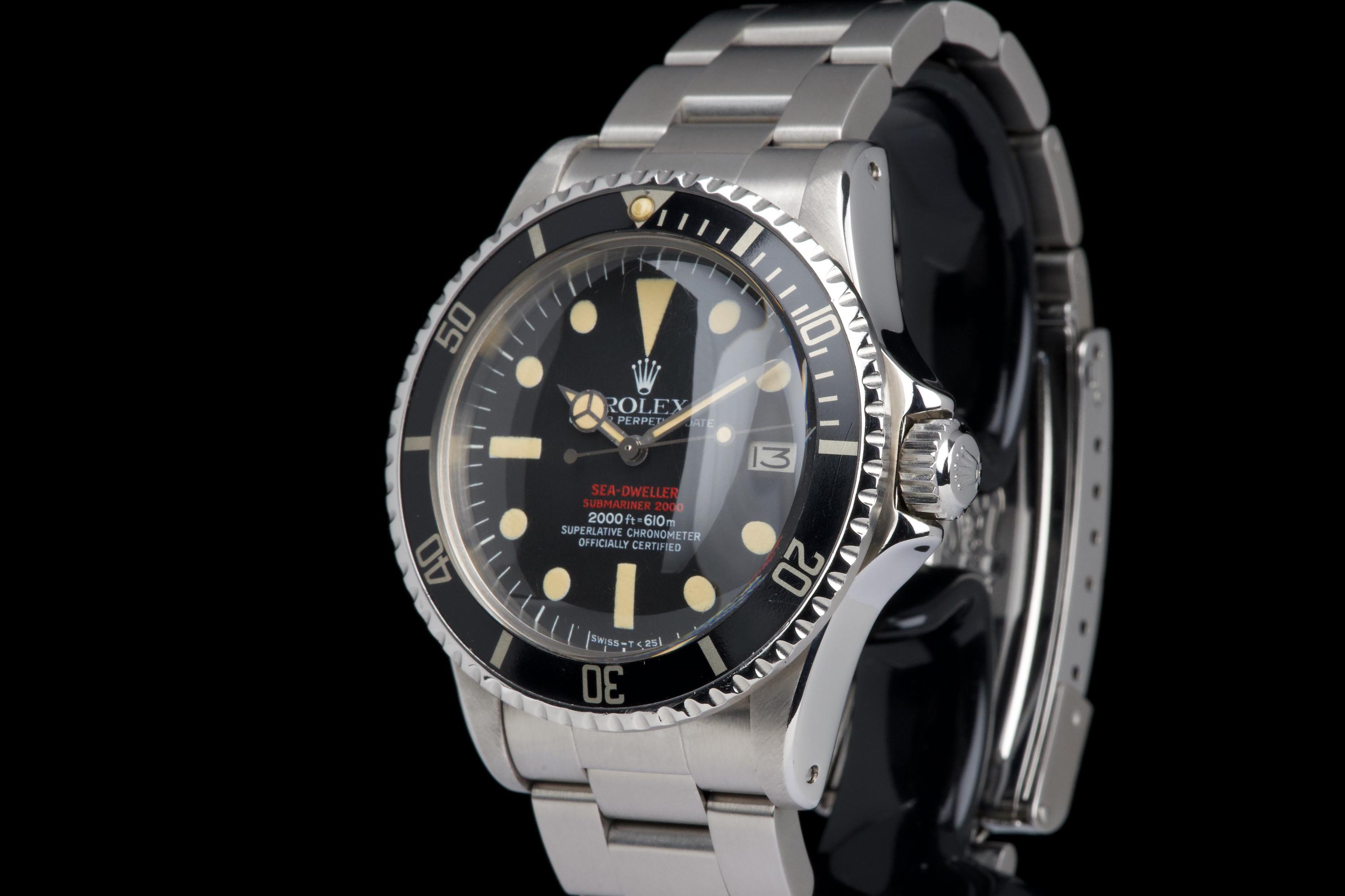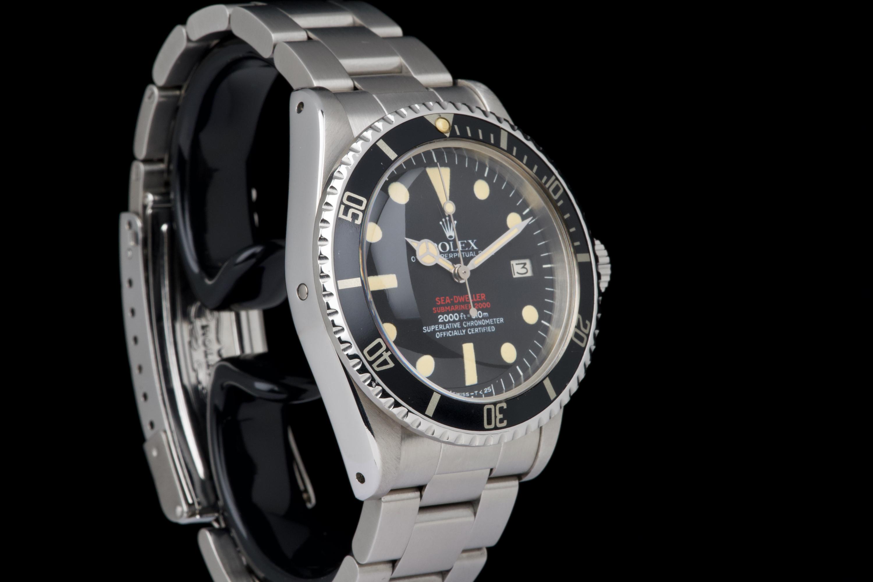 An exceptional example of the iconic Rolex Sea-Dweller “Double Red,” dating from 1974 and fitted with the desirable Mark 4 dial. The stainless steel case was polished in the past but remains thick and well proportioned, with beautiful and symmetrical chamfers. It shows only light wear overall and retains excellent presence on the wrist. The MK4 matte black dial is outstanding — perfectly preserved with no blemishes or discoloration. The tritium hour markers have aged to a rich, dark vanilla tone, while the double red lines of text remain vibrant and crisp. The original bezel is in excellent condition, fitted with its correct period insert showing light wear and a matching tritium pearl. Fitted with a later 93150 Oyster bracelet with 585 endlinks, claspcode VE, showing minimal stretch. The movement caliber 1570 is extremely clean and has been fully checked by our watchmaker. The caseback is correctly engraved 1665 with matching serial engraved inside, as expected for a Double Red from this production range. Serial and reference numbers between the lugs are perfectly legible, indicating the watch has seen little wear over the years. A truly beautiful and honest example of the legendary Rolex Sea-Dweller 1665 “Double Red” — featuring a flawless MK4 dial, warm patina, and strong case proportions. A top-tier collector’s piece.