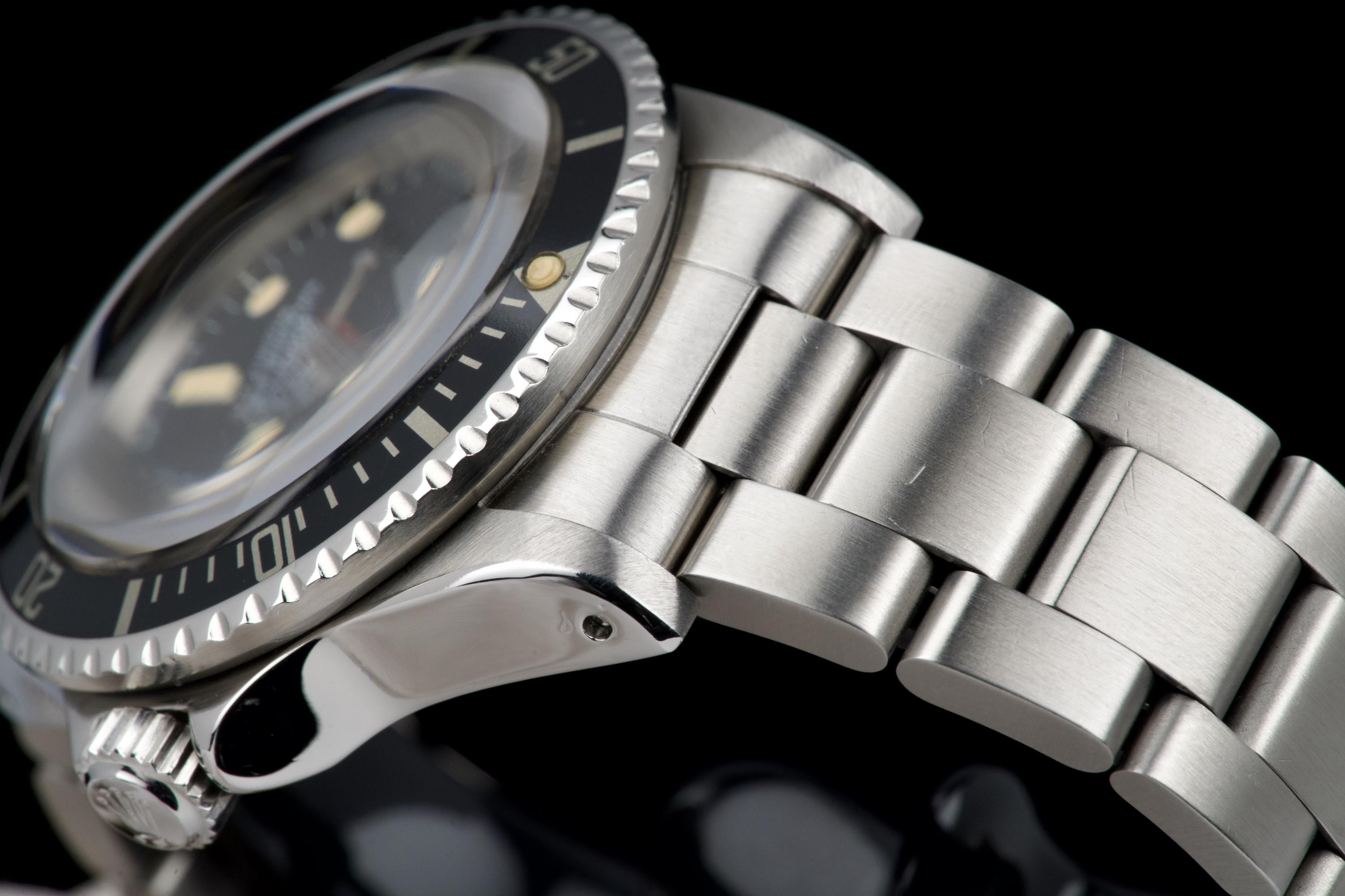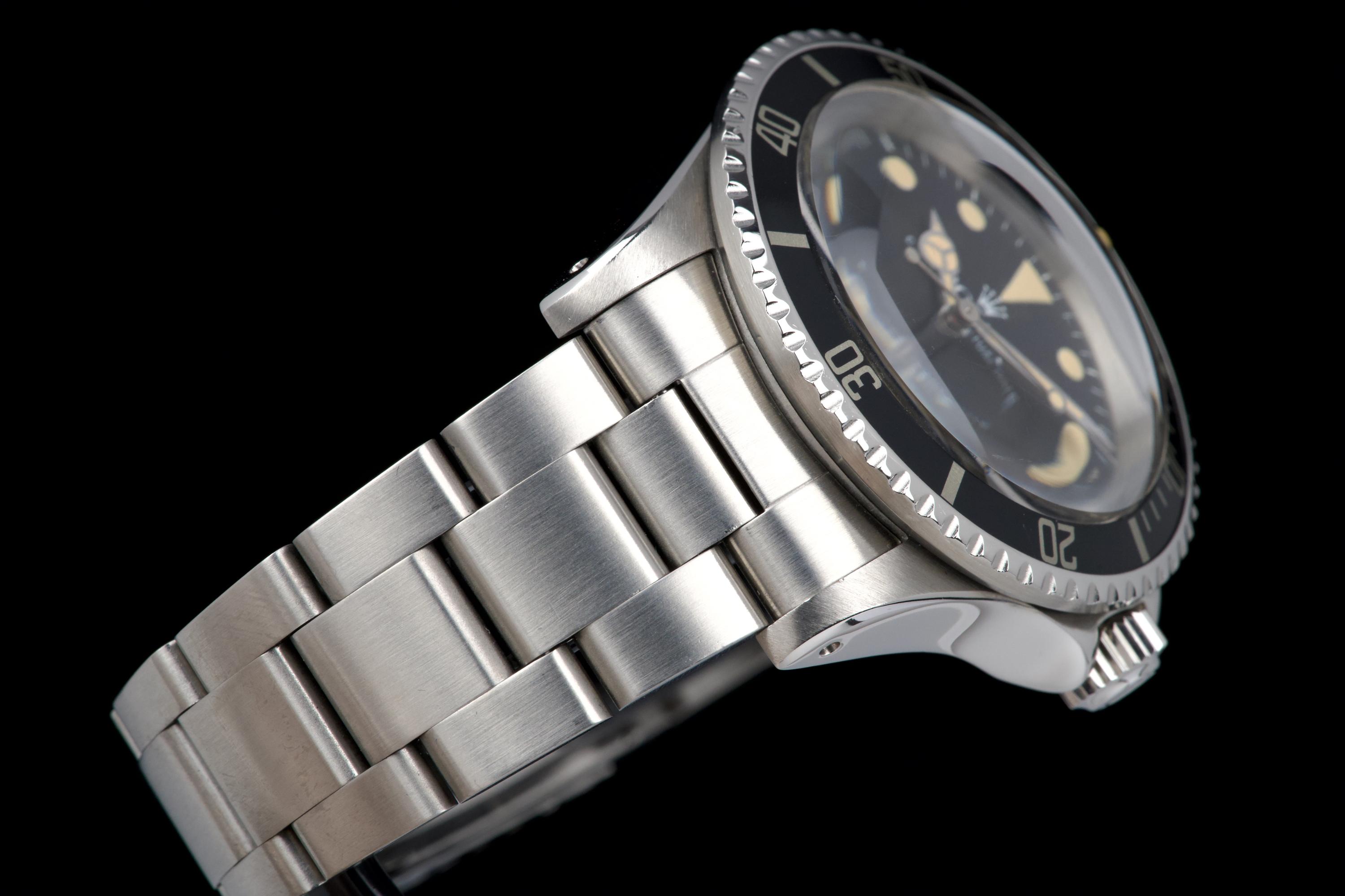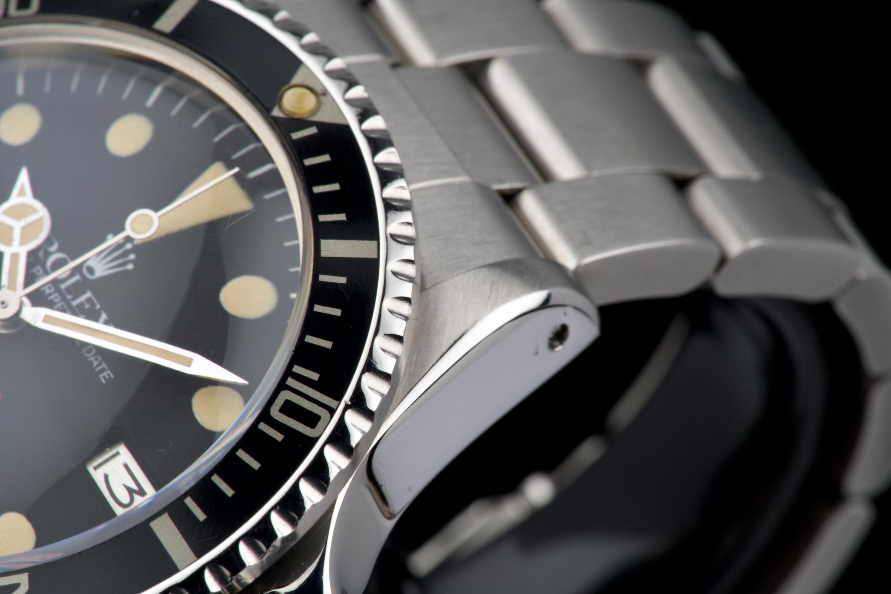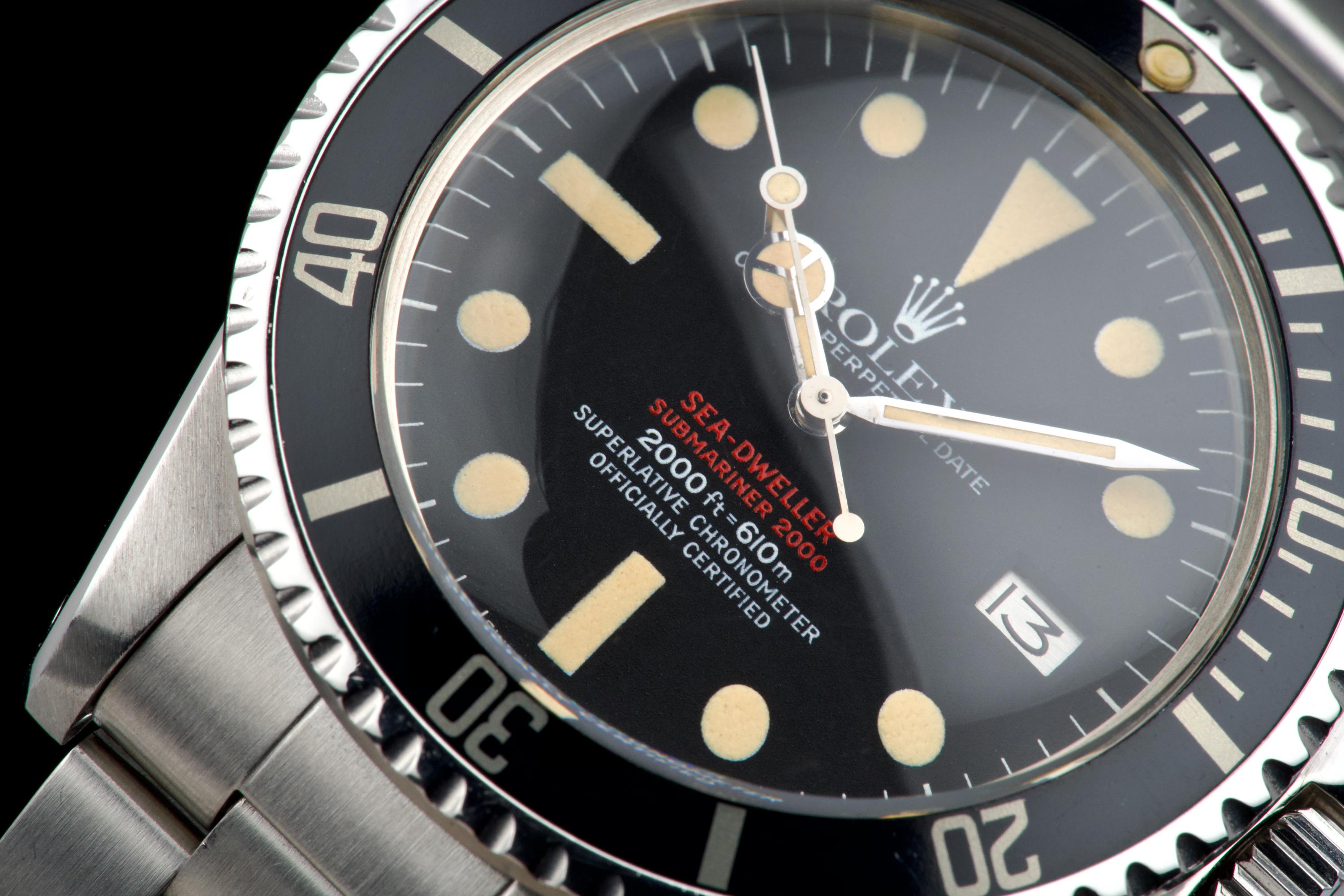 An exceptional example of the iconic Rolex Sea-Dweller “Double Red,” dating from 1974 and fitted with the desirable Mark 4 dial. The stainless steel case was polished in the past but remains thick and well proportioned, with beautiful and symmetrical chamfers. It shows only light wear overall and retains excellent presence on the wrist. The MK4 matte black dial is outstanding — perfectly preserved with no blemishes or discoloration. The tritium hour markers have aged to a rich, dark vanilla tone, while the double red lines of text remain vibrant and crisp. The original bezel is in excellent condition, fitted with its correct period insert showing light wear and a matching tritium pearl. Fitted with a later 93150 Oyster bracelet with 585 endlinks, claspcode VE, showing minimal stretch. The movement caliber 1570 is extremely clean and has been fully checked by our watchmaker. The caseback is correctly engraved 1665 with matching serial engraved inside, as expected for a Double Red from this production range. Serial and reference numbers between the lugs are perfectly legible, indicating the watch has seen little wear over the years. A truly beautiful and honest example of the legendary Rolex Sea-Dweller 1665 “Double Red” — featuring a flawless MK4 dial, warm patina, and strong case proportions. A top-tier collector’s piece.