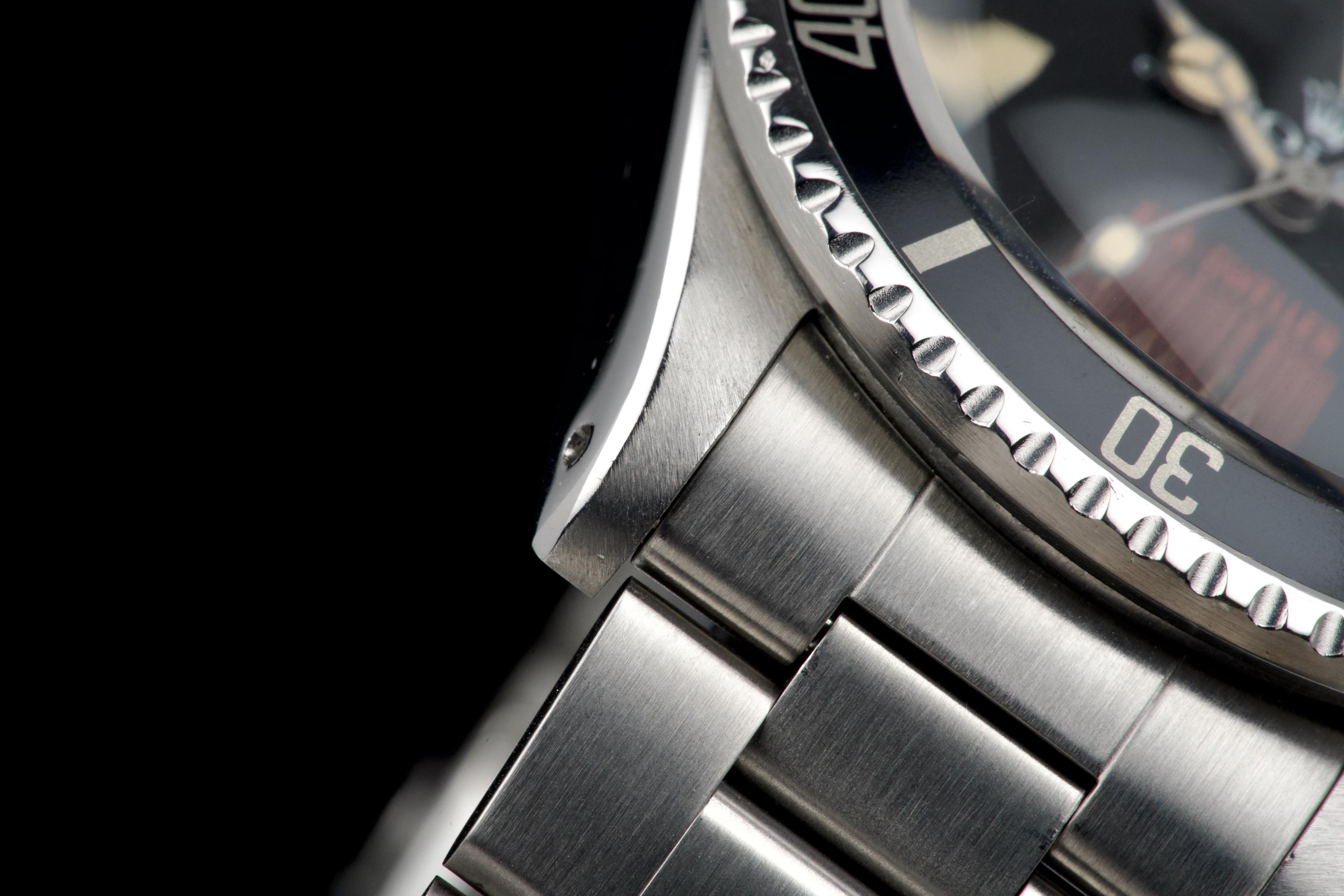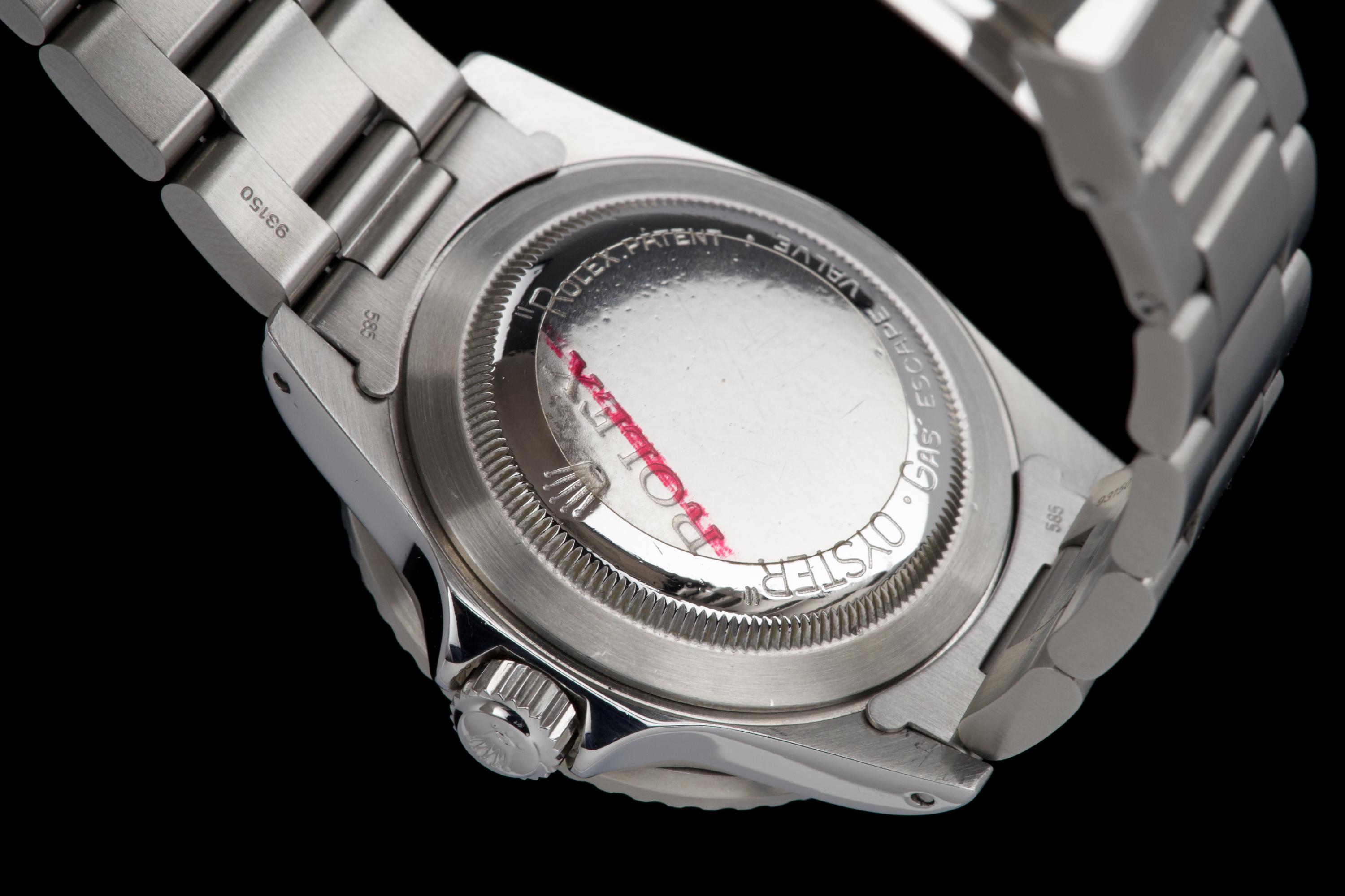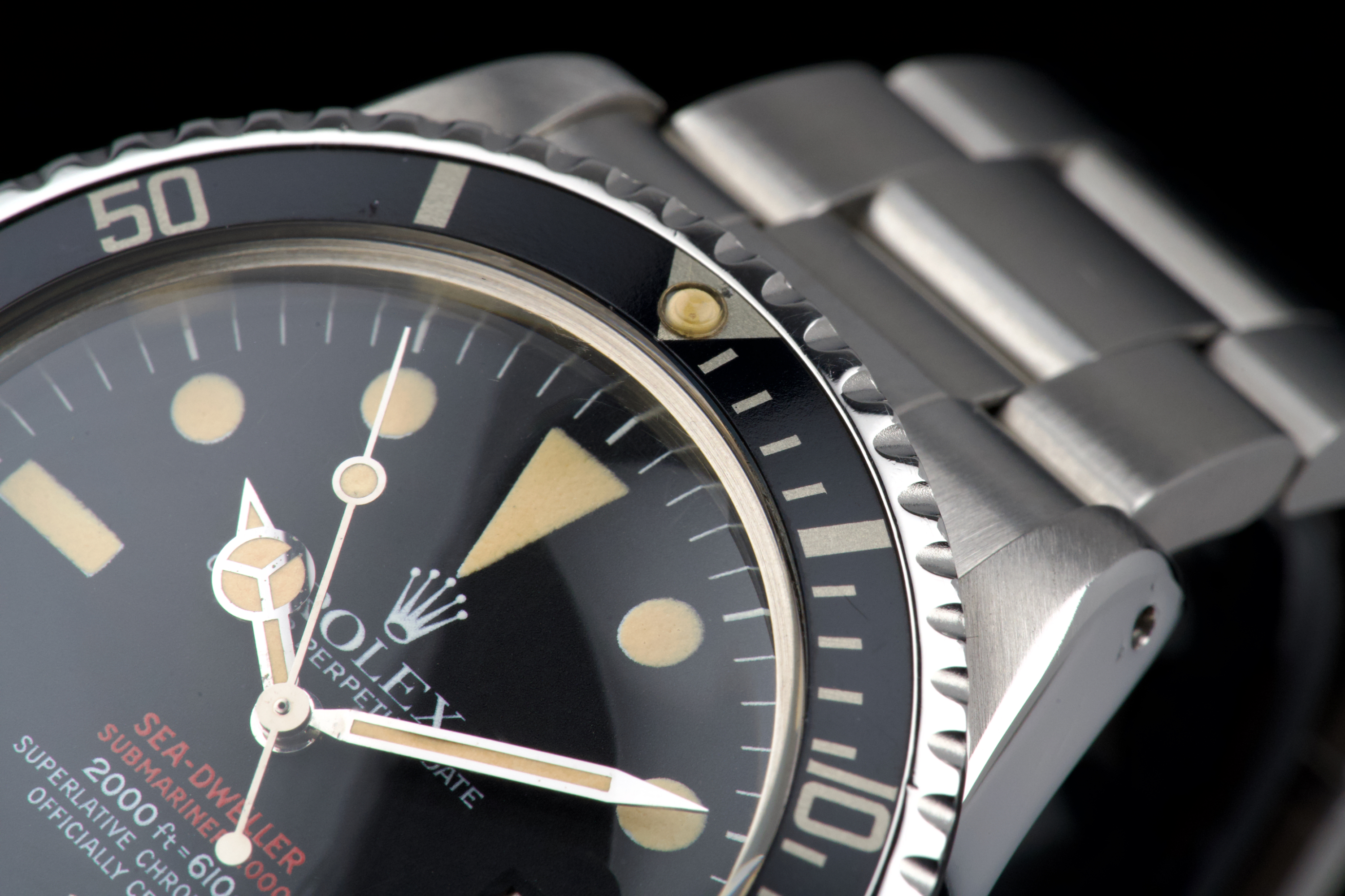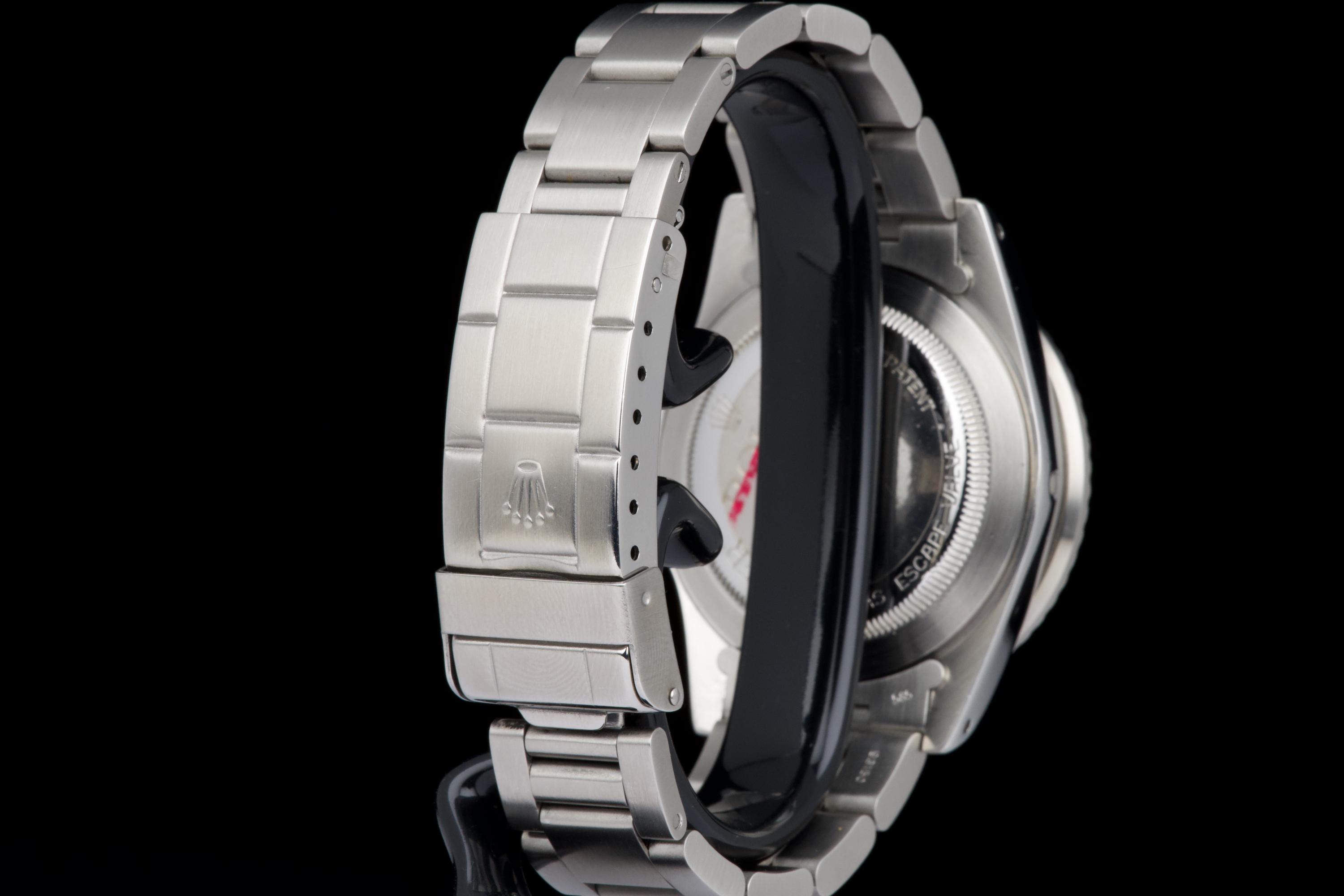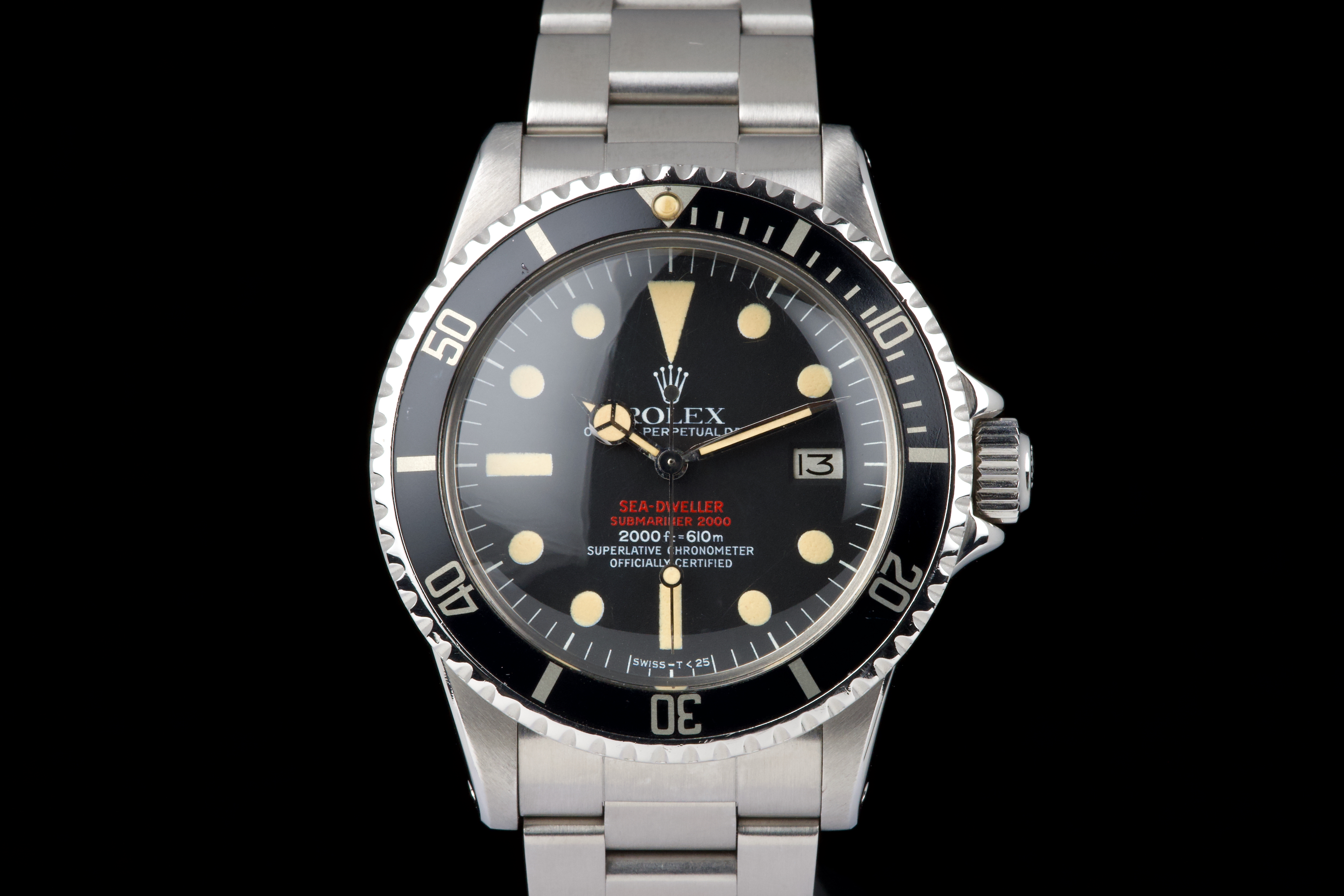 An exceptional example of the iconic Rolex Sea-Dweller “Double Red,” dating from 1974 and fitted with the desirable Mark 4 dial. The stainless steel case was polished in the past but remains thick and well proportioned, with beautiful and symmetrical chamfers. It shows only light wear overall and retains excellent presence on the wrist. The MK4 matte black dial is outstanding — perfectly preserved with no blemishes or discoloration. The tritium hour markers have aged to a rich, dark vanilla tone, while the double red lines of text remain vibrant and crisp. The original bezel is in excellent condition, fitted with its correct period insert showing light wear and a matching tritium pearl. Fitted with a later 93150 Oyster bracelet with 585 endlinks, claspcode VE, showing minimal stretch. The movement caliber 1570 is extremely clean and has been fully checked by our watchmaker. The caseback is correctly engraved 1665 with matching serial engraved inside, as expected for a Double Red from this production range. Serial and reference numbers between the lugs are perfectly legible, indicating the watch has seen little wear over the years. A truly beautiful and honest example of the legendary Rolex Sea-Dweller 1665 “Double Red” — featuring a flawless MK4 dial, warm patina, and strong case proportions. A top-tier collector’s piece.
