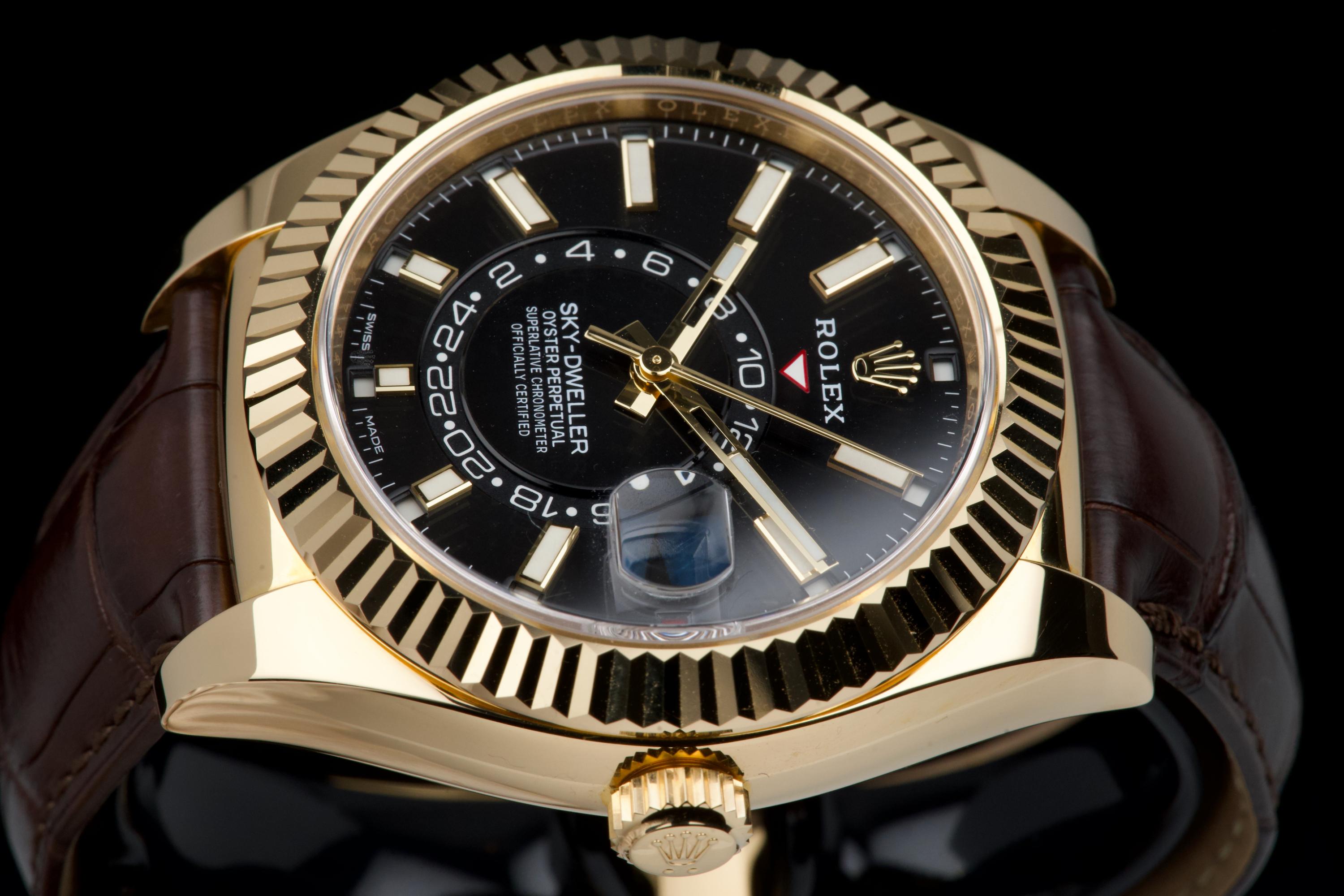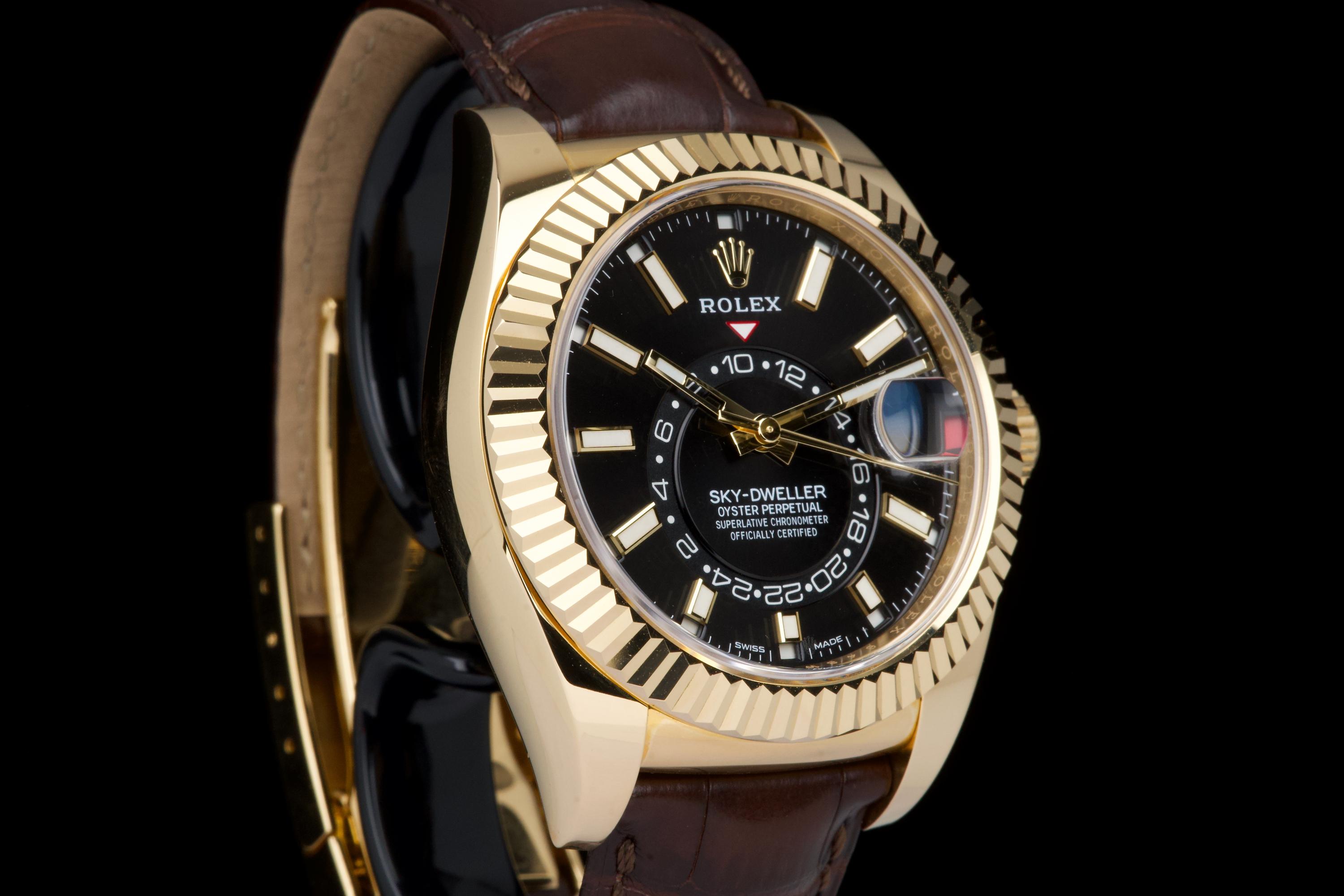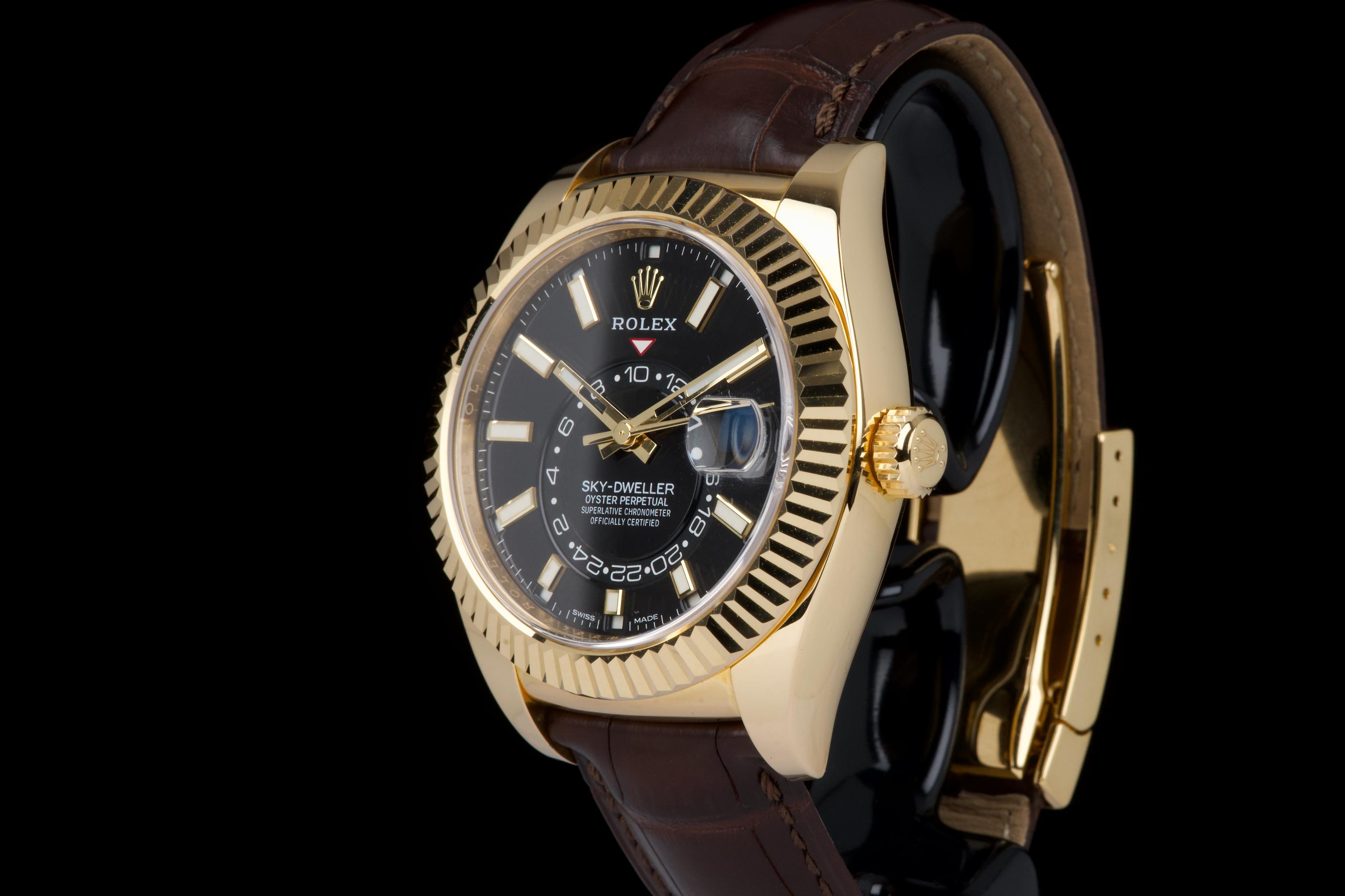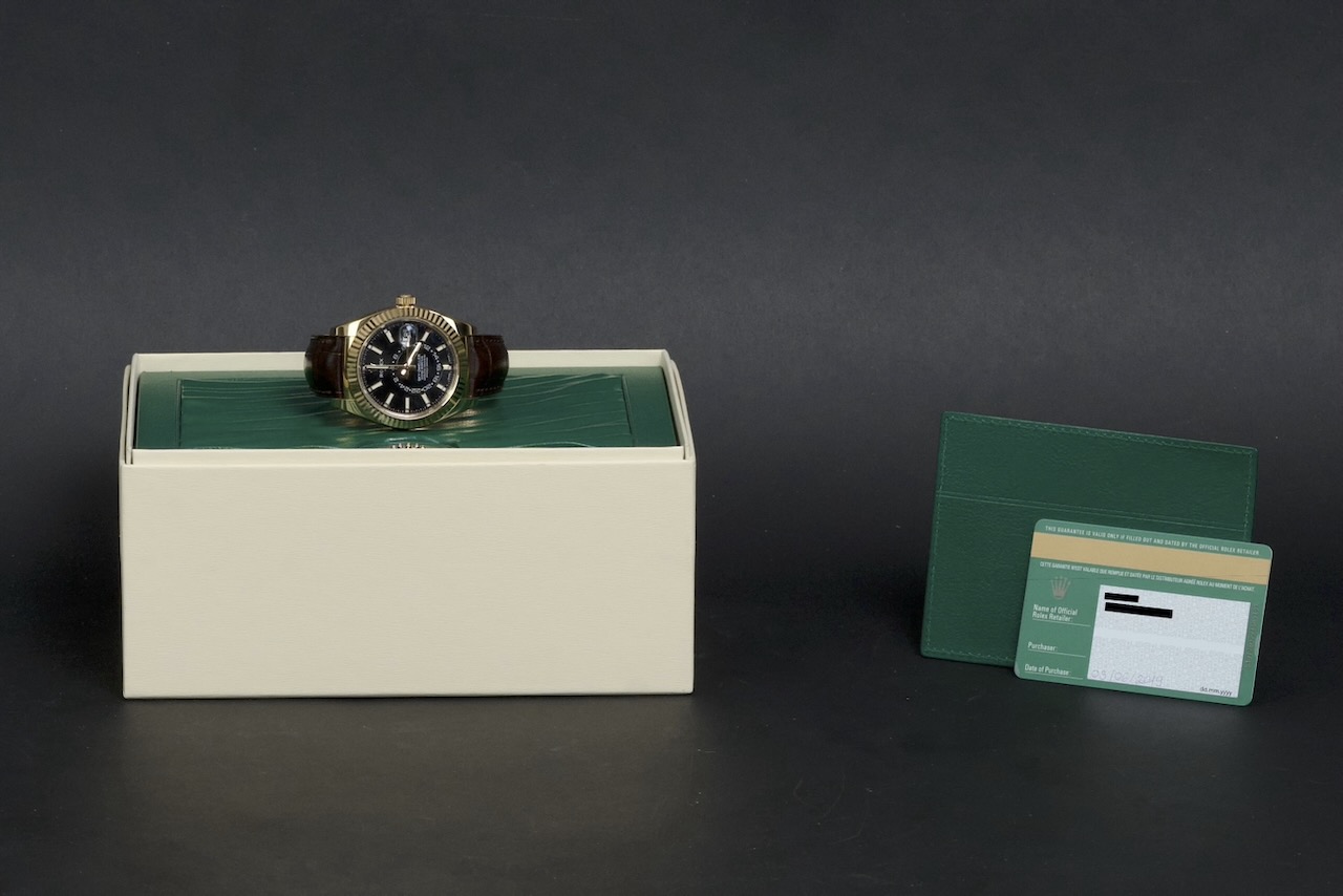 This elegant Rolex Sky-Dweller 326138 comes as a full set, originally sold in 2019. The 42mm yellow gold case has just been professionally polished and serviced by our watchmaker, ensuring it is in perfect condition. The black dial features dual time zone display and annual calendar, offering both style and functionality. The dark brown Rolex alligator strap has just been replaced and is unworn, complemented by its original yellow gold folding clasp. A striking and refined travel companion for those who demand excellence.