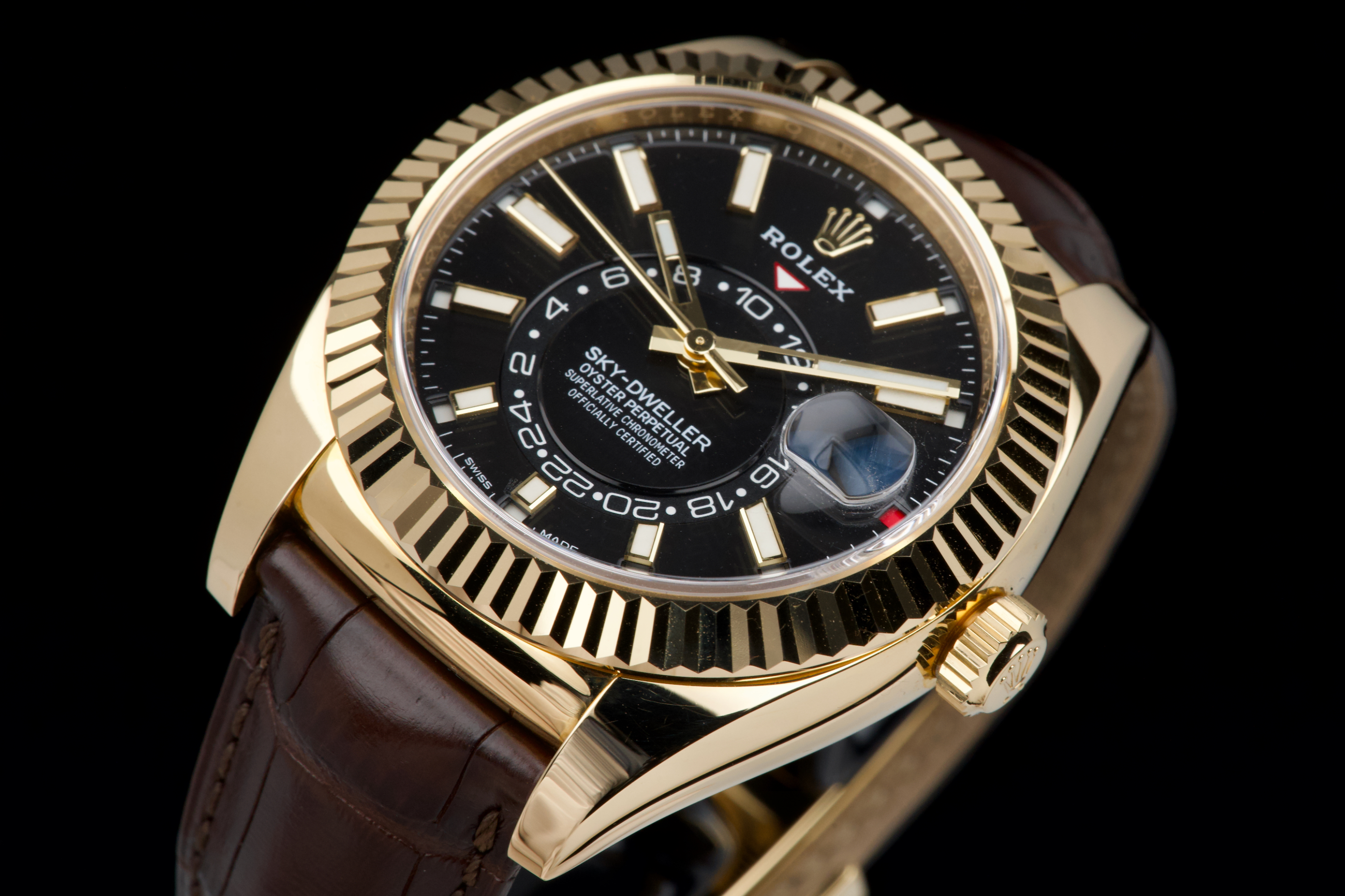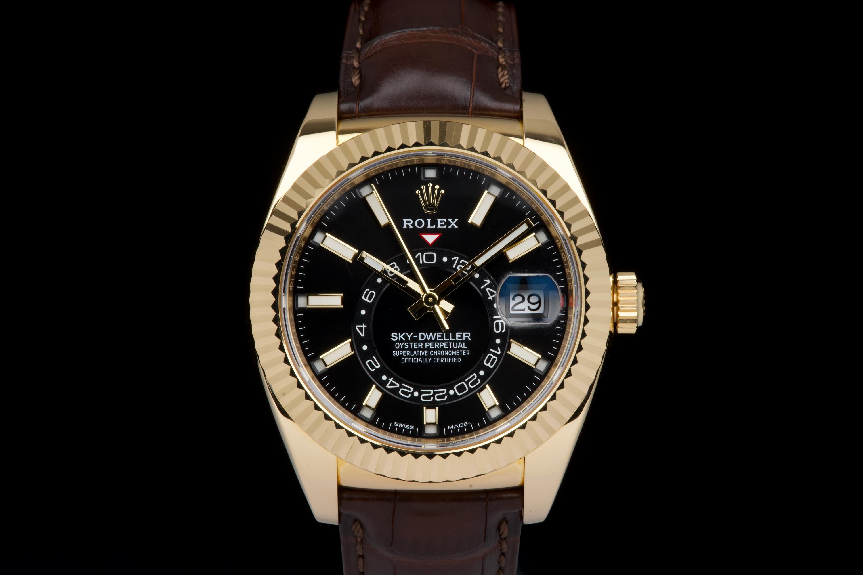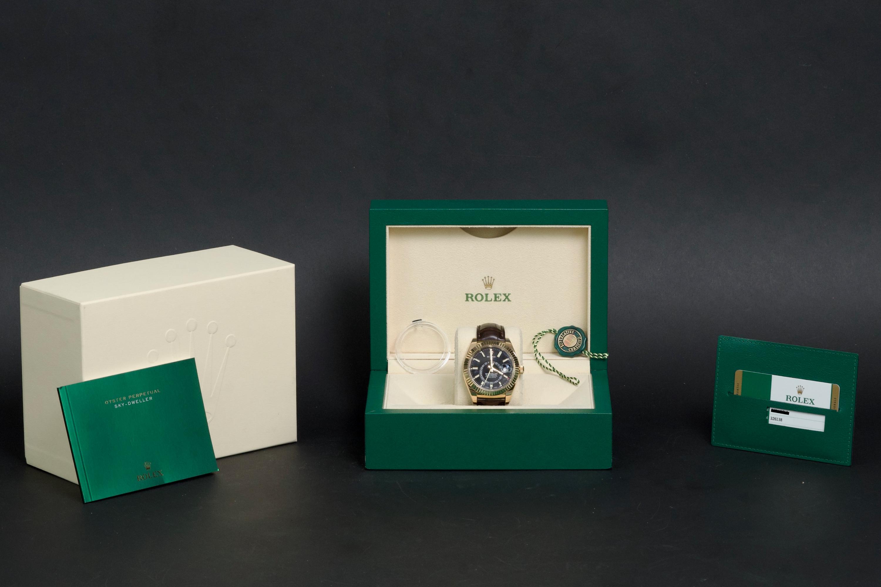 This elegant Rolex Sky-Dweller 326138 comes as a full set, originally sold in 2019. The 42mm yellow gold case has just been professionally polished and serviced by our watchmaker, ensuring it is in perfect condition. The black dial features dual time zone display and annual calendar, offering both style and functionality. The dark brown Rolex alligator strap has just been replaced and is unworn, complemented by its original yellow gold folding clasp. A striking and refined travel companion for those who demand excellence.
