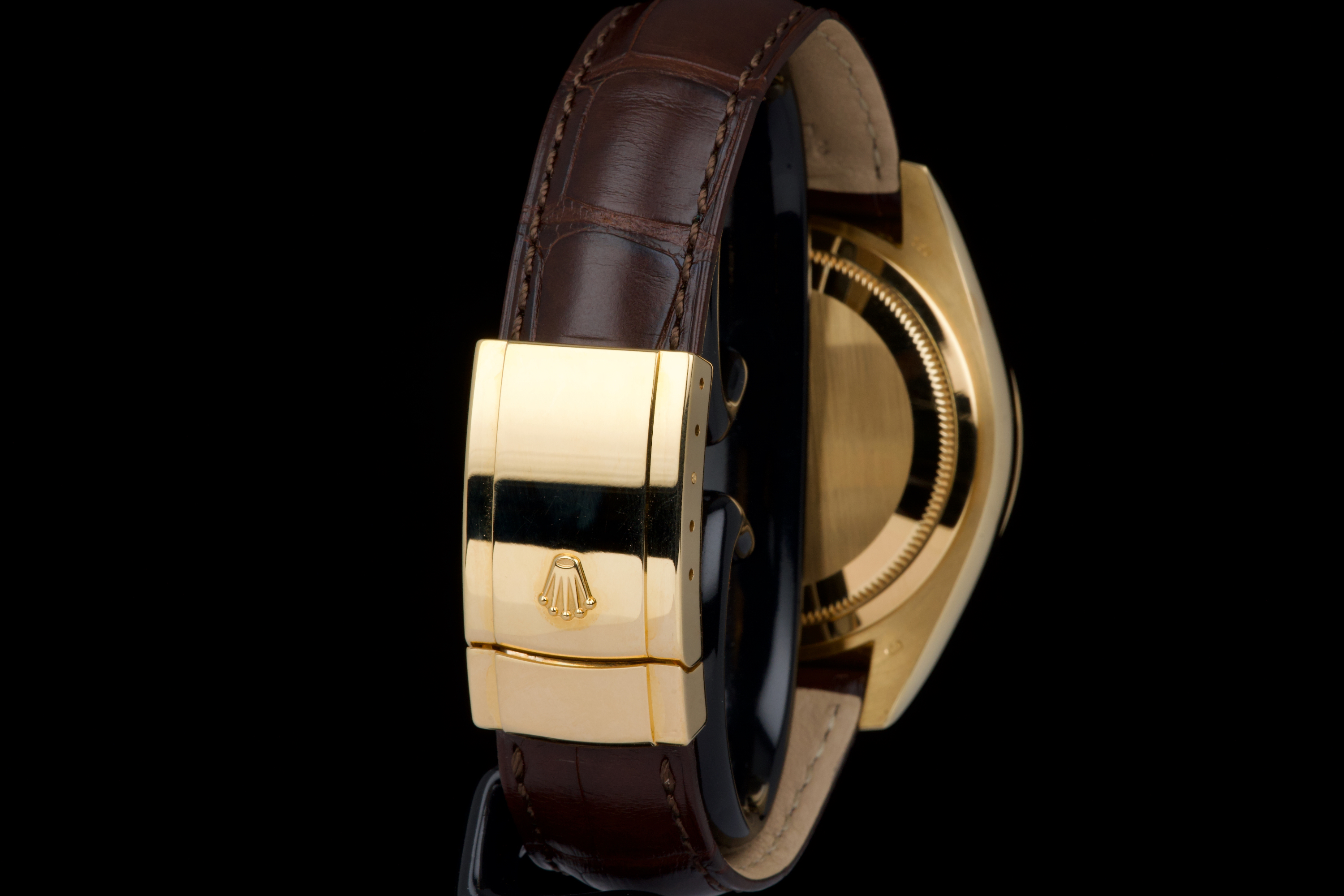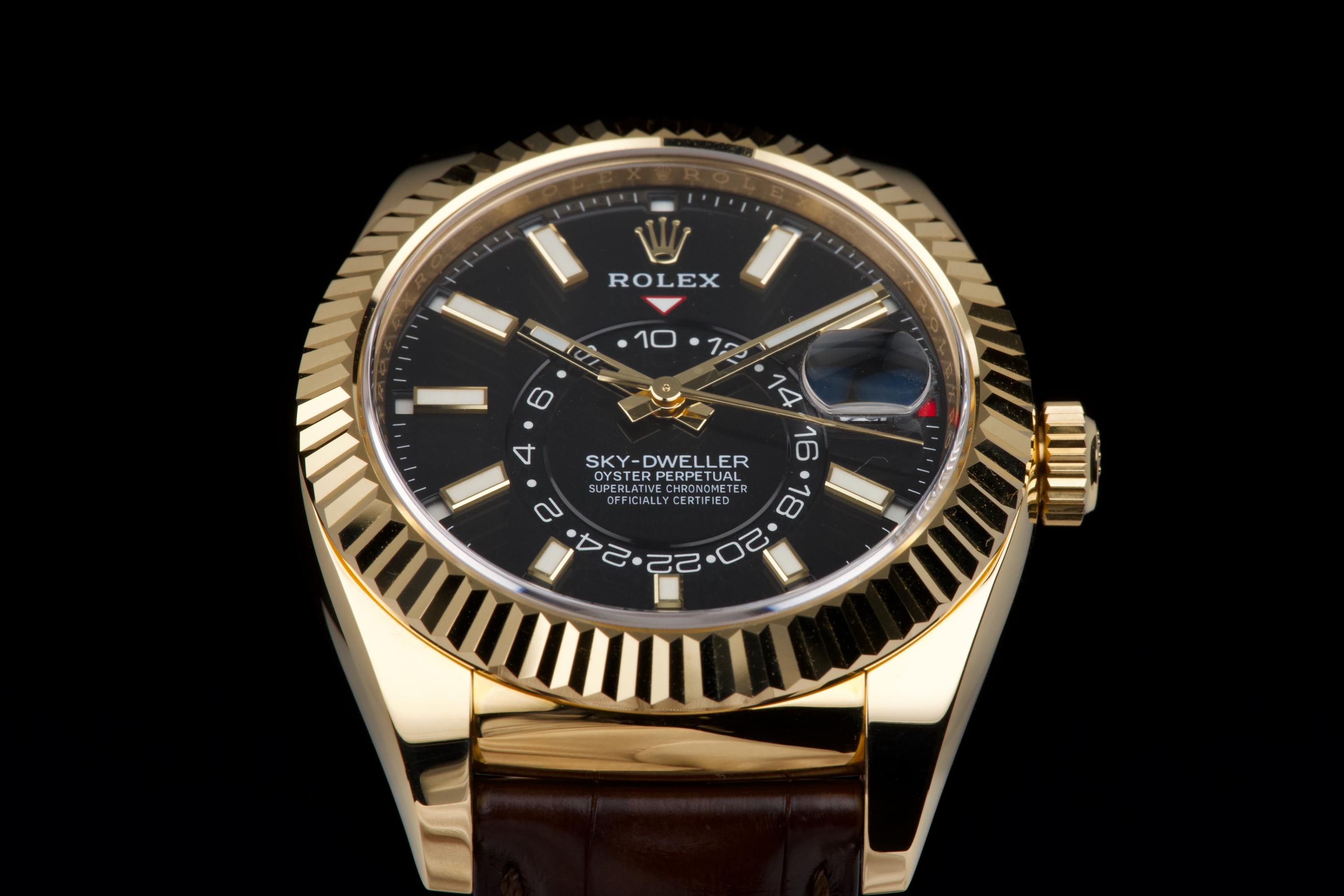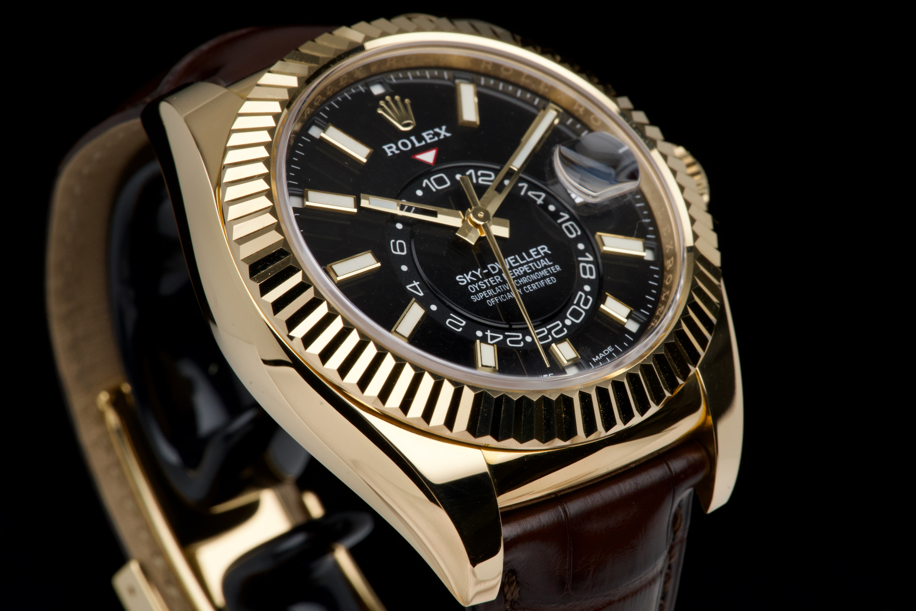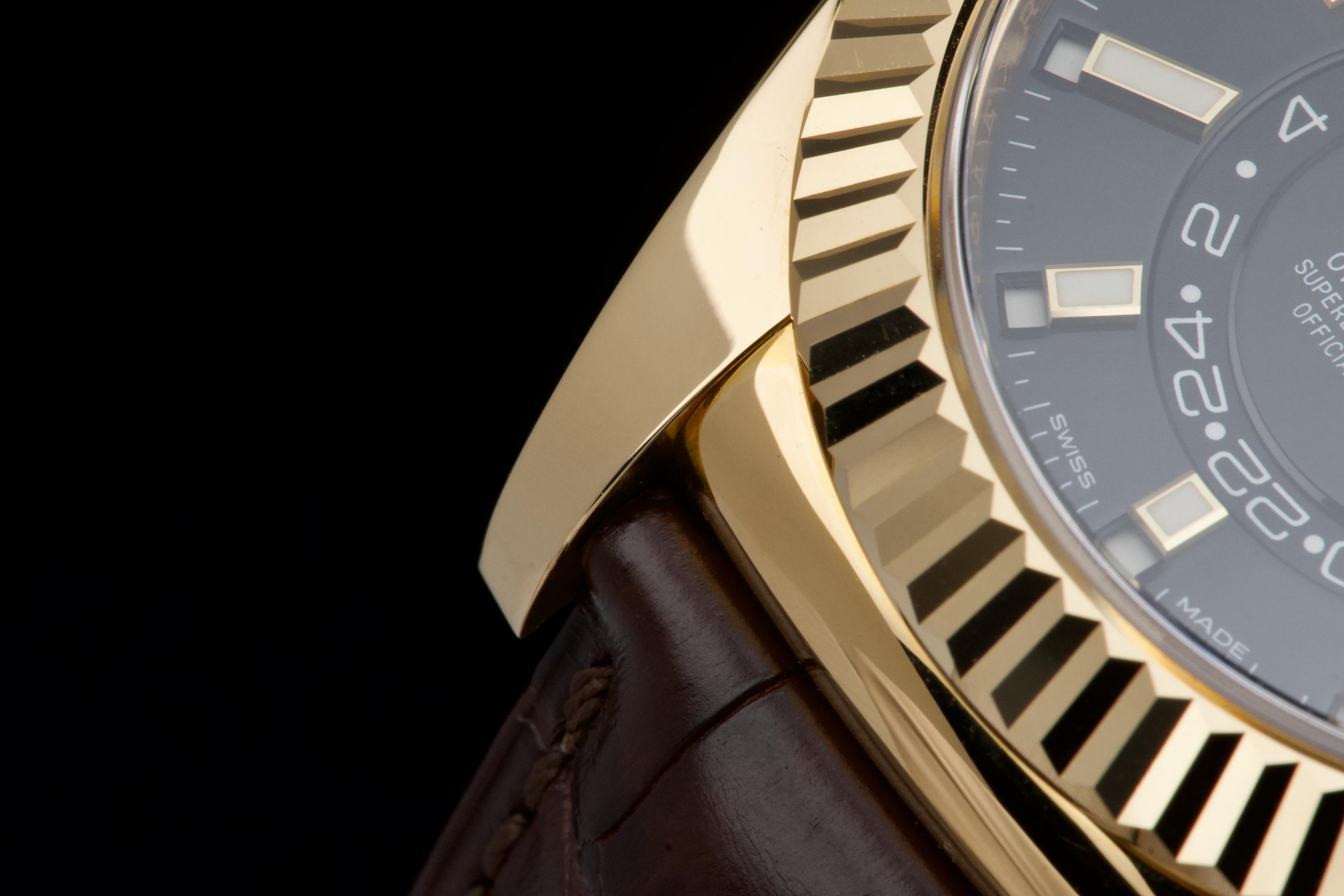 This elegant Rolex Sky-Dweller 326138 comes as a full set, originally sold in 2019. The 42mm yellow gold case has just been professionally polished and serviced by our watchmaker, ensuring it is in perfect condition. The black dial features dual time zone display and annual calendar, offering both style and functionality. The dark brown Rolex alligator strap has just been replaced and is unworn, complemented by its original yellow gold folding clasp. A striking and refined travel companion for those who demand excellence.