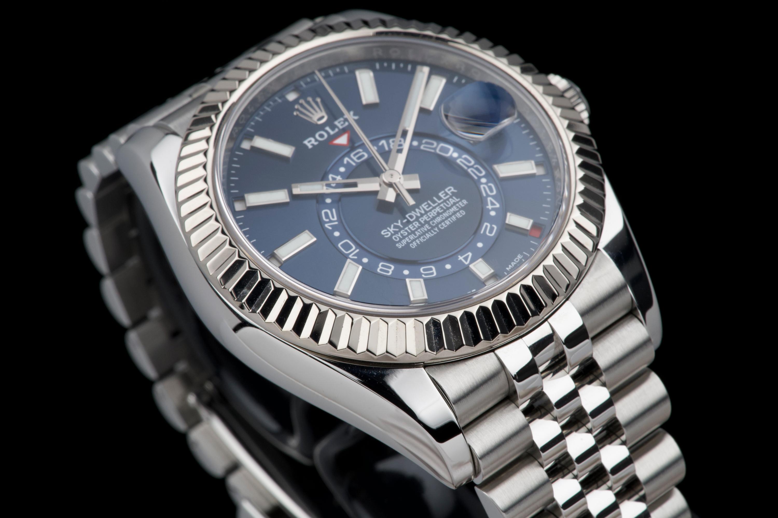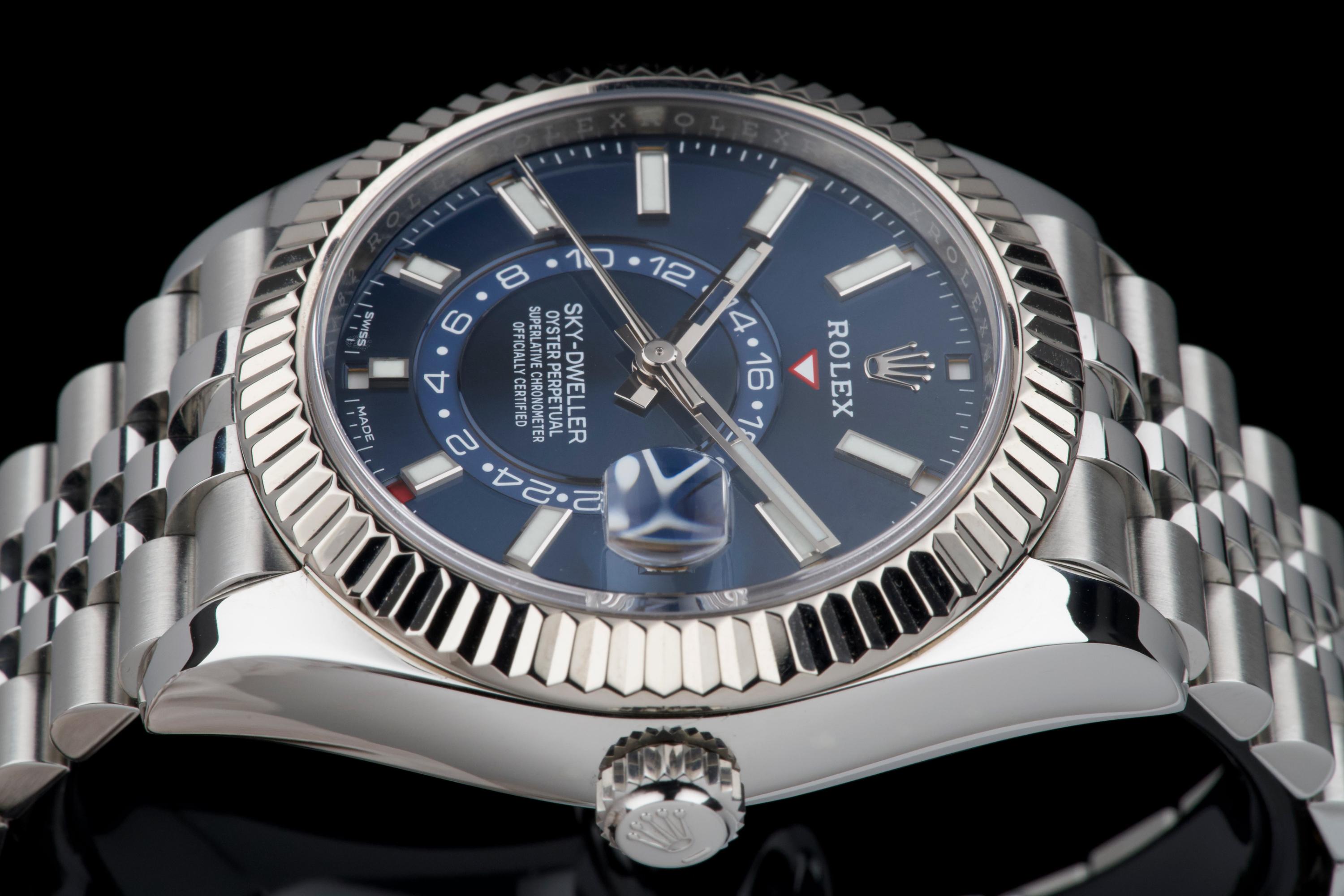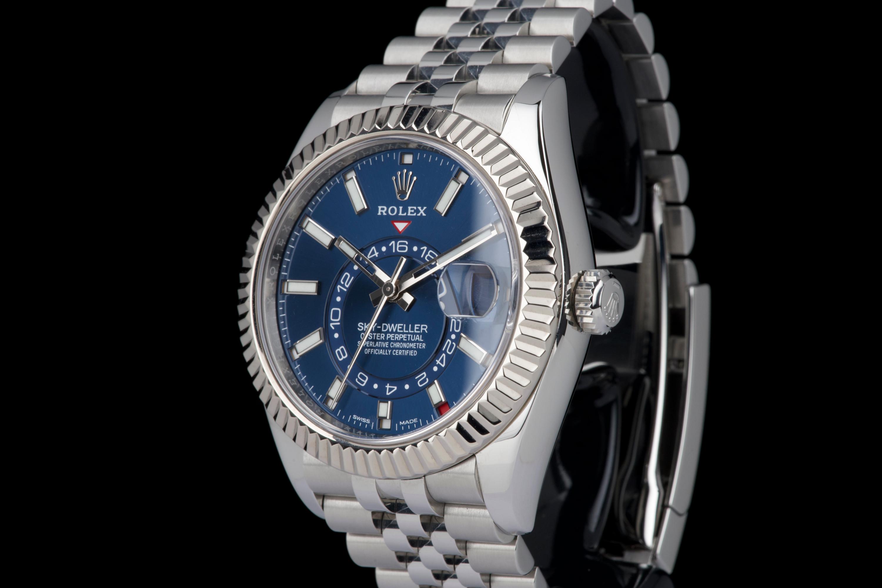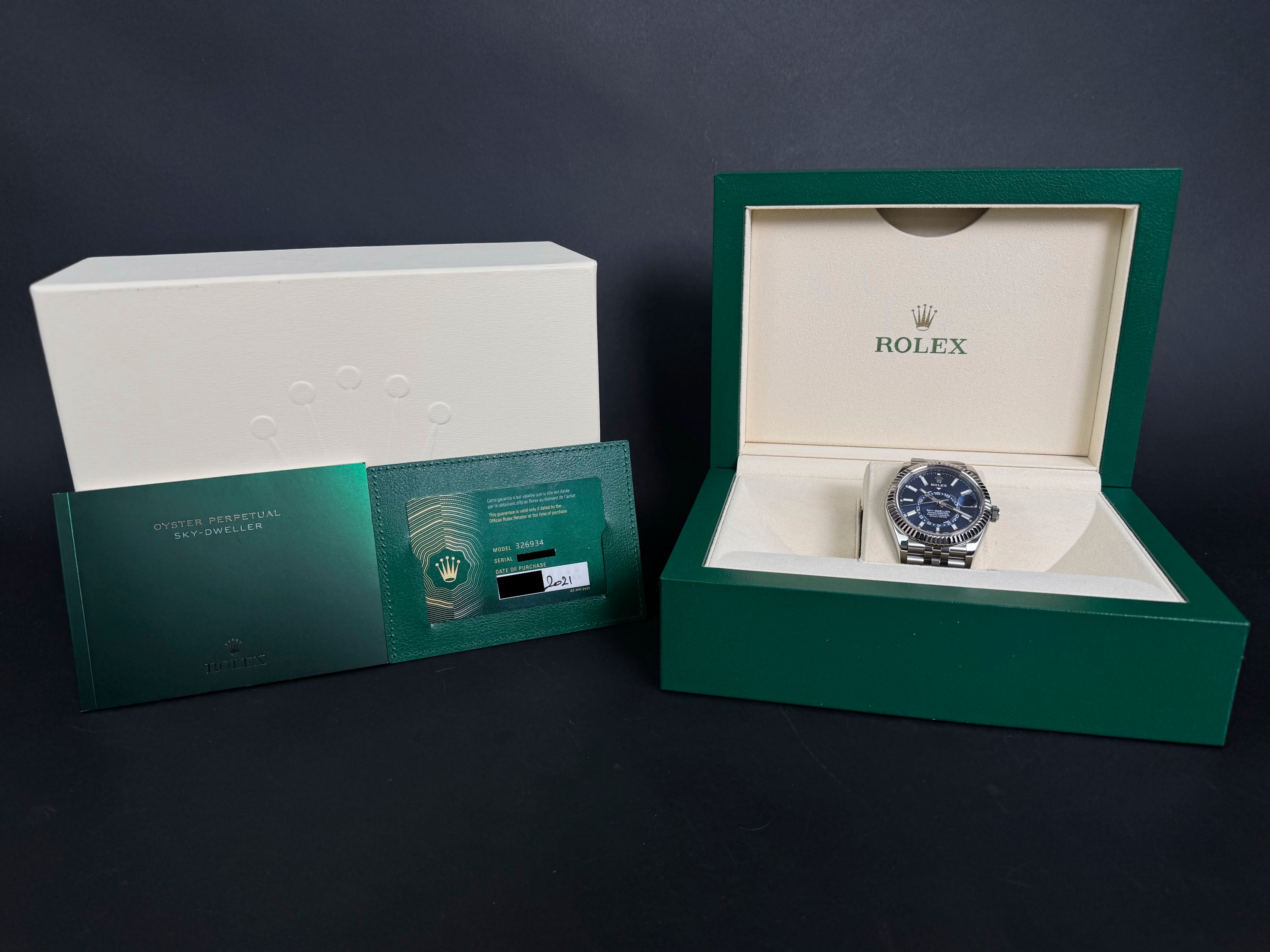 The Rolex Sky-Dweller 326934 is the brand’s most complex model, combining dual time zone functionality with an annual calendar, all elegantly integrated into a 42 mm case. This version pairs a striking sunburst blue dial with a white gold fluted bezel and a stainless steel jubilé bracelet—one of the most sought-after configurations in the lineup. This example was sold in 2021 and comes as a complete full set. It has just been professionally polished and is in excellent overall condition. A perfect blend of sophistication and functionality, the blue Sky-Dweller continues to be one of the most desirable modern Rolex references.