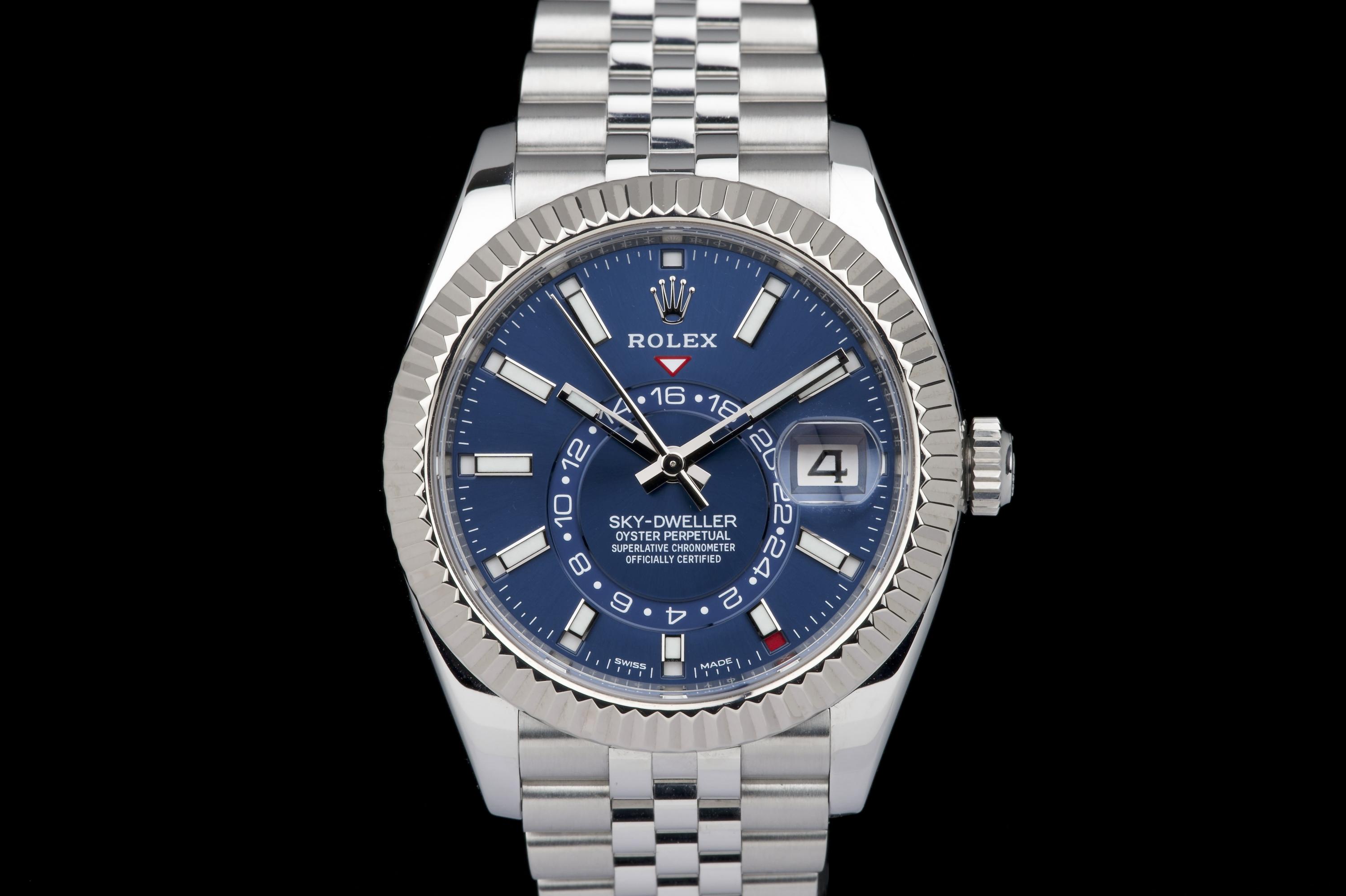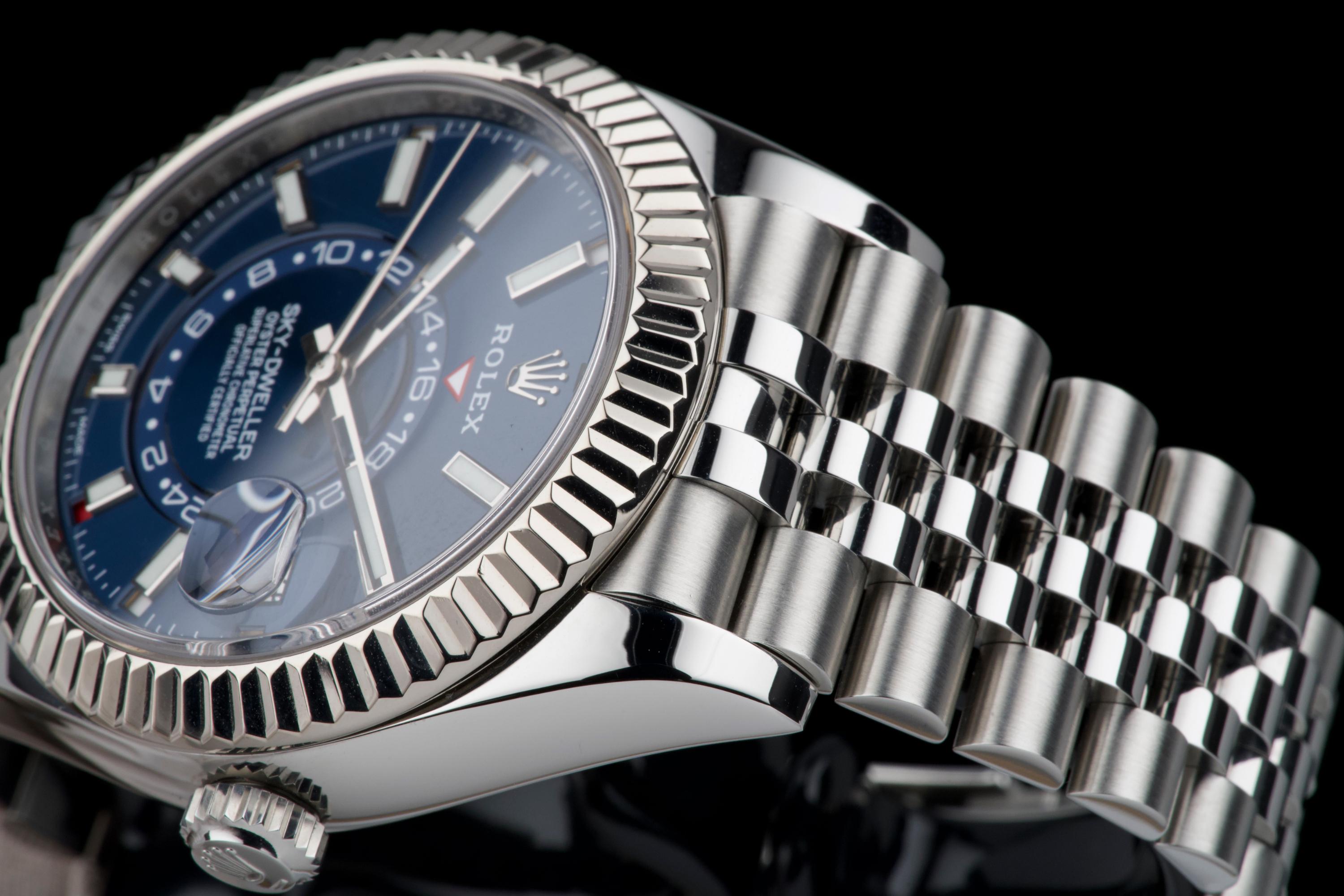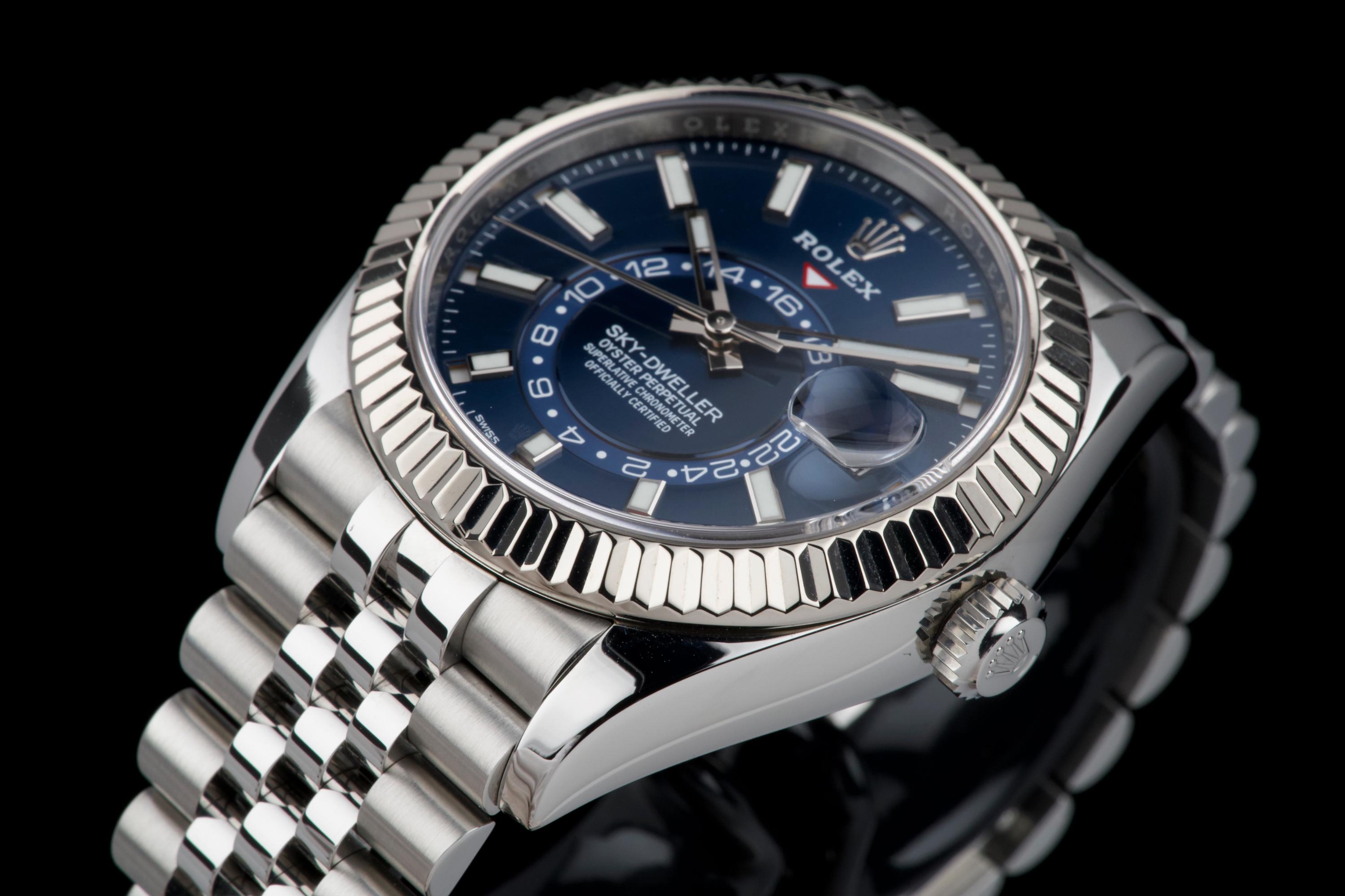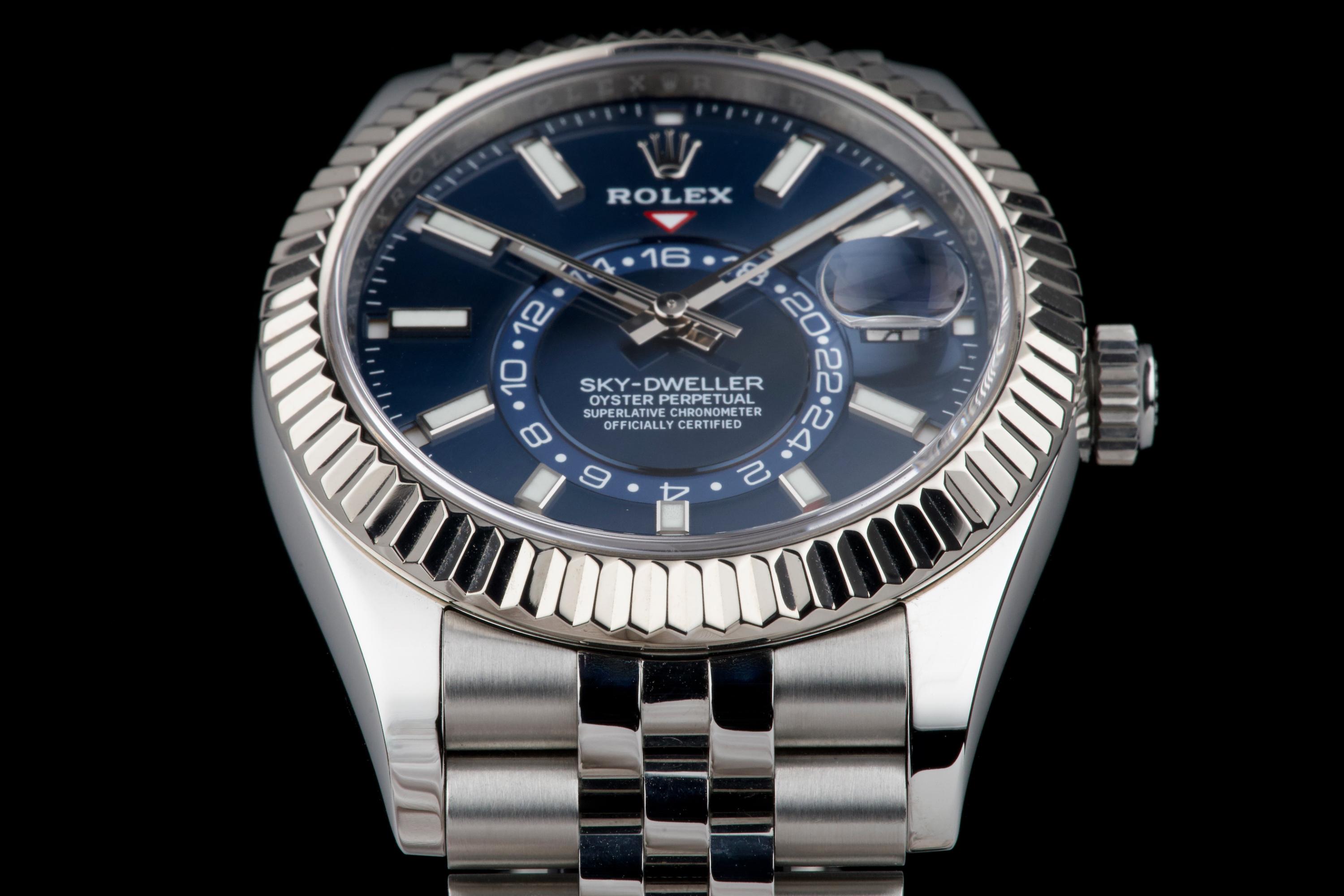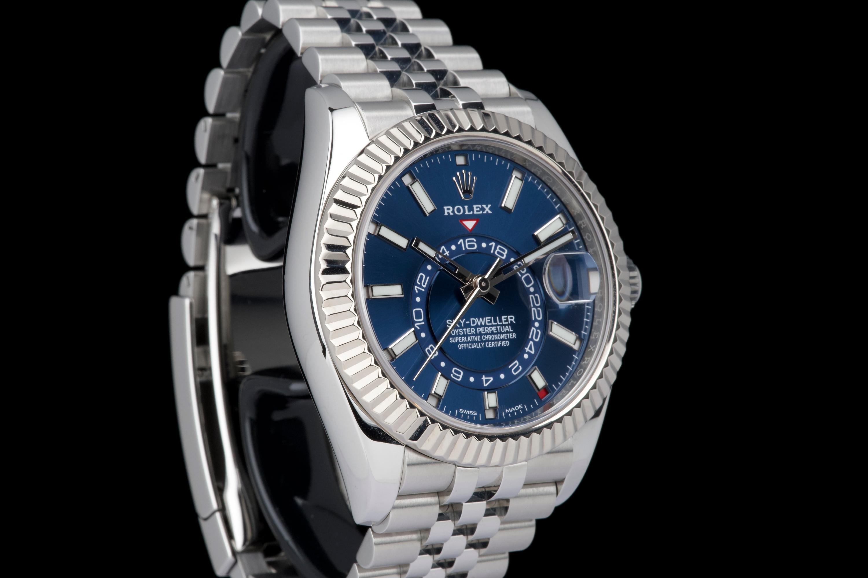 The Rolex Sky-Dweller 326934 is the brand’s most complex model, combining dual time zone functionality with an annual calendar, all elegantly integrated into a 42 mm case. This version pairs a striking sunburst blue dial with a white gold fluted bezel and a stainless steel jubilé bracelet—one of the most sought-after configurations in the lineup. This example was sold in 2021 and comes as a complete full set. It has just been professionally polished and is in excellent overall condition. A perfect blend of sophistication and functionality, the blue Sky-Dweller continues to be one of the most desirable modern Rolex references.