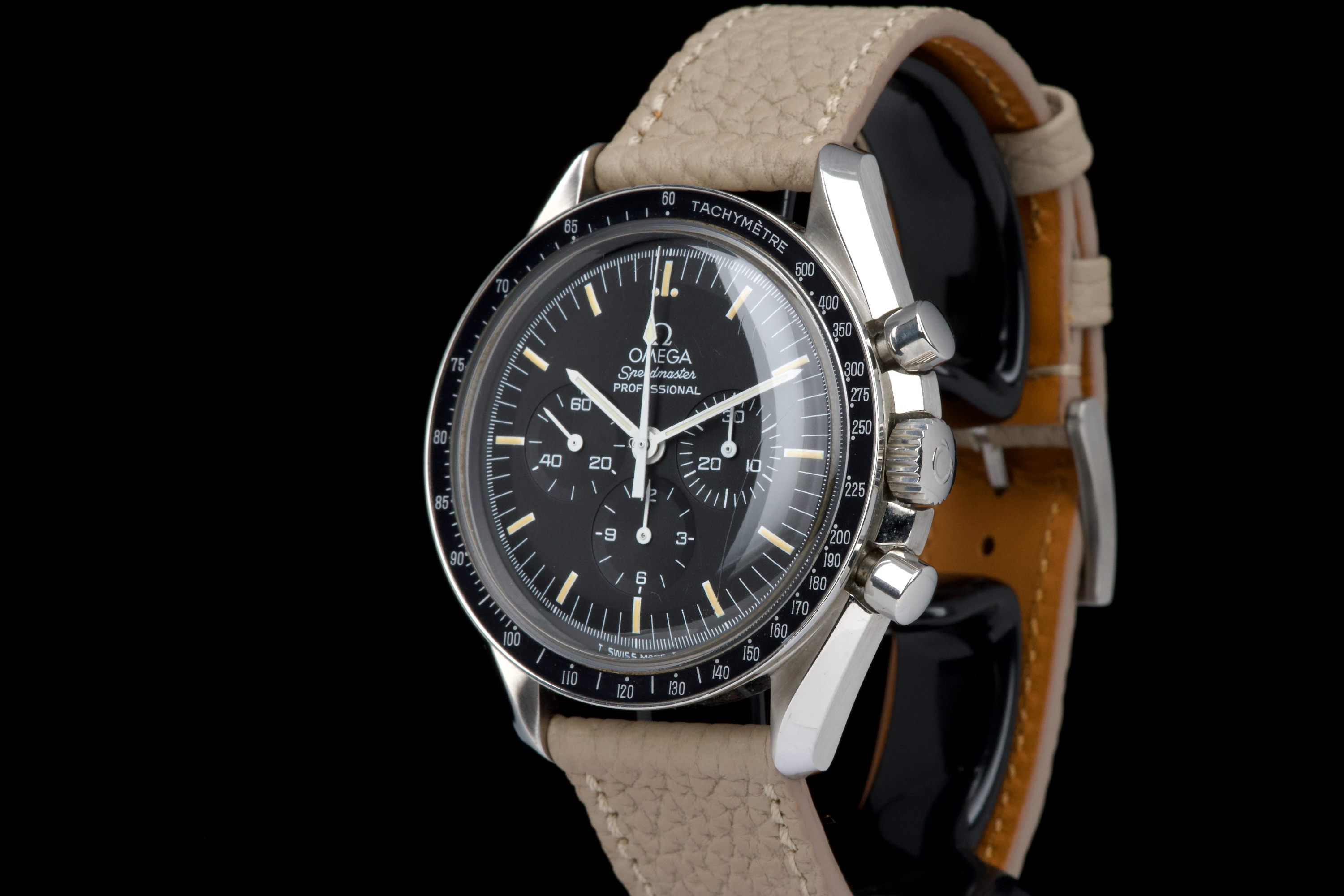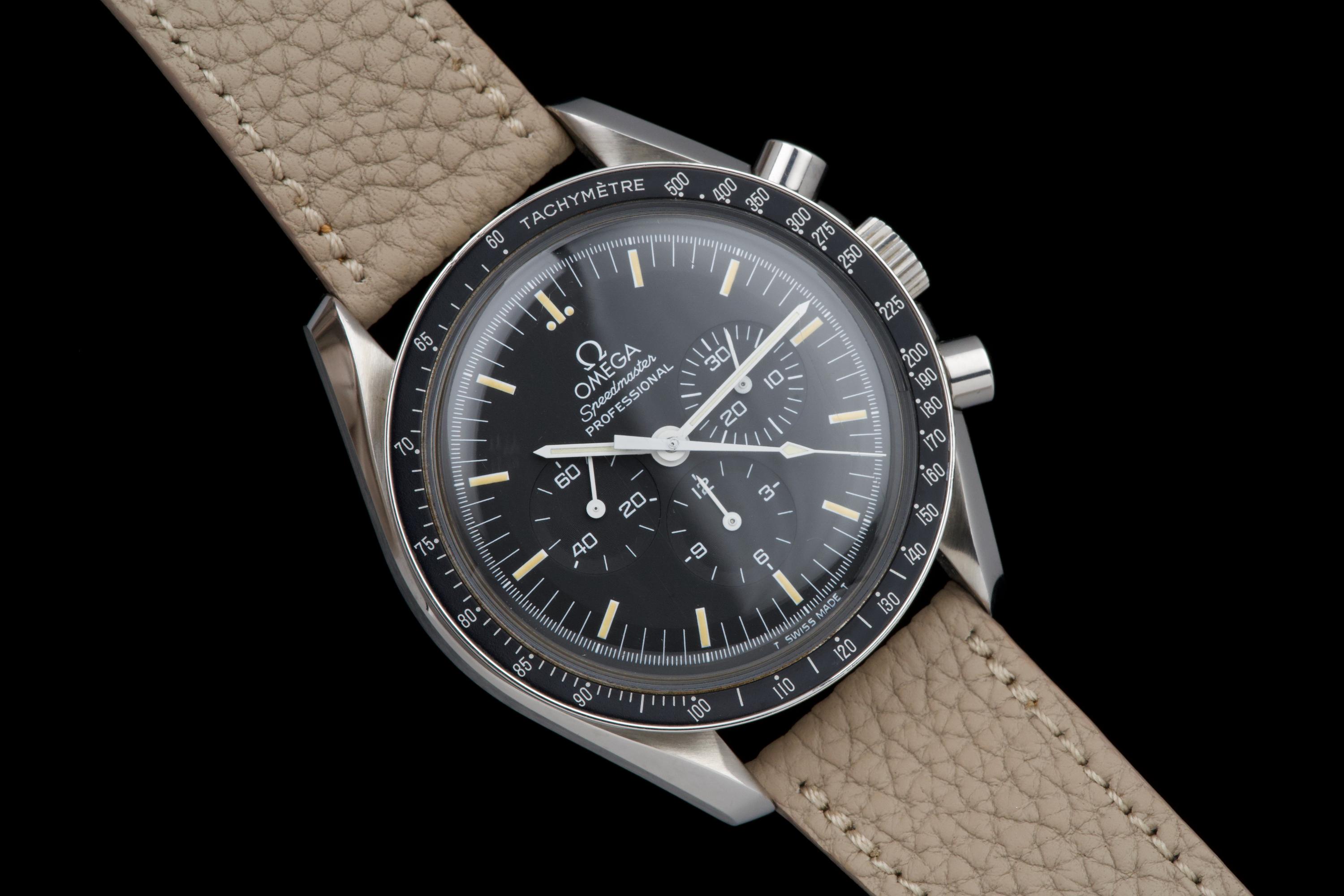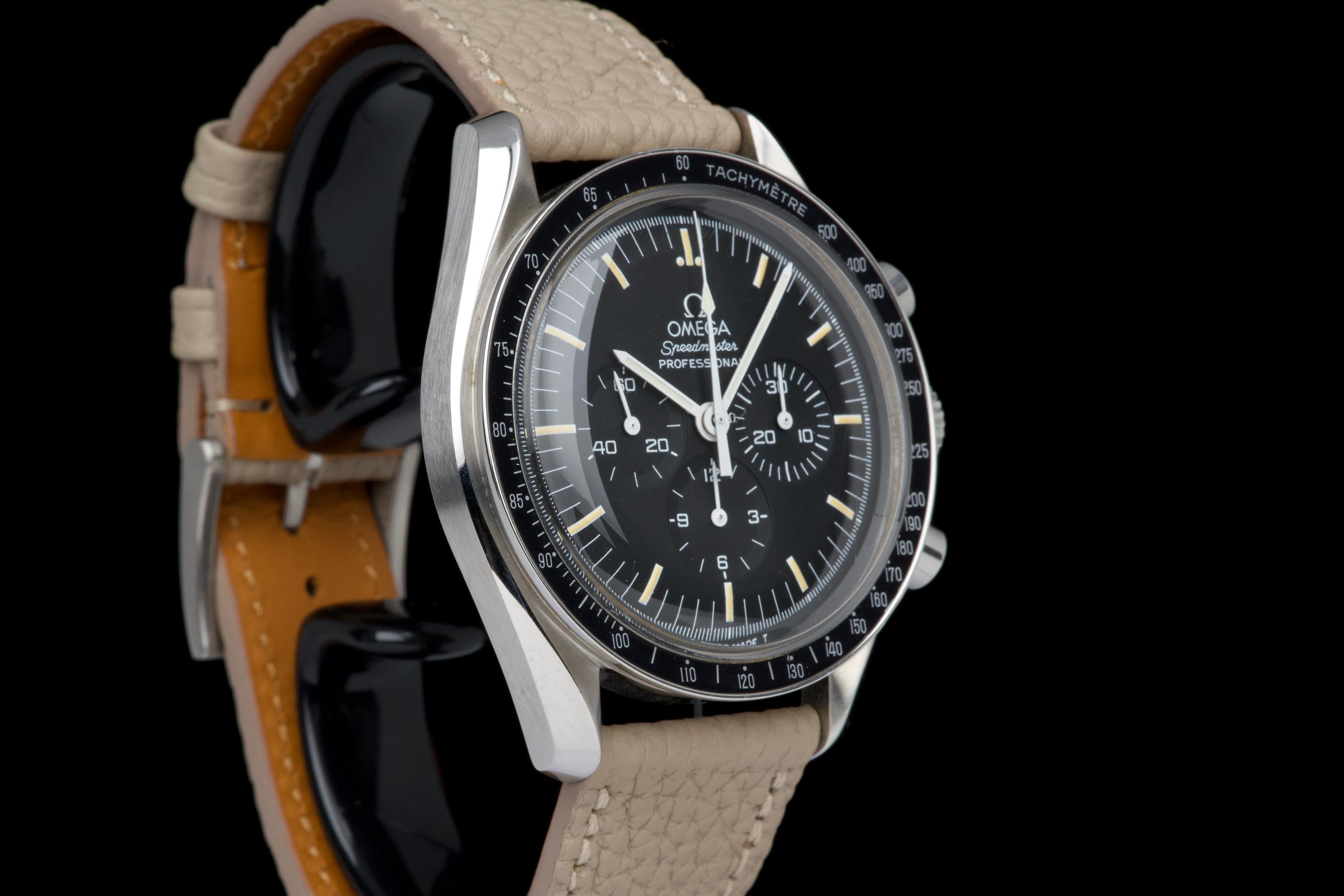 The present Omega Speedmaster Professional, celebrated as the first watch worn on the Moon, reference 145.0022, dating to 1985, is a classic and highly recognizable example of one of the most important chronographs in horological history. Housed in a 42 mm stainless-steel case, the watch is powered by the legendary manual-winding calibre 1861, a direct descendant of the movement family that accompanied NASA astronauts on lunar missions. Renowned for its robustness, reliability, and ease of service, the calibre 1861 represents the modern evolution of Omega’s historic Moonwatch movement. The watch is fitted with its original tritium dial, preserved in excellent condition, and paired with matching tritium hands, resulting in a harmonious and period-correct appearance. The luminous material has aged attractively, enhancing the vintage character of the watch. The case has been polished in the past and now shows only light signs of wear consistent with careful use. The movement is functioning perfectly at the time of cataloguing. For additional peace of mind, the watch is sold with a one-year warranty on proper functioning. Combining historical significance, mechanical purity, and timeless design, this Speedmaster Professional ref. 145.0022 represents an excellent opportunity to acquire a classic Moonwatch from the mid-1980s, offering both collectability and everyday wearability.