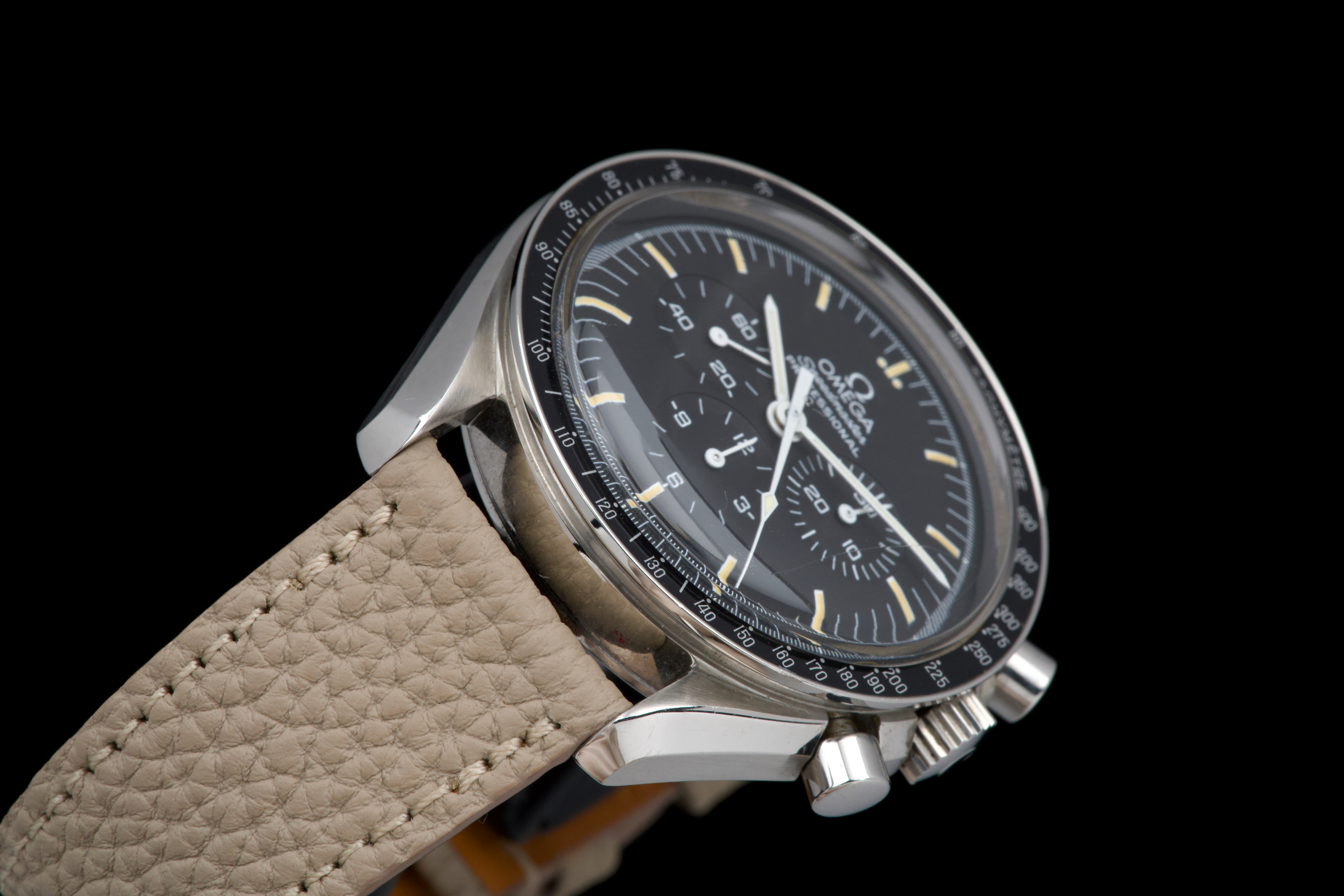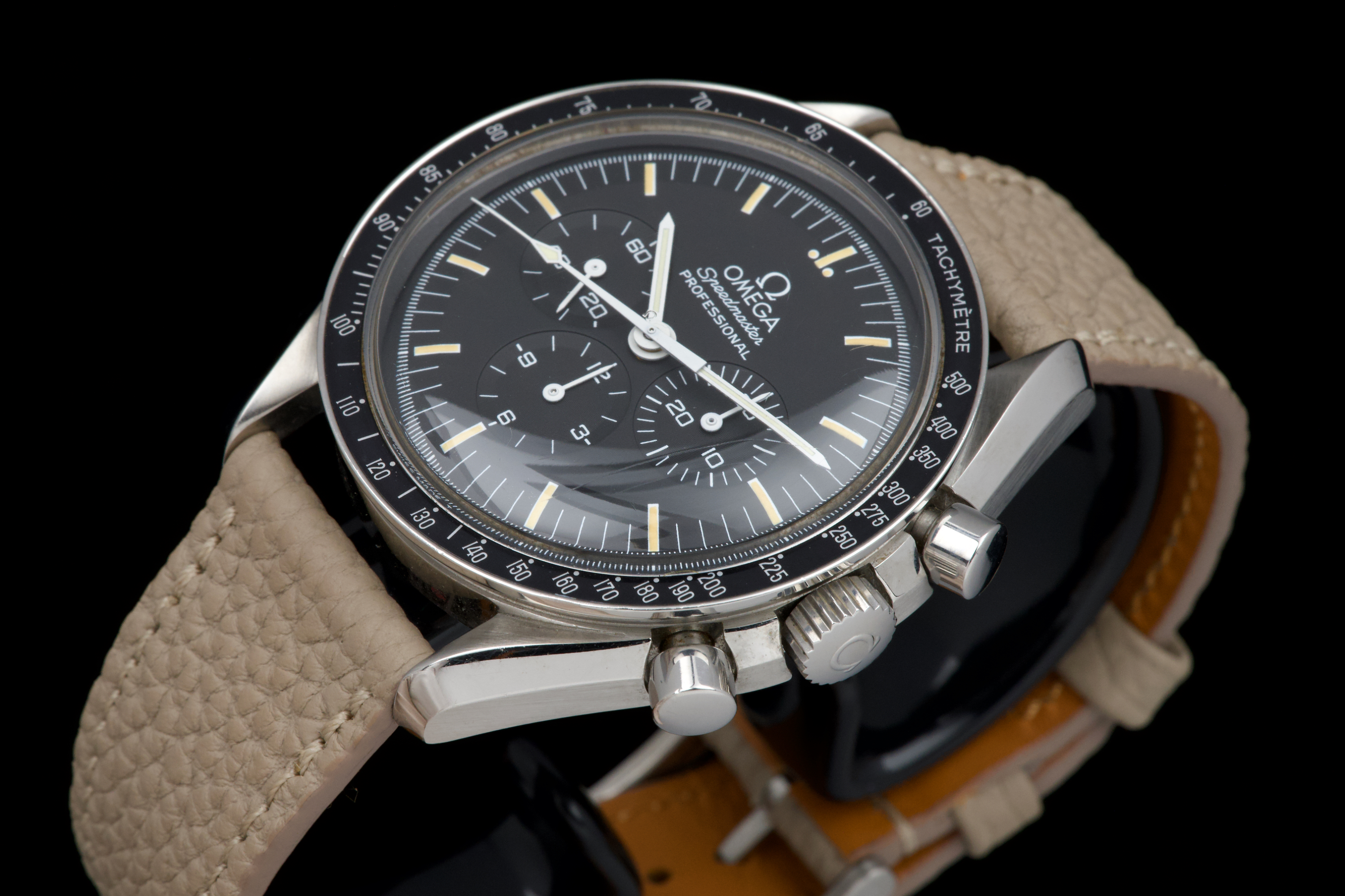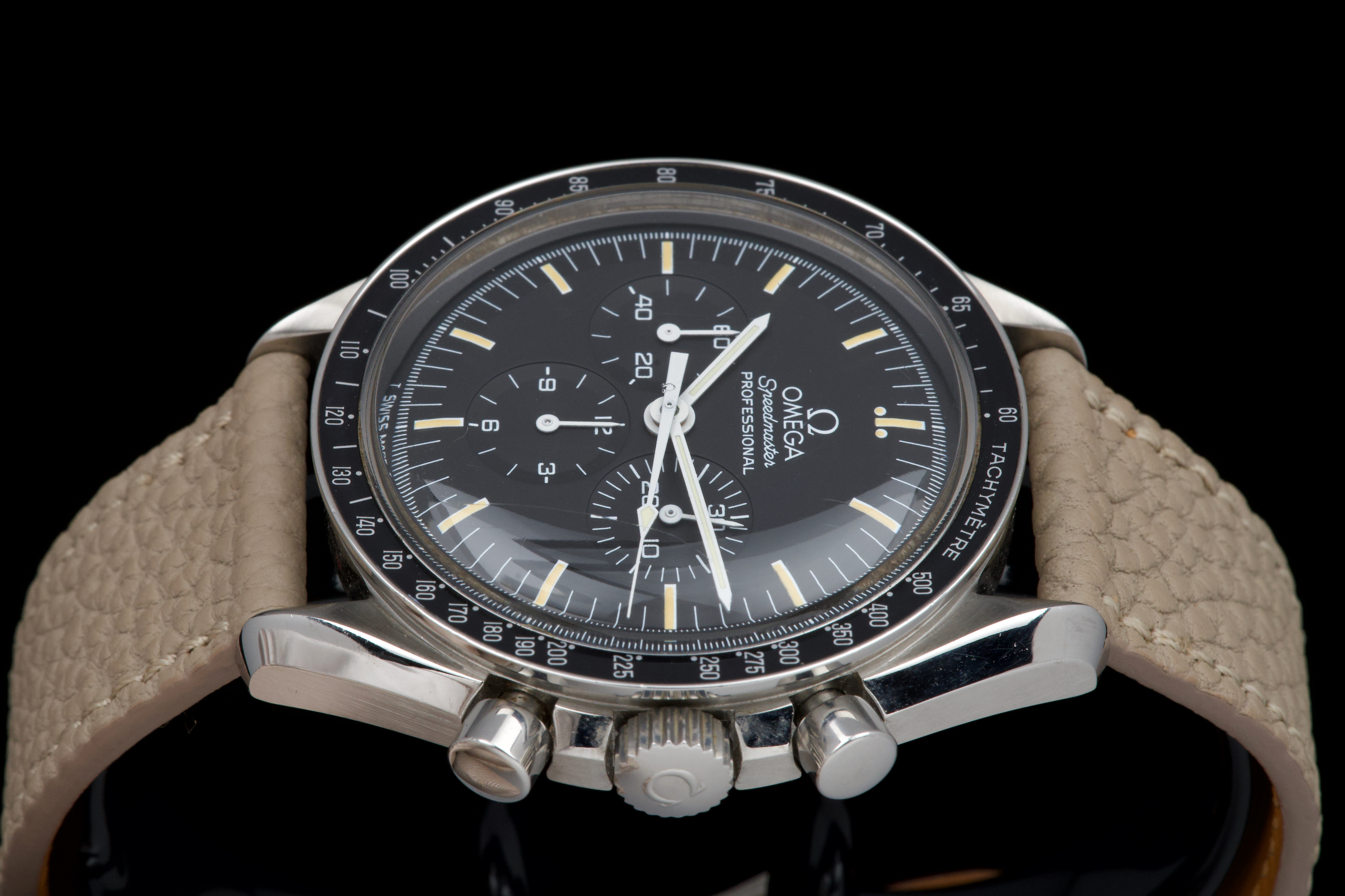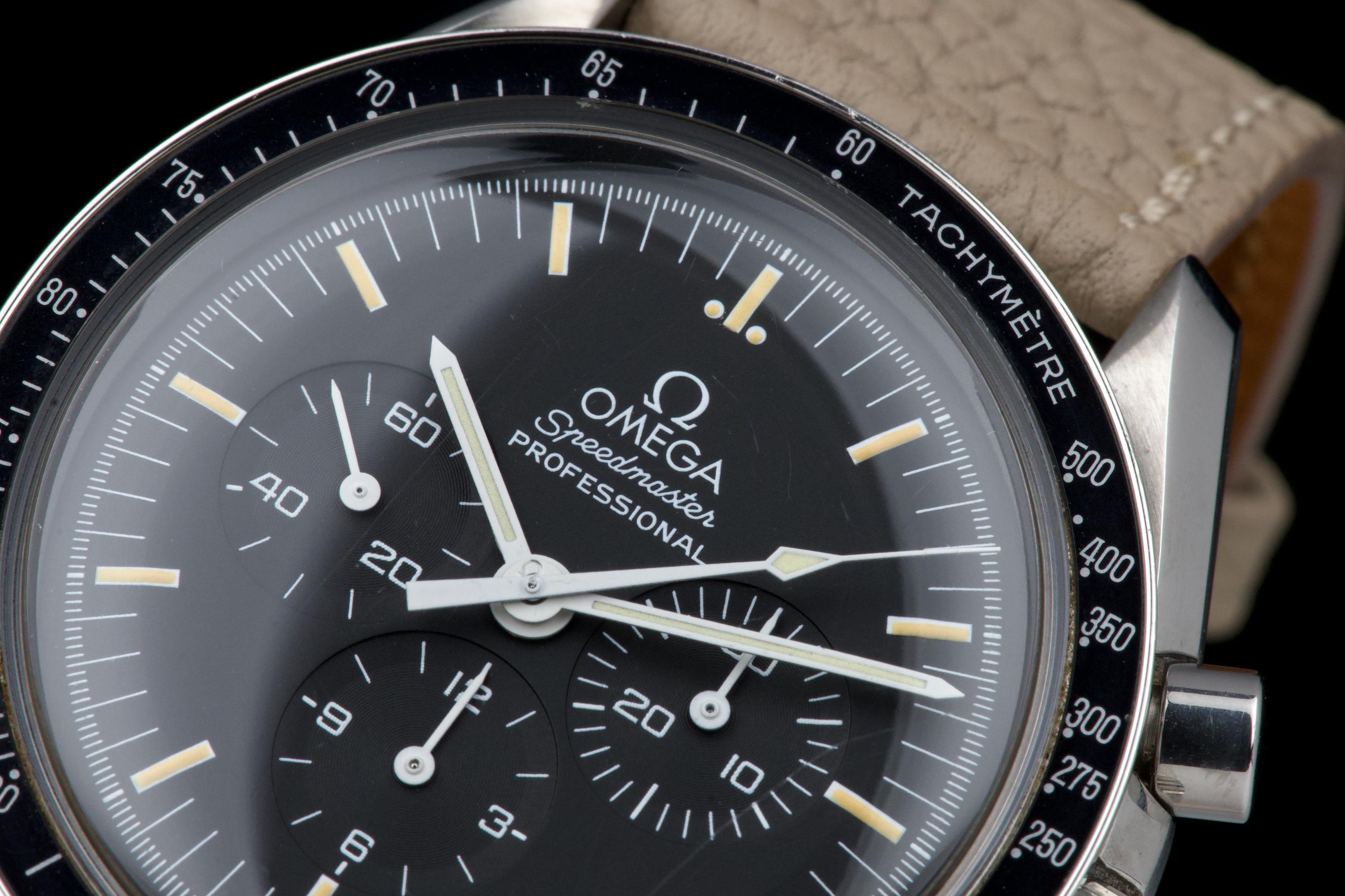 The present Omega Speedmaster Professional, celebrated as the first watch worn on the Moon, reference 145.0022, dating to 1985, is a classic and highly recognizable example of one of the most important chronographs in horological history. Housed in a 42 mm stainless-steel case, the watch is powered by the legendary manual-winding calibre 1861, a direct descendant of the movement family that accompanied NASA astronauts on lunar missions. Renowned for its robustness, reliability, and ease of service, the calibre 1861 represents the modern evolution of Omega’s historic Moonwatch movement. The watch is fitted with its original tritium dial, preserved in excellent condition, and paired with matching tritium hands, resulting in a harmonious and period-correct appearance. The luminous material has aged attractively, enhancing the vintage character of the watch. The case has been polished in the past and now shows only light signs of wear consistent with careful use. The movement is functioning perfectly at the time of cataloguing. For additional peace of mind, the watch is sold with a one-year warranty on proper functioning. Combining historical significance, mechanical purity, and timeless design, this Speedmaster Professional ref. 145.0022 represents an excellent opportunity to acquire a classic Moonwatch from the mid-1980s, offering both collectability and everyday wearability.