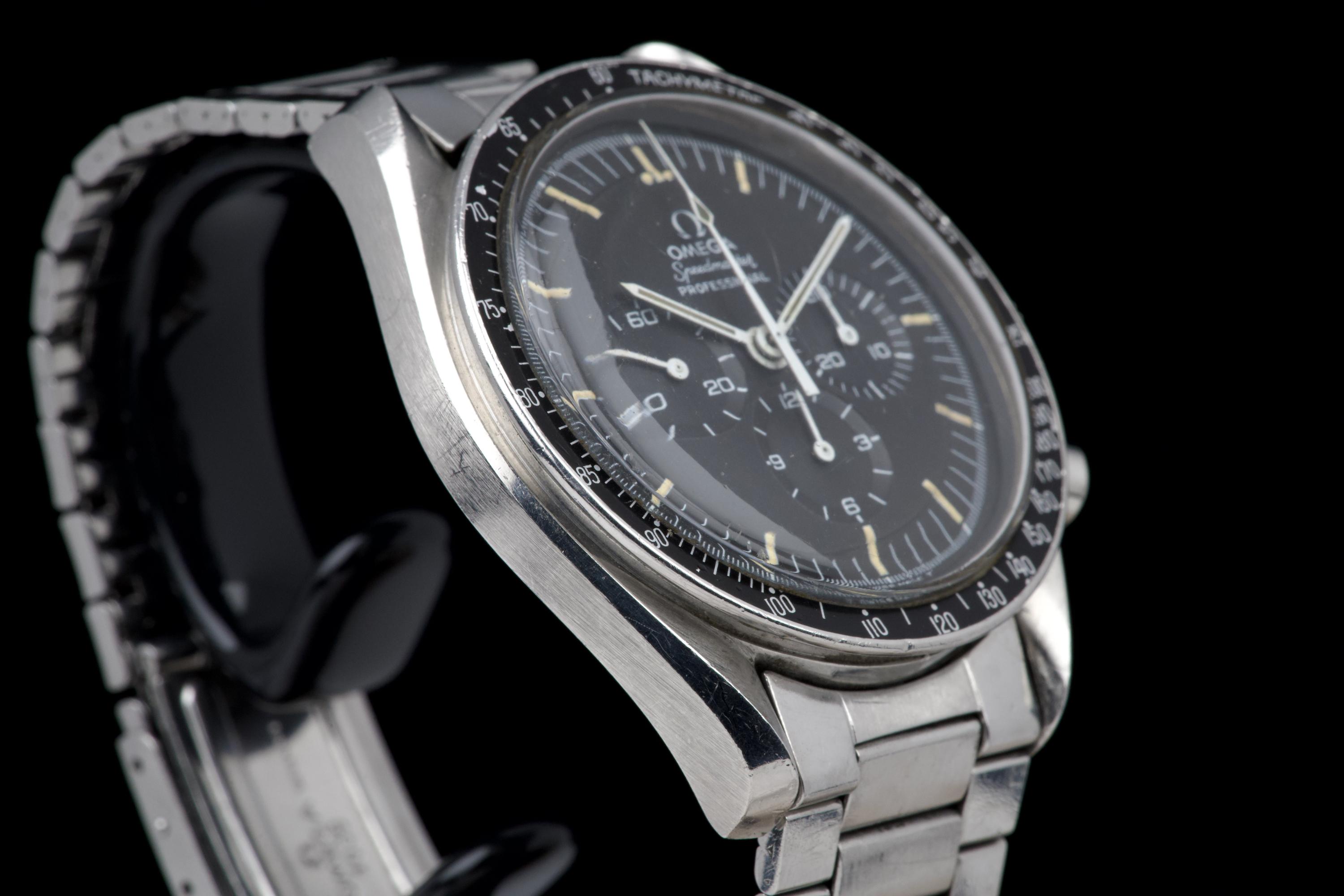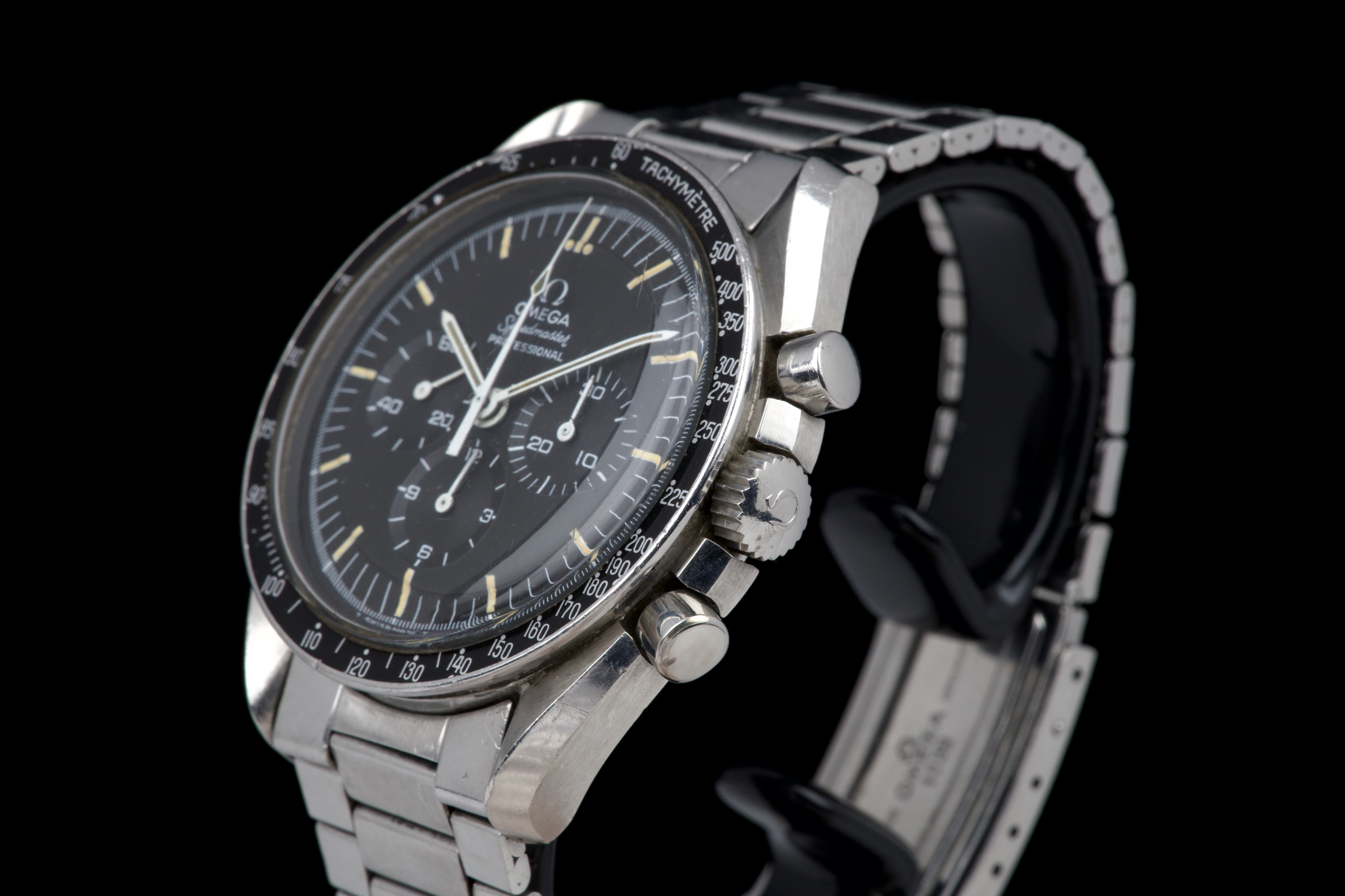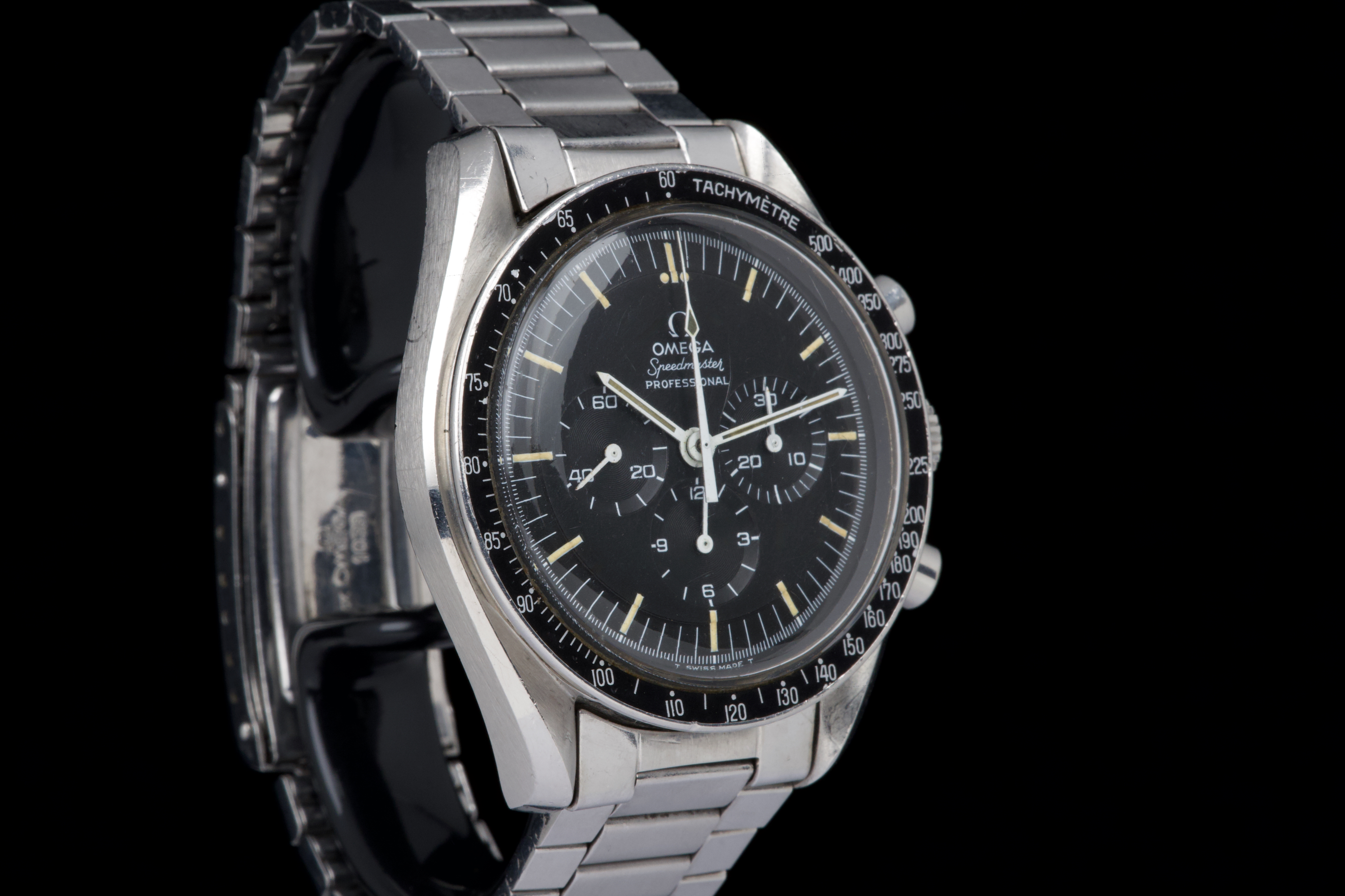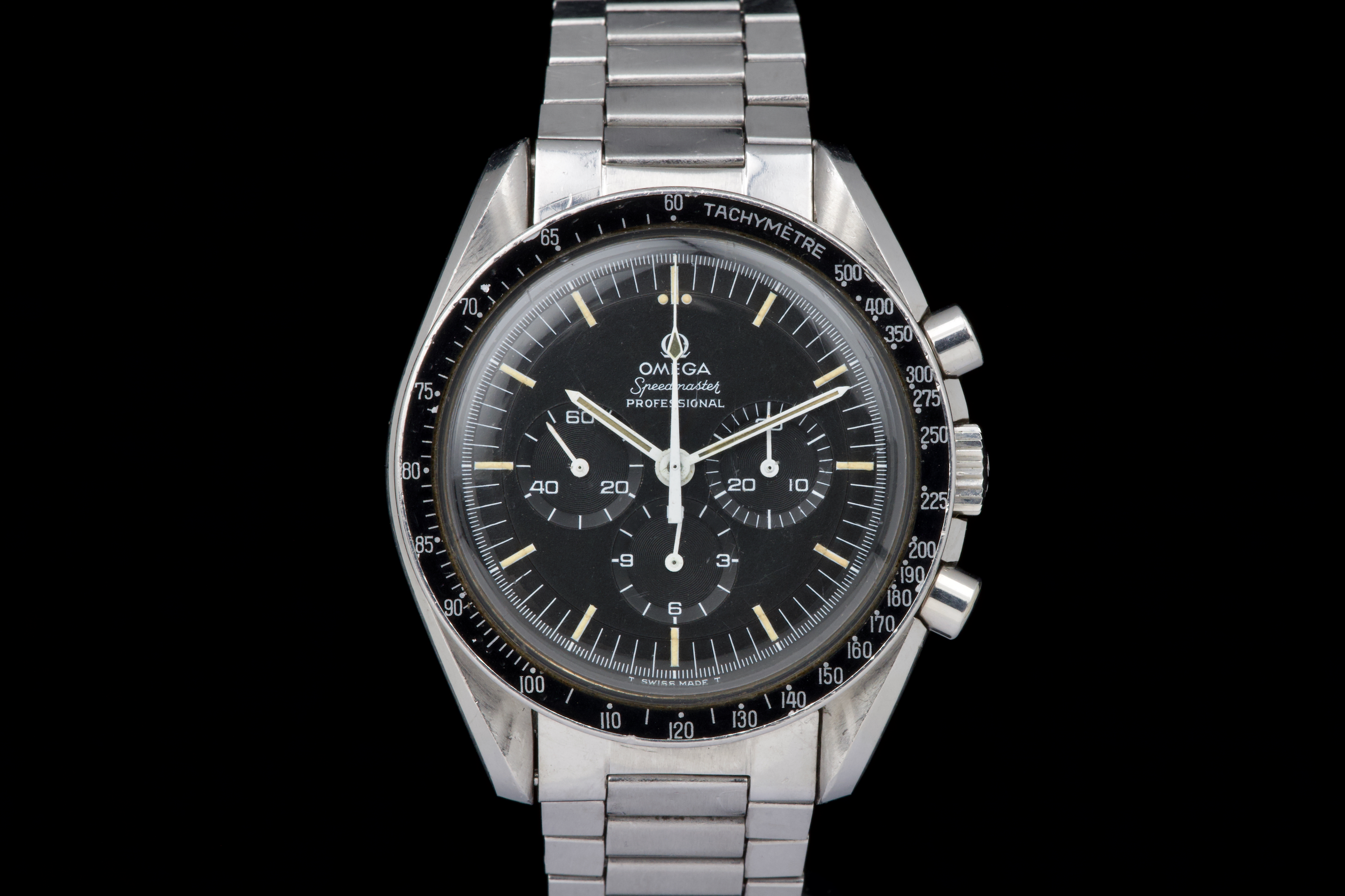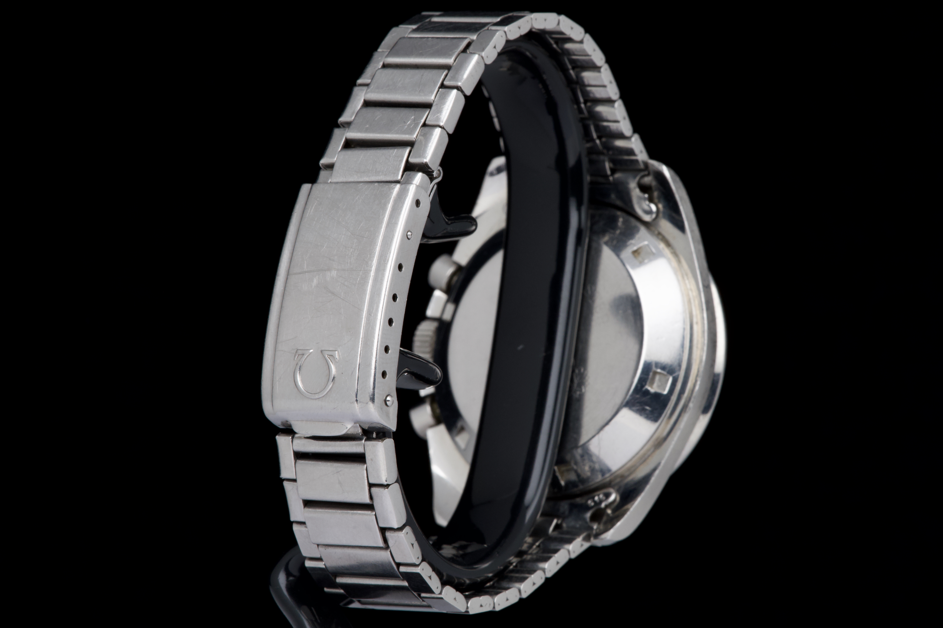 A highly attractive and fully honest example of the 1969 Omega Speedmaster 145.022-69, retaining all of its important original components. The watch is unpolished and shows marks, scratches, and signs of wear consistent with its age, giving it a strong and appealing vintage presence. The original tritium dial has developed a beautiful warm patina, perfectly complemented by matching tritium hands. It features its correct and highly sought-after Dot Over Ninety bezel, along with original pushers, original crown, and the original hesalite crystal with the Omega logo still visible at the center. The watch is fitted with its original 1039 bracelet with 416 endlinks, and the clasp is correctly stamped 4.69. Powered by the Omega caliber 861, the watch has no documented service history but is running properly. A superb, untouched, and collectible example of a late-1960s Moonwatch, exactly as enthusiasts and purists hope to find it.