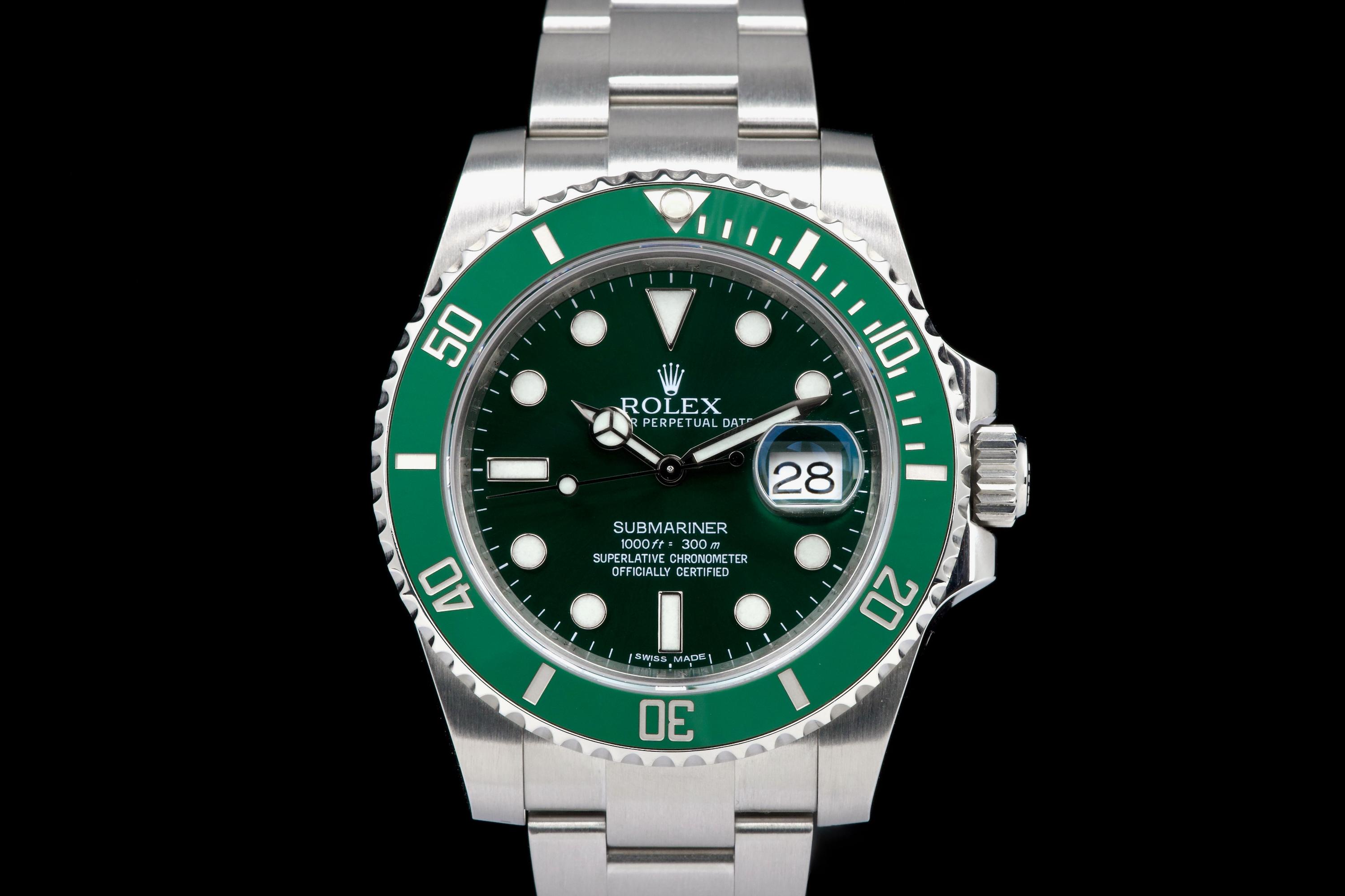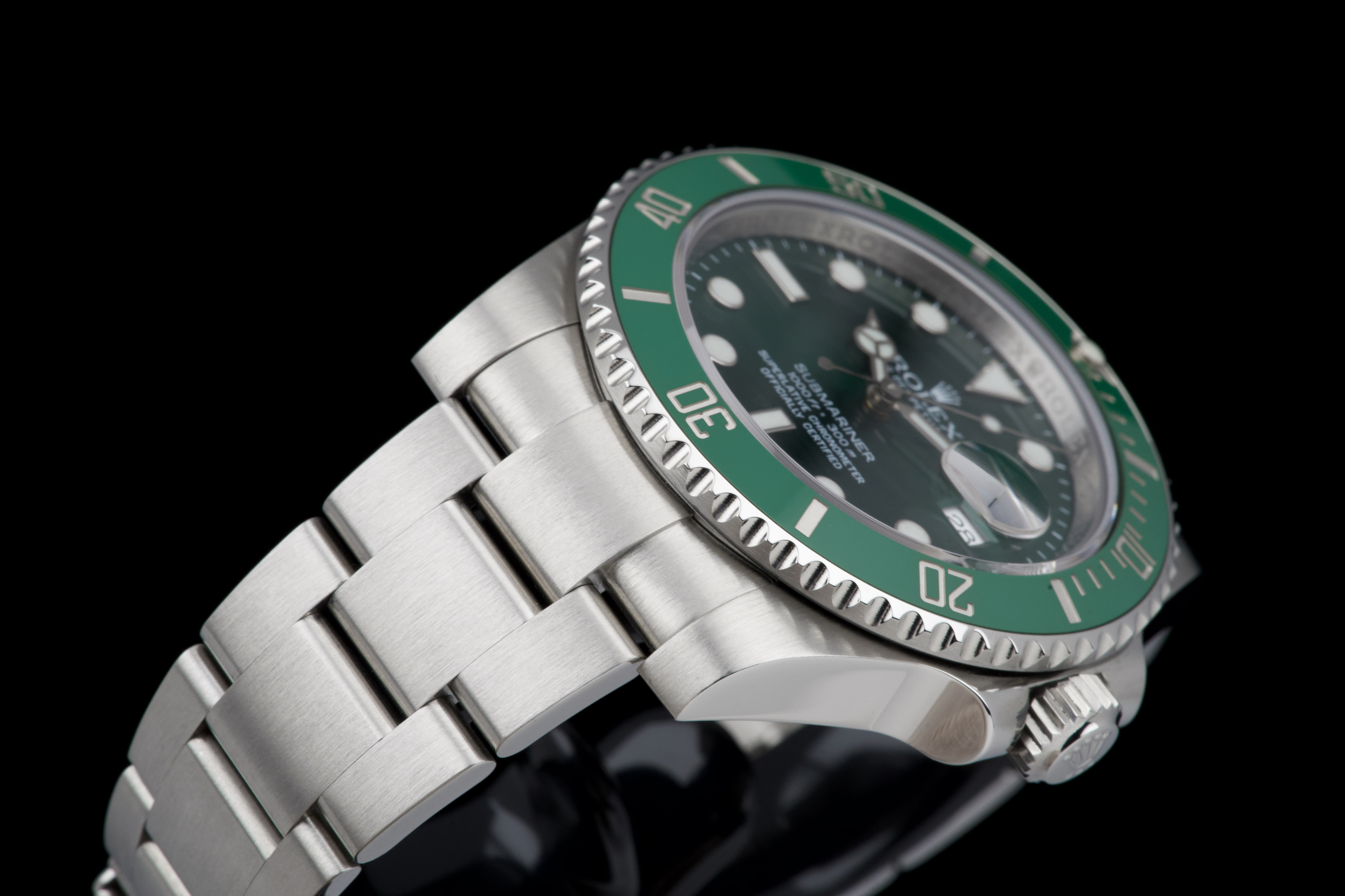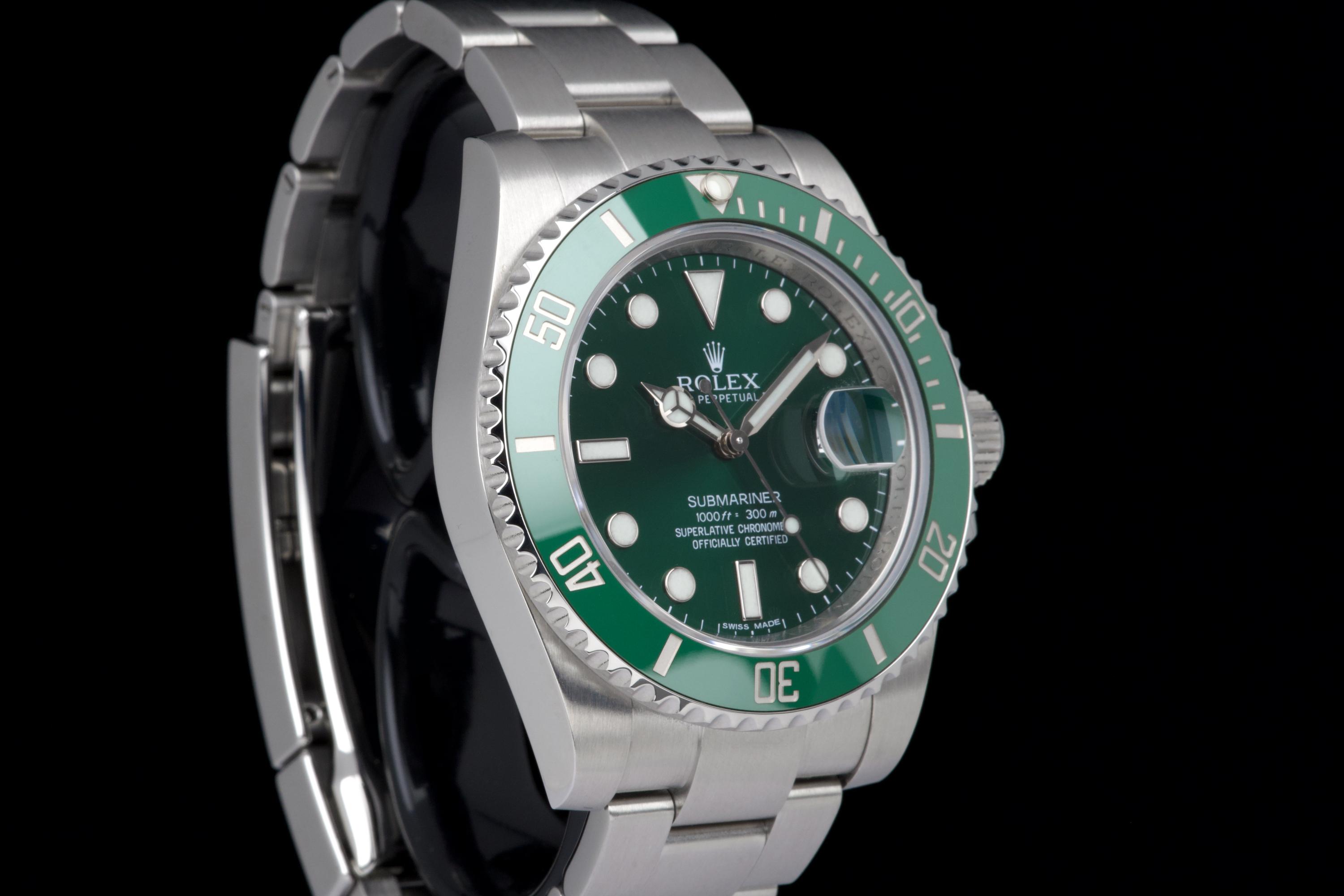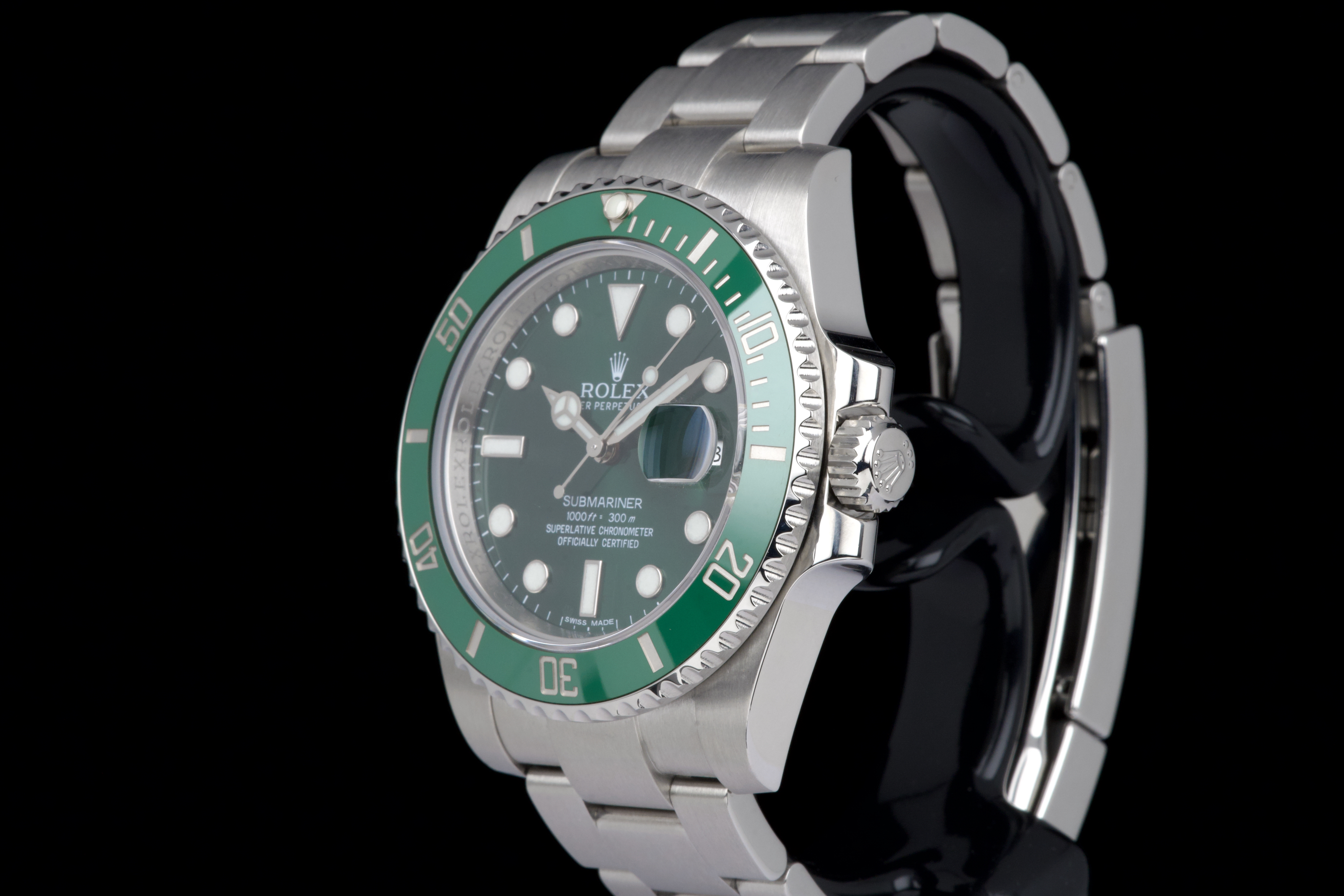 A beautiful example of the iconic Submariner 116610LV, coming from its original owner. The watch has just received its first light polish by our watchmaker and now presents in excellent overall condition. It also comes with a Rolex service card dated January 2023, confirming a factory service at that time (without polishing). Delivered as a full set from 2012, this Hulk features its vibrant green sunburst dial and matching ceramic bezel, both in superb condition. A clean, well-preserved early Hulk with documented service history — an increasingly sought-after modern classic.