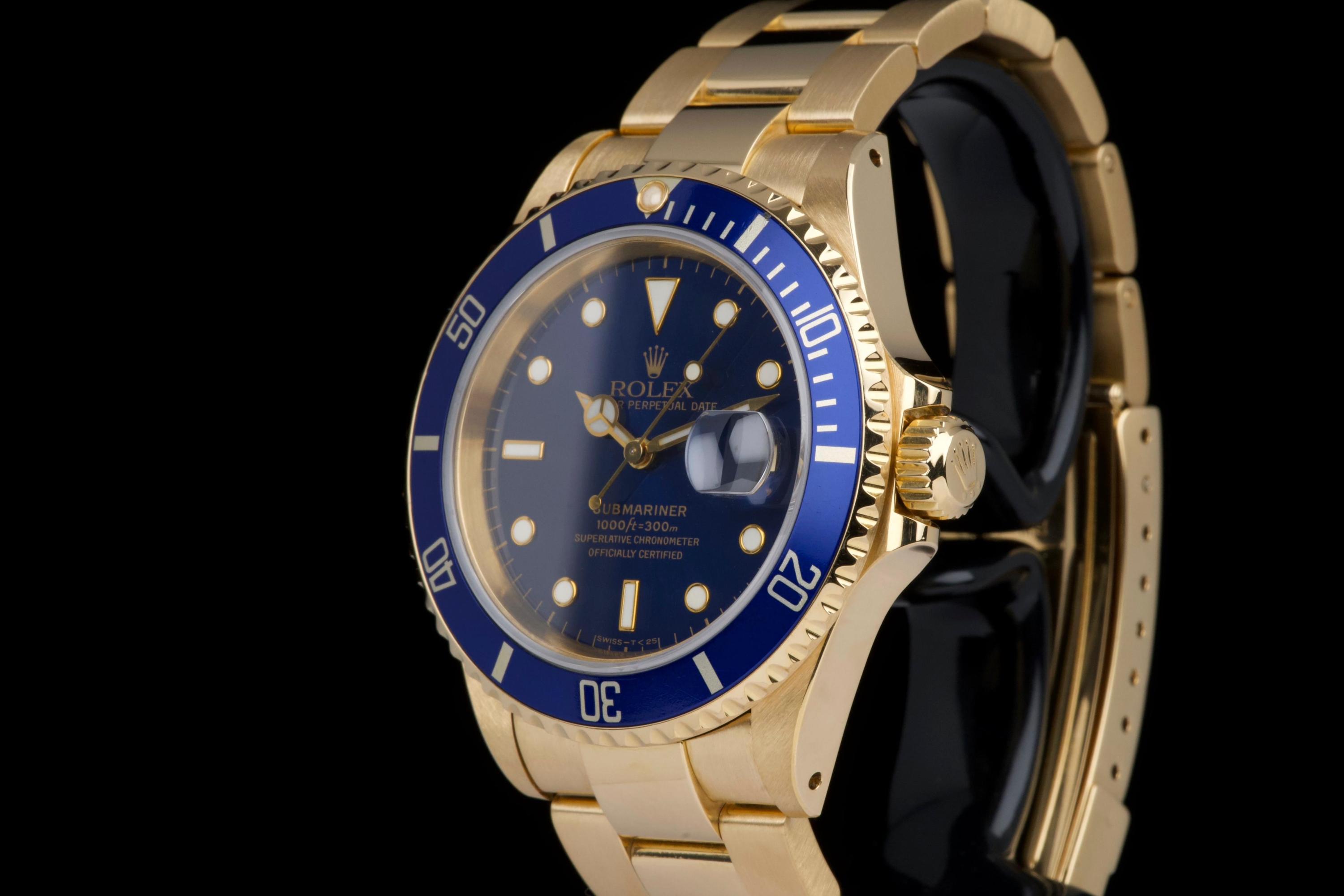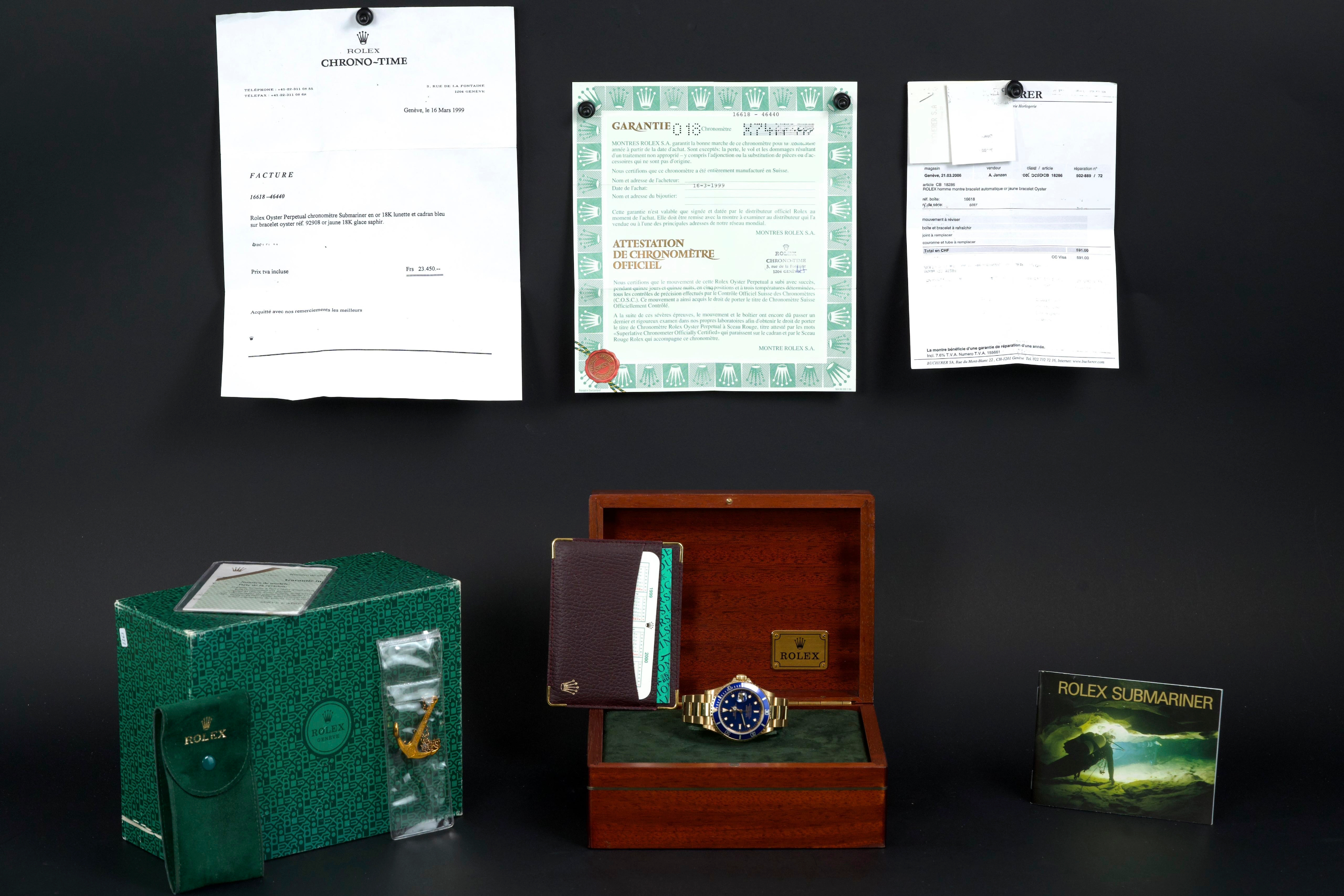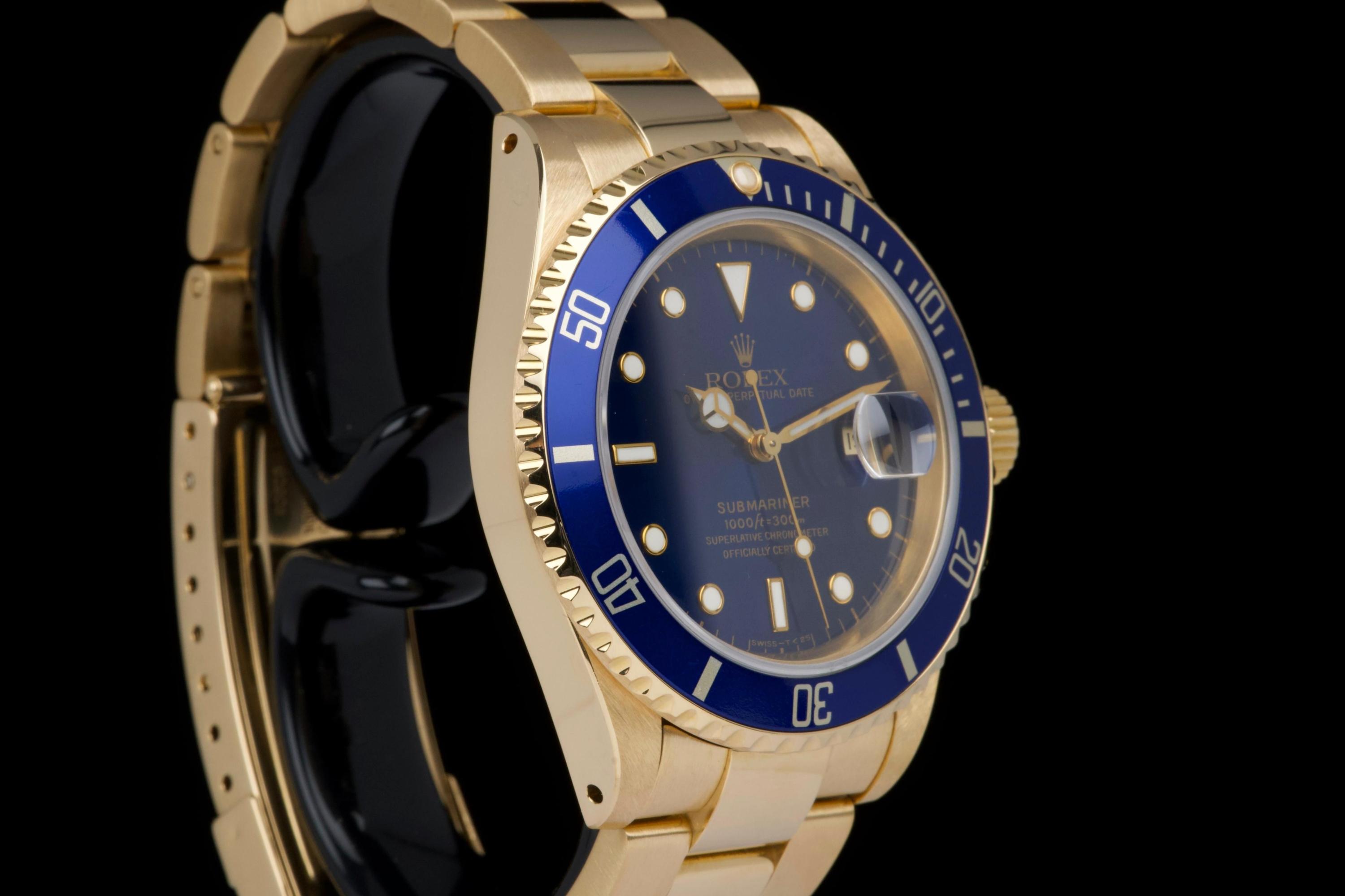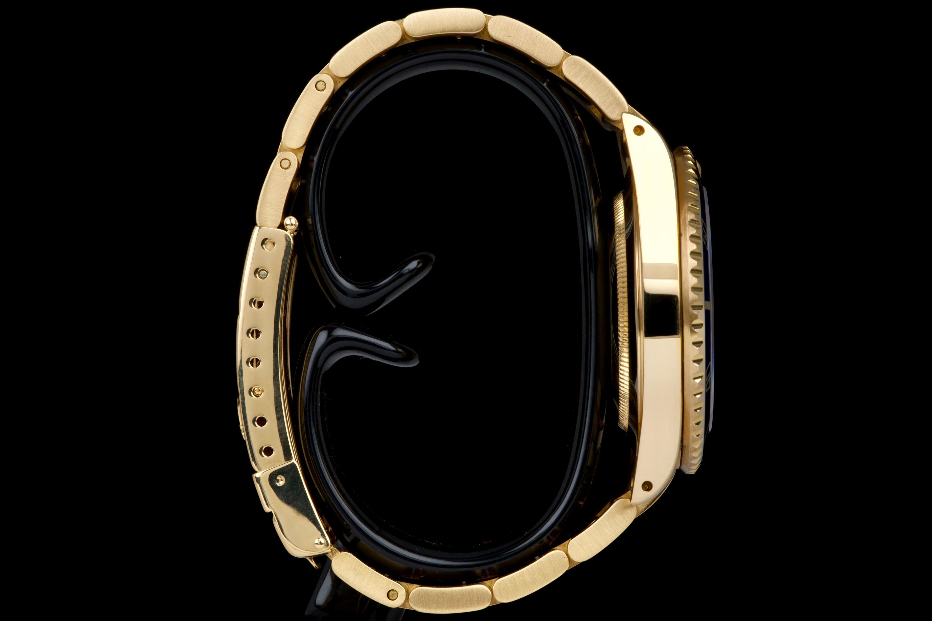 Presented here is a well-preserved example of the Rolex Submariner Date reference 16618, featuring the classic blue dial and matching bezel. Bearing an X serial, the watch was produced in 1991 and originally sold in 1999 by the renowned Chrono-Time boutique in Geneva, with a copy of the original invoice accompanying the watch. This is a one-owner piece, offering clear and documented provenance. The watch is offered with an extensive full set, including the wooden presentation box, outer packaging, anchor, booklets, calendar, original warranty with leather holder, as well as service papers and a Bucherer Geneva invoice dated 2006. Recently serviced and polished by our watchmaker in 2026, the watch presents in excellent overall condition while retaining its original tritium dial and matching hands, along with the original blue bezel insert. The yellow gold Oyster bracelet shows no noticeable stretch from use. A correct and attractive example of a classic gold Submariner, combining honest condition, strong documentation, and appealing completeness.