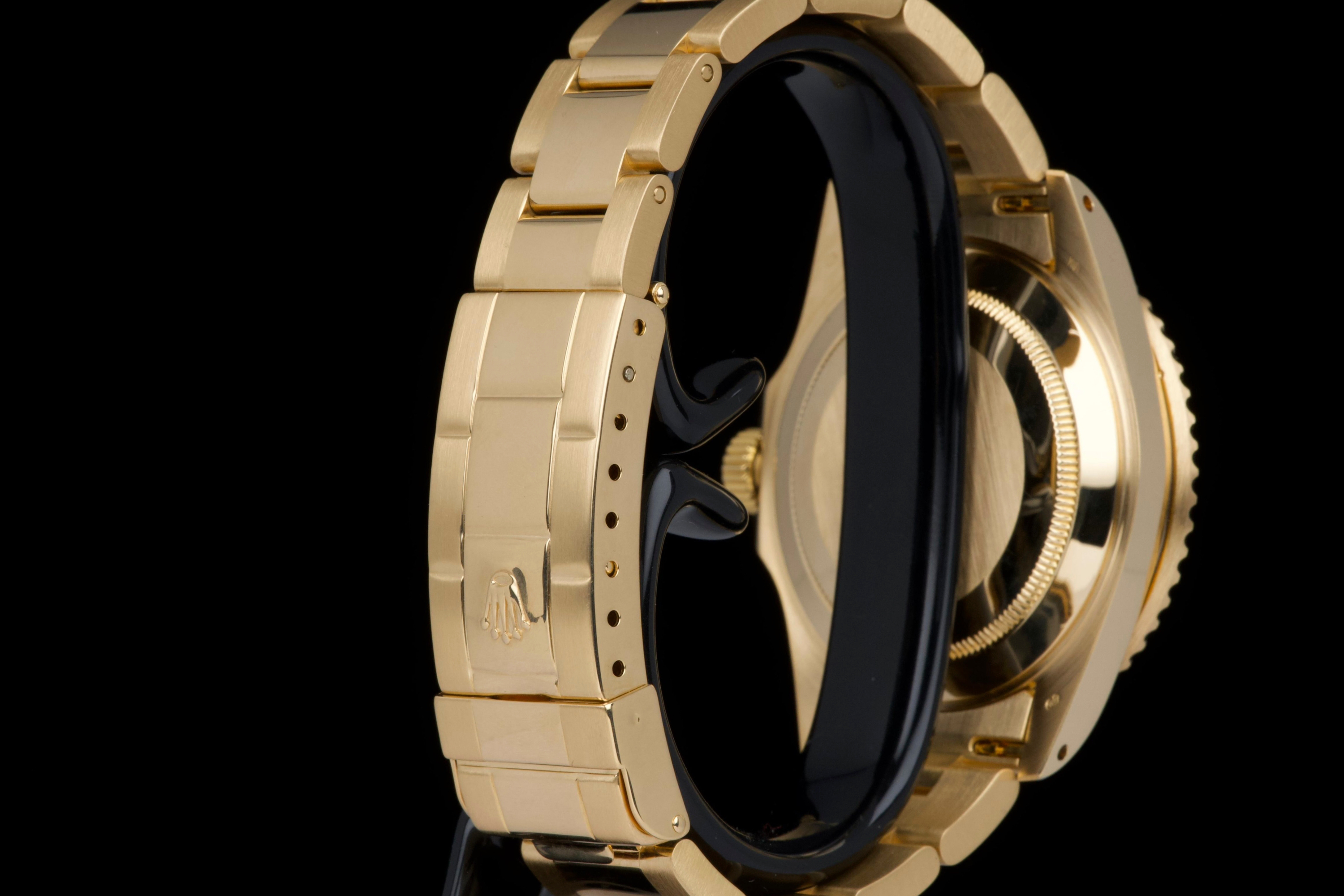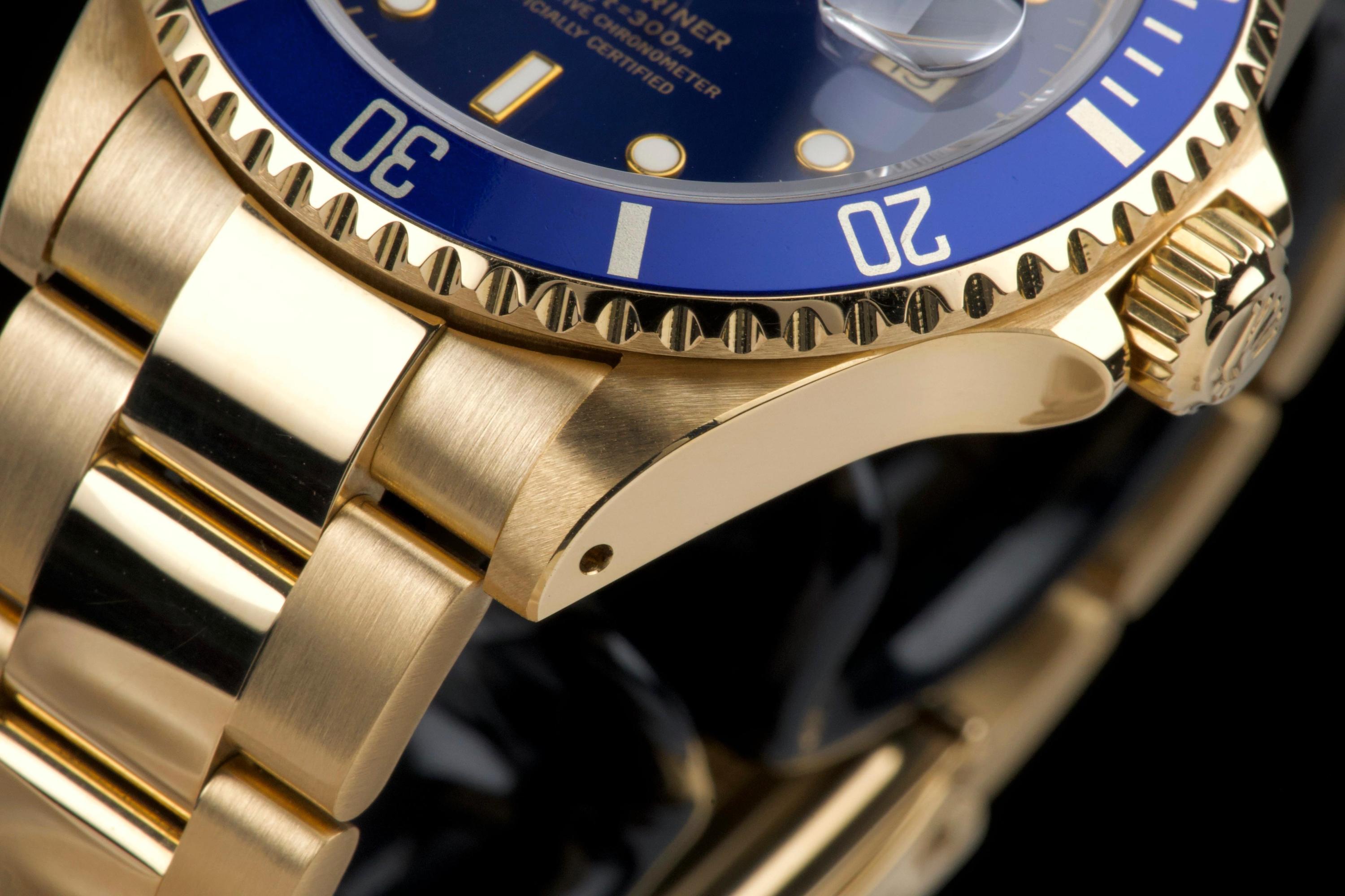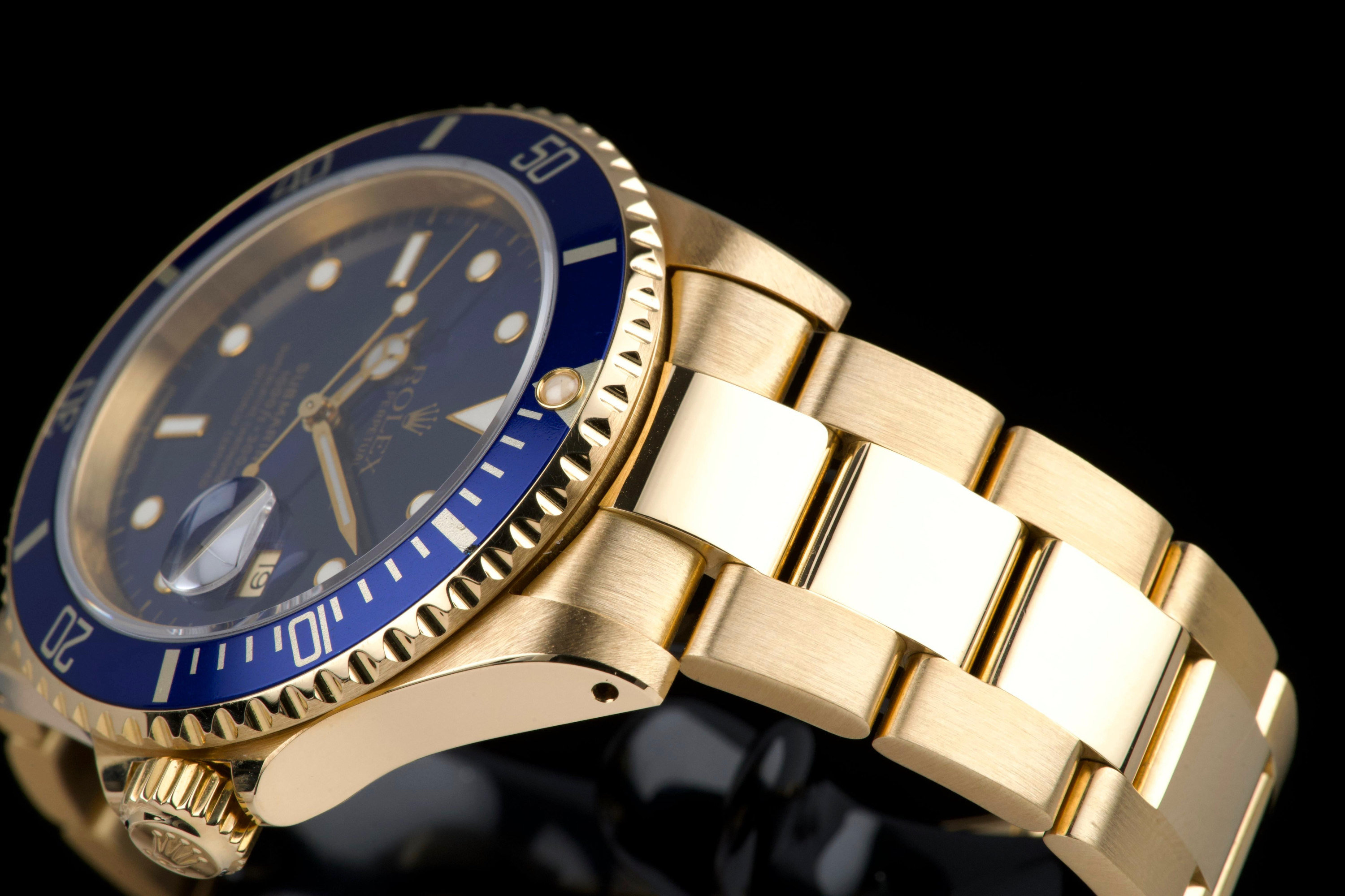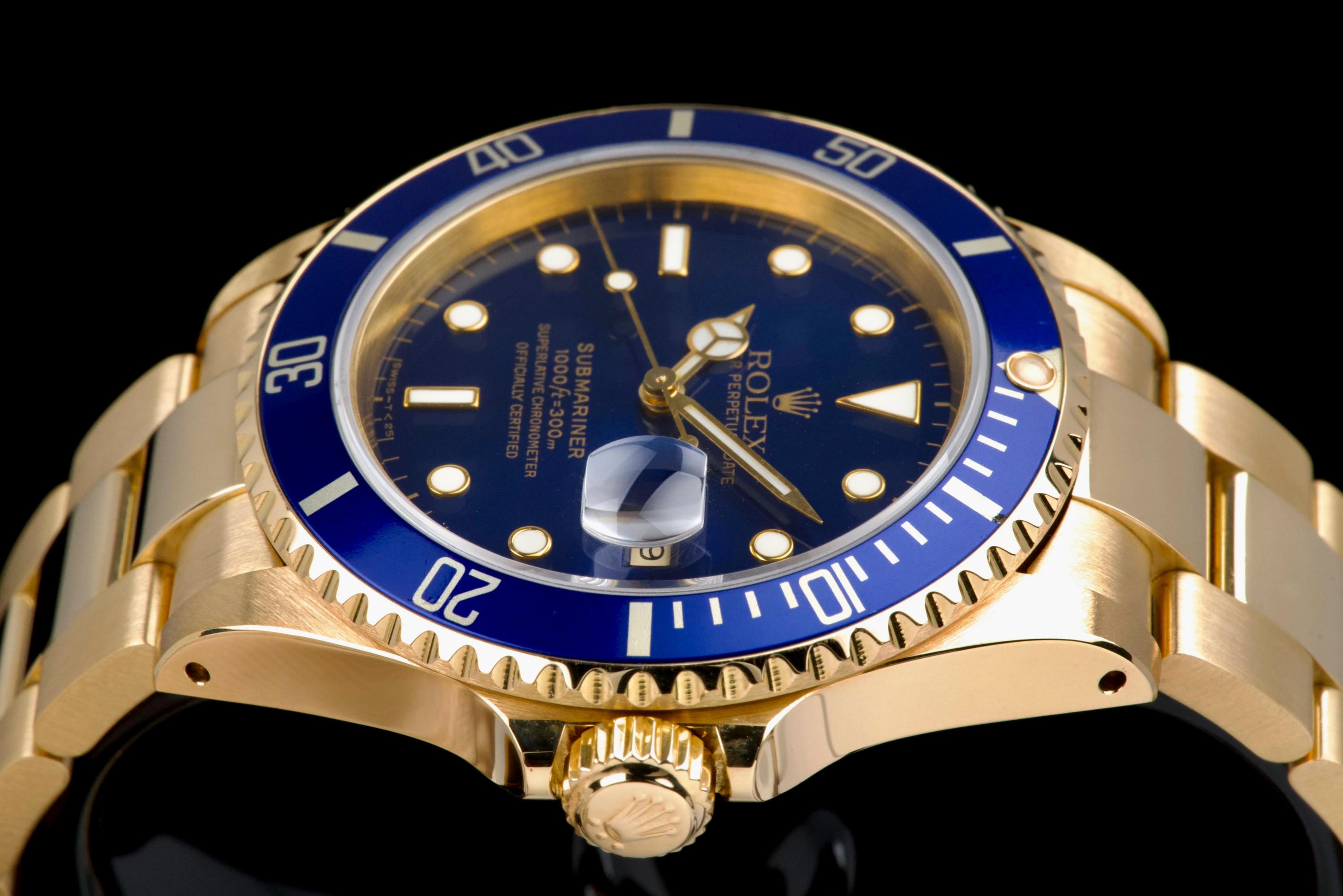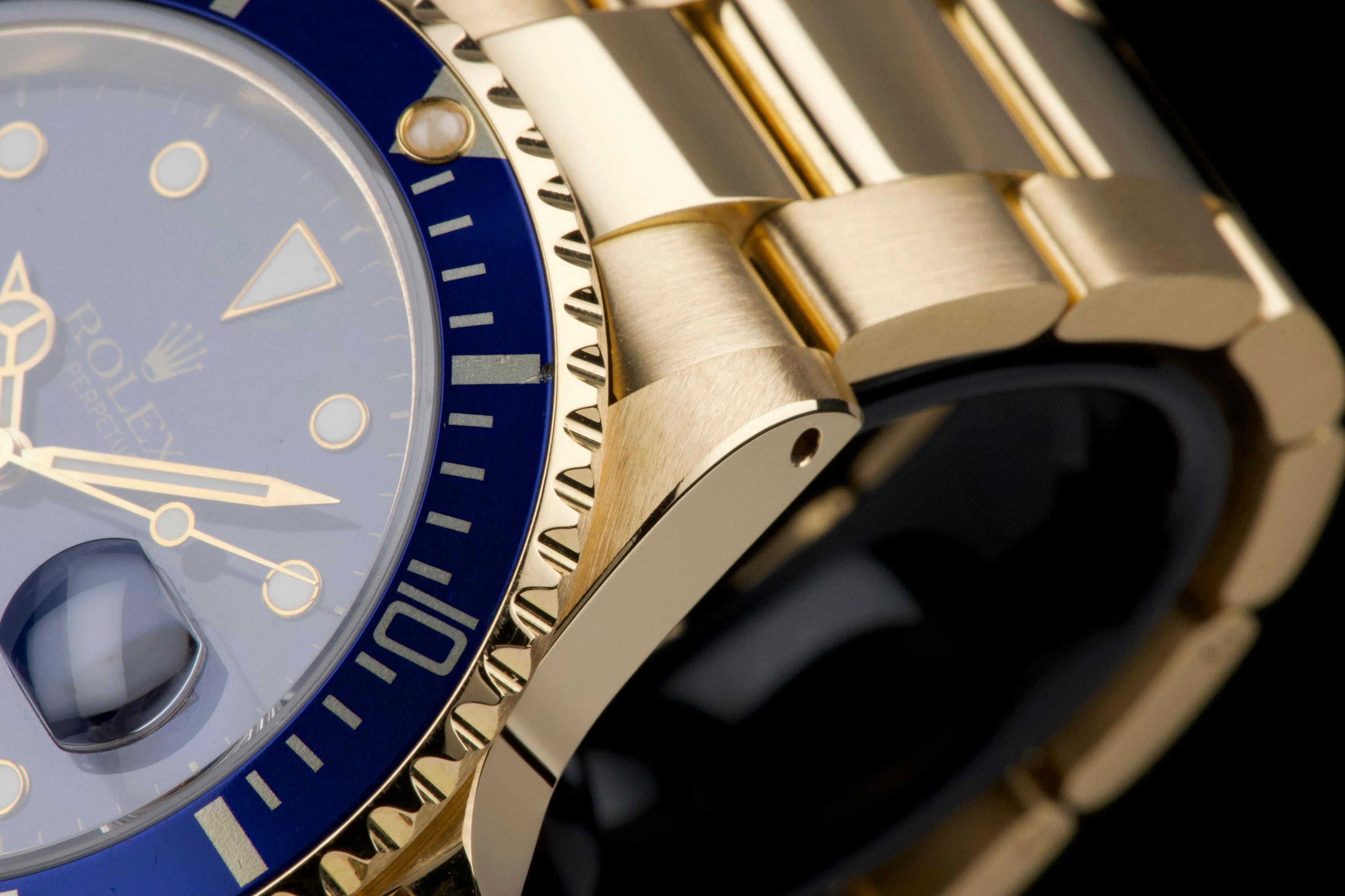 Presented here is a well-preserved example of the Rolex Submariner Date reference 16618, featuring the classic blue dial and matching bezel. Bearing an X serial, the watch was produced in 1991 and originally sold in 1999 by the renowned Chrono-Time boutique in Geneva, with a copy of the original invoice accompanying the watch. This is a one-owner piece, offering clear and documented provenance. The watch is offered with an extensive full set, including the wooden presentation box, outer packaging, anchor, booklets, calendar, original warranty with leather holder, as well as service papers and a Bucherer Geneva invoice dated 2006. Recently serviced and polished by our watchmaker in 2026, the watch presents in excellent overall condition while retaining its original tritium dial and matching hands, along with the original blue bezel insert. The yellow gold Oyster bracelet shows no noticeable stretch from use. A correct and attractive example of a classic gold Submariner, combining honest condition, strong documentation, and appealing completeness.