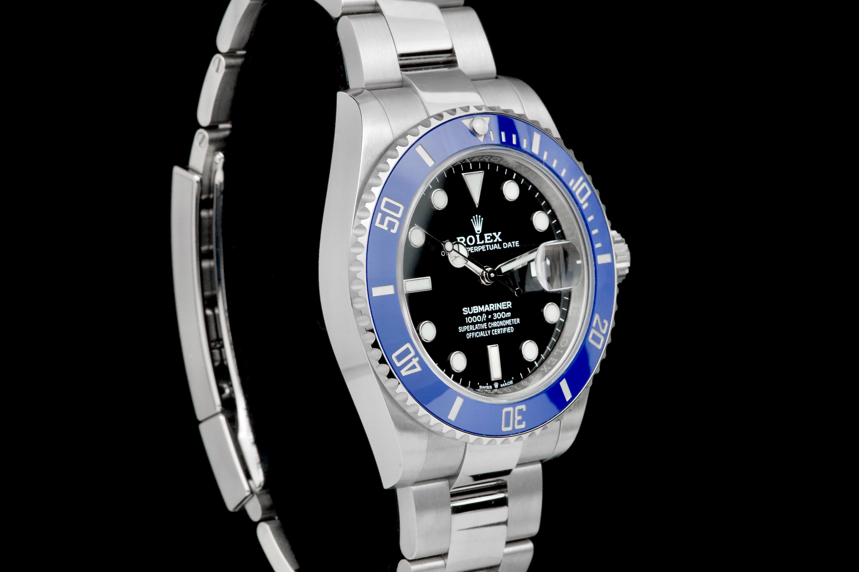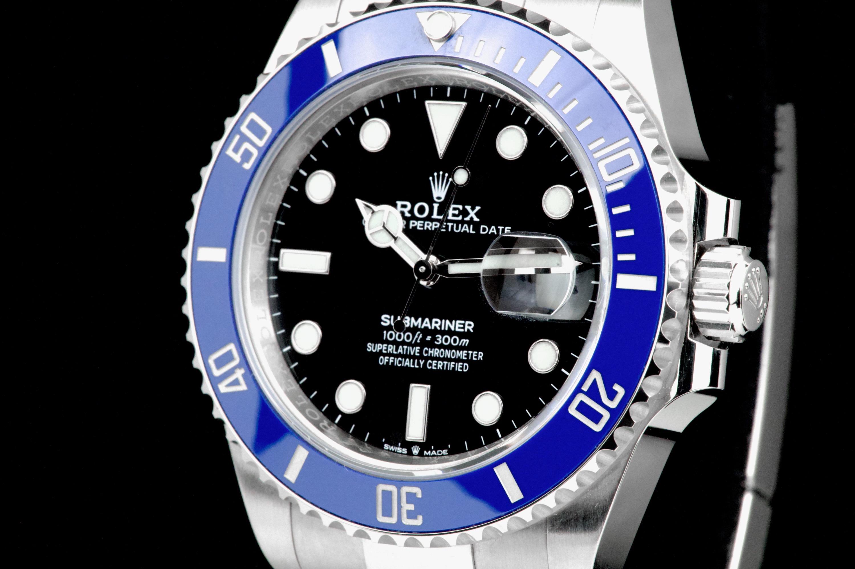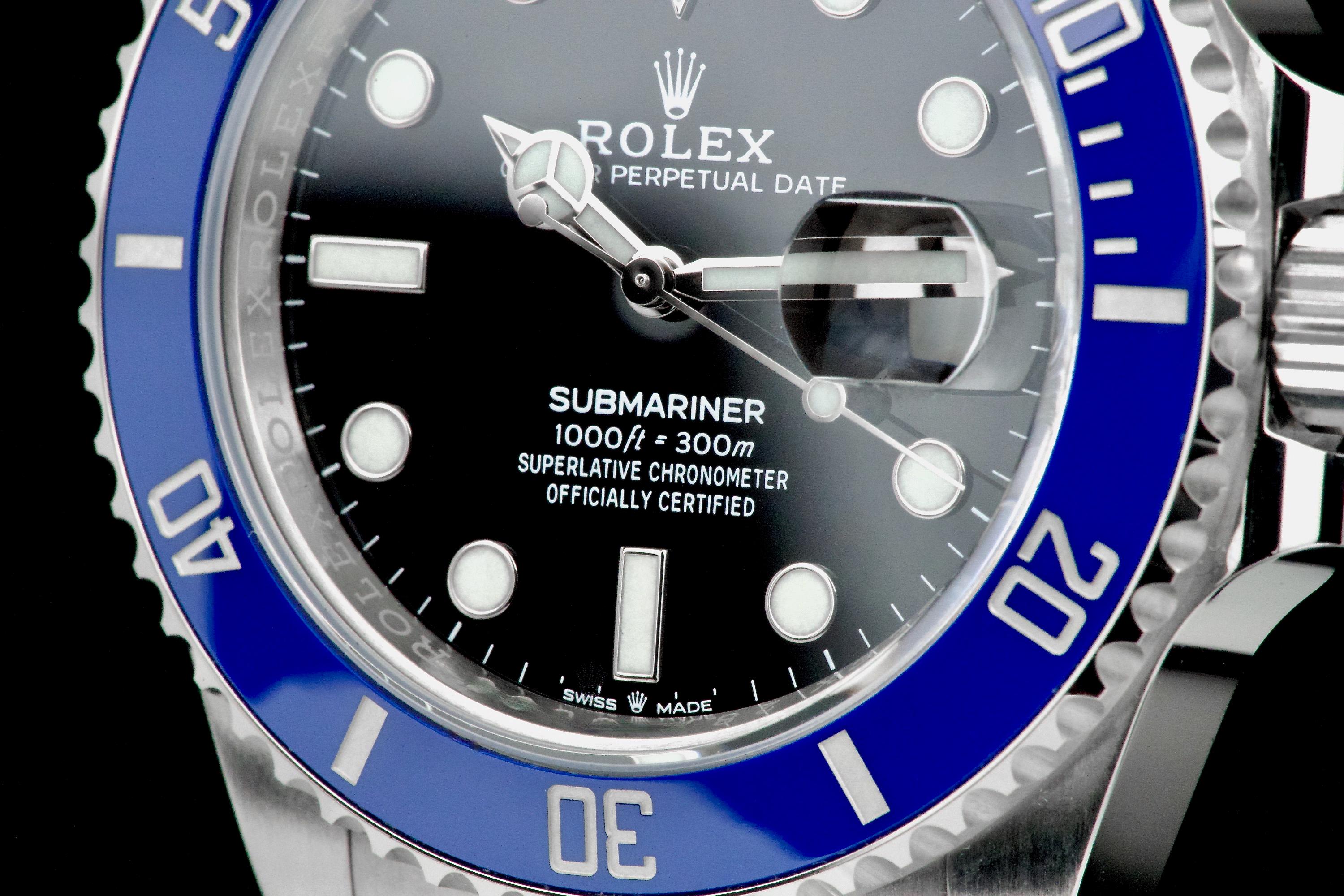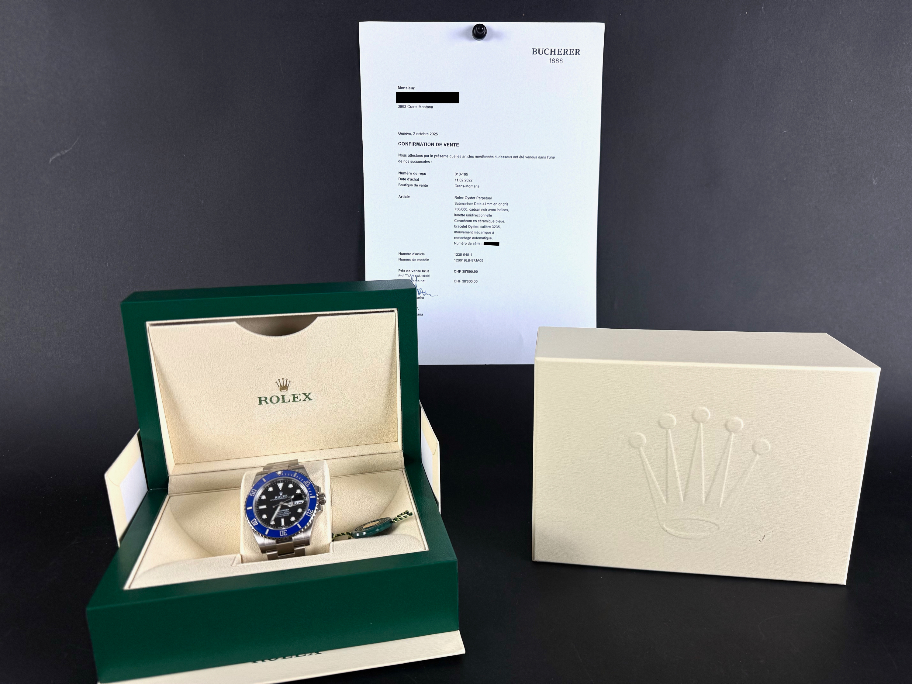 A beautiful example of the white gold Submariner Date 126619LB, coming from its first and only owner. Originally sold by Bucherer Crans-Montana in February 2022, as confirmed by the included Bucherer sales document. The watch has been professionally polished by our watchmaker and is now presented in excellent overall condition. The blue Cerachrom bezel and black dial remain pristine and vibrant. Powered by the automatic Rolex caliber 3235 with 70-hour power reserve and Chronergy escapement, the movement is in perfect working order. The watch comes with its original Rolex box but no warranty card. An elegant and highly desirable version of the modern white gold Submariner, combining exceptional condition, confirmed provenance, and superb wrist presence.