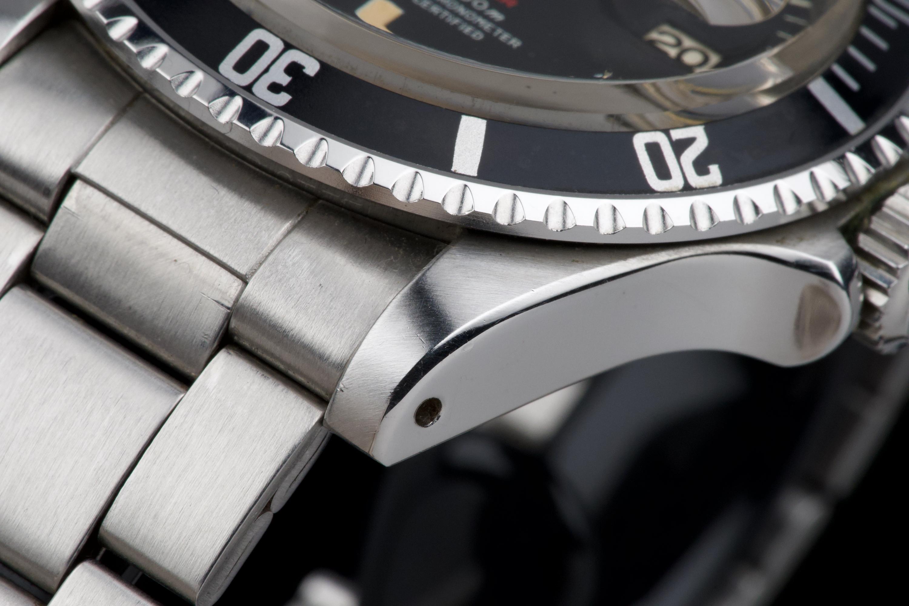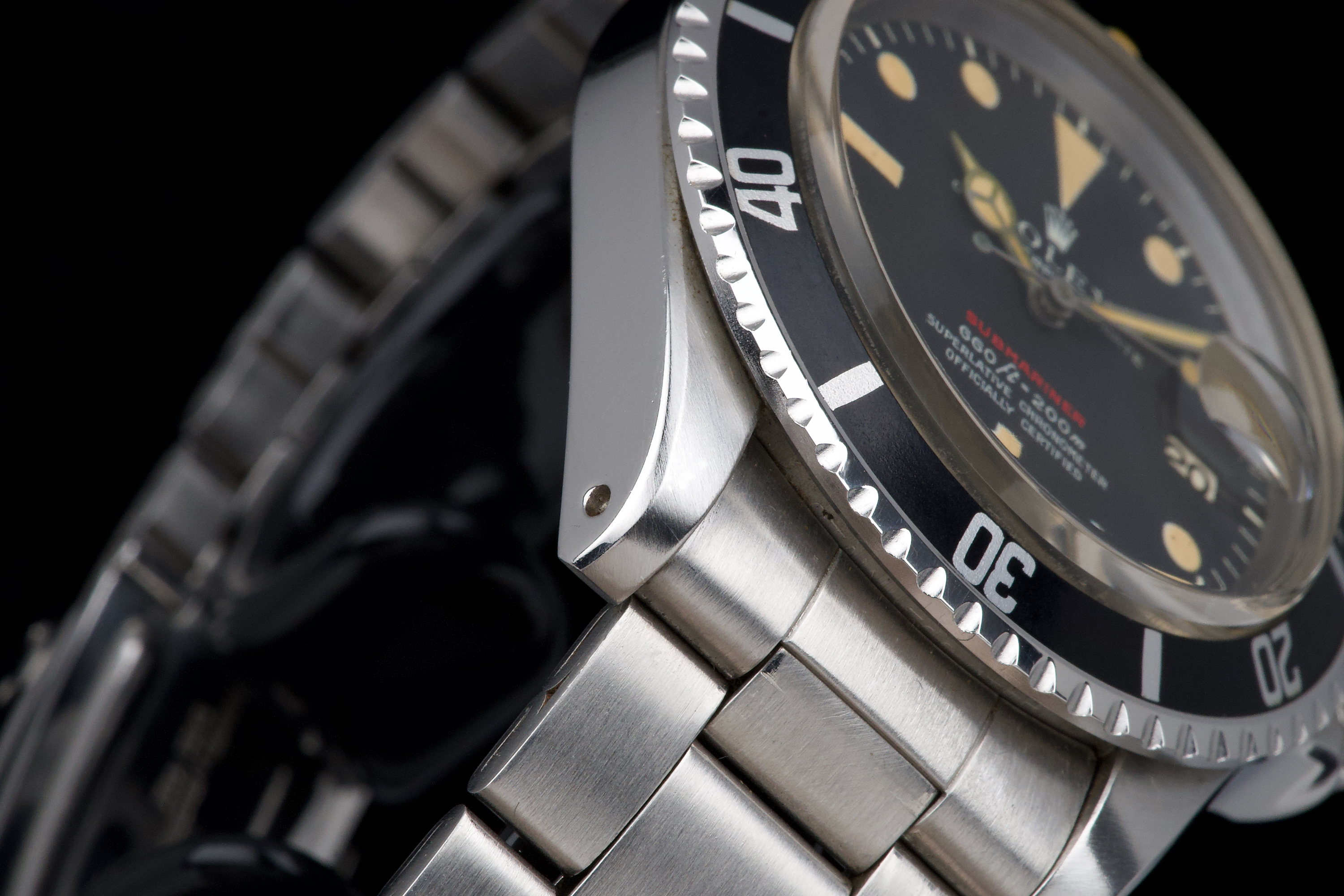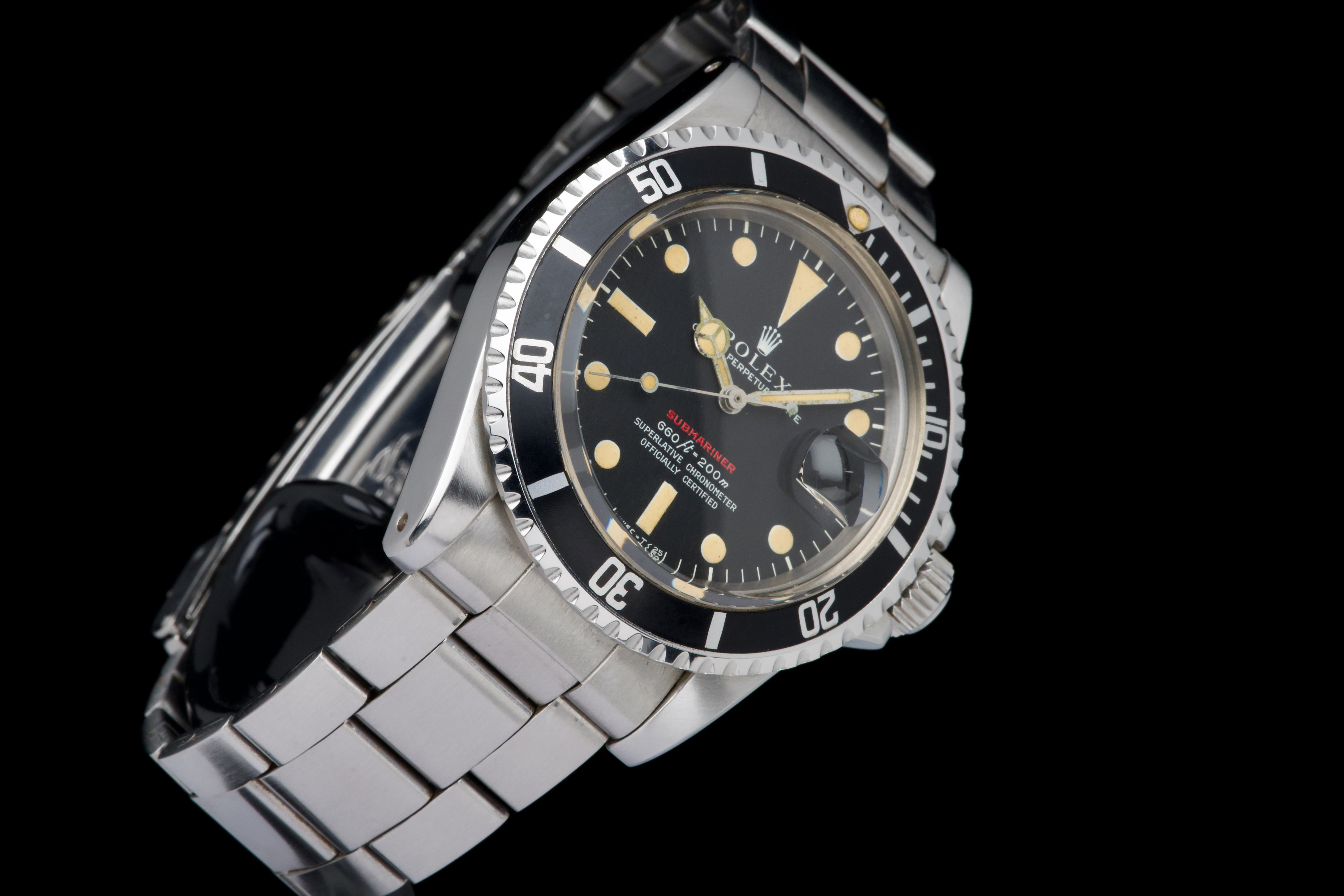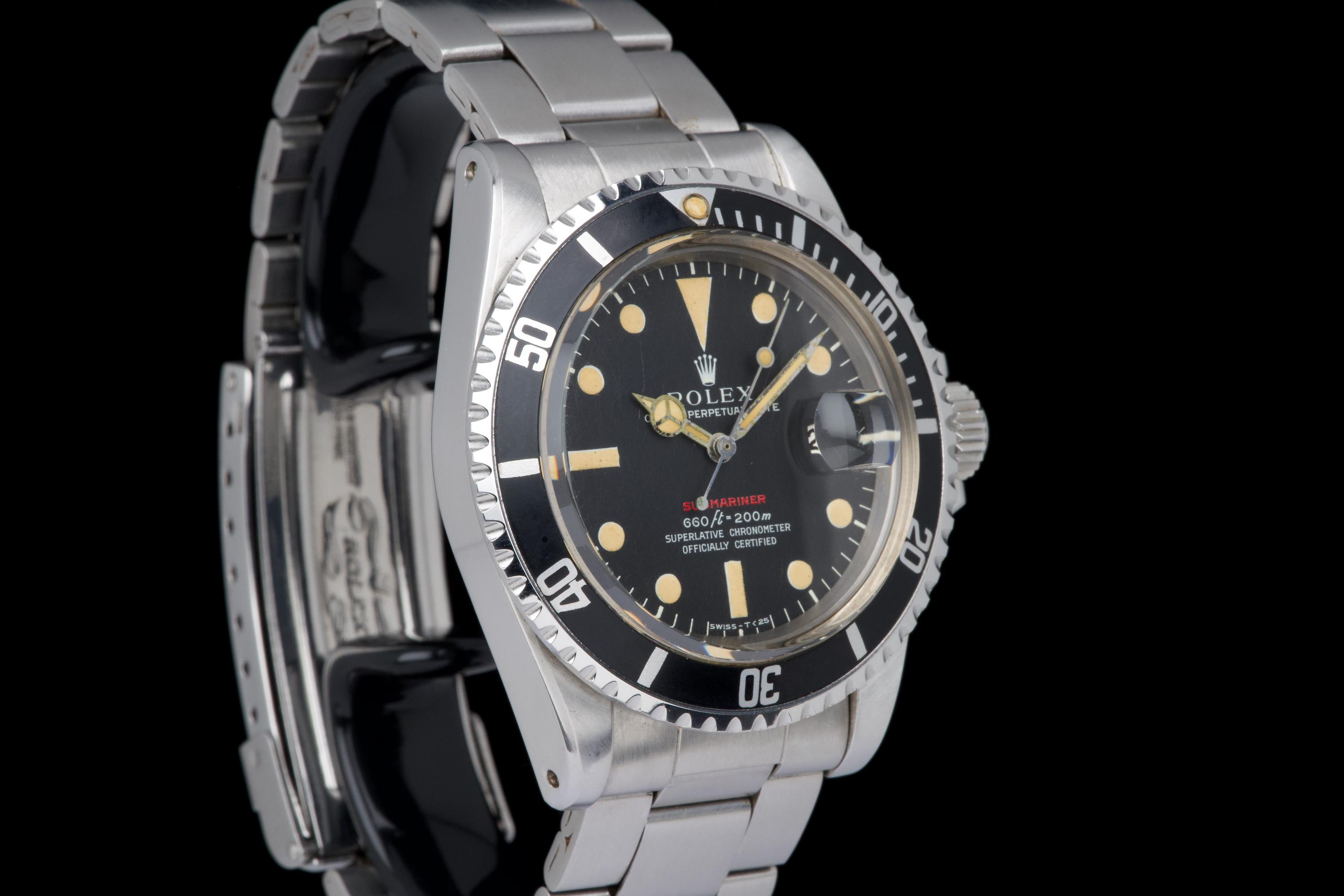 Rolex Submariner “Red” 1680 MKIV, from 1970 (Serial 2.79XXXX). An exceptional example of the iconic Red Submariner 1680 with MKIV dial. The case is superb, likely polished only once in the past, and remains thick with well-defined and symmetrical chamfers. The MKIV matte black dial is stunning, with no visible flaws. The tritium hour markers have developed a beautiful light orange patina, and the matching hands show light corrosion typical for a watch of this age. The original bezel insert is exceptional, showing no scratches and featuring the desirable thick font. The original crown is present, as is the folded Oyster bracelet dated 4.70 with 280 endlinks. The bracelet shows virtually no stretch. Serial and reference numbers between the lugs are crisp and deep, indicating minimal wear. The caseback is correctly stamped IV.70. The movement has just been serviced by our watchmaker and is running perfectly. A fantastic example of a 1970 MKIV Red Submariner — combining an exceptional case, flawless dial, and original components throughout. A true collector-grade vintage Rolex.