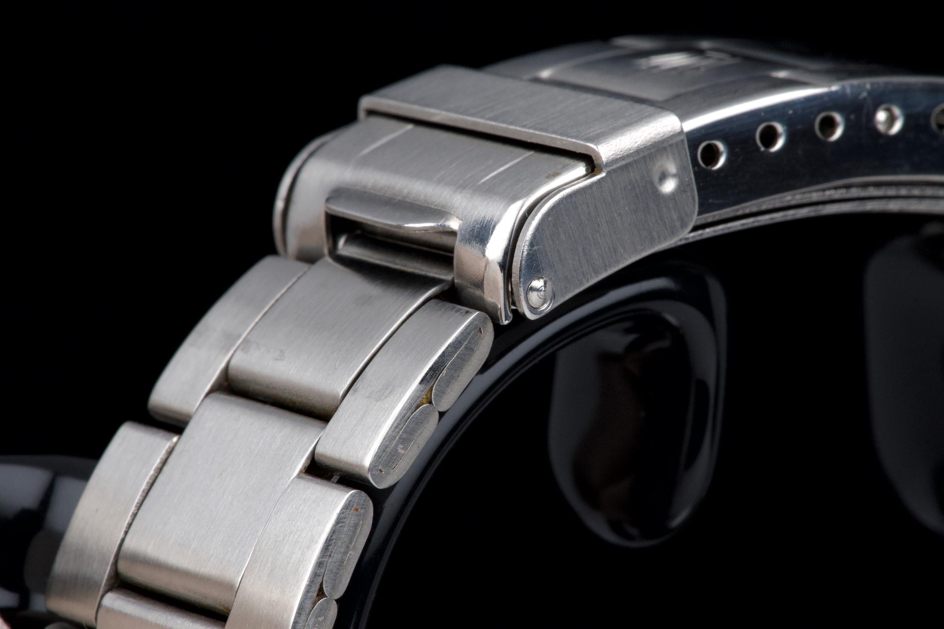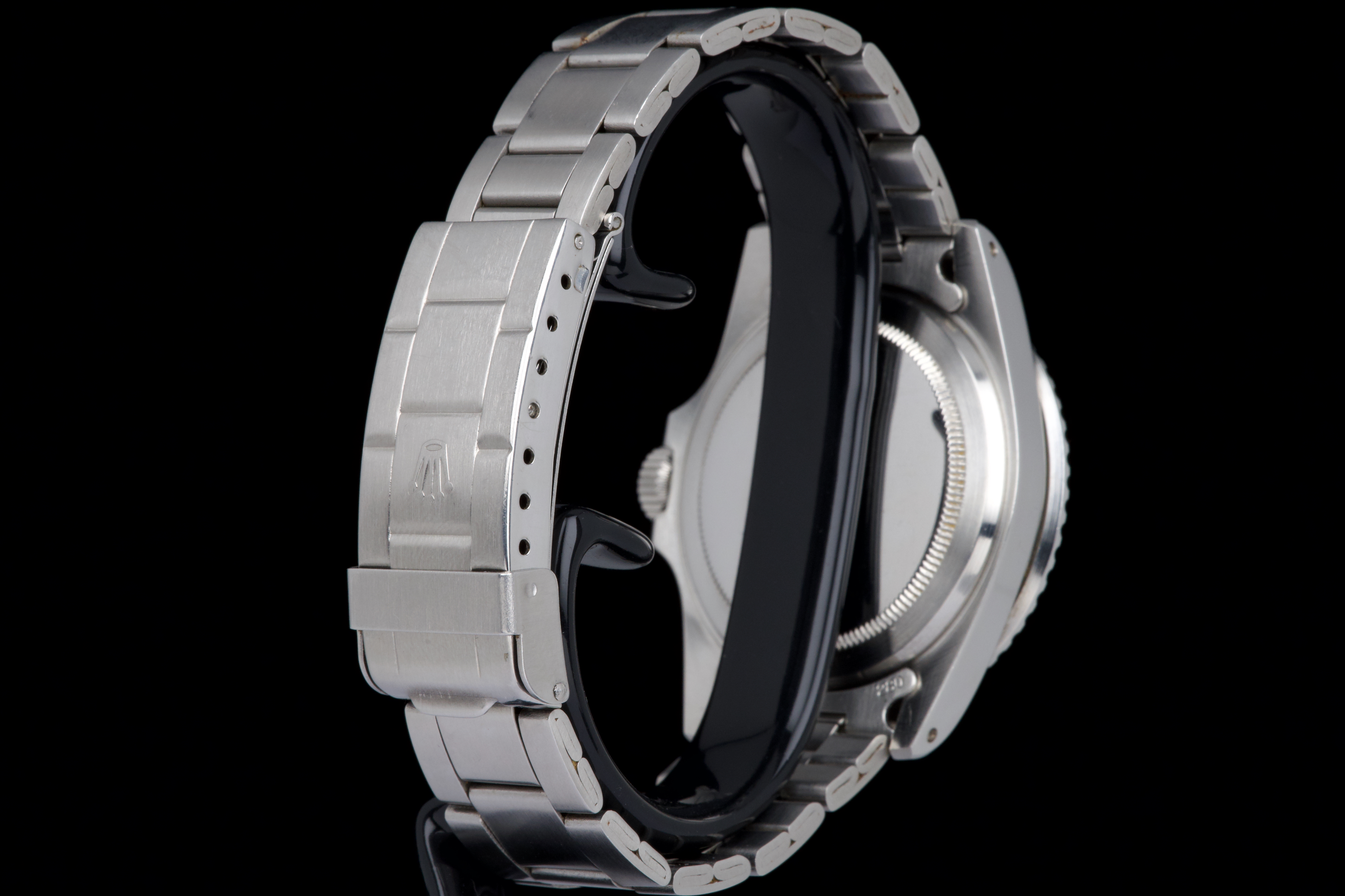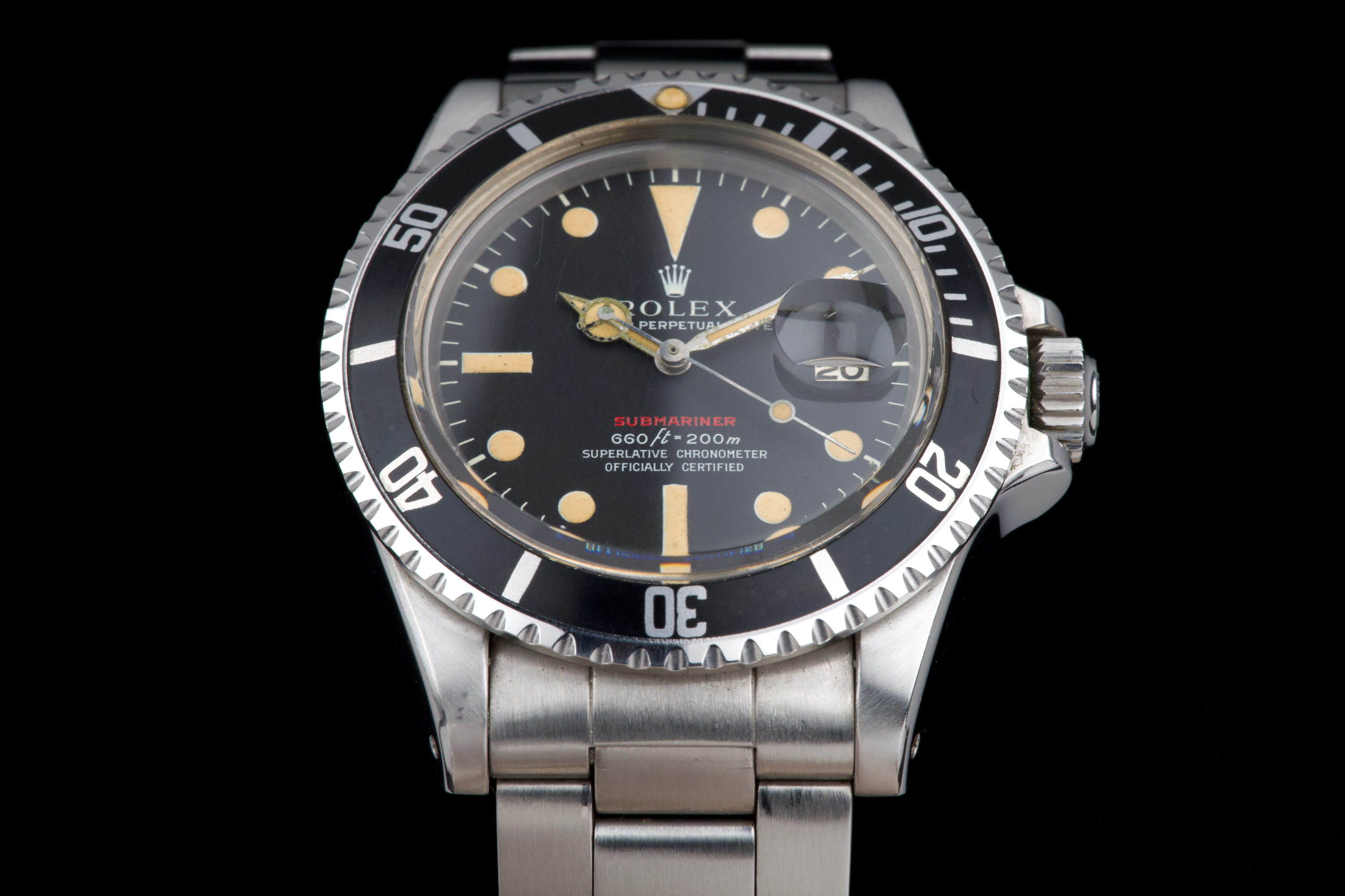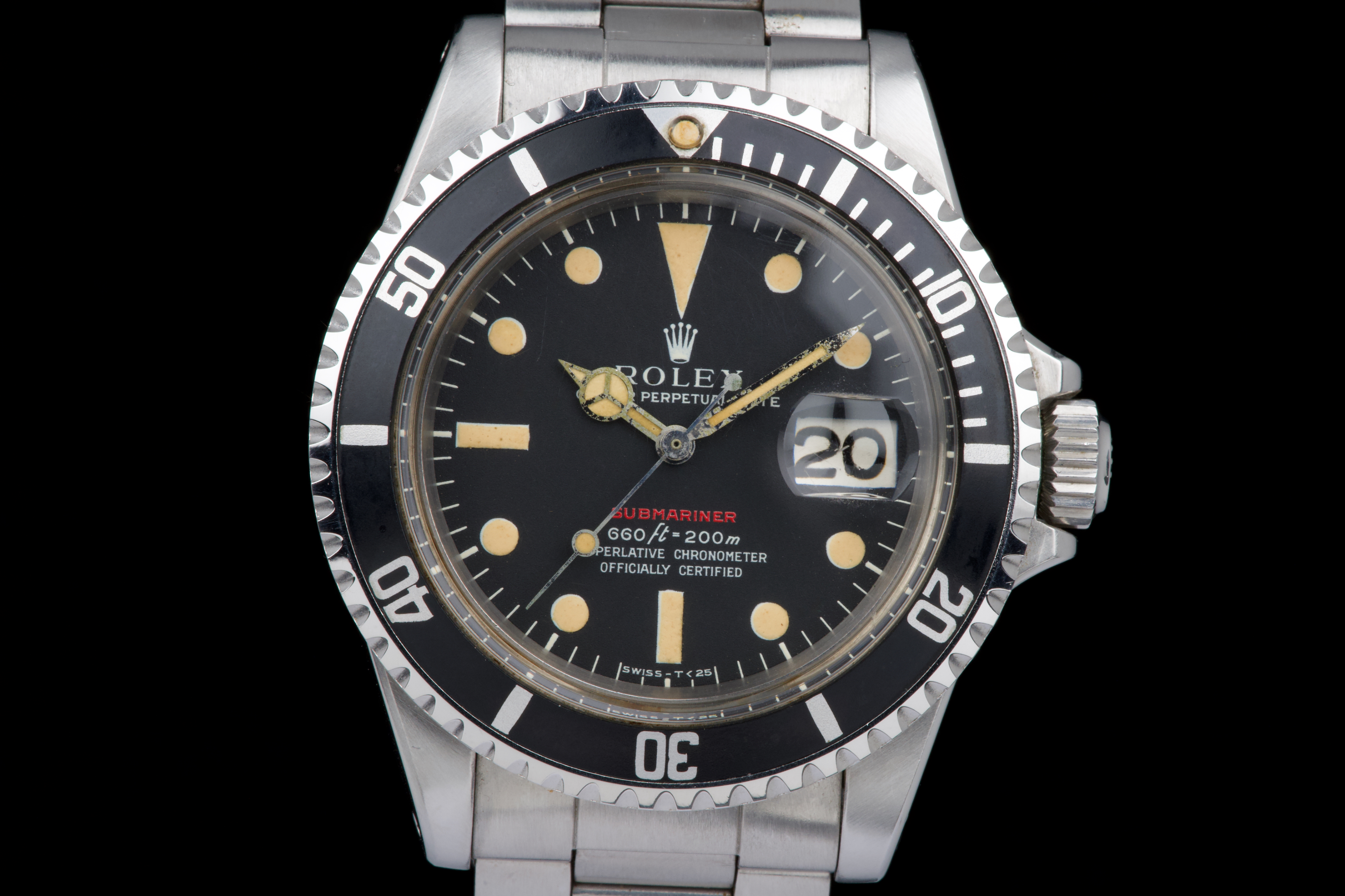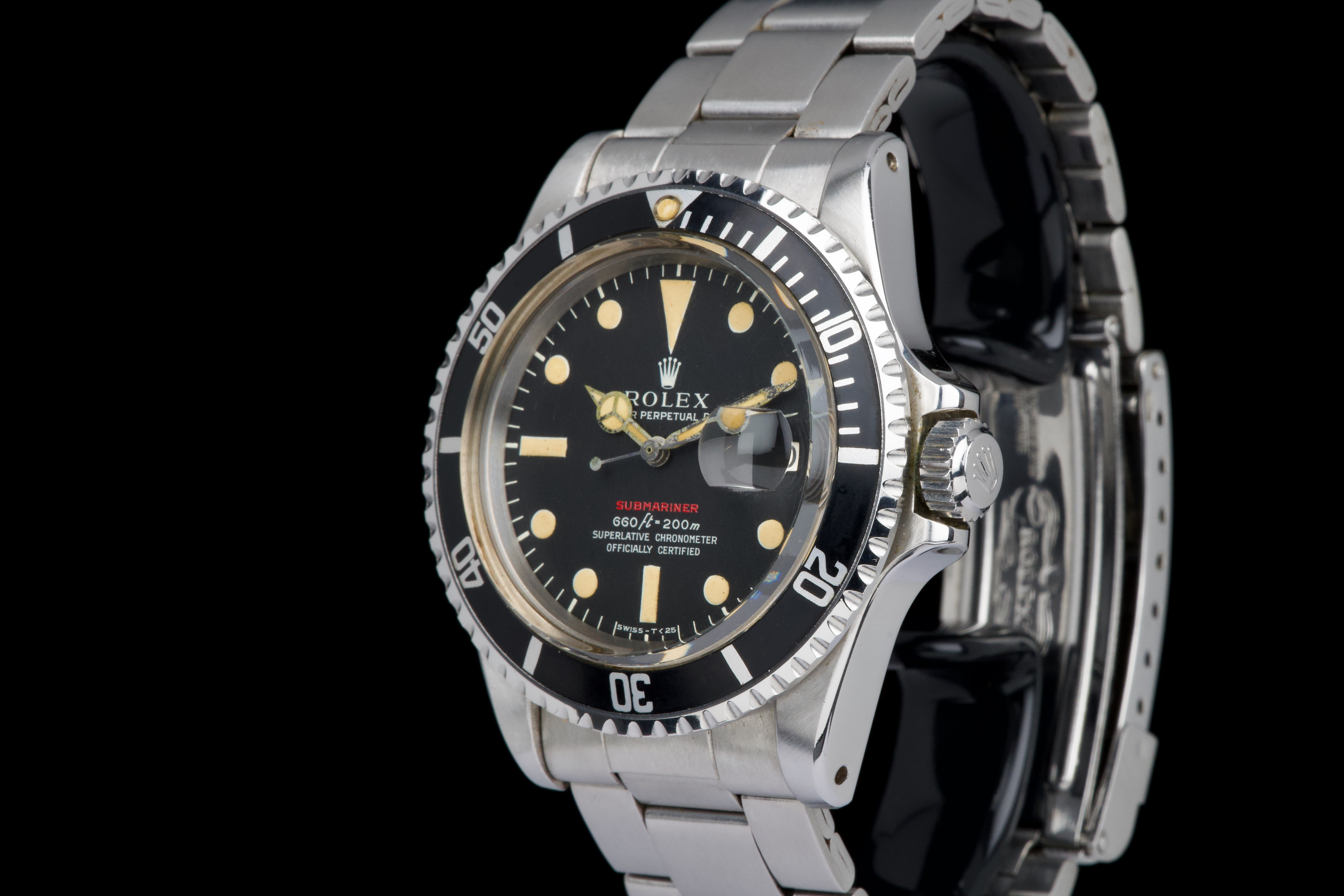 Rolex Submariner “Red” 1680 MKIV, from 1970 (Serial 2.79XXXX). An exceptional example of the iconic Red Submariner 1680 with MKIV dial. The case is superb, likely polished only once in the past, and remains thick with well-defined and symmetrical chamfers. The MKIV matte black dial is stunning, with no visible flaws. The tritium hour markers have developed a beautiful light orange patina, and the matching hands show light corrosion typical for a watch of this age. The original bezel insert is exceptional, showing no scratches and featuring the desirable thick font. The original crown is present, as is the folded Oyster bracelet dated 4.70 with 280 endlinks. The bracelet shows virtually no stretch. Serial and reference numbers between the lugs are crisp and deep, indicating minimal wear. The caseback is correctly stamped IV.70. The movement has just been serviced by our watchmaker and is running perfectly. A fantastic example of a 1970 MKIV Red Submariner — combining an exceptional case, flawless dial, and original components throughout. A true collector-grade vintage Rolex.