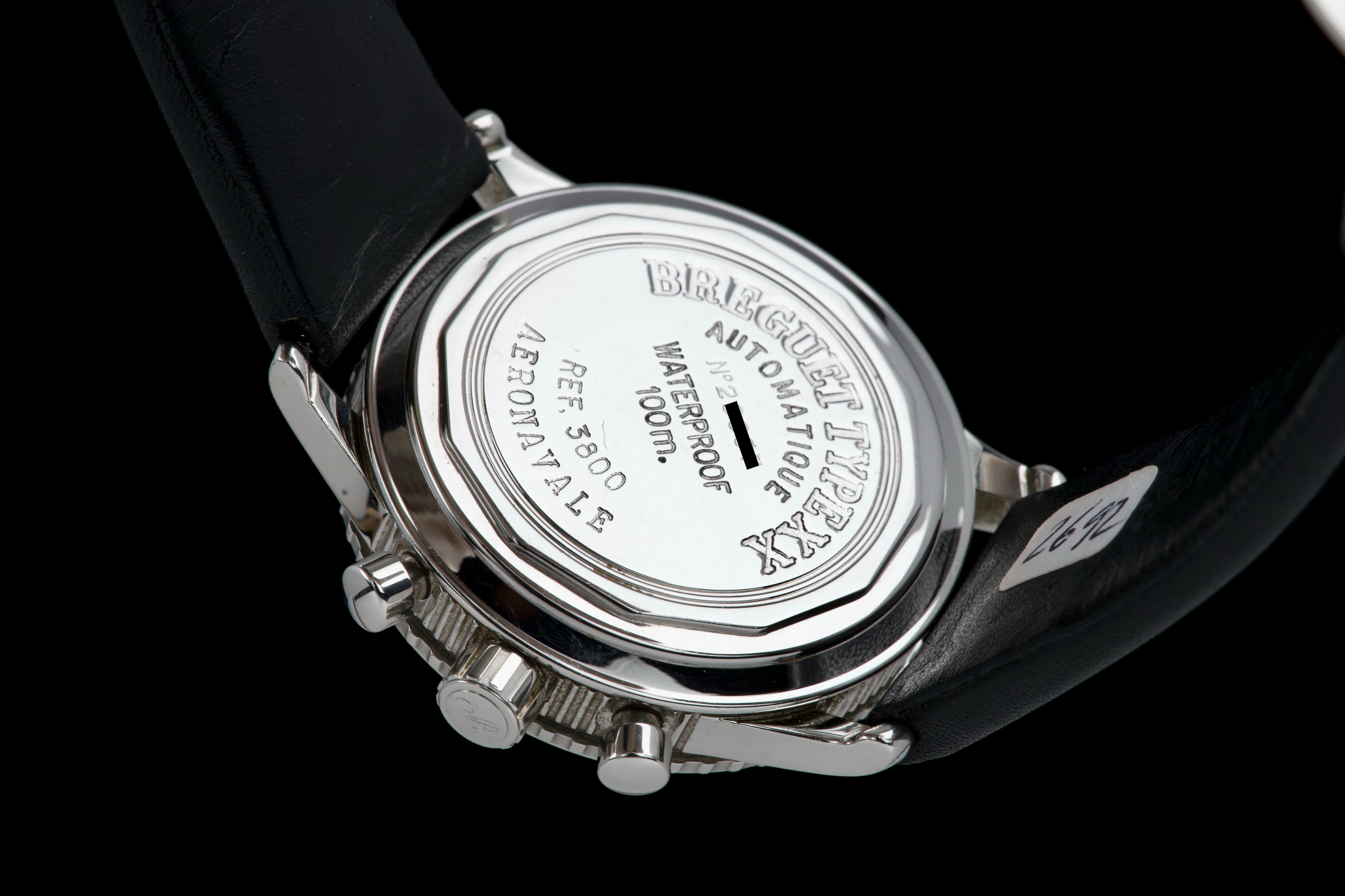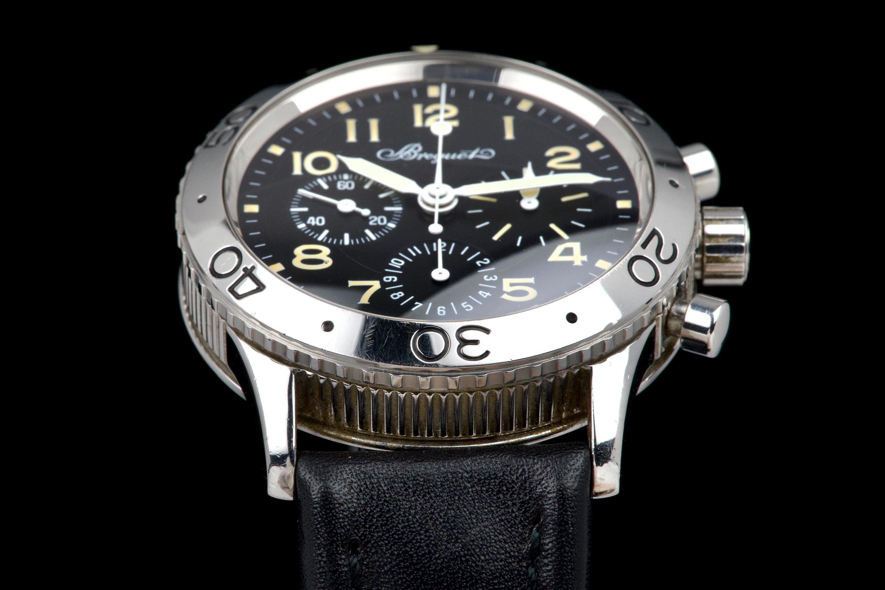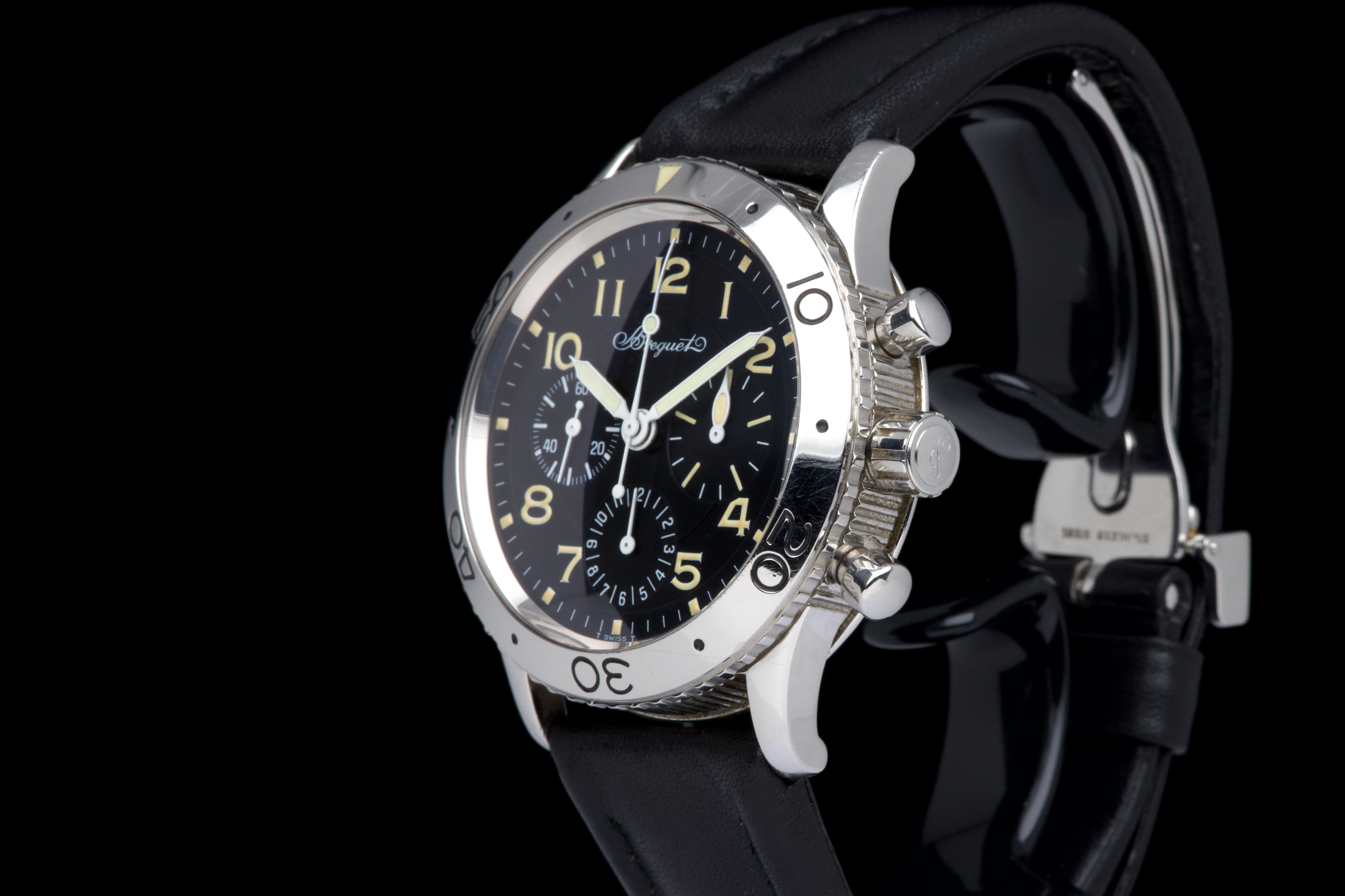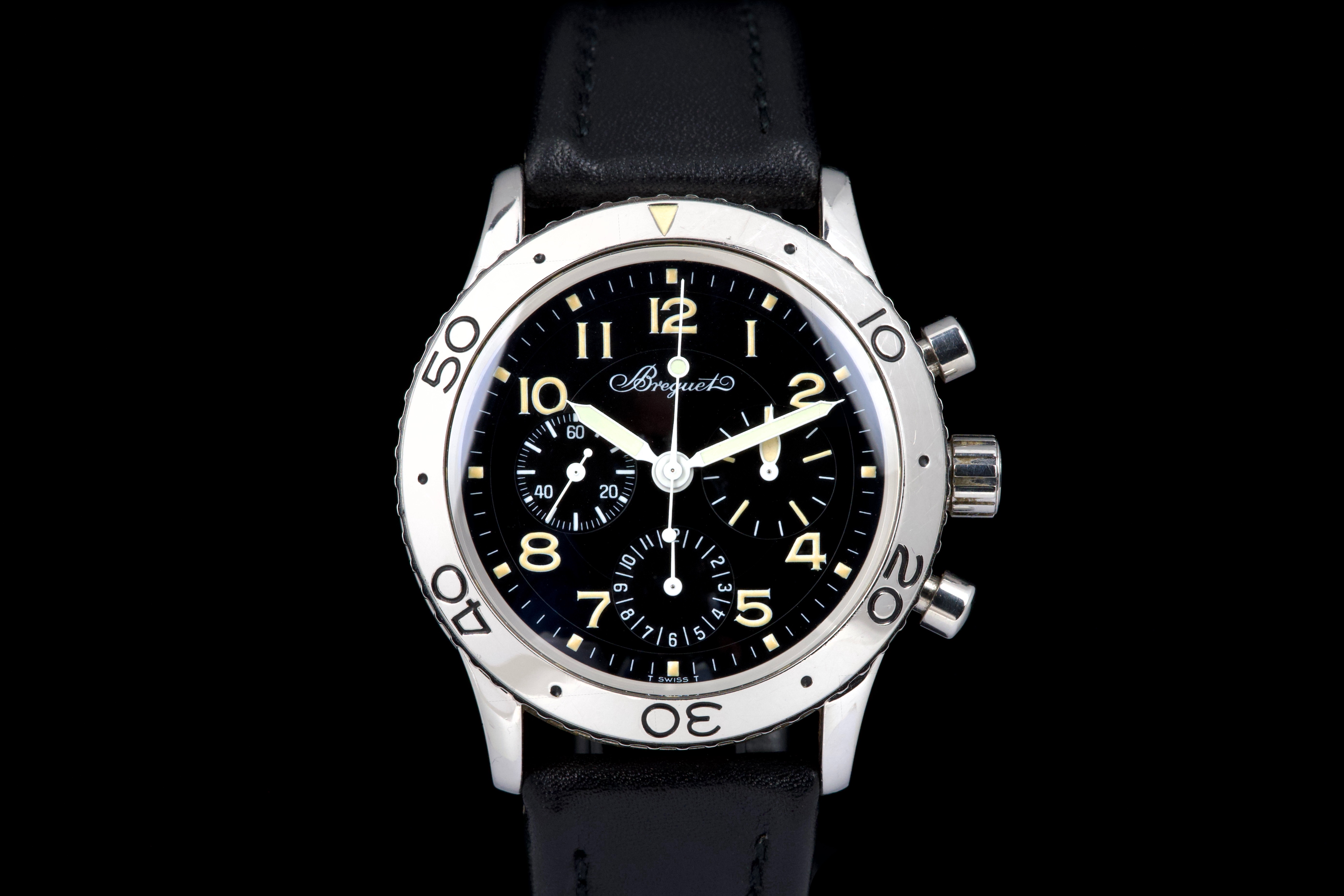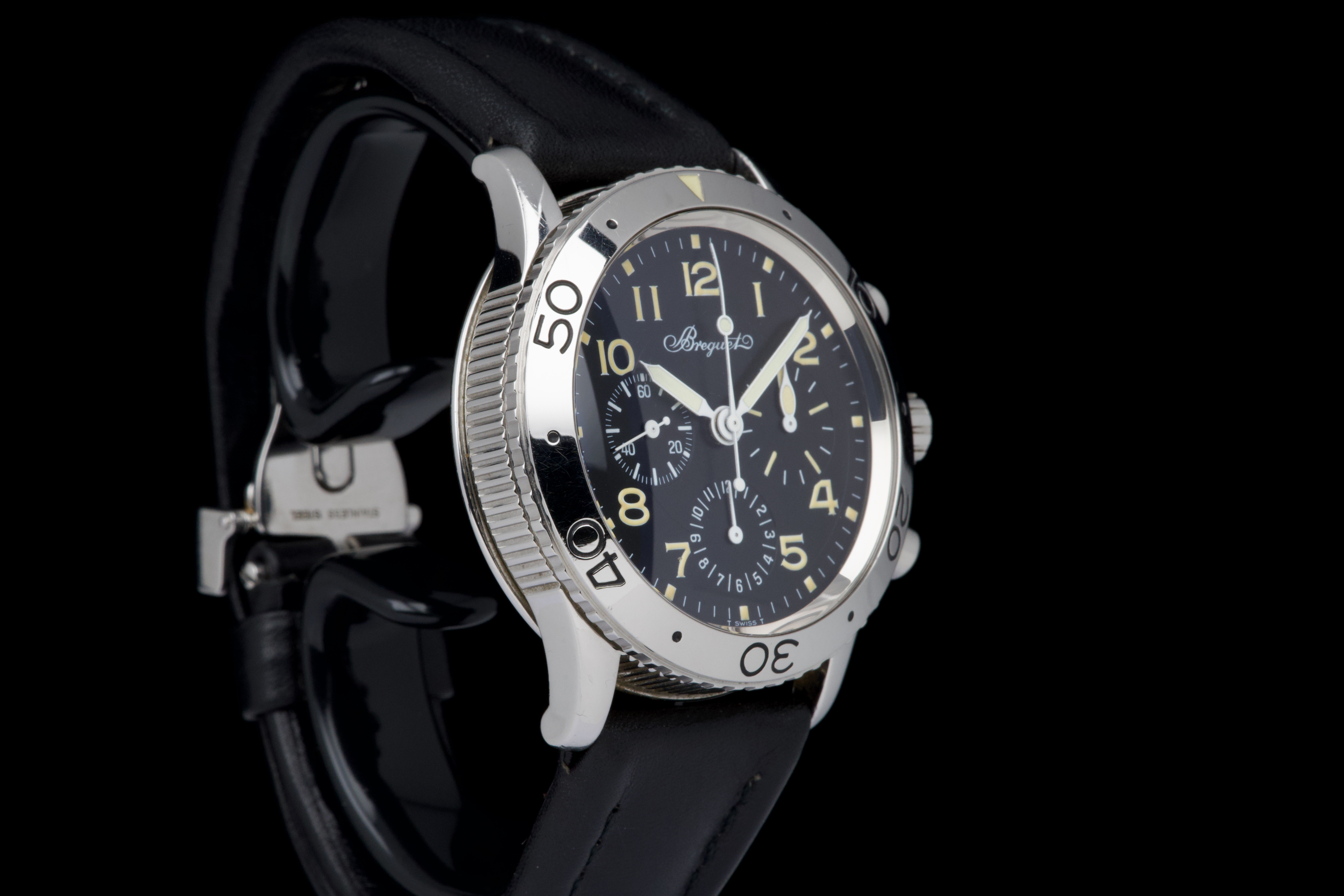 A superb example of the Breguet Type XX reference ST800, complete with its original metal box and original undated papers. Although the warranty is not dated, production characteristics and serial range indicate that the watch was most likely produced in 1997. The stainless-steel case is unpolished, remaining in excellent condition and showing only very light wear from use. The black tritium dial is exceptional, featuring a beautiful warm patina with perfectly matching tritium hands — exactly what collectors look for on early Type XX pieces. The watch is fitted with a brand-new Breguet black leather strap and its original Breguet deployant clasp, offering a fresh and elegant wrist presence. No service history is available, but the watch has been checked by our watchmaker and is in perfect working condition. A highly attractive and honest example of the classic Breguet Type XX — unpolished, full set, with beautiful patina and excellent overall condition.