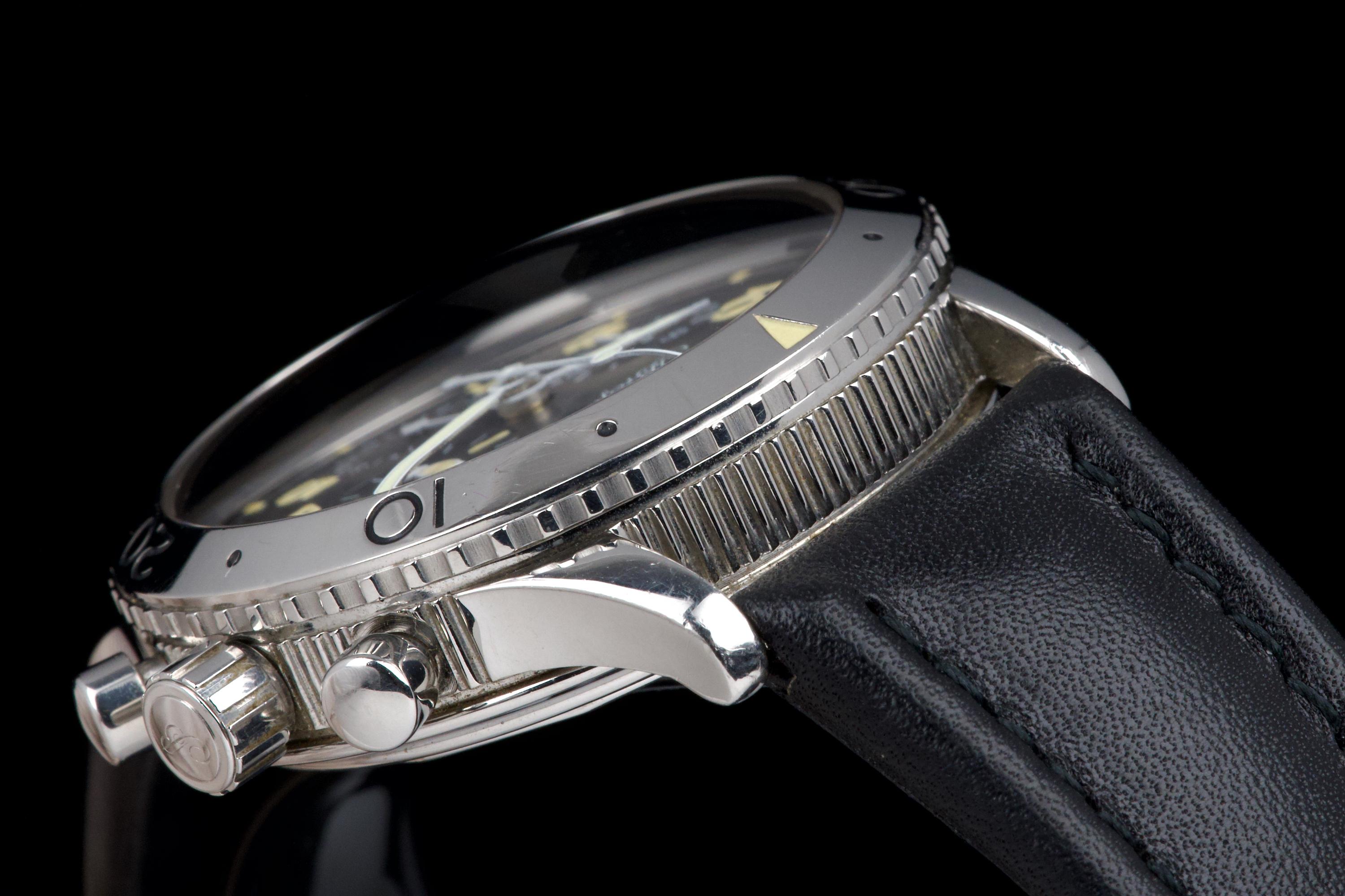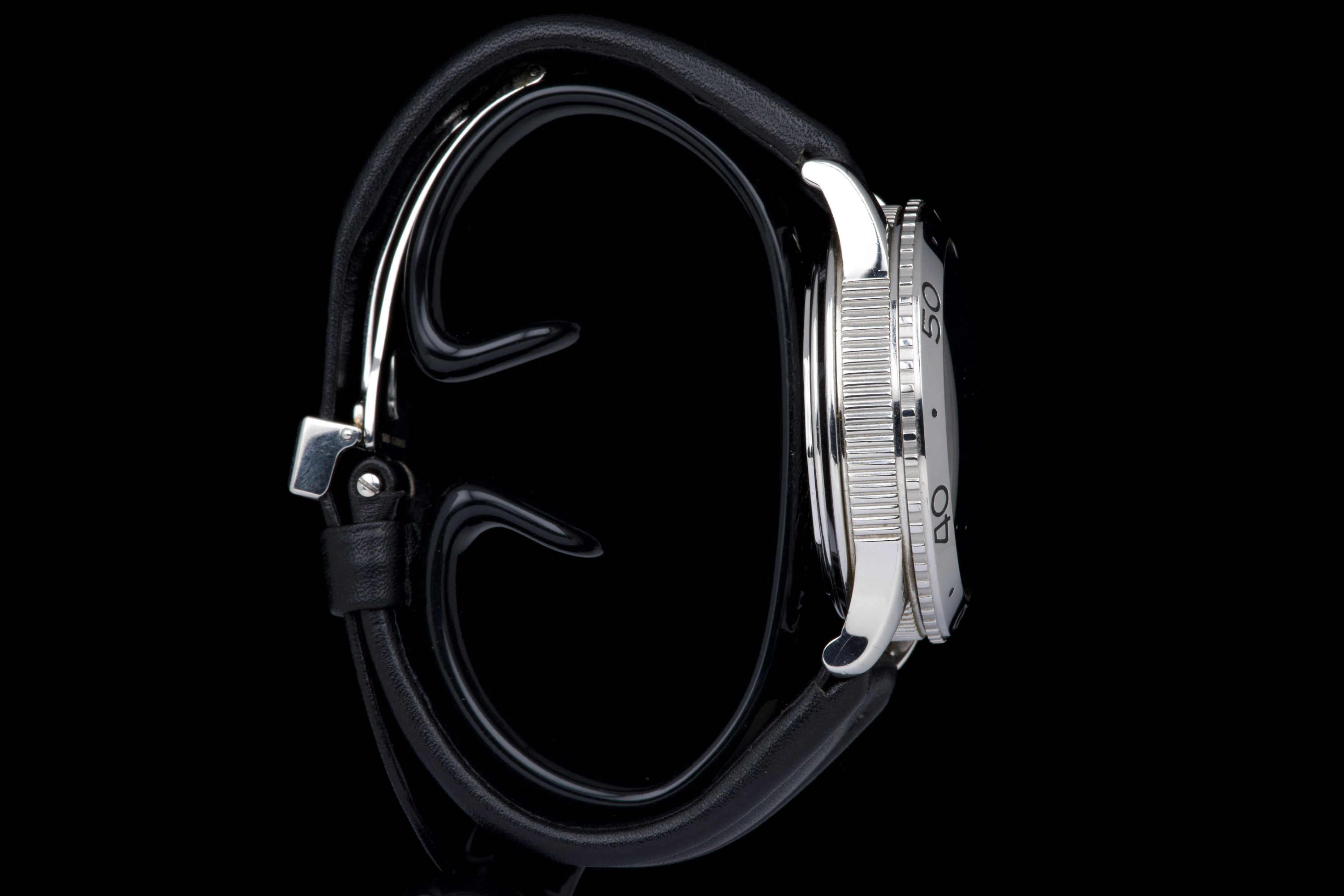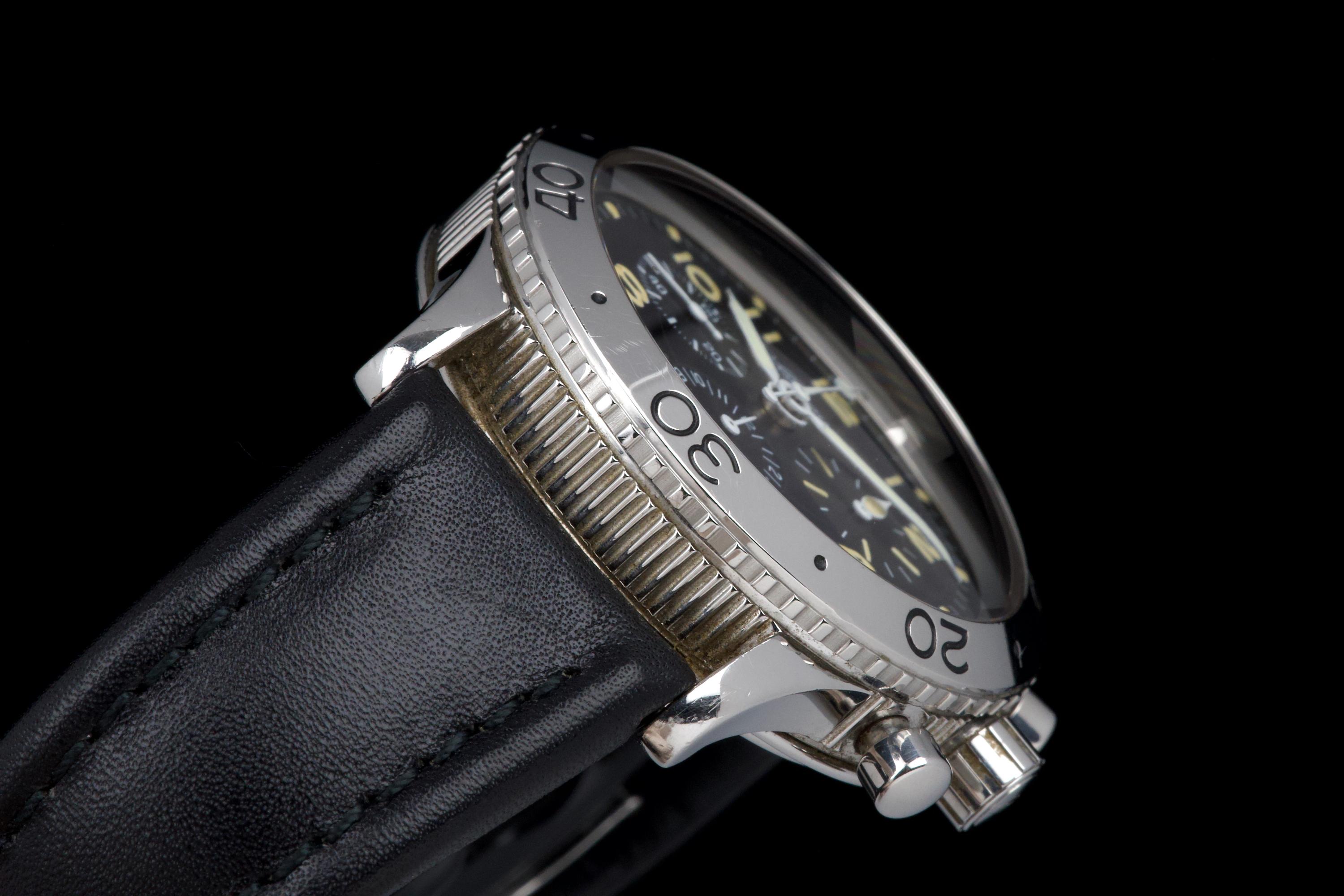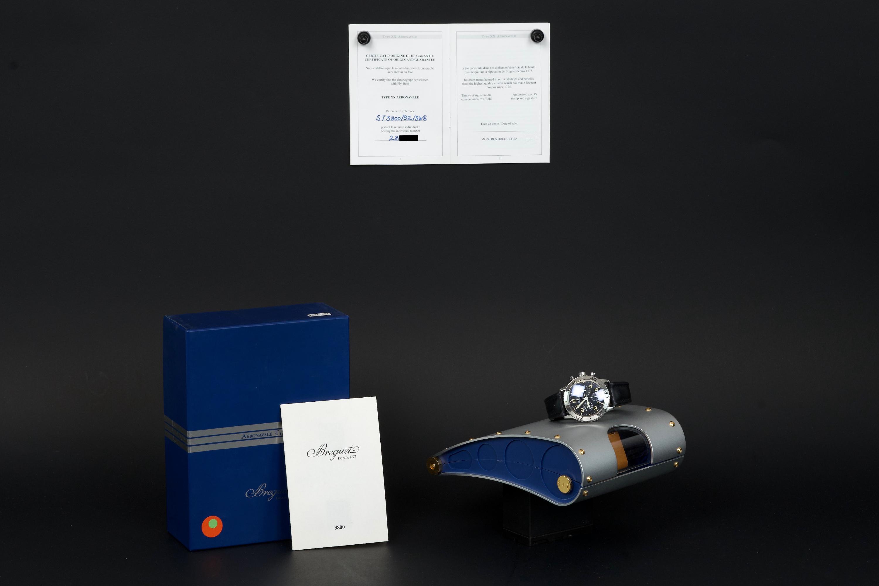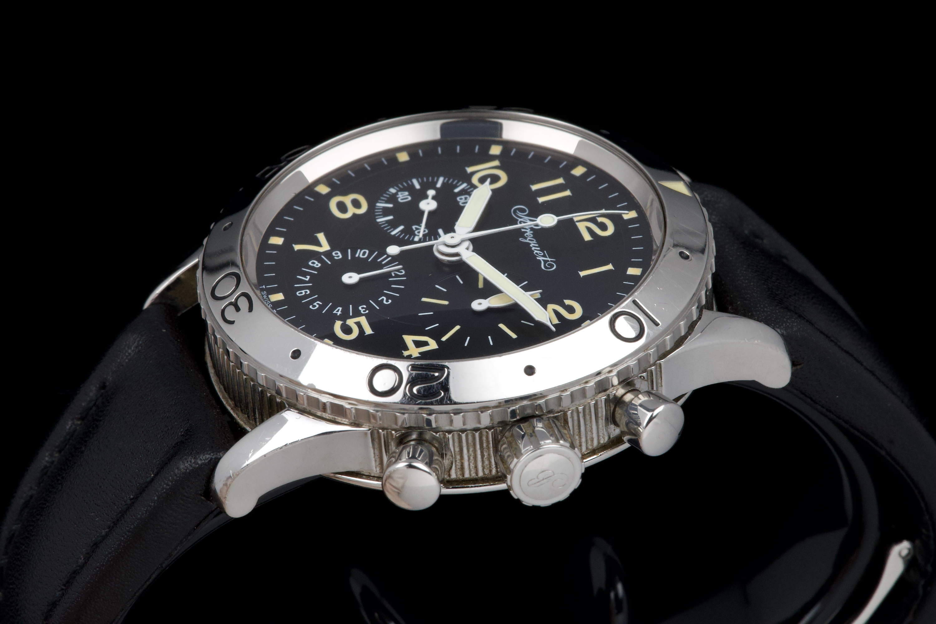 A superb example of the Breguet Type XX reference ST800, complete with its original metal box and original undated papers. Although the warranty is not dated, production characteristics and serial range indicate that the watch was most likely produced in 1997. The stainless-steel case is unpolished, remaining in excellent condition and showing only very light wear from use. The black tritium dial is exceptional, featuring a beautiful warm patina with perfectly matching tritium hands — exactly what collectors look for on early Type XX pieces. The watch is fitted with a brand-new Breguet black leather strap and its original Breguet deployant clasp, offering a fresh and elegant wrist presence. No service history is available, but the watch has been checked by our watchmaker and is in perfect working condition. A highly attractive and honest example of the classic Breguet Type XX — unpolished, full set, with beautiful patina and excellent overall condition.