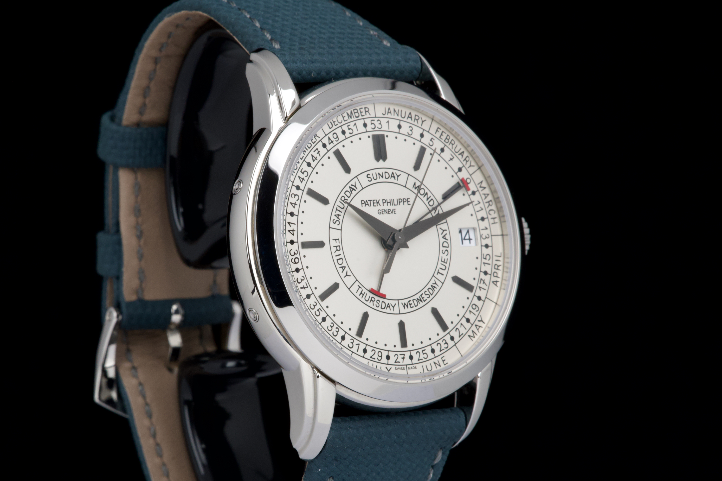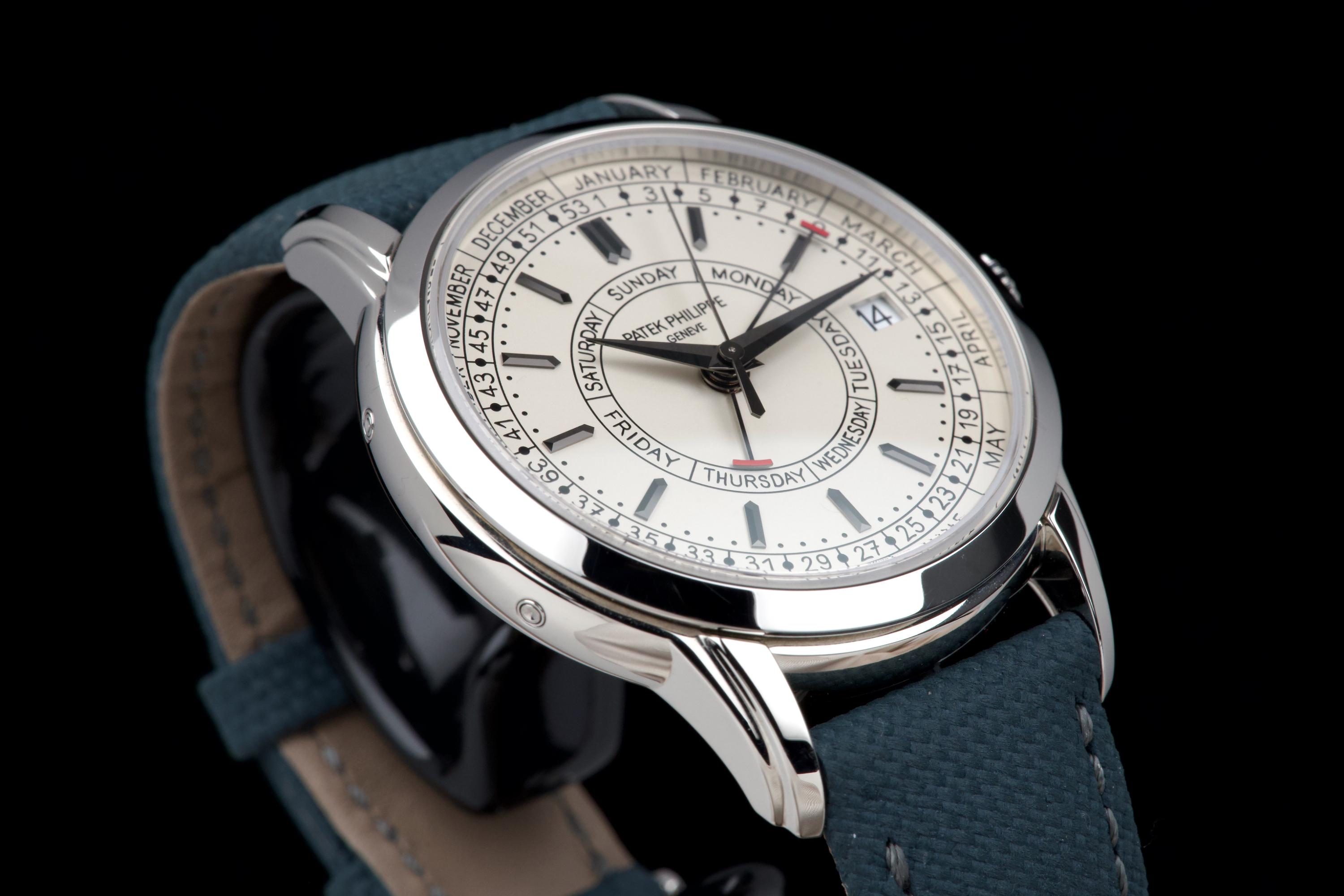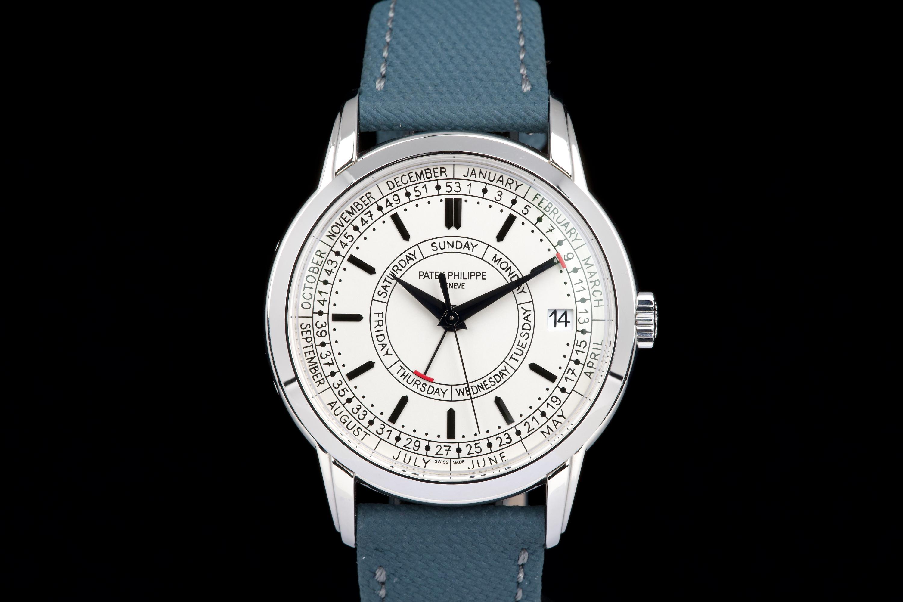 A superb single-owner example of the Patek Philippe Weekly Calendar 5212A, originally sold in Switzerland in 2022. The watch is in mint, close-to-new condition and comes complete with its full set. This elegant steel model features the distinctive silver opaline dial with handwritten-style day and week indications — a signature of the 5212. Powered by the automatic caliber 26-330 S C J SE, combining weekly calendar functionality with Patek Philippe’s refined finishing and reliability. The watch comes with its original beige calf leather strap, as well as an additional blue Patek Philippe fabric strap. A beautiful, fresh example of one of Patek Philippe’s most charismatic modern steel complications.