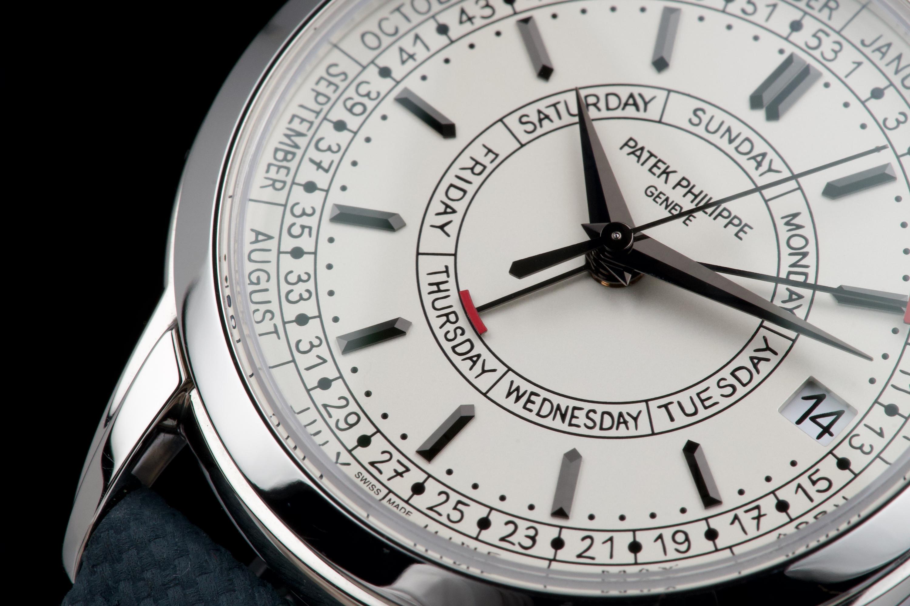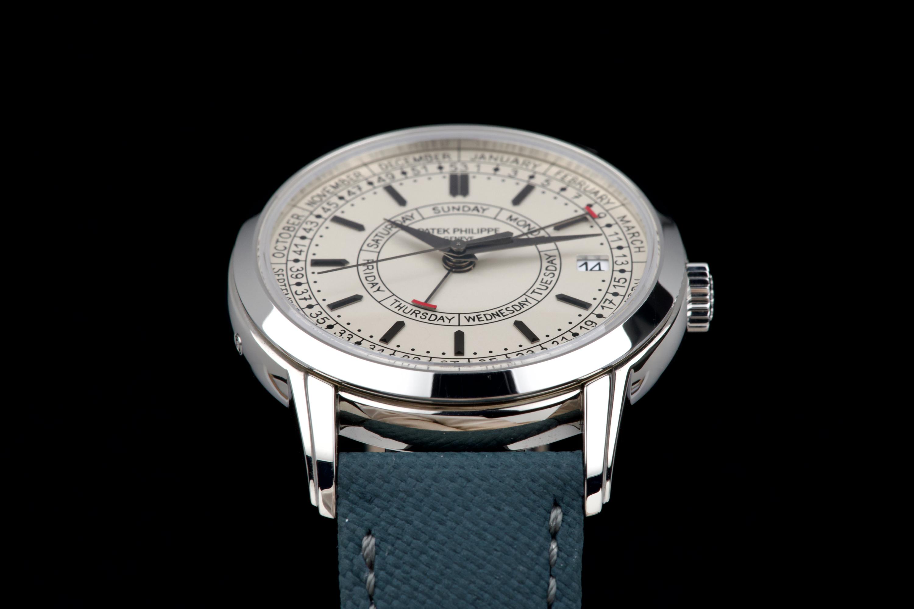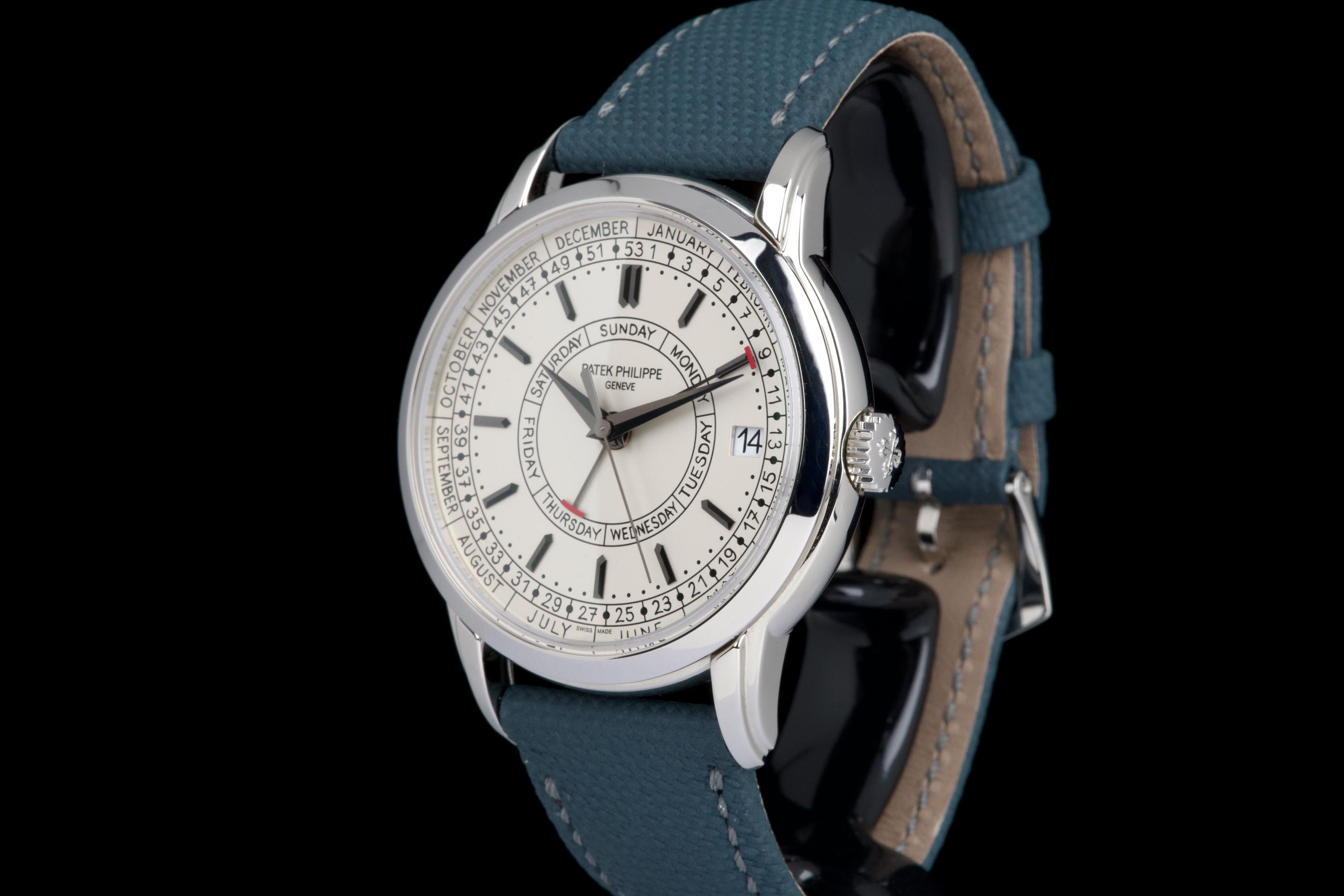A superb single-owner example of the Patek Philippe Weekly Calendar 5212A, originally sold in Switzerland in 2022. The watch is in mint, close-to-new condition and comes complete with its full set. This elegant steel model features the distinctive silver opaline dial with handwritten-style day and week indications — a signature of the 5212. Powered by the automatic caliber 26-330 S C J SE, combining weekly calendar functionality with Patek Philippe’s refined finishing and reliability. The watch comes with its original beige calf leather strap, as well as an additional blue Patek Philippe fabric strap. A beautiful, fresh example of one of Patek Philippe’s most charismatic modern steel complications.