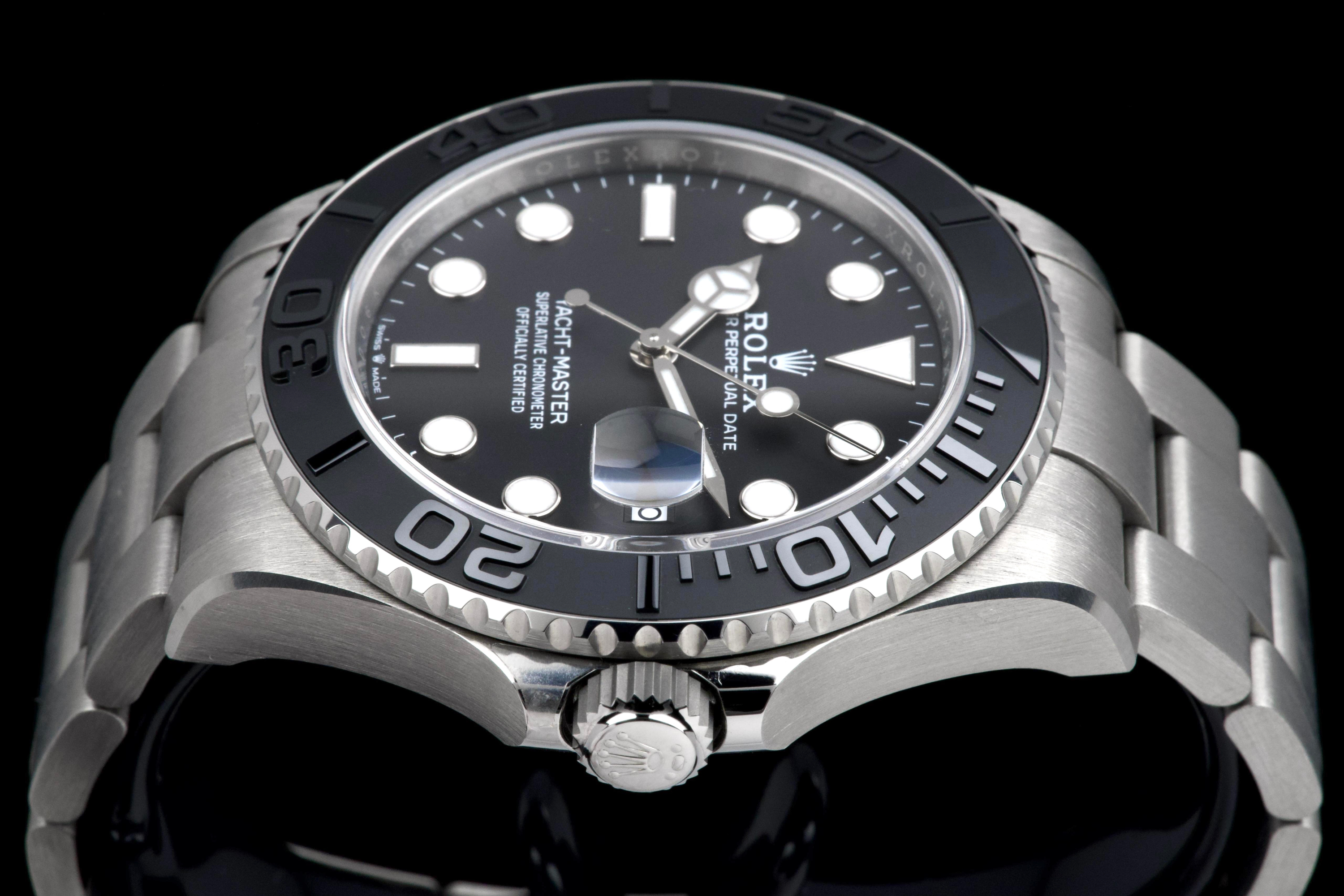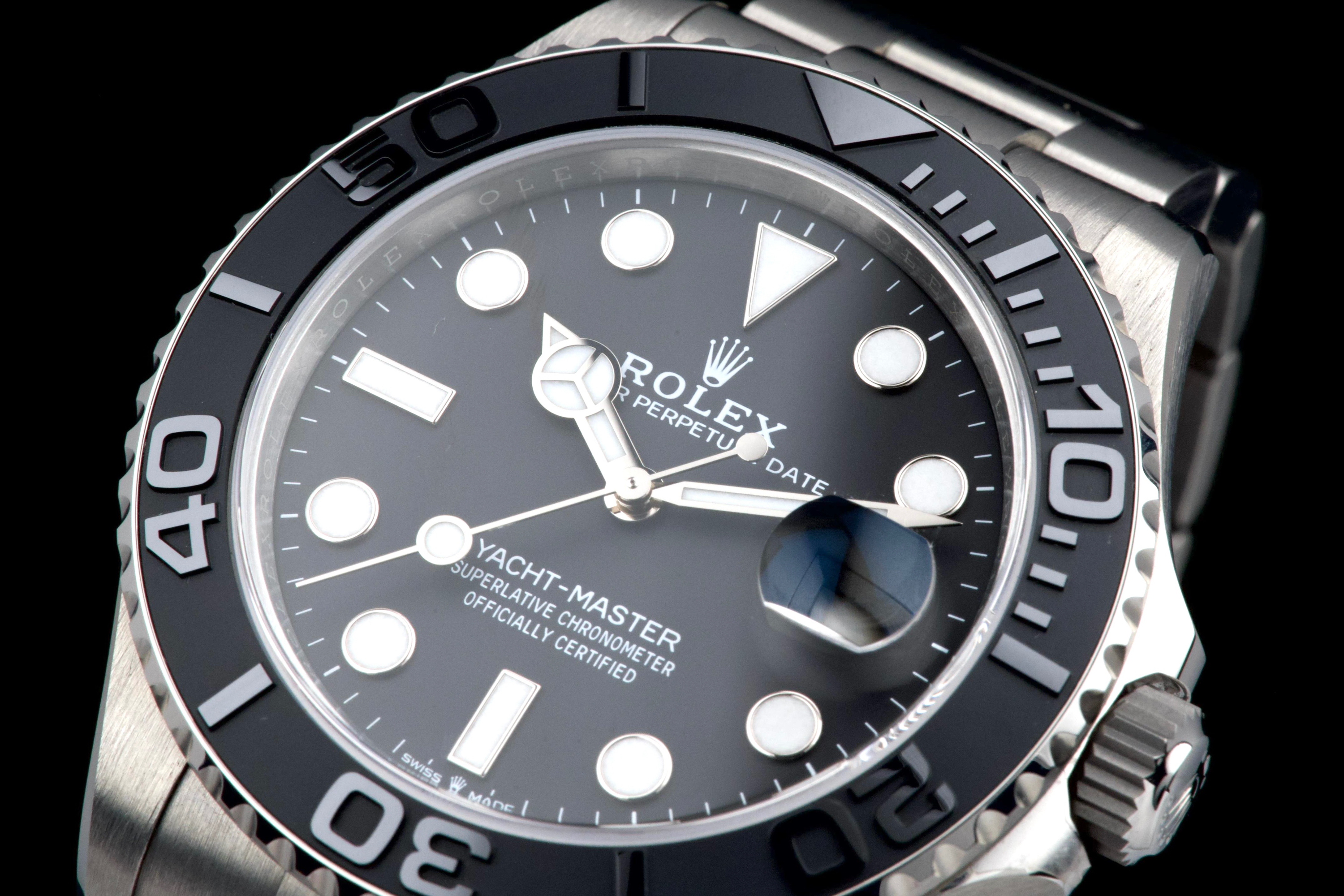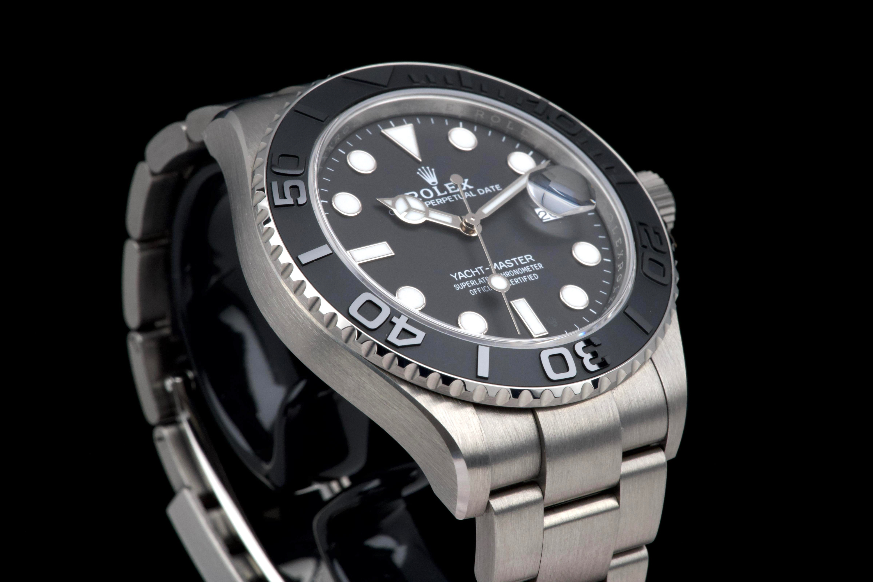 Rolex Yacht-Master 42, reference 226627, RLX titanium wristwatch with date and bracelet, full set, circa 2025. A contemporary and highly technical interpretation of the nautical sports watch, the present Yacht-Master reference 226627 showcases Rolex’s expertise in combining innovation with refined design. Crafted in RLX titanium, a lightweight and highly resistant alloy, the watch offers exceptional comfort on the wrist while maintaining the robustness expected from a professional model. Housed in a 42 mm case, the watch features a bidirectional rotatable bezel with raised numerals and a matte finish, enhancing both functionality and legibility. The dial is fitted with luminous hour markers and hands, along with a date aperture at 3 o’clock under a sapphire crystal with Cyclops magnifier. Powered by a reliable Rolex automatic movement, the watch delivers precision and durability in all conditions. According to the consignor, the watch was purchased new in 2025 and has remained in the possession of a single owner since. It has been very lightly worn, showing only minor hairline marks on the clasp, while the rest of the watch remains in excellent condition. Offered as a full set with its original box, warranty card and accessories, this Yacht-Master 226627 represents an outstanding opportunity to acquire a nearly unworn example of one of Rolex’s most modern and technically advanced sports watches.