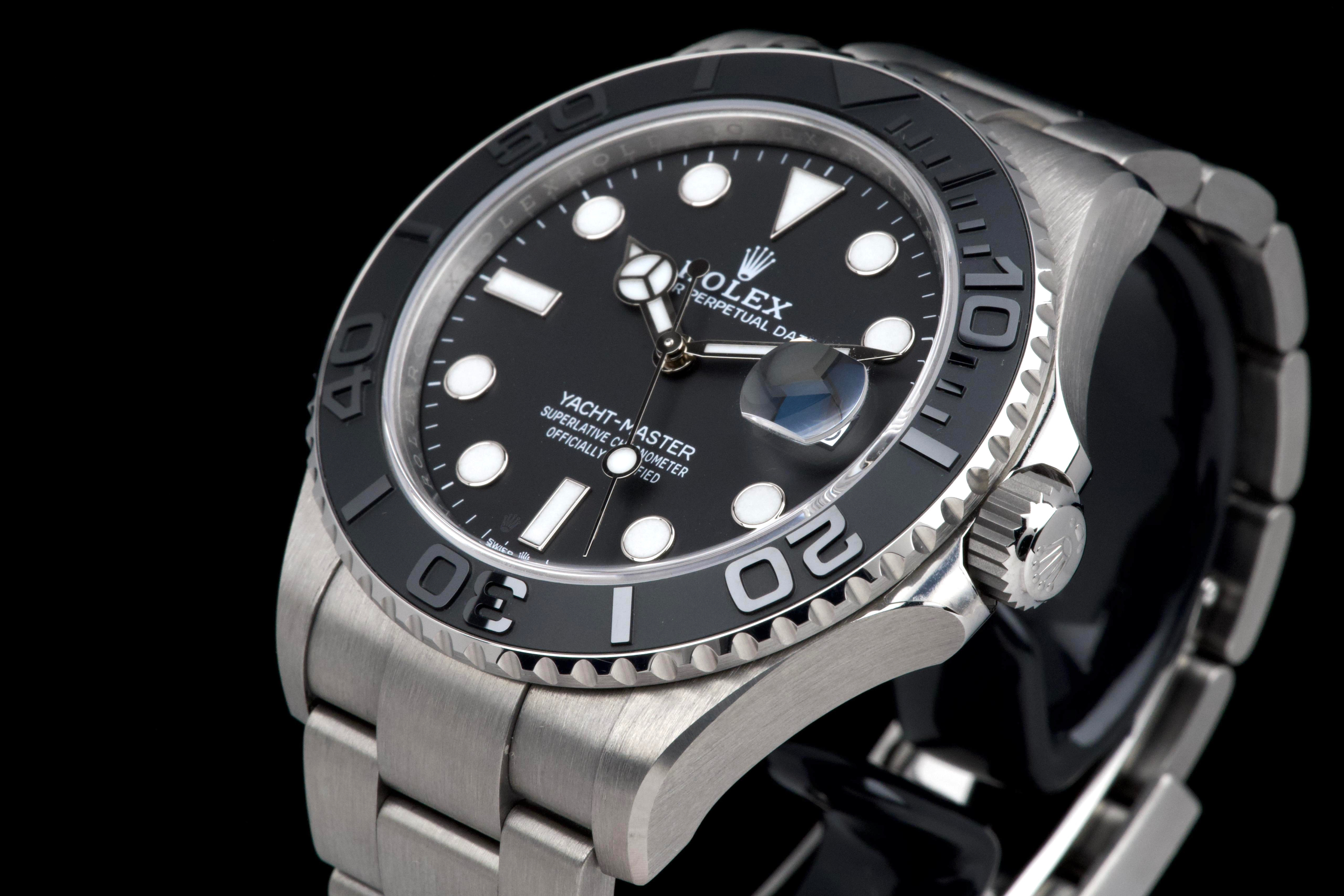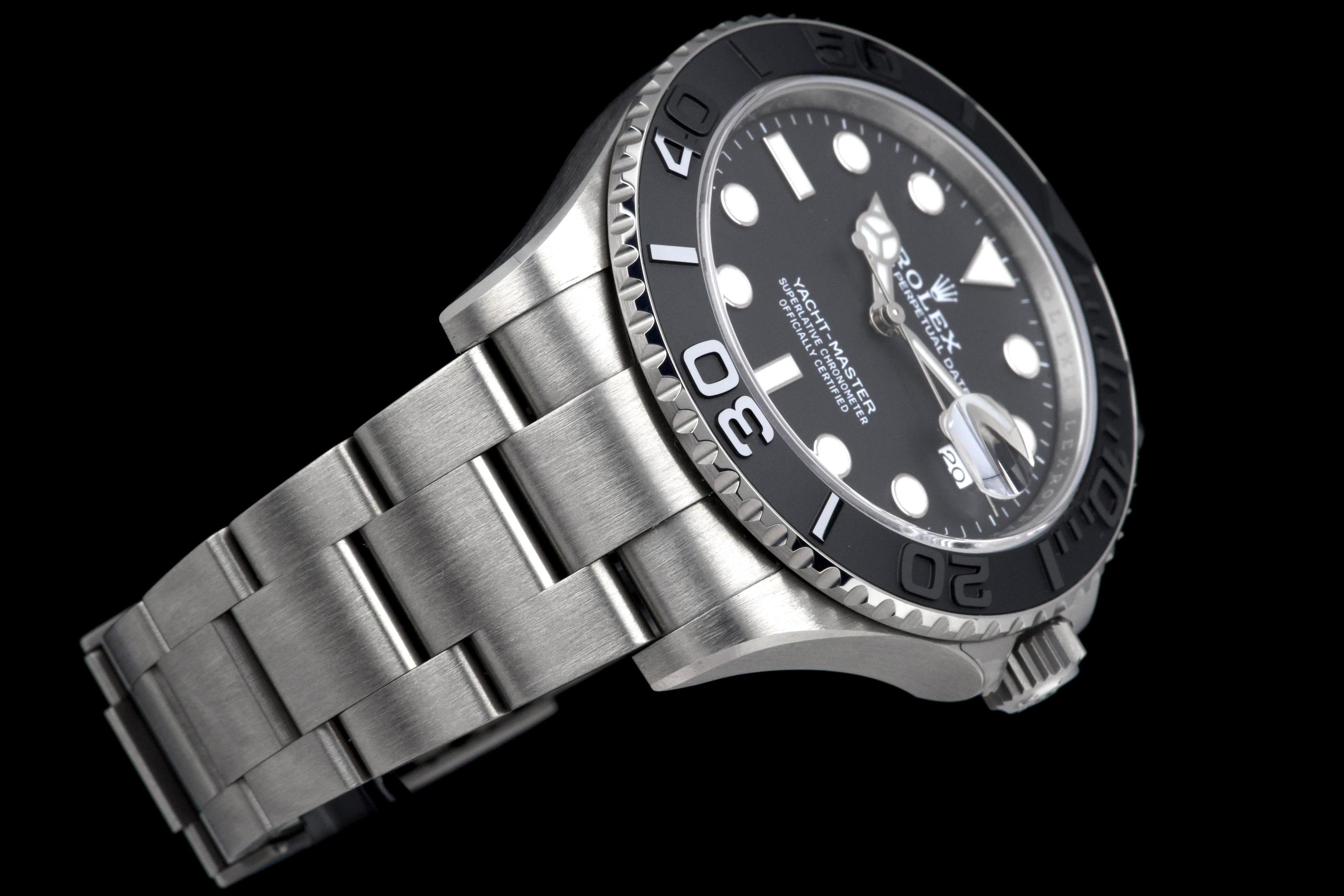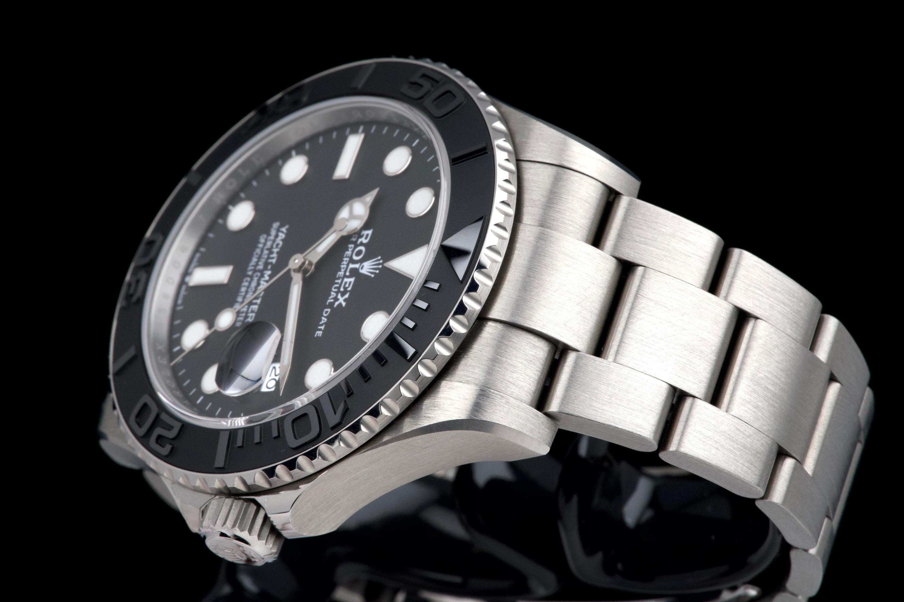 Rolex Yacht-Master 42, reference 226627, RLX titanium wristwatch with date and bracelet, full set, circa 2025. A contemporary and highly technical interpretation of the nautical sports watch, the present Yacht-Master reference 226627 showcases Rolex’s expertise in combining innovation with refined design. Crafted in RLX titanium, a lightweight and highly resistant alloy, the watch offers exceptional comfort on the wrist while maintaining the robustness expected from a professional model. Housed in a 42 mm case, the watch features a bidirectional rotatable bezel with raised numerals and a matte finish, enhancing both functionality and legibility. The dial is fitted with luminous hour markers and hands, along with a date aperture at 3 o’clock under a sapphire crystal with Cyclops magnifier. Powered by a reliable Rolex automatic movement, the watch delivers precision and durability in all conditions. According to the consignor, the watch was purchased new in 2025 and has remained in the possession of a single owner since. It has been very lightly worn, showing only minor hairline marks on the clasp, while the rest of the watch remains in excellent condition. Offered as a full set with its original box, warranty card and accessories, this Yacht-Master 226627 represents an outstanding opportunity to acquire a nearly unworn example of one of Rolex’s most modern and technically advanced sports watches.