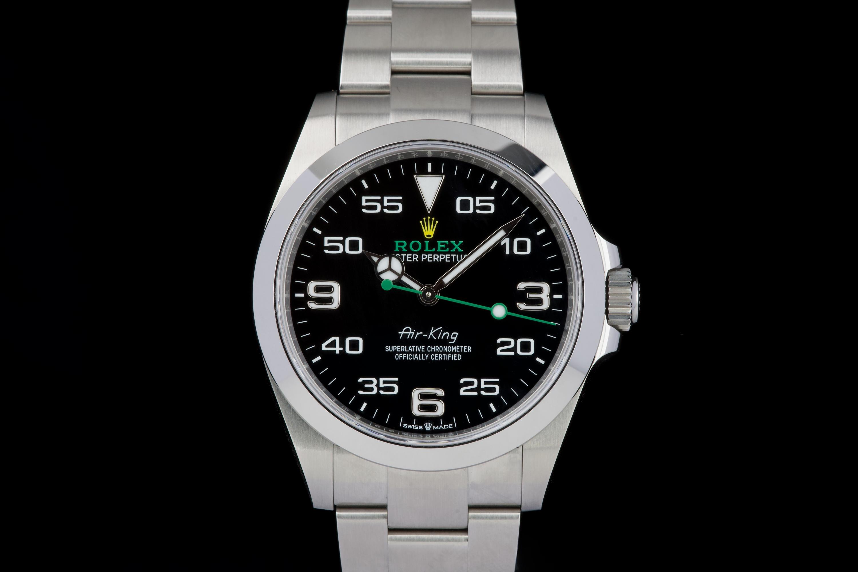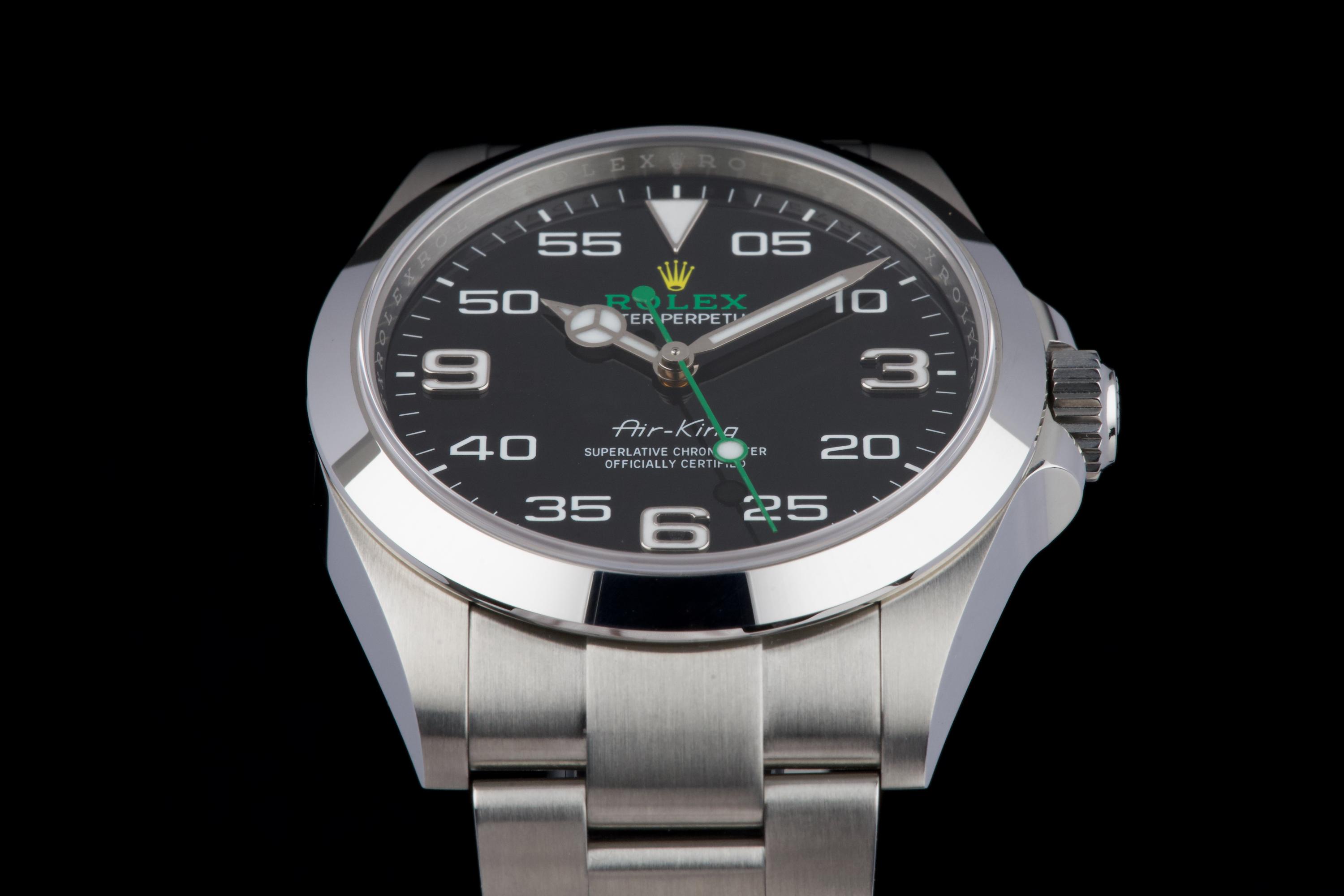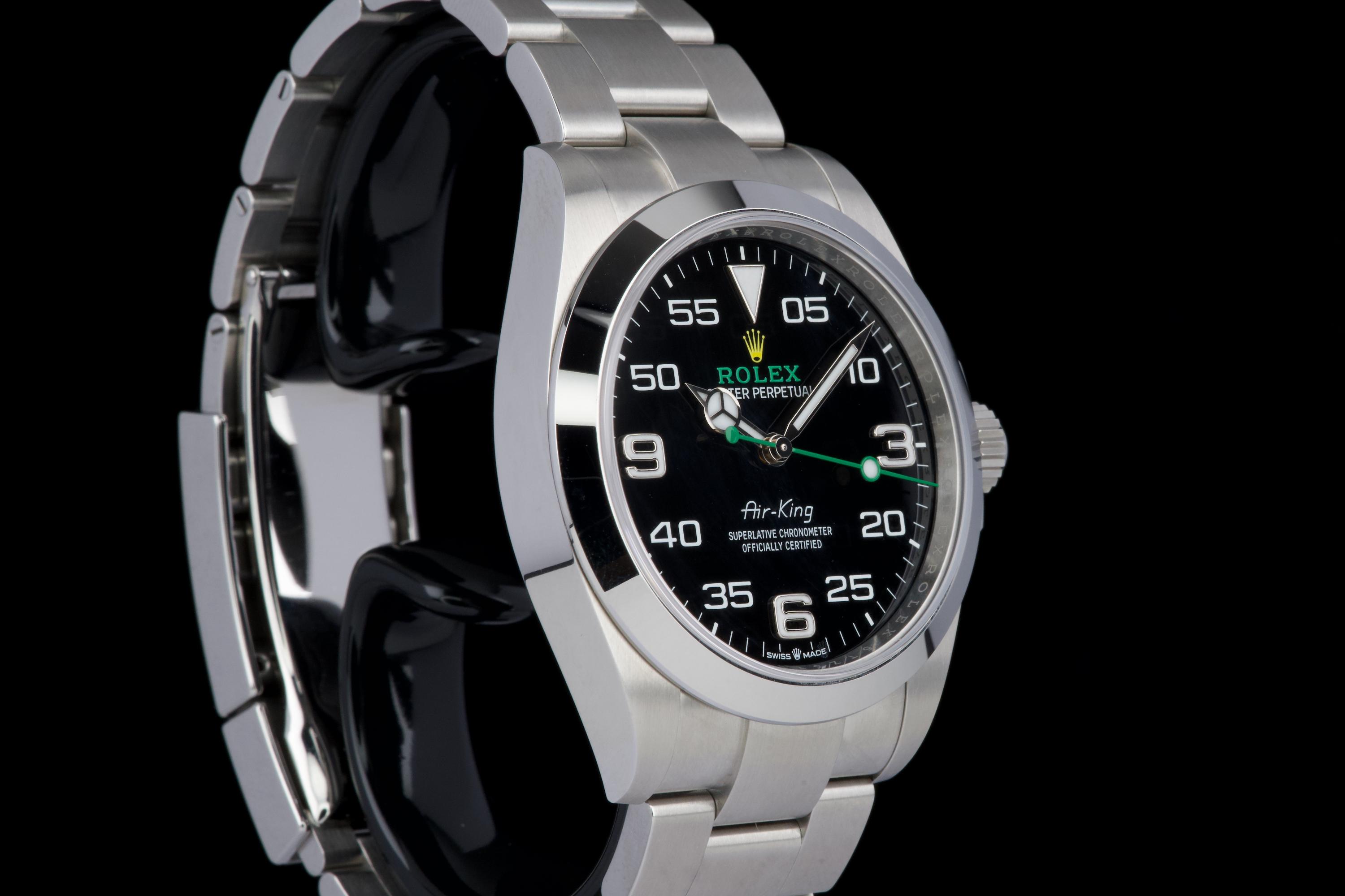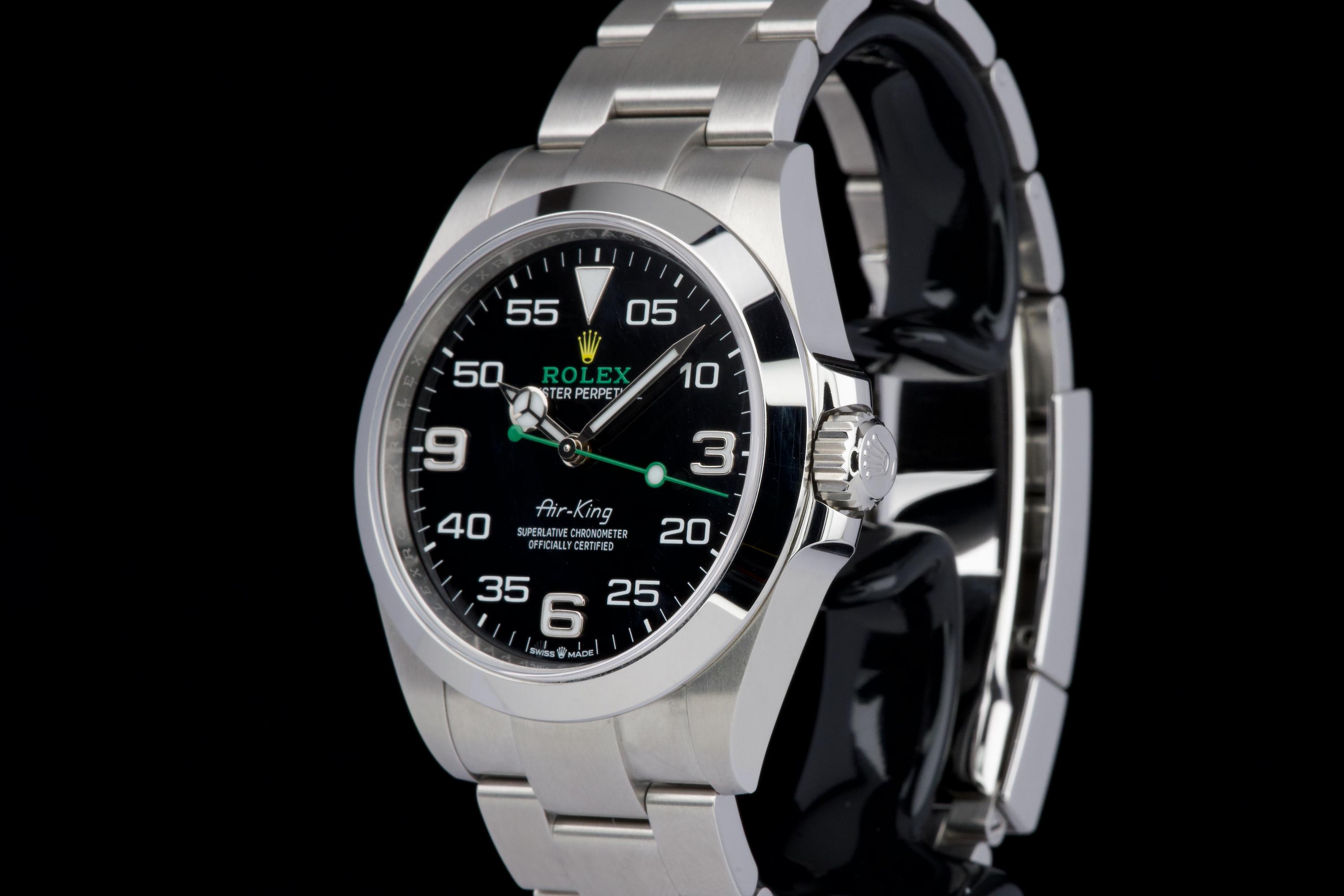 A modern and sporty Rolex Air-King reference 126900, introduced as part of the latest generation of professional models. This example dates to 2022 and is offered as a full set with box, papers, and accessories. The watch has been freshly polished by our watchmaker and presents in excellent overall condition, with only minimal signs of wear. The distinctive black dial, with its aviation-inspired layout and bold numerals, remains clean and perfectly legible, complemented by the robust Oyster case and smooth bezel. Powered by the Rolex caliber 3230, the watch offers excellent precision and reliability, in line with modern Rolex standards. A sharp and ready-to-wear example of the updated Air-King, combining contemporary design with everyday versatility.