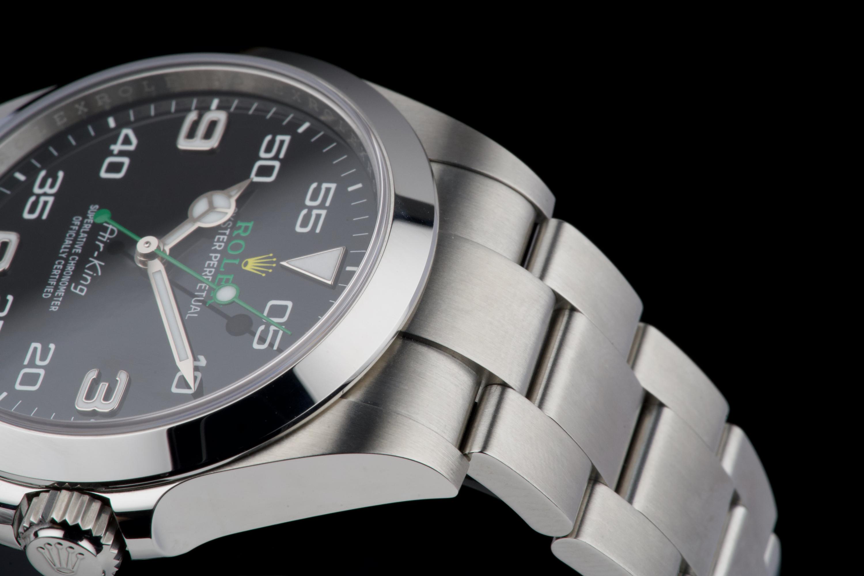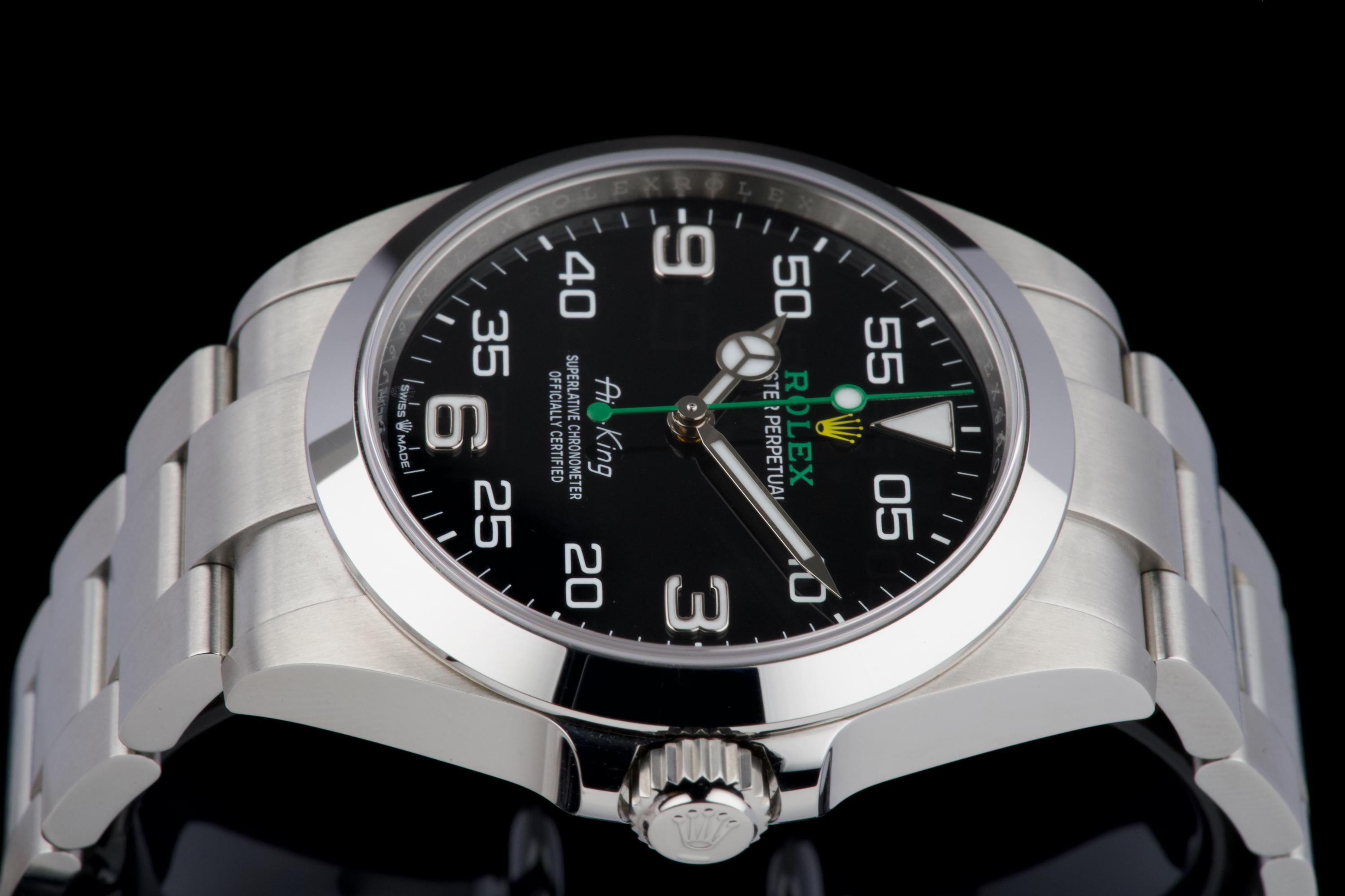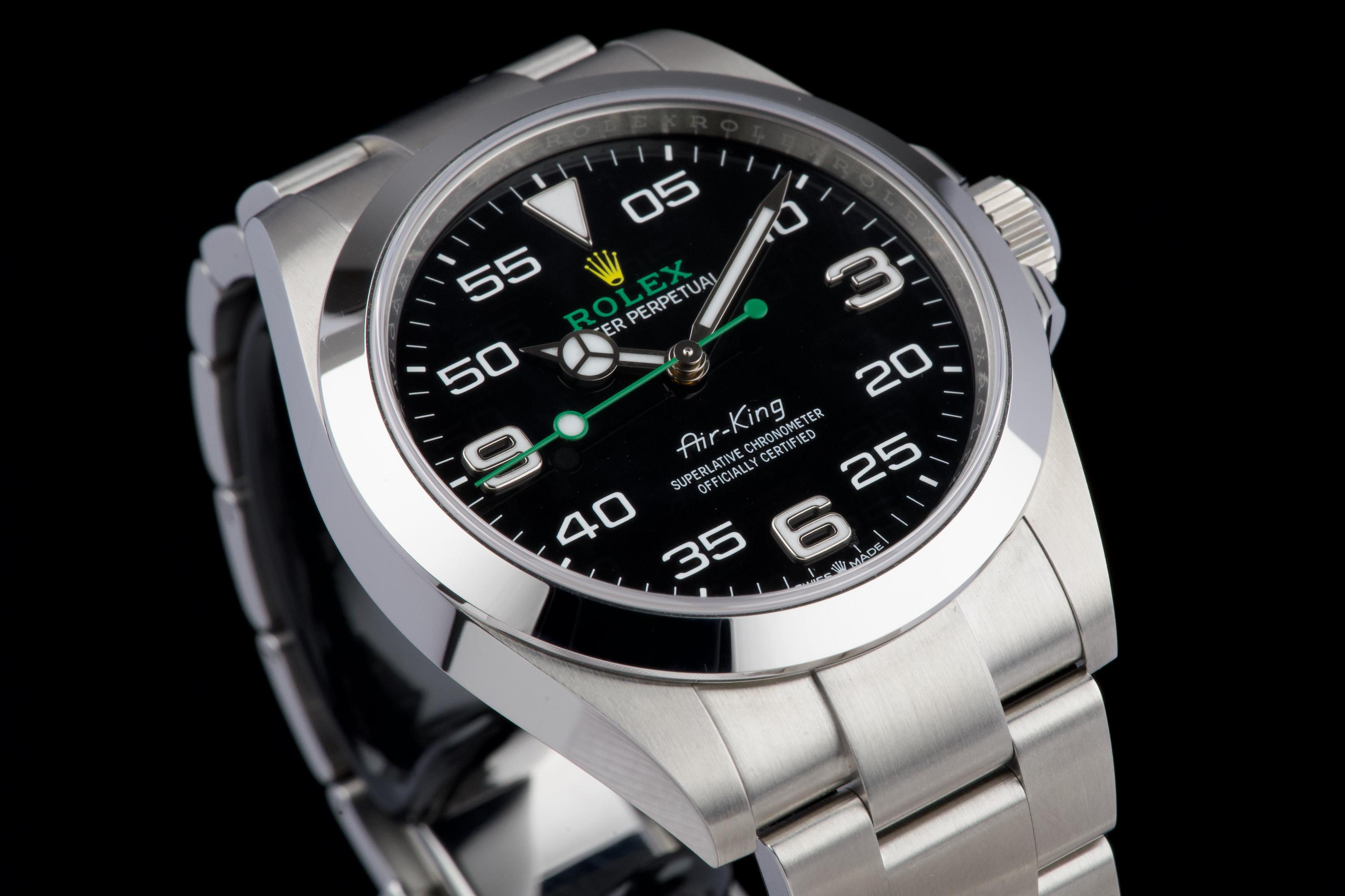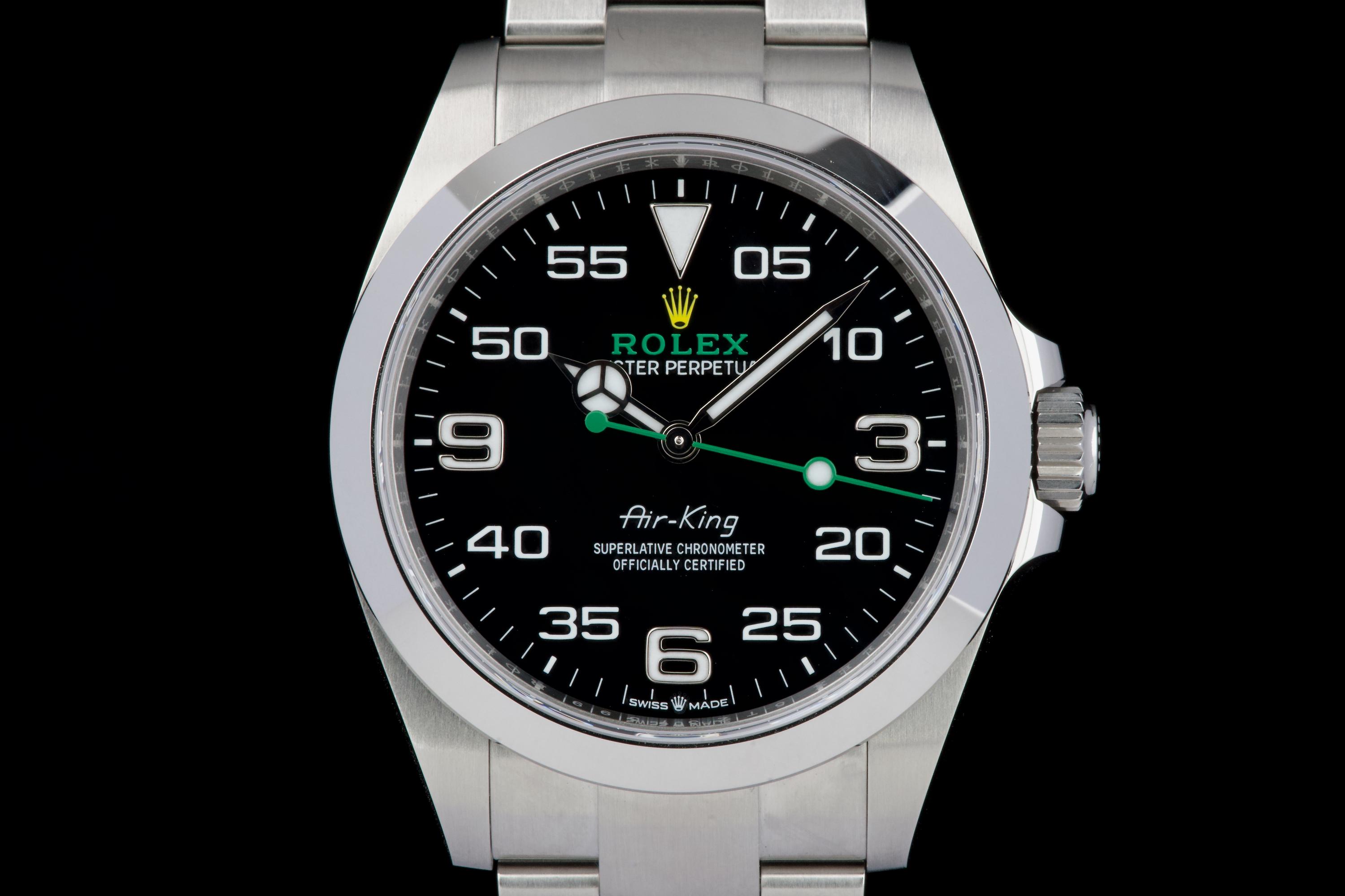 A modern and sporty Rolex Air-King reference 126900, introduced as part of the latest generation of professional models. This example dates to 2022 and is offered as a full set with box, papers, and accessories. The watch has been freshly polished by our watchmaker and presents in excellent overall condition, with only minimal signs of wear. The distinctive black dial, with its aviation-inspired layout and bold numerals, remains clean and perfectly legible, complemented by the robust Oyster case and smooth bezel. Powered by the Rolex caliber 3230, the watch offers excellent precision and reliability, in line with modern Rolex standards. A sharp and ready-to-wear example of the updated Air-King, combining contemporary design with everyday versatility.