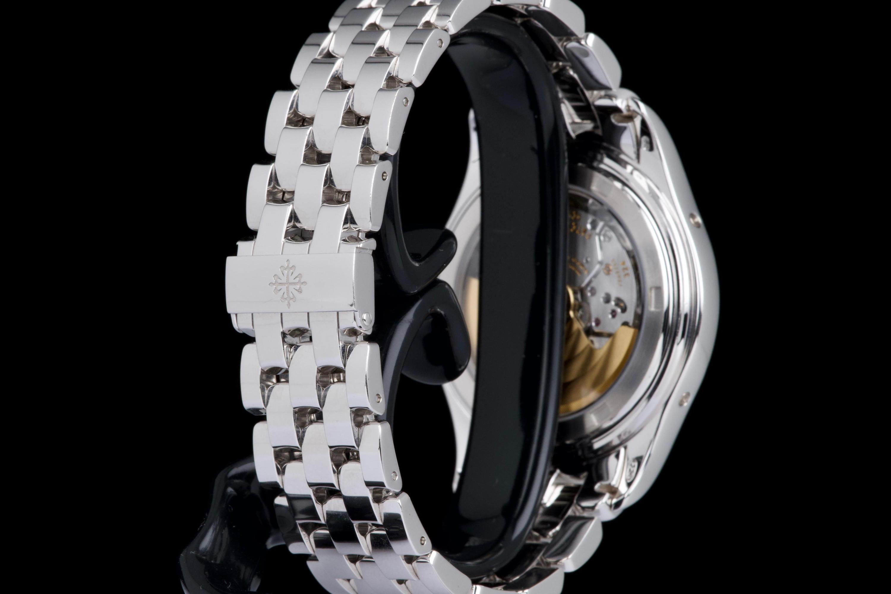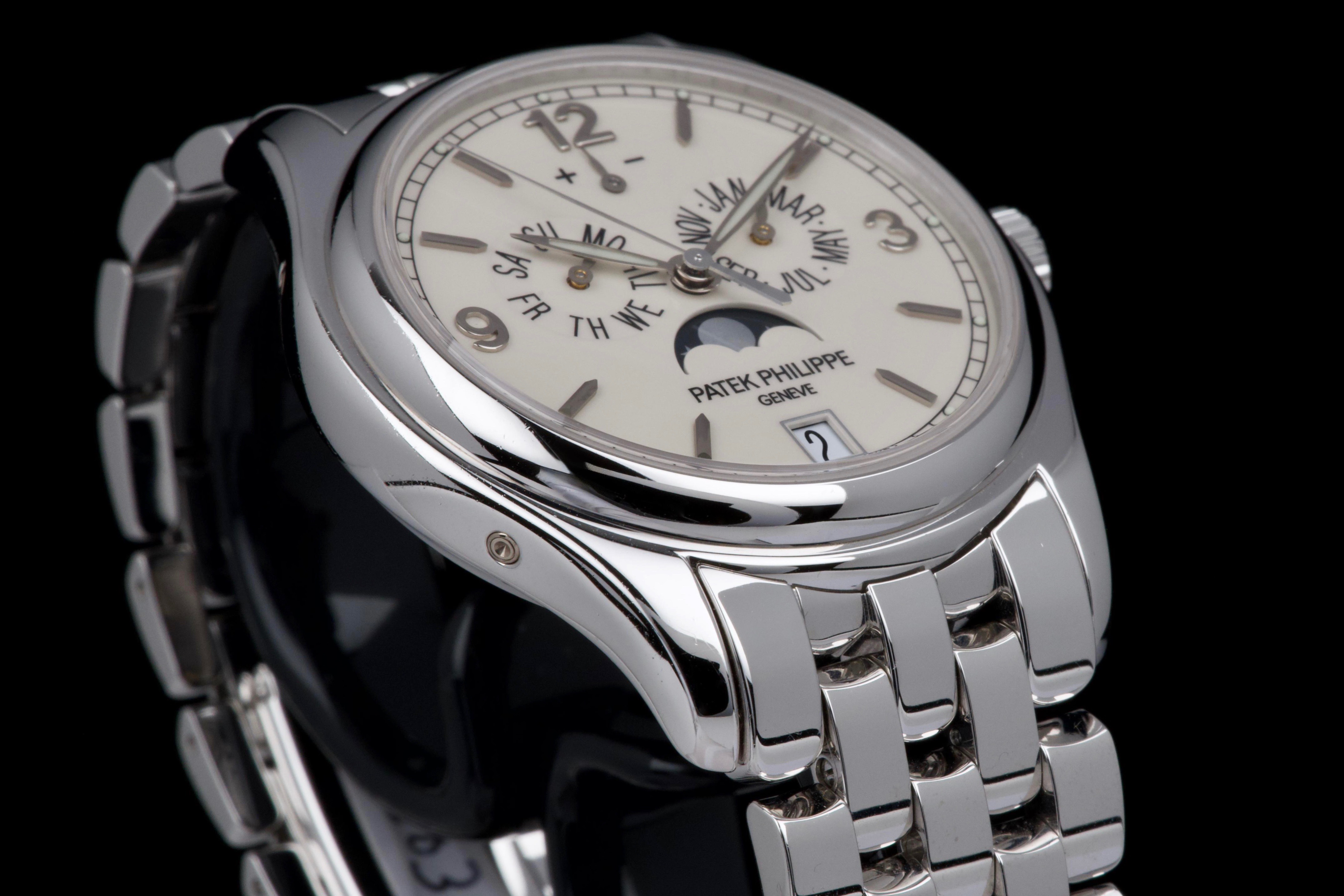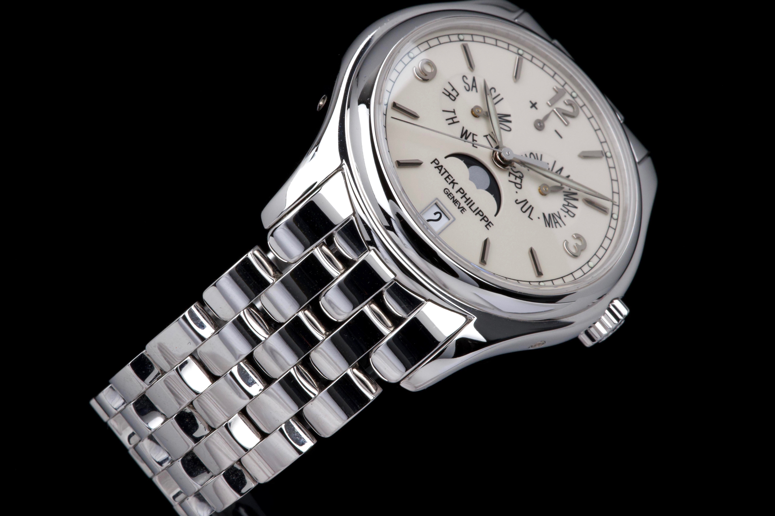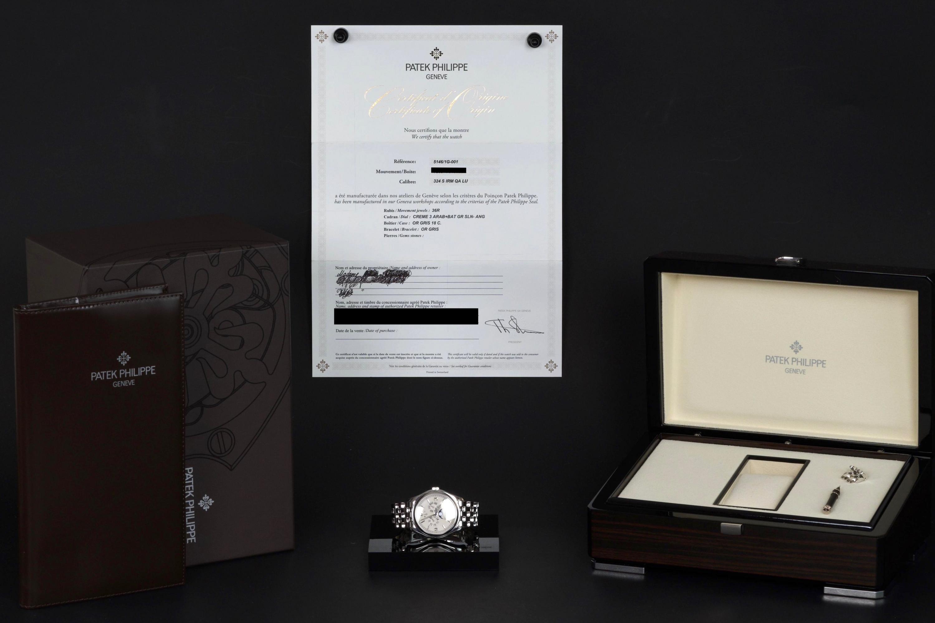 An elegant expression of modern Patek Philippe complication, the reference 5146/1G-001 is presented here in outstanding, original condition. Crafted in 18k white gold, the watch features a refined cream dial distinguished by applied white-gold baton indexes and the signature annual calendar display with day, date and month apertures, complemented by a moon-phase and power-reserve indication. The case, measuring approximately 39 mm in diameter, retains crisp lines and sharp definition, having never been polished, and is fitted with its original white-gold bracelet. This example is offered by its first owner, acquired in 2022, and has been only lightly worn since new. Preserved in excellent overall condition, it is accompanied by its full set, including the original Swiss papers, which remain undated. Powering the watch is Patek Philippe’s self-winding caliber 324 S IRM QA LU, renowned for its reliability, refined architecture and superb finishing, visible through the sapphire crystal case back. Combining technical sophistication with understated elegance, this first-owner, unpolished 5146/1G represents a highly attractive opportunity to acquire a contemporary Patek Philippe annual calendar in exceptional state of preservation.