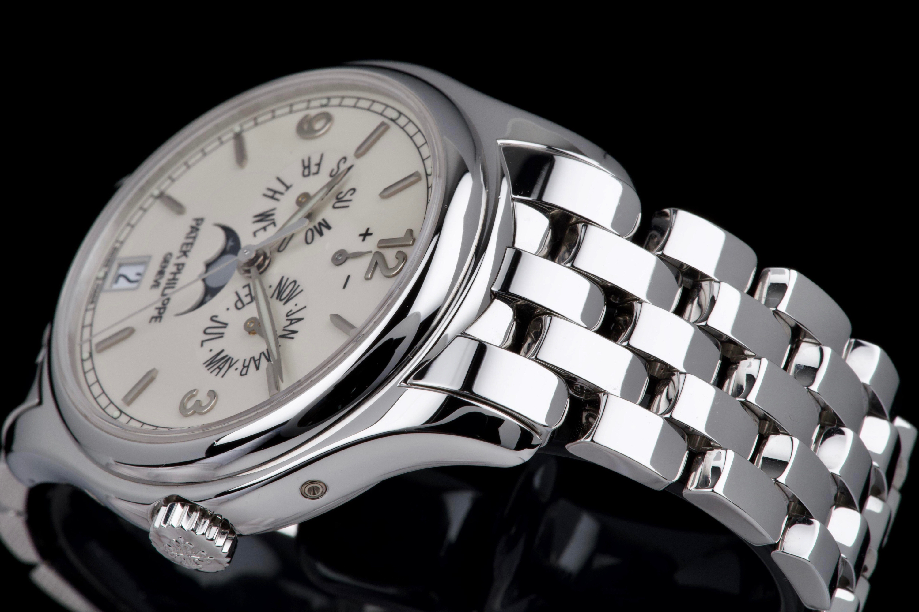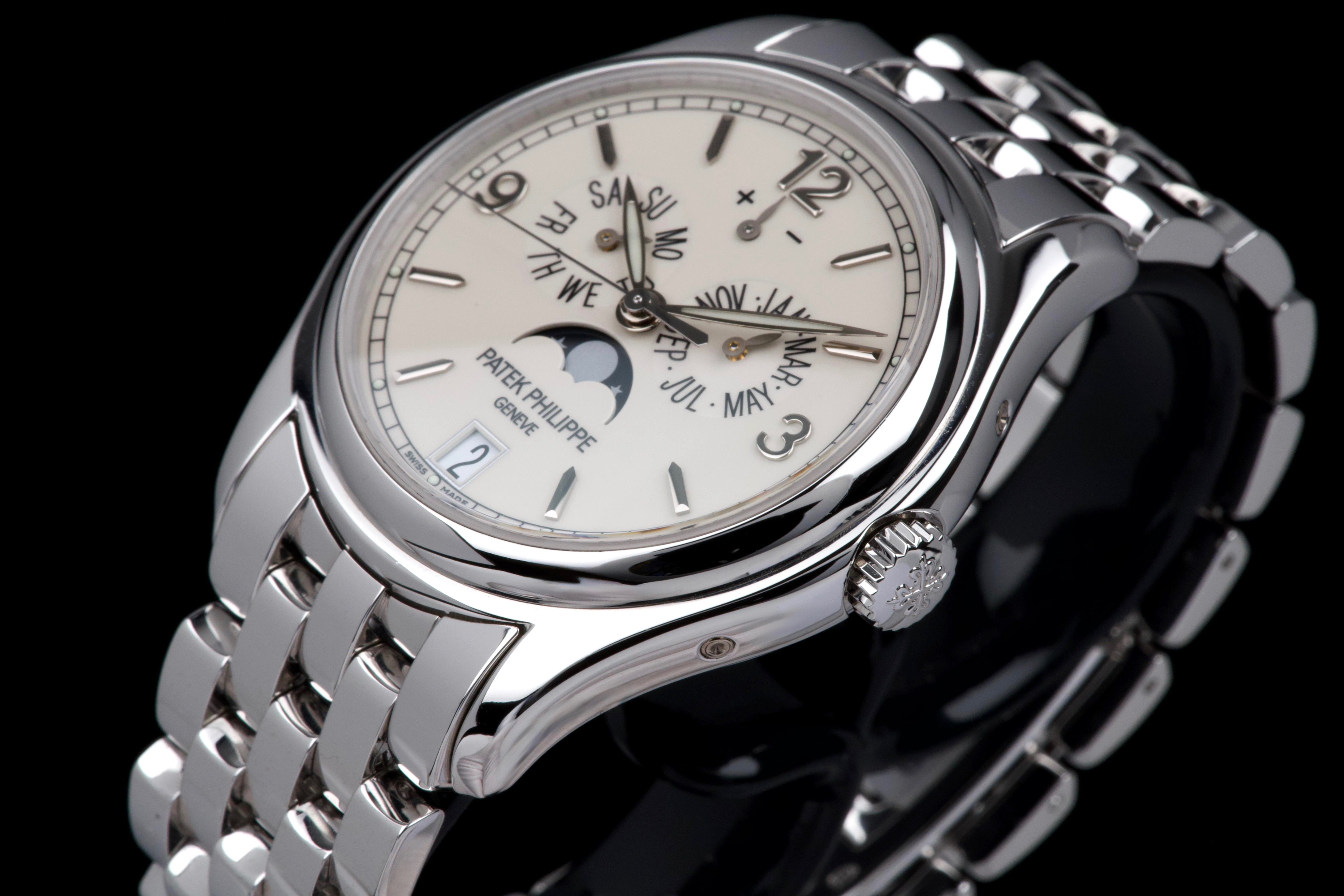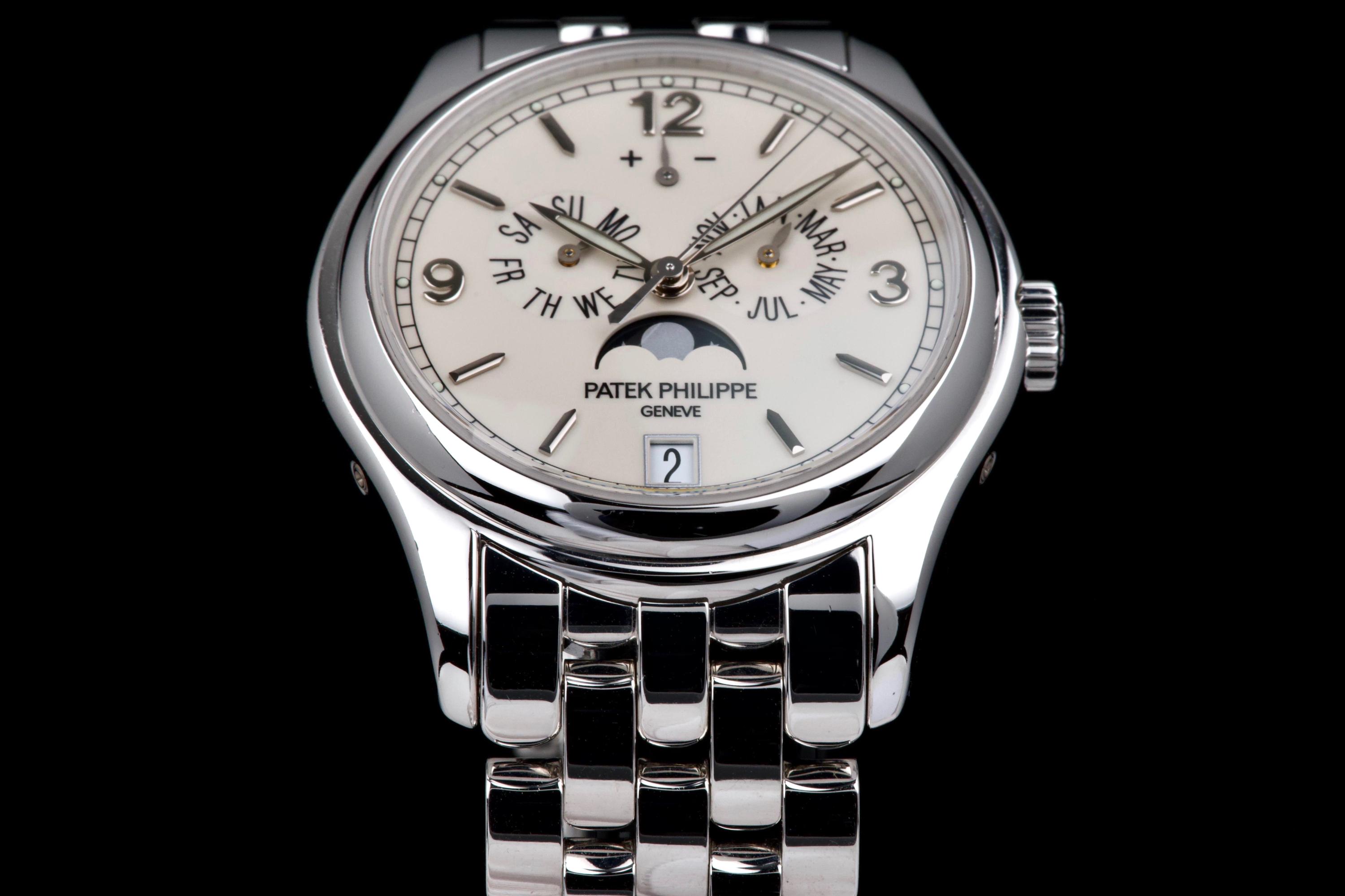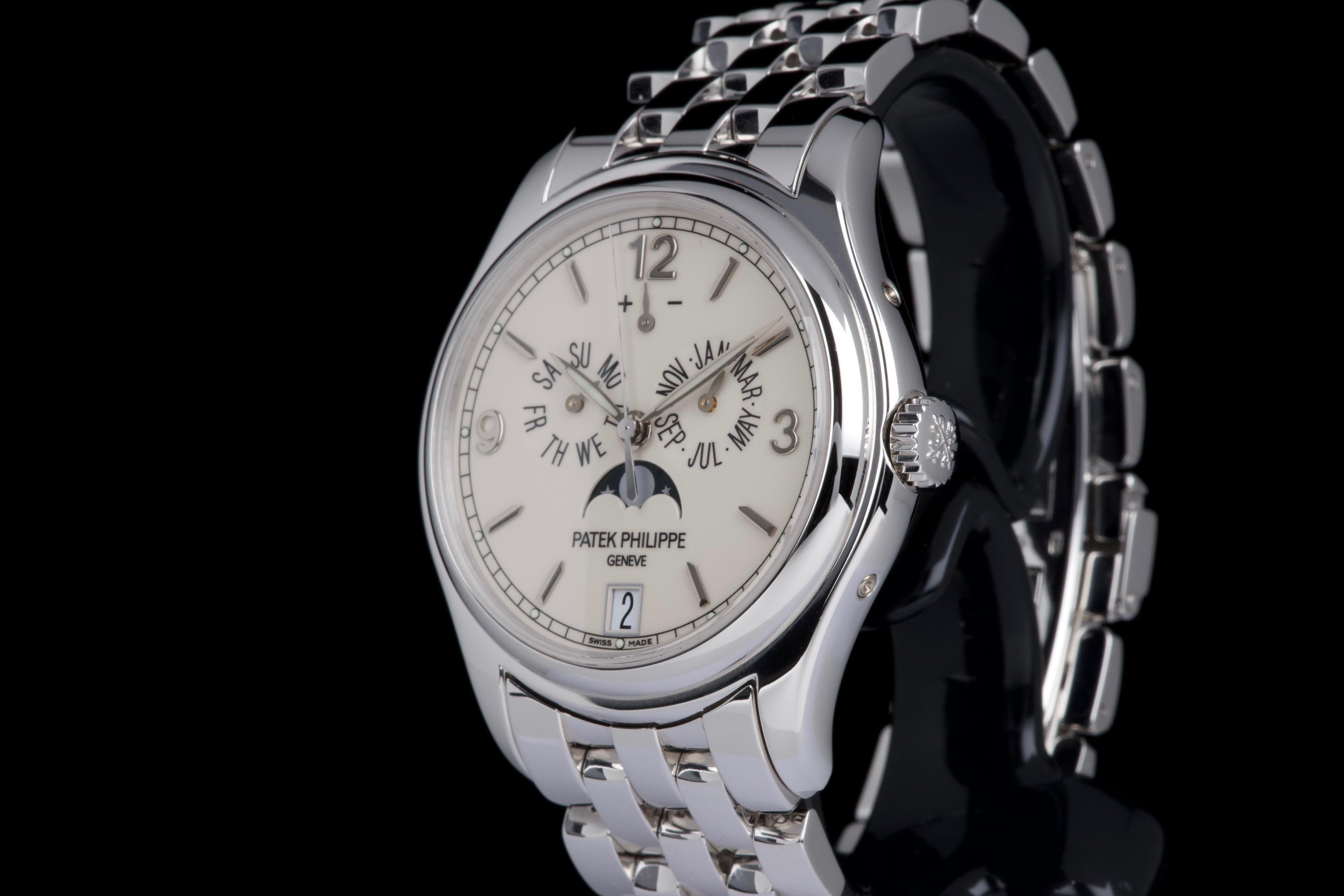 An elegant expression of modern Patek Philippe complication, the reference 5146/1G-001 is presented here in outstanding, original condition. Crafted in 18k white gold, the watch features a refined cream dial distinguished by applied white-gold baton indexes and the signature annual calendar display with day, date and month apertures, complemented by a moon-phase and power-reserve indication. The case, measuring approximately 39 mm in diameter, retains crisp lines and sharp definition, having never been polished, and is fitted with its original white-gold bracelet. This example is offered by its first owner, acquired in 2022, and has been only lightly worn since new. Preserved in excellent overall condition, it is accompanied by its full set, including the original Swiss papers, which remain undated. Powering the watch is Patek Philippe’s self-winding caliber 324 S IRM QA LU, renowned for its reliability, refined architecture and superb finishing, visible through the sapphire crystal case back. Combining technical sophistication with understated elegance, this first-owner, unpolished 5146/1G represents a highly attractive opportunity to acquire a contemporary Patek Philippe annual calendar in exceptional state of preservation.