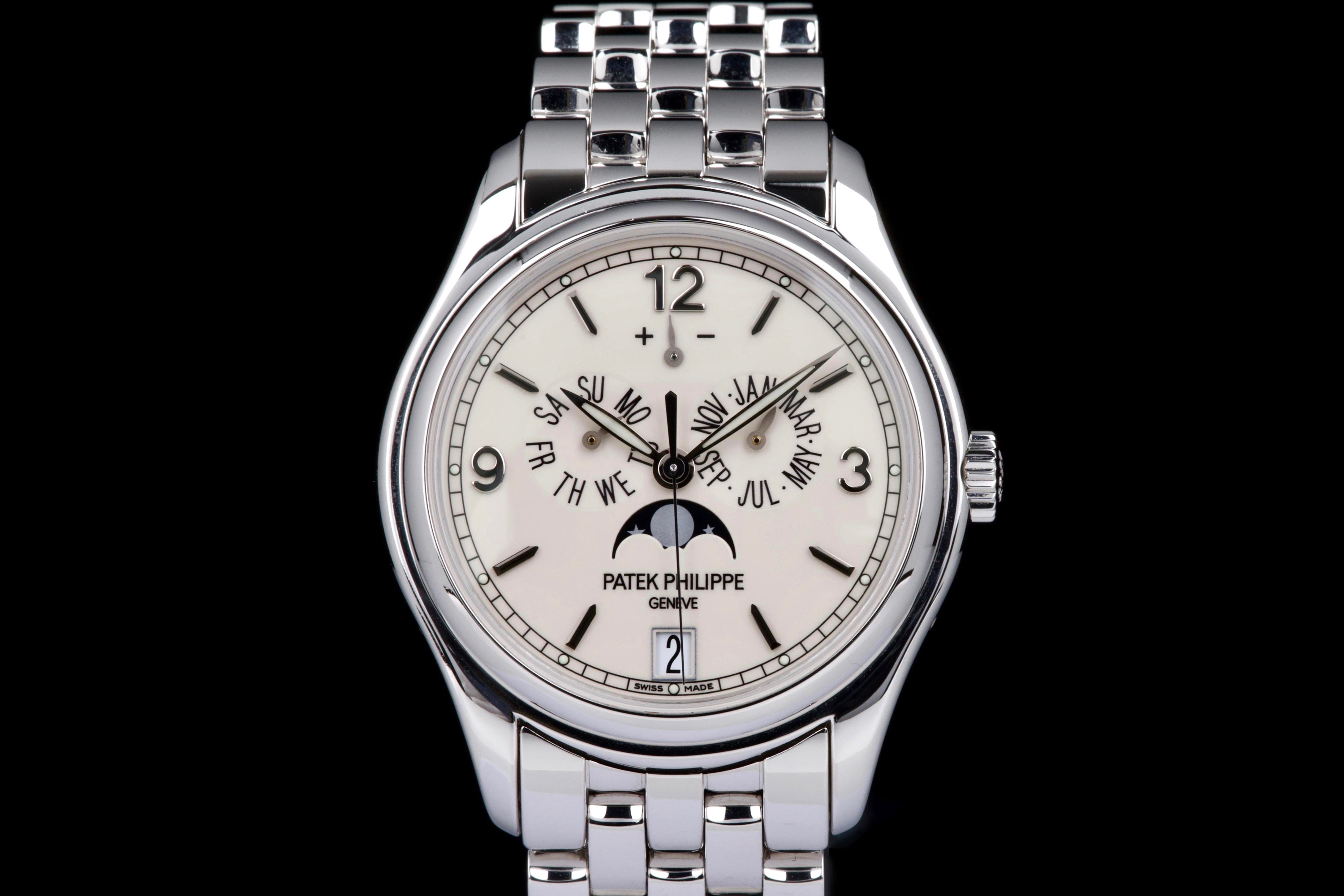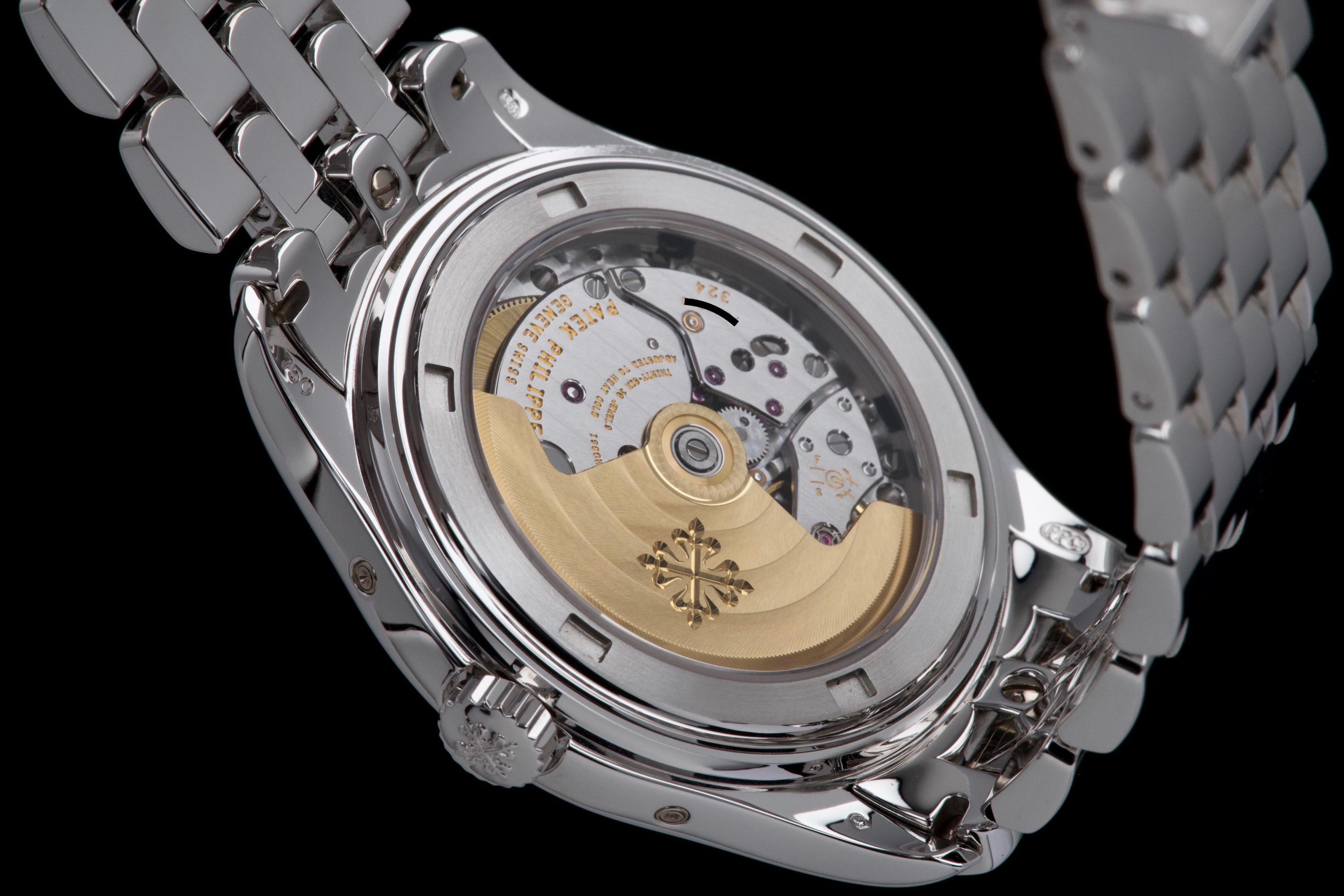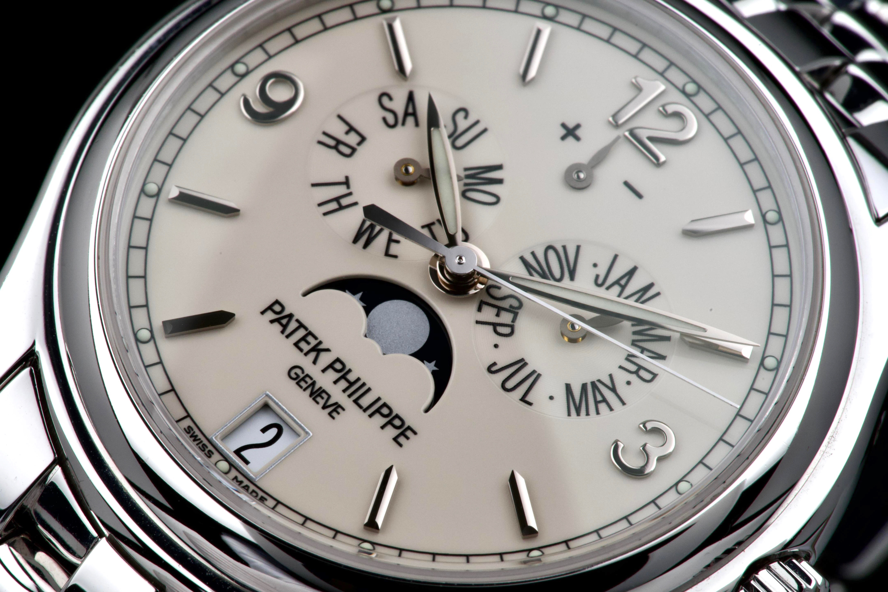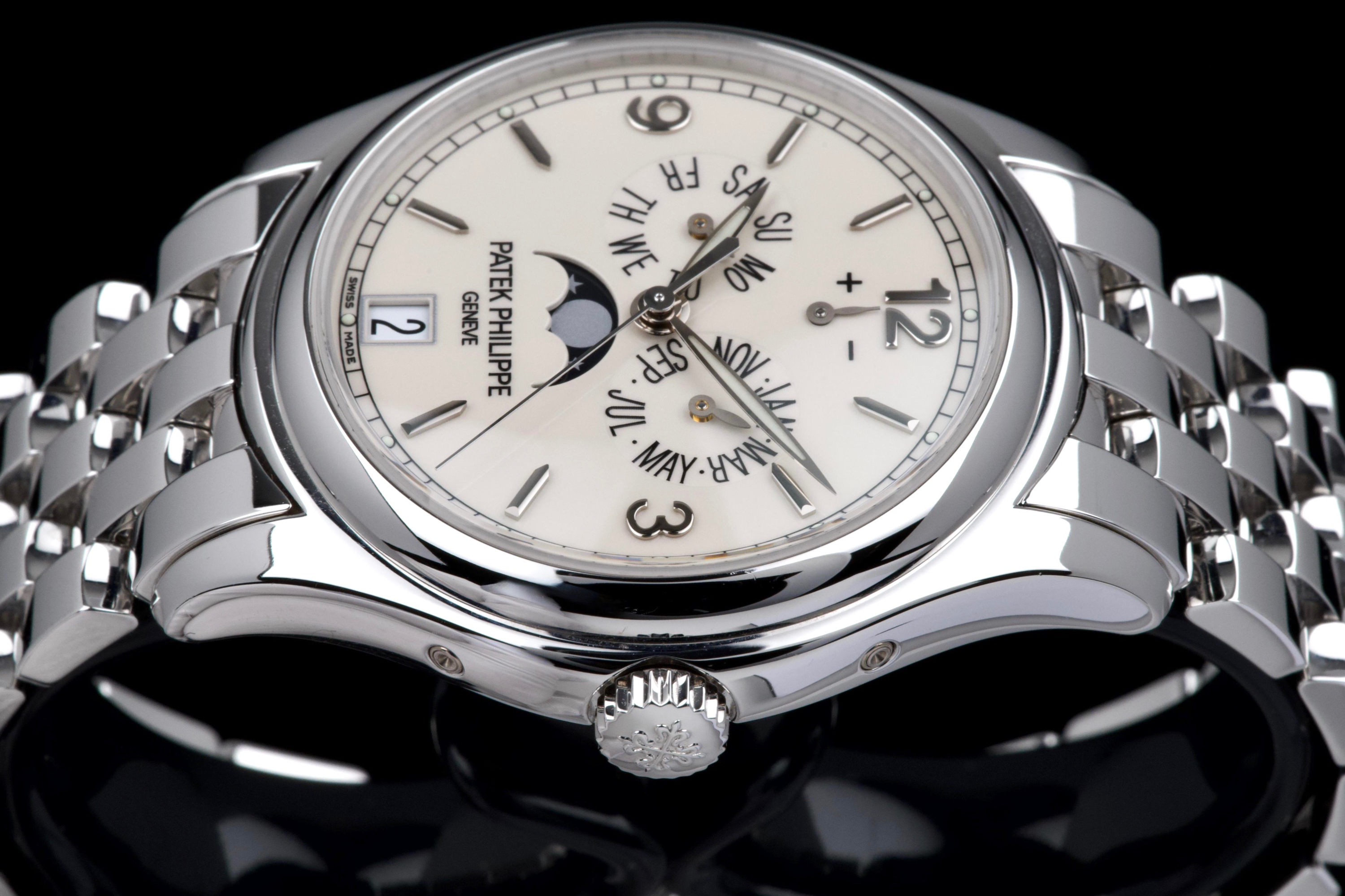 An elegant expression of modern Patek Philippe complication, the reference 5146/1G-001 is presented here in outstanding, original condition. Crafted in 18k white gold, the watch features a refined cream dial distinguished by applied white-gold baton indexes and the signature annual calendar display with day, date and month apertures, complemented by a moon-phase and power-reserve indication. The case, measuring approximately 39 mm in diameter, retains crisp lines and sharp definition, having never been polished, and is fitted with its original white-gold bracelet. This example is offered by its first owner, acquired in 2022, and has been only lightly worn since new. Preserved in excellent overall condition, it is accompanied by its full set, including the original Swiss papers, which remain undated. Powering the watch is Patek Philippe’s self-winding caliber 324 S IRM QA LU, renowned for its reliability, refined architecture and superb finishing, visible through the sapphire crystal case back. Combining technical sophistication with understated elegance, this first-owner, unpolished 5146/1G represents a highly attractive opportunity to acquire a contemporary Patek Philippe annual calendar in exceptional state of preservation.