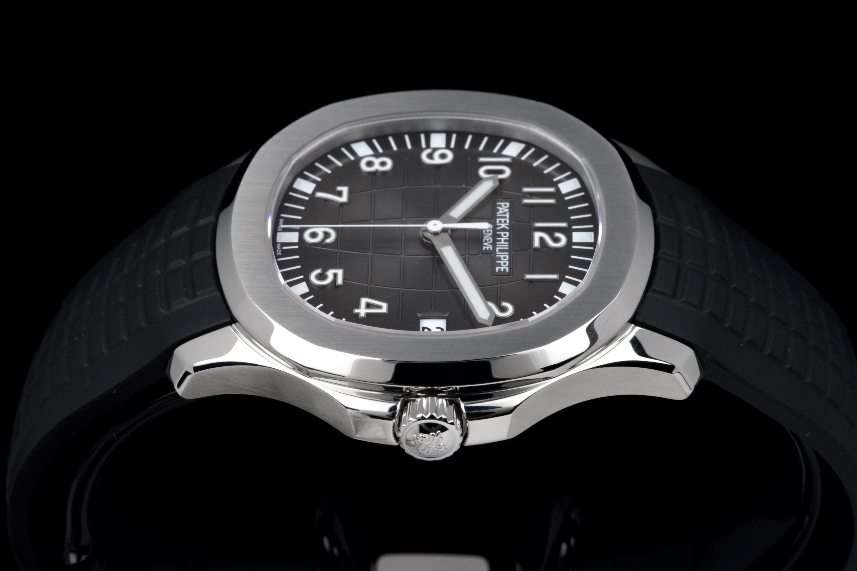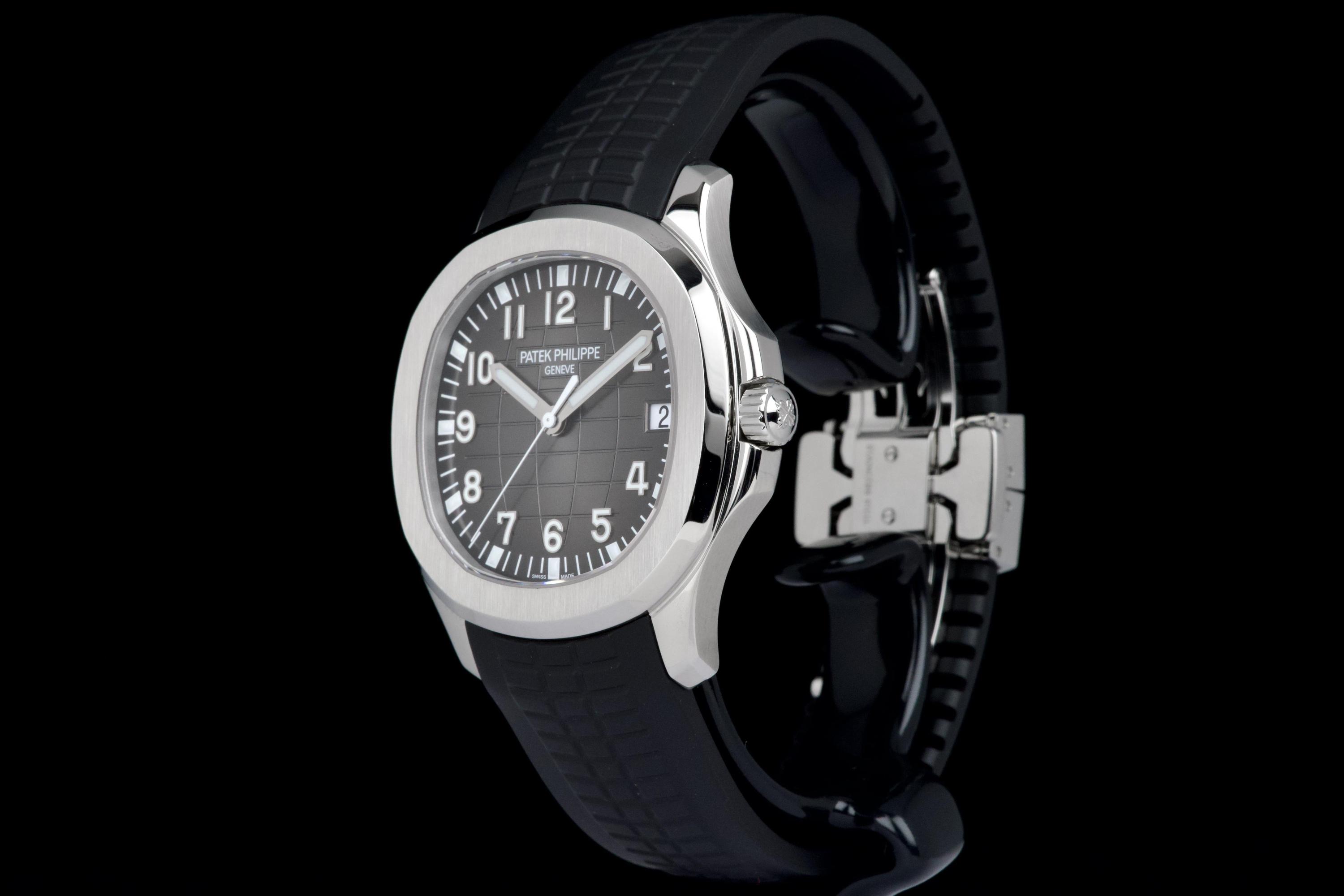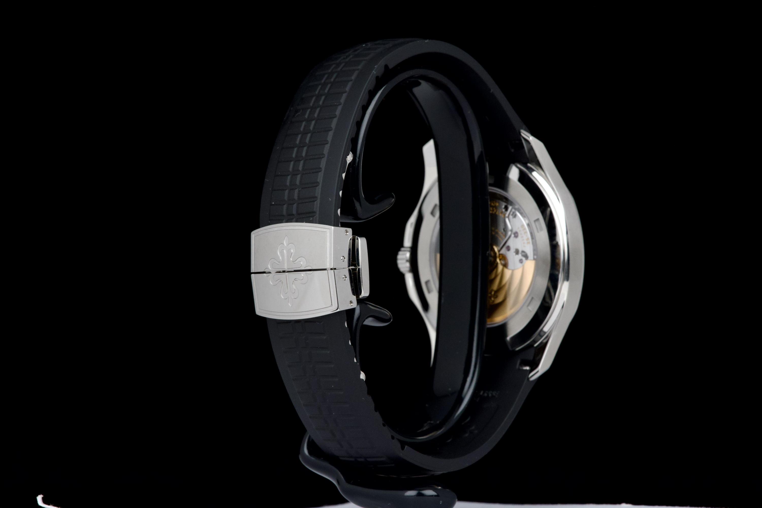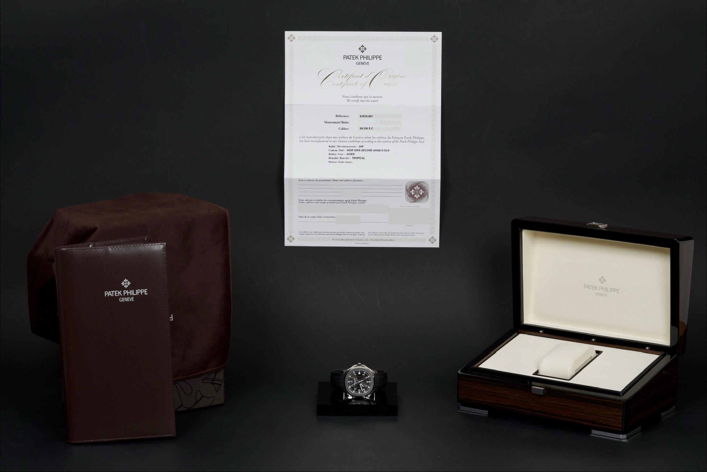 The Patek Philippe Aquanaut reference 5167A-001, one of the brand’s most iconic and sought-after contemporary sport models, is offered here as a complete full set dating to 2026 and presented in unworn condition. The watch features a 40.8 mm stainless steel case with a slim and well-balanced profile, combining sporty character with refined elegance. Its rounded octagonal bezel and alternating polished and satin-brushed finishes create the distinctive aesthetic that defines the Aquanaut collection. It is fitted with the signature black embossed dial with “grenade” pattern, adding depth and texture while maintaining excellent legibility, complemented by applied Arabic numerals and luminescent hands, as well as a date display at 3 o’clock. Powered by the in-house automatic calibre 26-330 SC, the watch delivers reliable and precise performance in line with Patek Philippe’s exacting standards. It is presented on its original black composite “Tropical” strap, offering exceptional comfort and durability. Preserved in like-new, unworn condition, this Aquanaut is offered with its full original set including box, warranty papers, and accessories, representing an outstanding opportunity to acquire a highly desirable modern Patek Philippe in pristine condition.