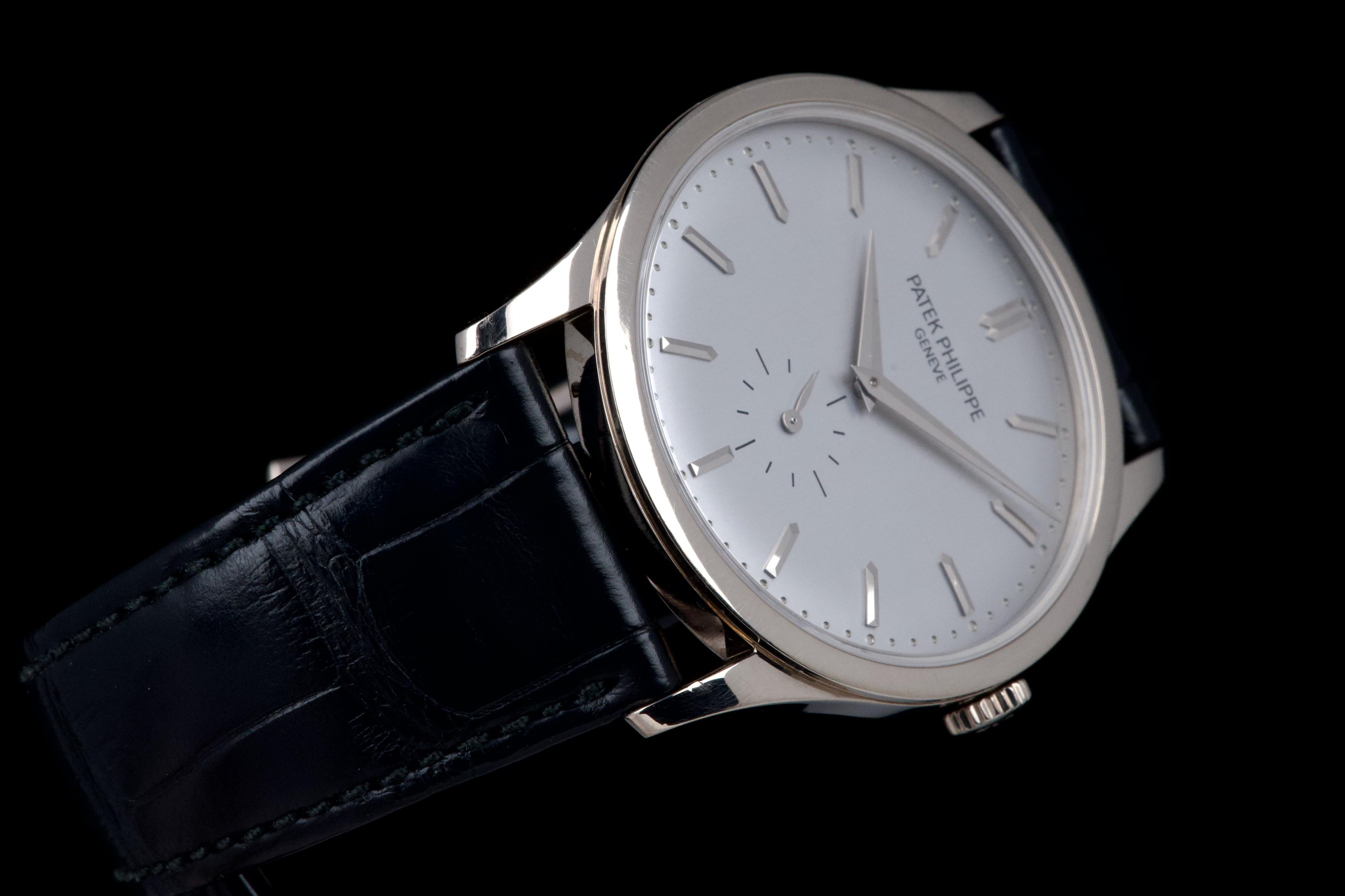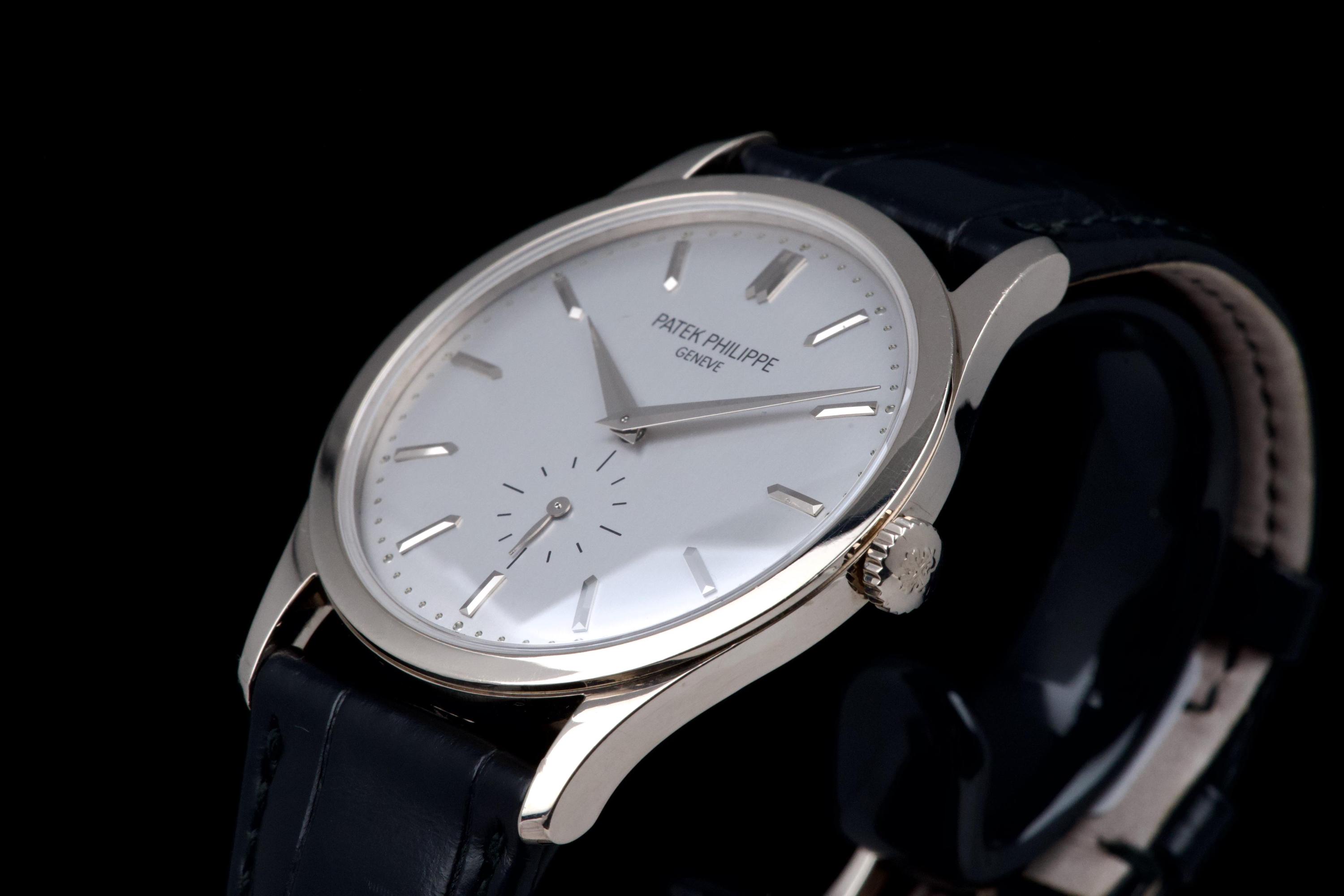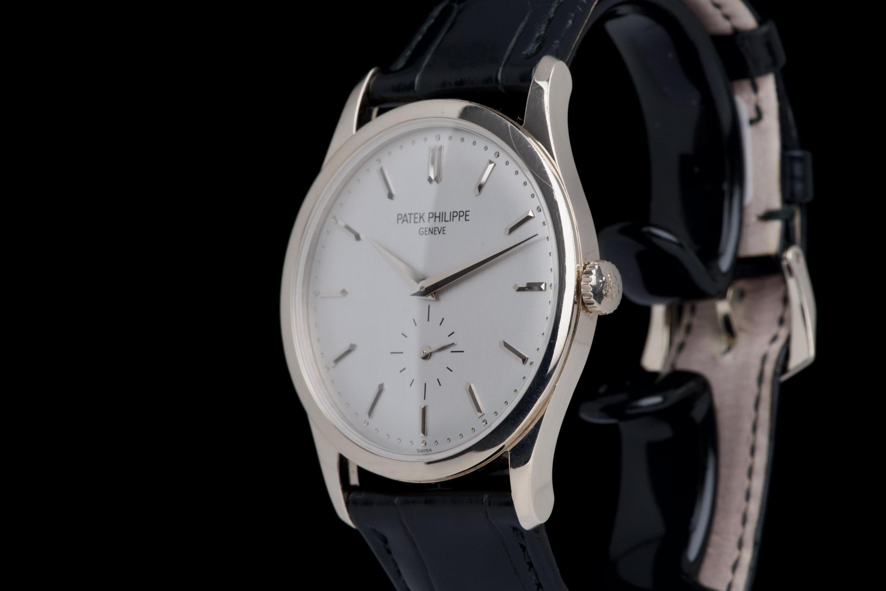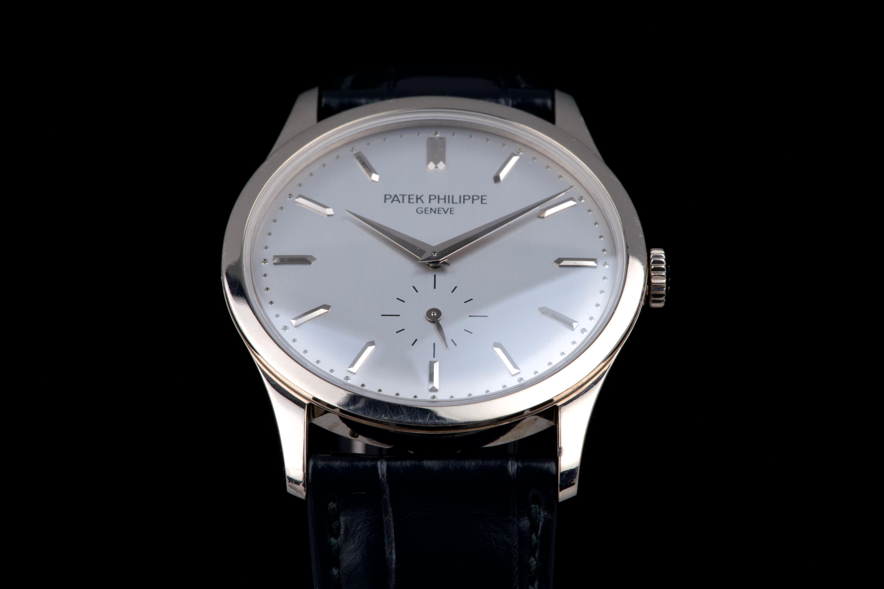 The Patek Philippe Calatrava reference 5196G, an elegant and timeless expression of the brand’s classical watchmaking heritage, dates to circa 2021 and is offered here as a complete full set. The watch features a refined 37 mm case in 18k white gold, characterized by its slim profile and clean lines, embodying the pure aesthetic of the Calatrava collection. It is fitted with a minimalist dial, offering a balanced and highly legible display with applied hour markers and a small seconds subdial, reflecting understated sophistication. Powered by a manual-winding in-house calibre, the watch delivers precise and reliable performance in keeping with Patek Philippe’s exacting standards. The watch has been polished and is presented in very good overall condition, showing light signs of wear consistent with careful use. Offered with its full original set including box, warranty papers, and accessories, this Calatrava 5196G represents an excellent opportunity to acquire a classic and refined dress watch from one of the most respected names in haute horlogerie.