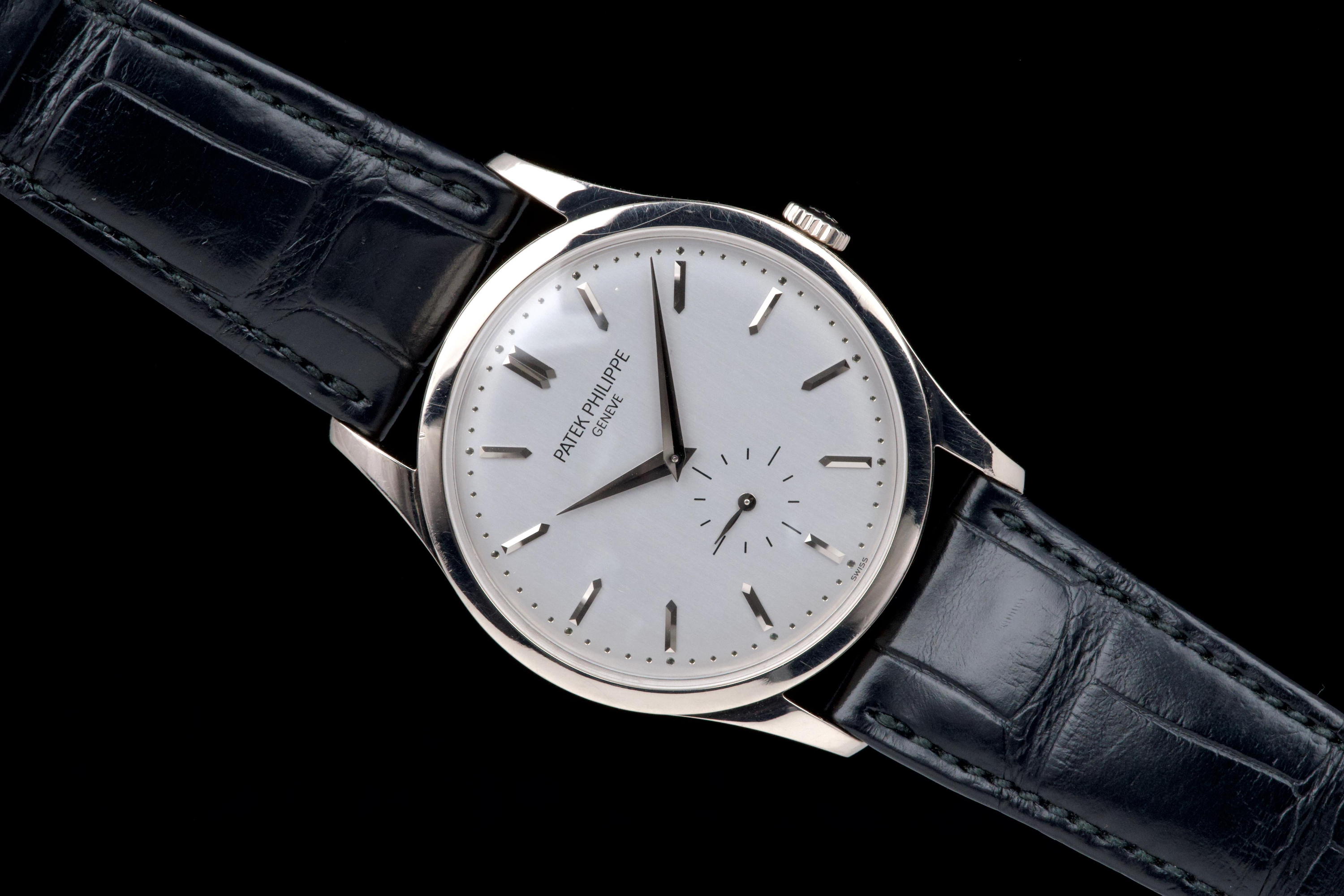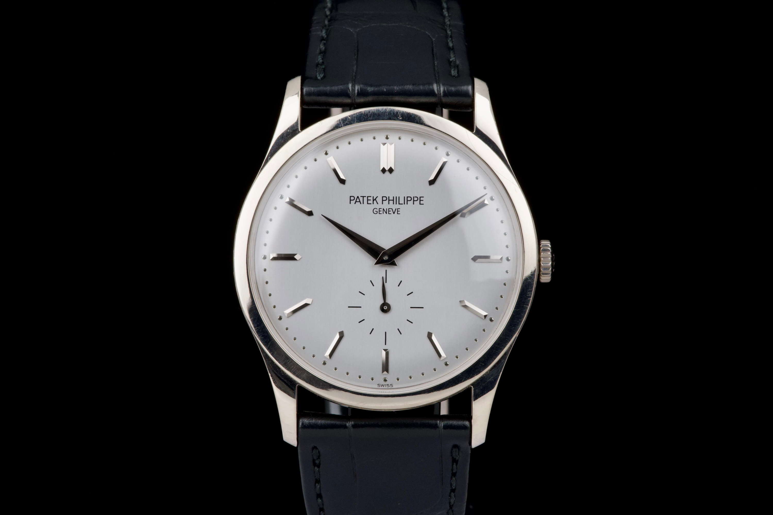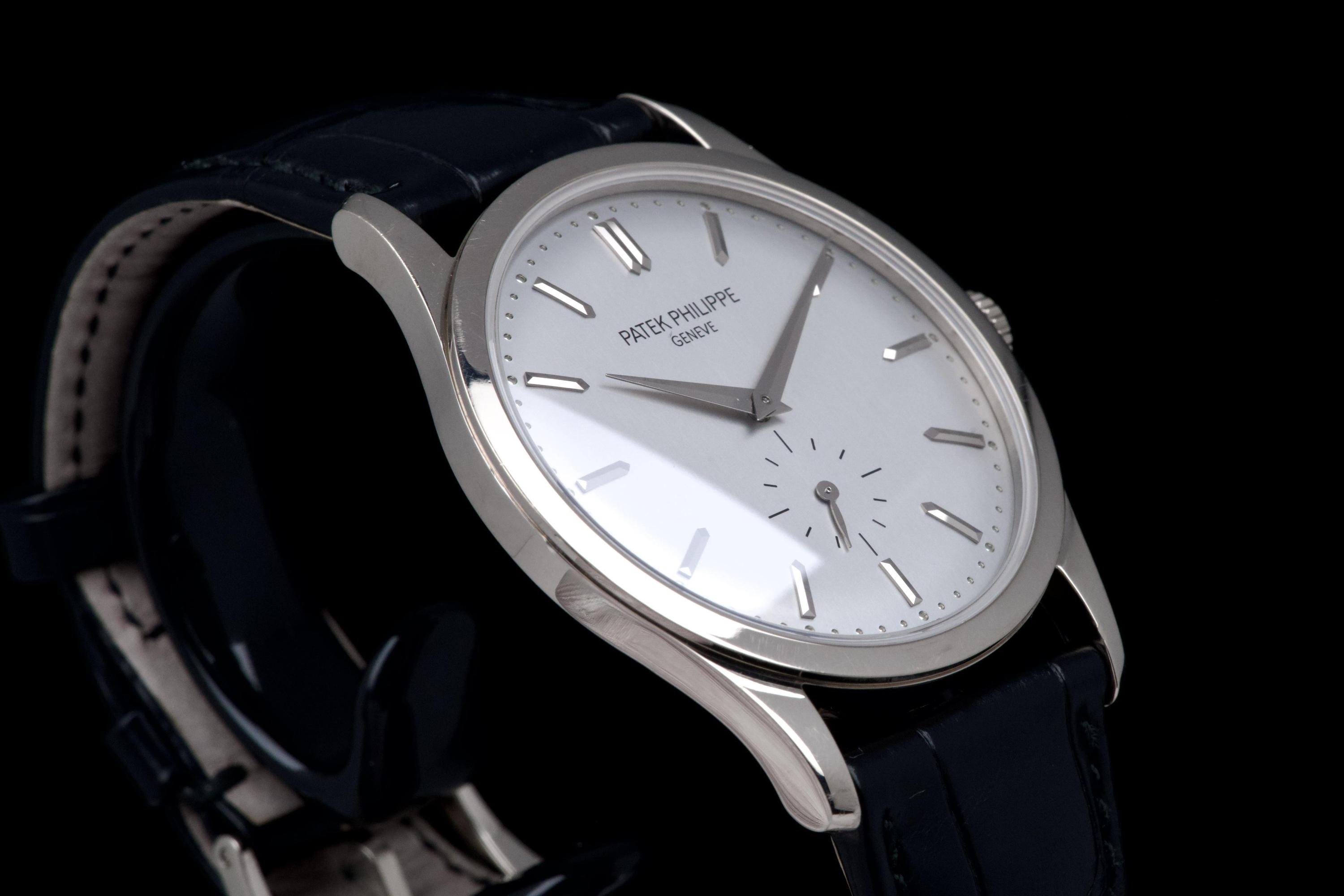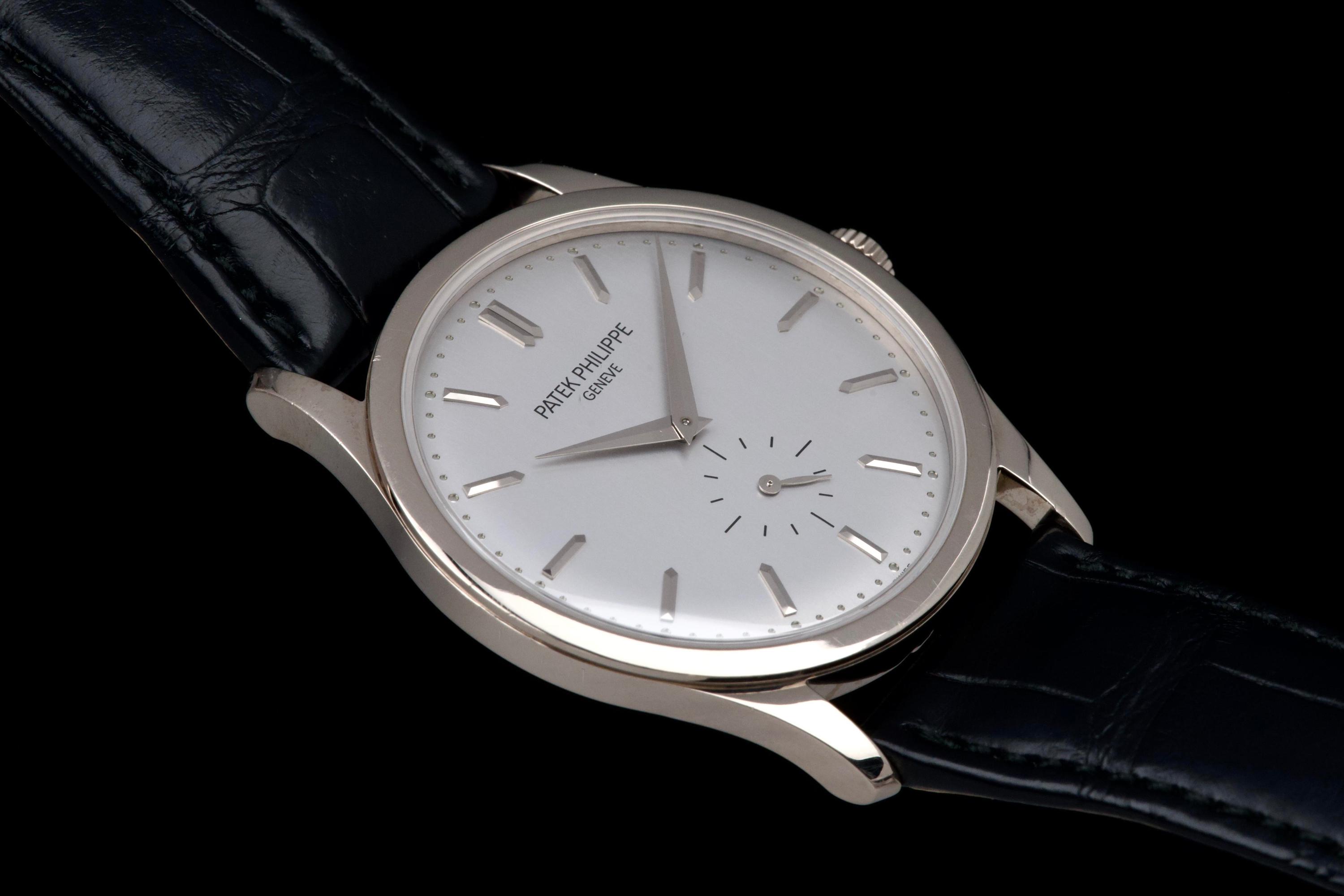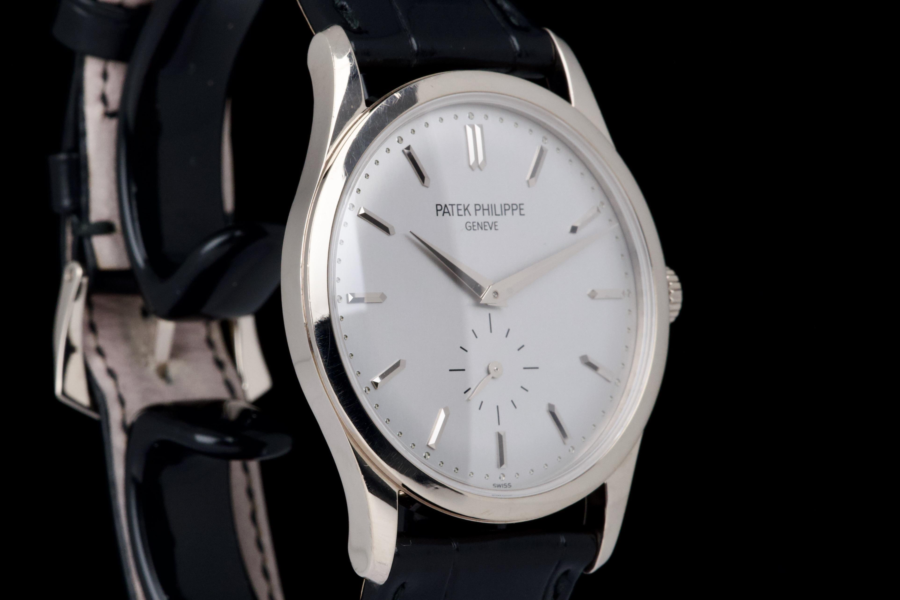 The Patek Philippe Calatrava reference 5196G, an elegant and timeless expression of the brand’s classical watchmaking heritage, dates to circa 2021 and is offered here as a complete full set. The watch features a refined 37 mm case in 18k white gold, characterized by its slim profile and clean lines, embodying the pure aesthetic of the Calatrava collection. It is fitted with a minimalist dial, offering a balanced and highly legible display with applied hour markers and a small seconds subdial, reflecting understated sophistication. Powered by a manual-winding in-house calibre, the watch delivers precise and reliable performance in keeping with Patek Philippe’s exacting standards. The watch has been polished and is presented in very good overall condition, showing light signs of wear consistent with careful use. Offered with its full original set including box, warranty papers, and accessories, this Calatrava 5196G represents an excellent opportunity to acquire a classic and refined dress watch from one of the most respected names in haute horlogerie.