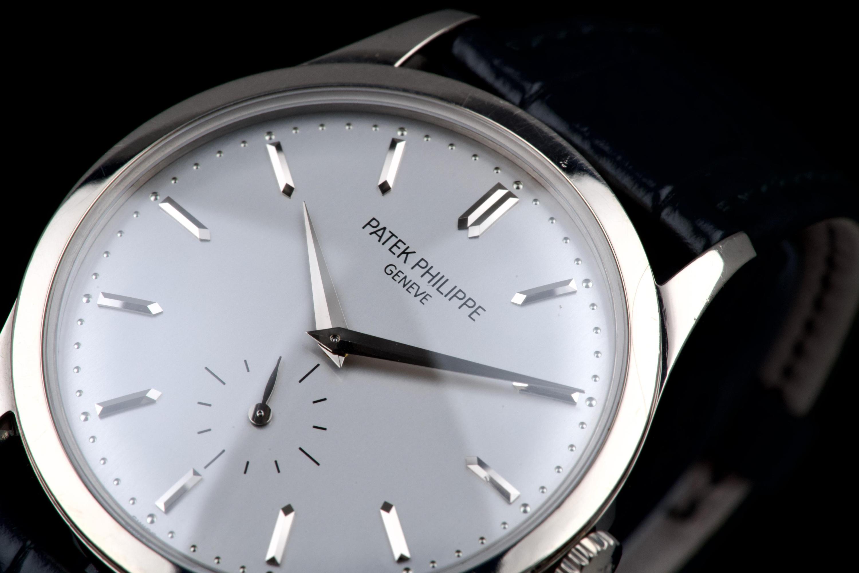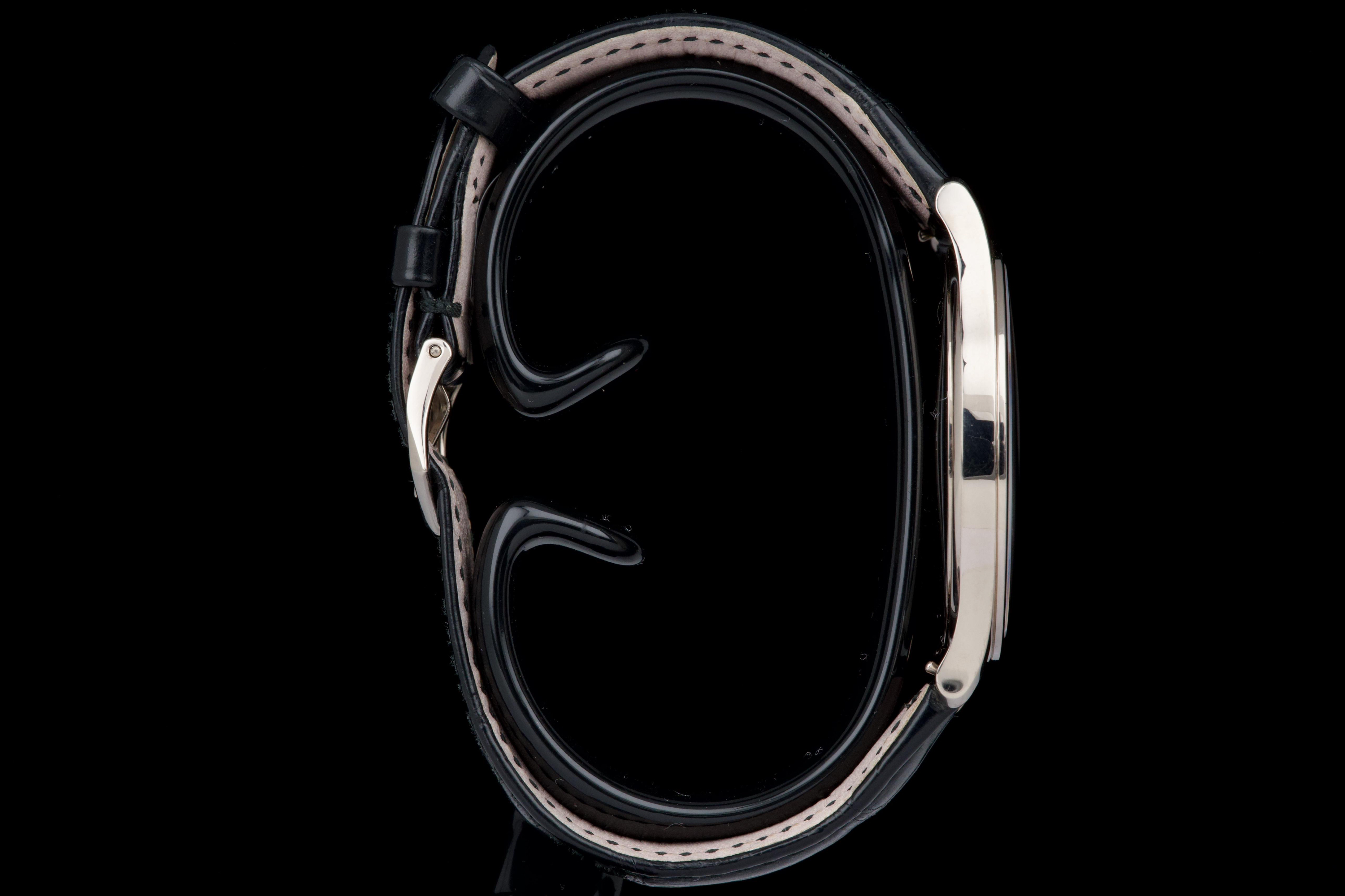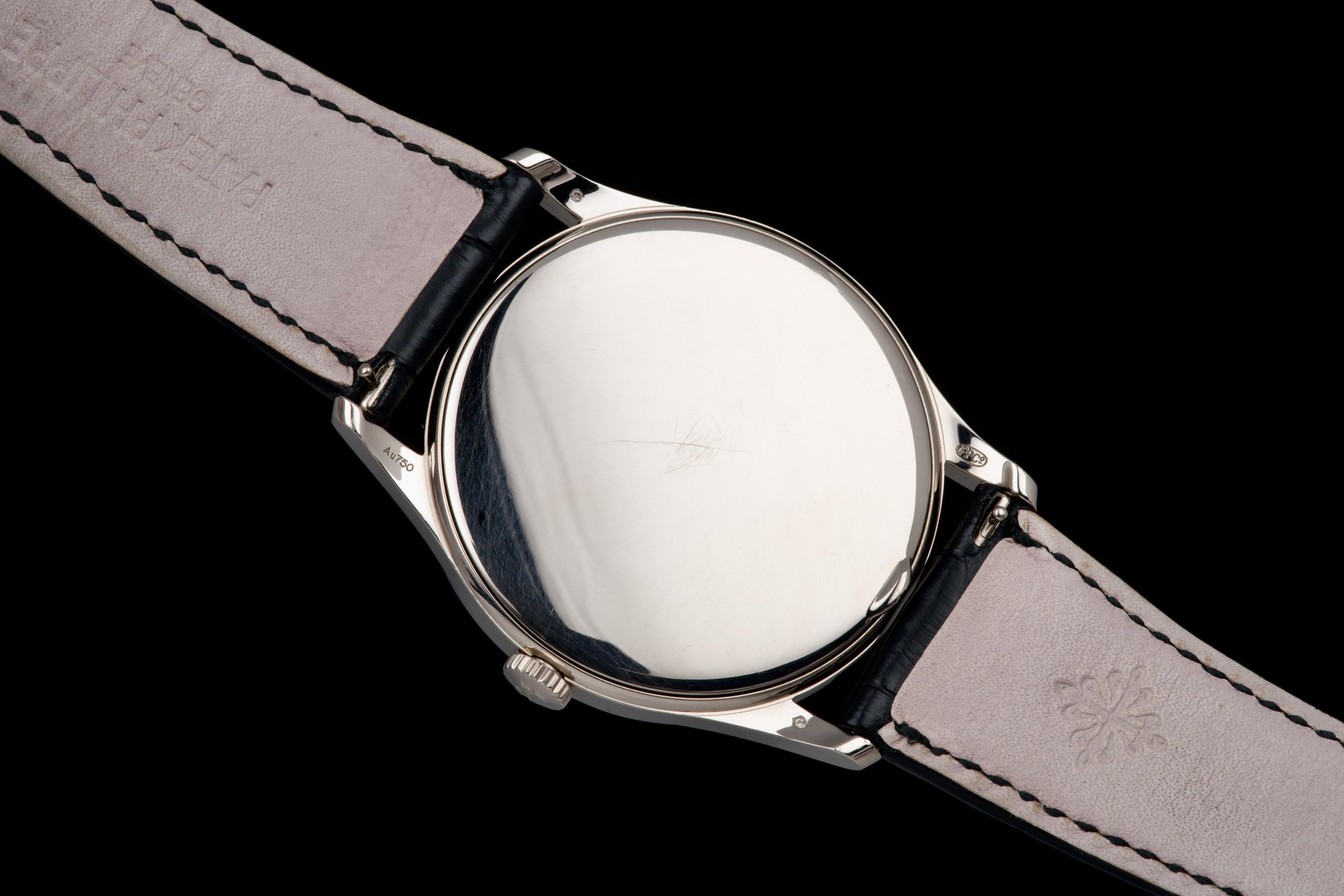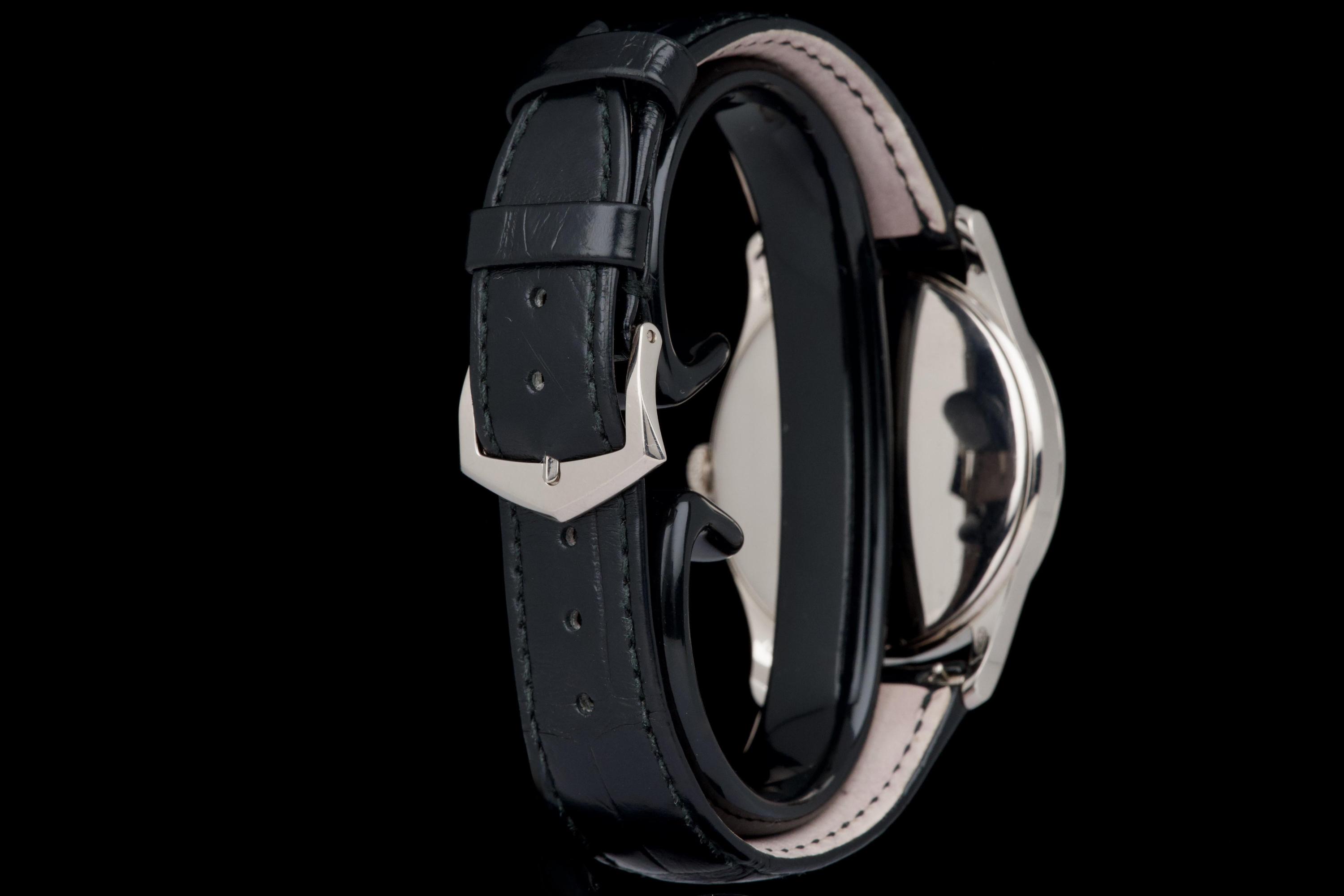 The Patek Philippe Calatrava reference 5196G, an elegant and timeless expression of the brand’s classical watchmaking heritage, dates to circa 2021 and is offered here as a complete full set. The watch features a refined 37 mm case in 18k white gold, characterized by its slim profile and clean lines, embodying the pure aesthetic of the Calatrava collection. It is fitted with a minimalist dial, offering a balanced and highly legible display with applied hour markers and a small seconds subdial, reflecting understated sophistication. Powered by a manual-winding in-house calibre, the watch delivers precise and reliable performance in keeping with Patek Philippe’s exacting standards. The watch has been polished and is presented in very good overall condition, showing light signs of wear consistent with careful use. Offered with its full original set including box, warranty papers, and accessories, this Calatrava 5196G represents an excellent opportunity to acquire a classic and refined dress watch from one of the most respected names in haute horlogerie.